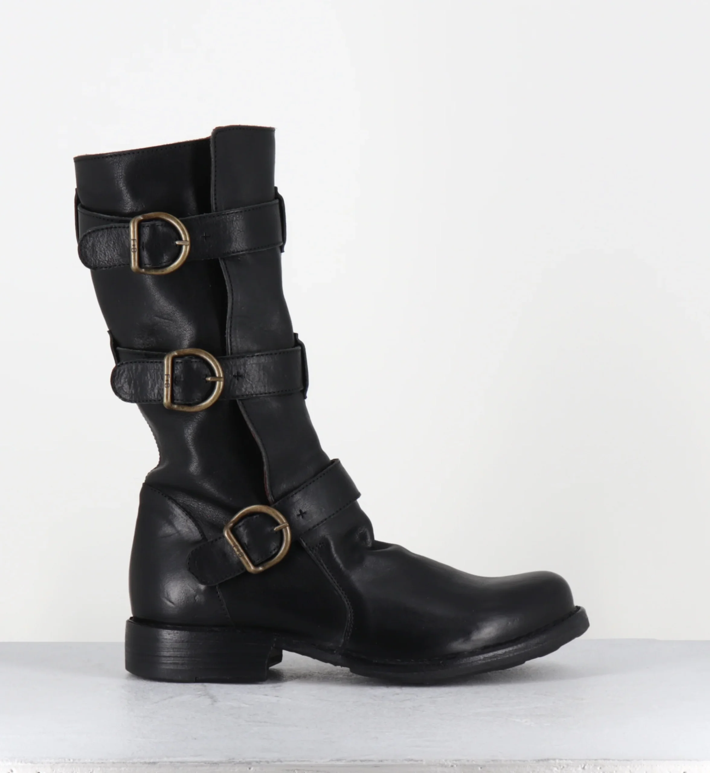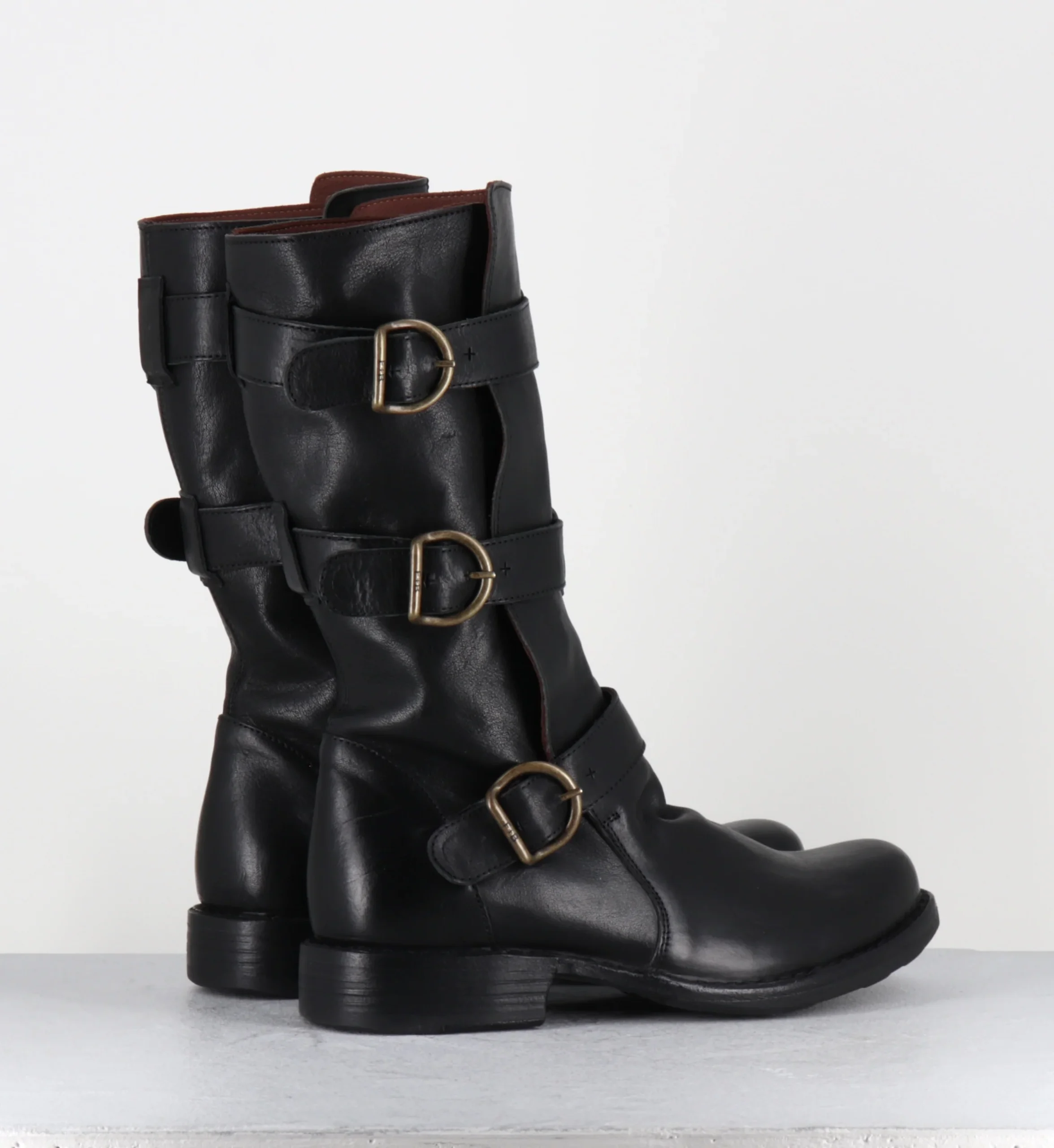 Bottes plates en cuir noir souple lavé, ligne pure esprit Avant-Garde, bout arrondi & tige mi-haute à sangles réglables, montées sur une semelle en cuir et gomme cousue, solide et confortable Fabrication Artisanale Italienne – Ateliers Fiorentini + Baker Chausse grand – Préférez une taille en dessous