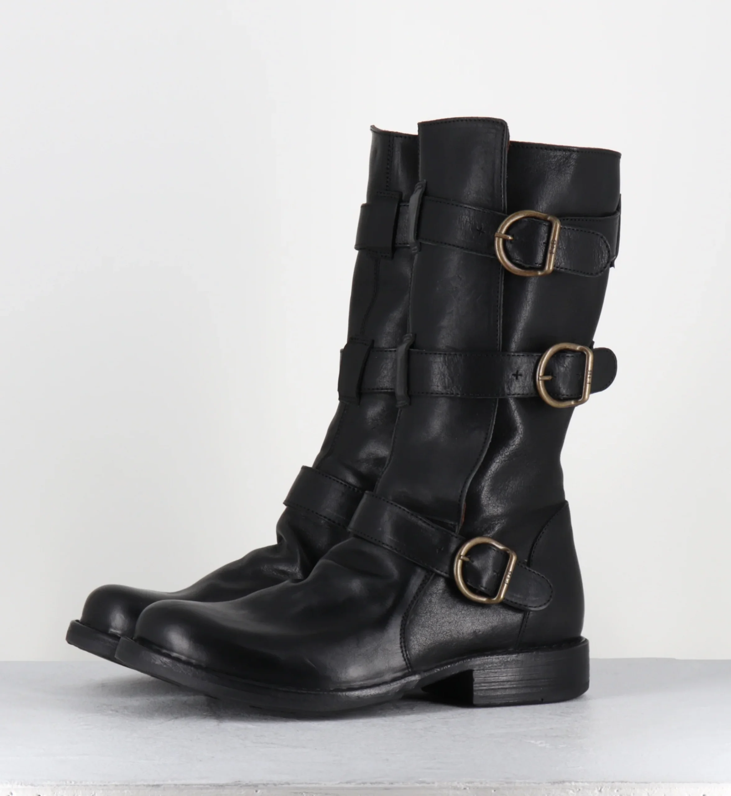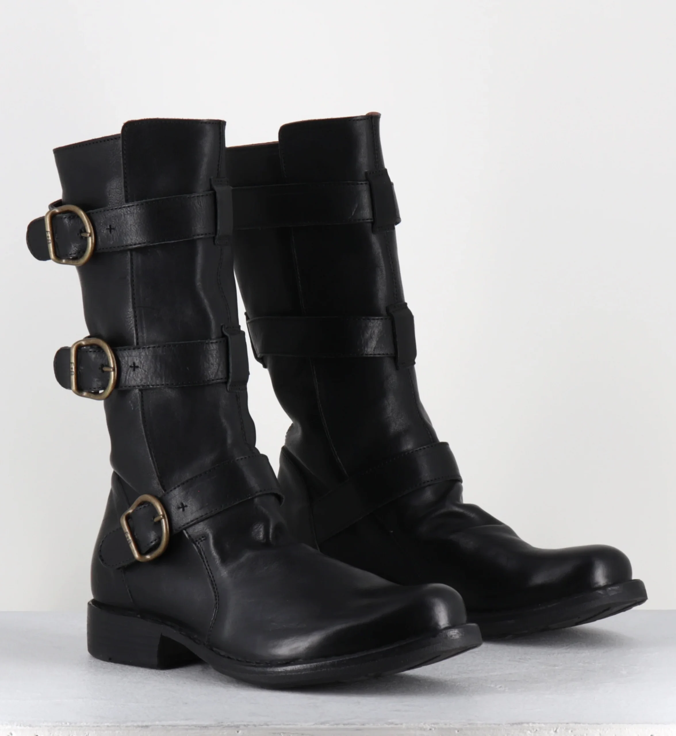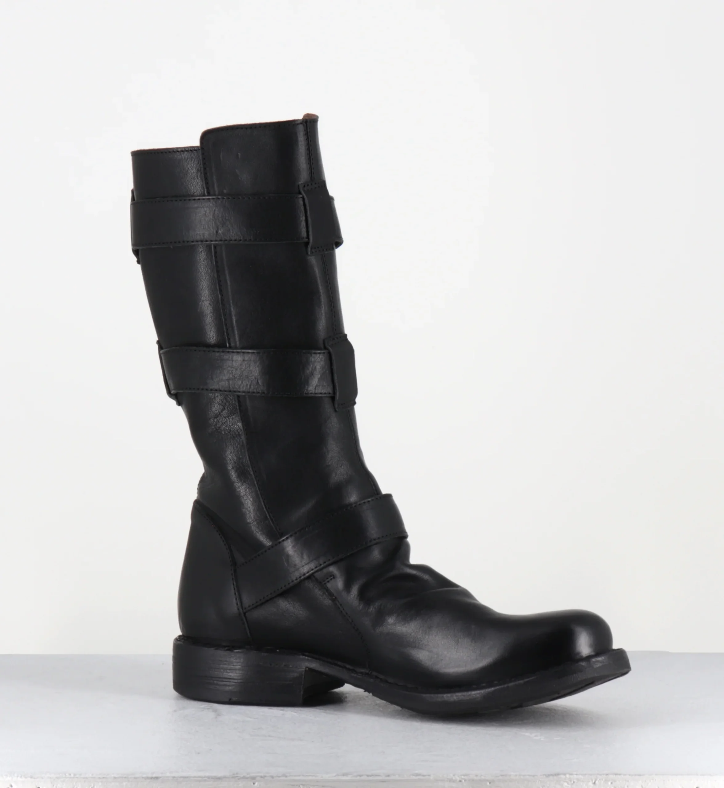 Bottes plates en cuir noir souple lavé, ligne pure esprit Avant-Garde, bout arrondi & tige mi-haute à sangles réglables, montées sur une semelle en cuir et gomme cousue, solide et confortable