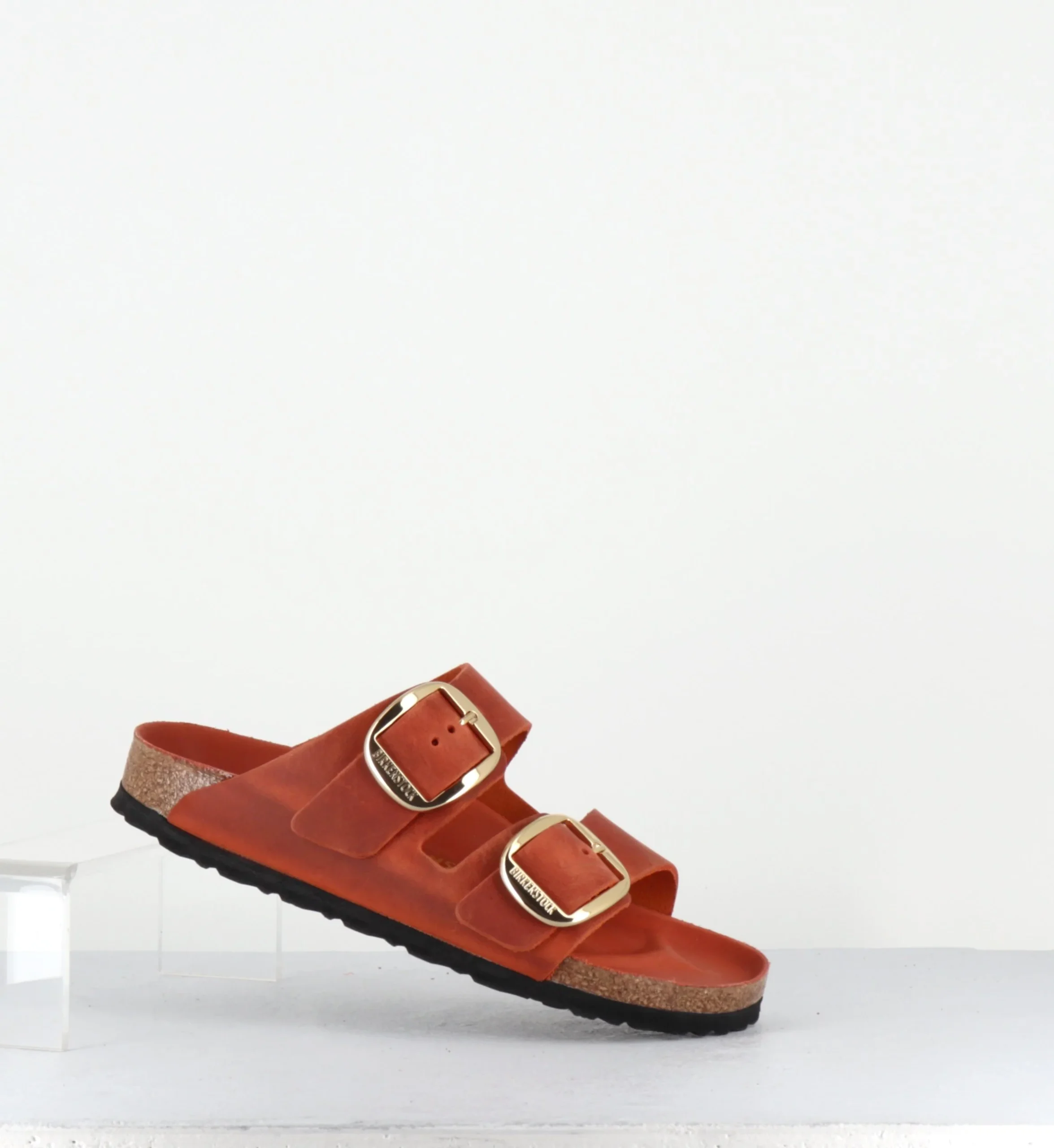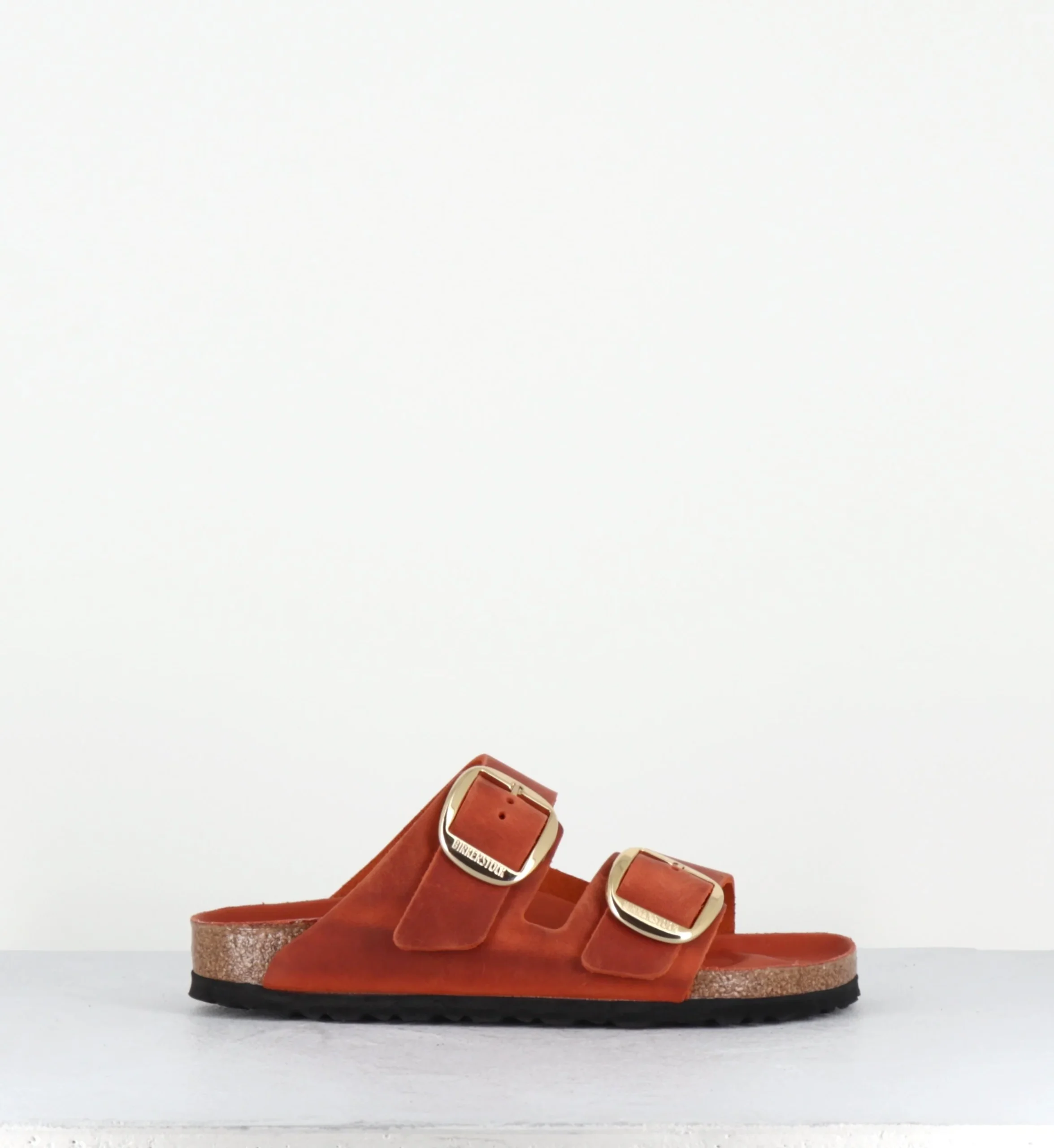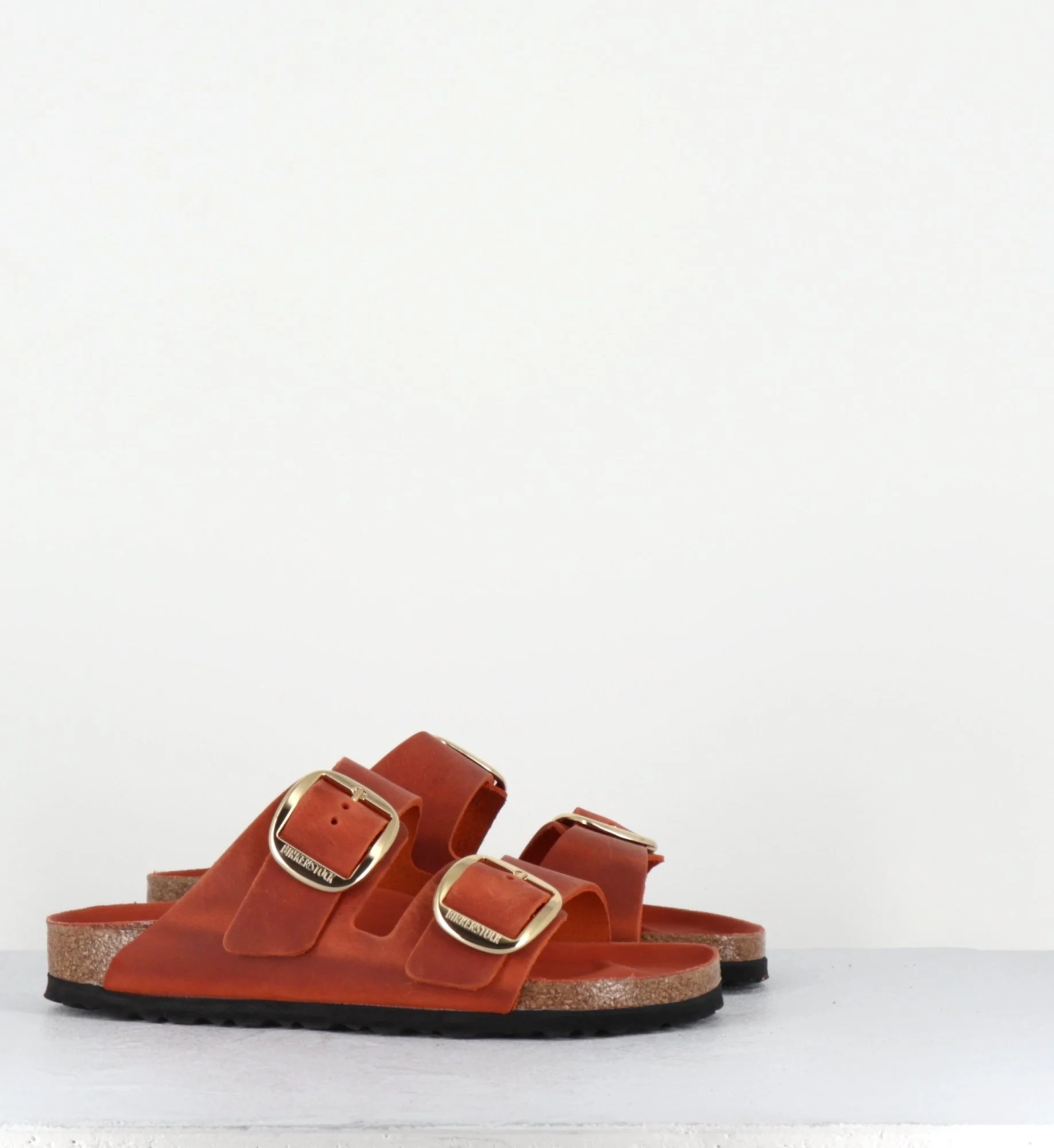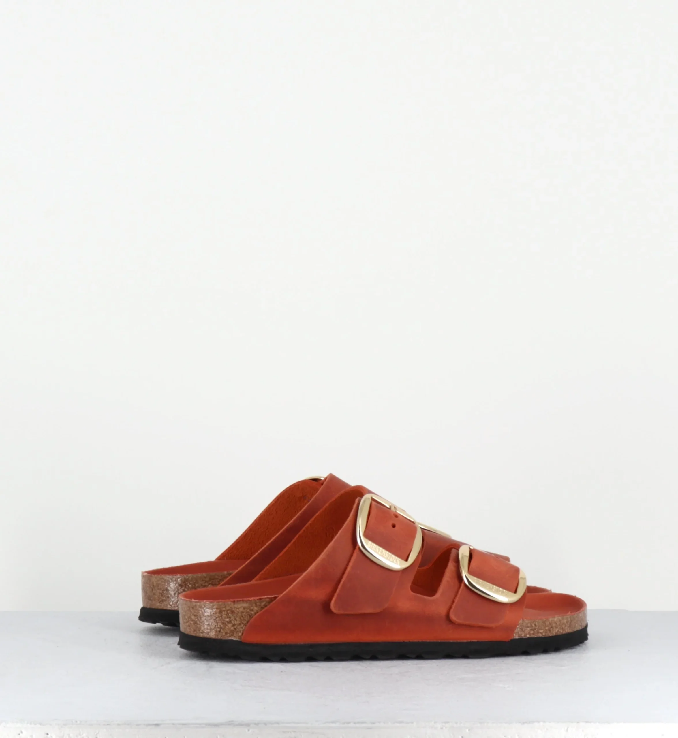 L’Arizona est la sandale iconique de Birkenstock depuis des décennies. Ce modèle se présente ici dans une version en cuir huilé et brossé pour un effet ‘vintage’ couleur brique orangé avec deux brides à grande boucle dorée ardillon élégante.