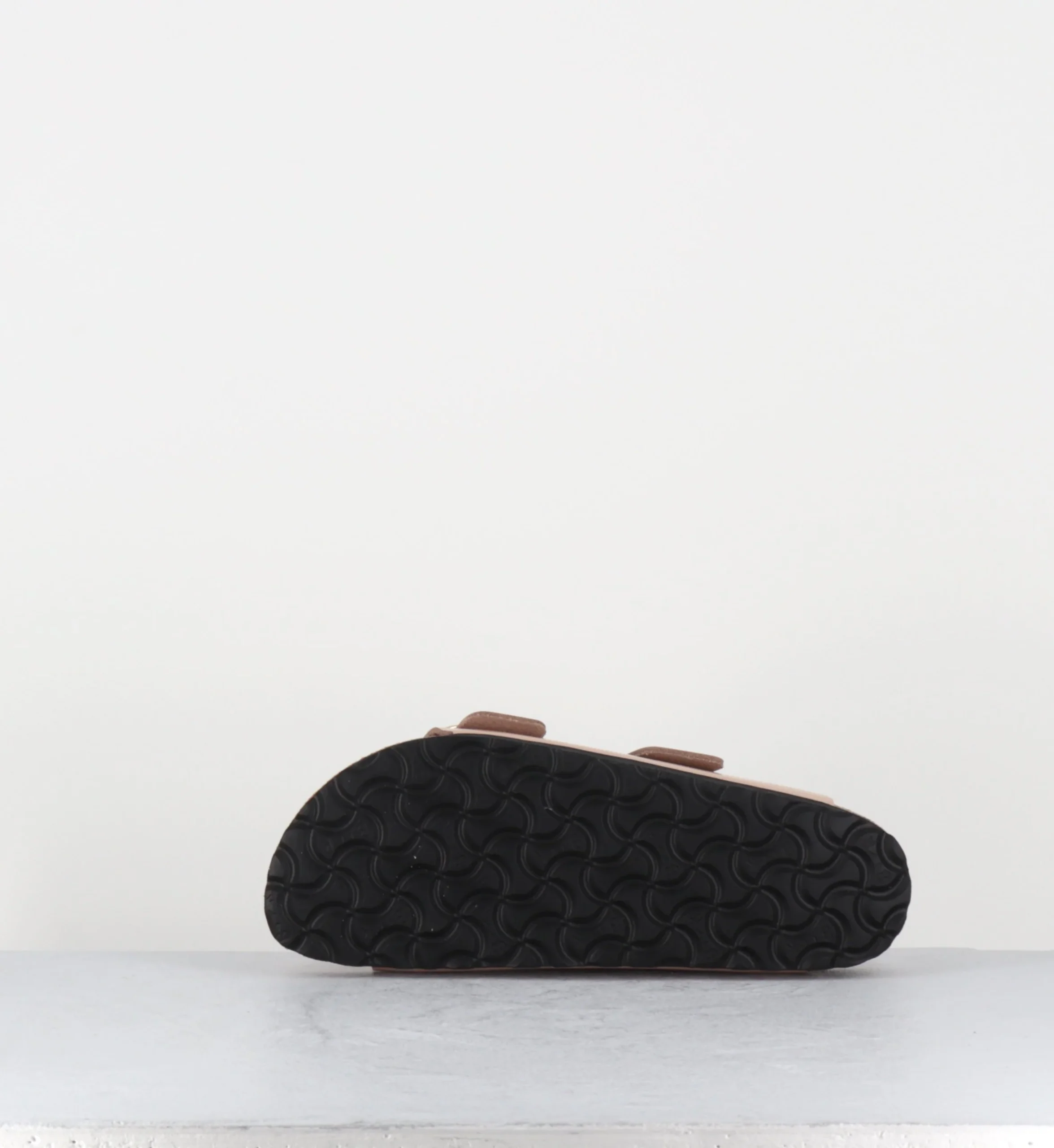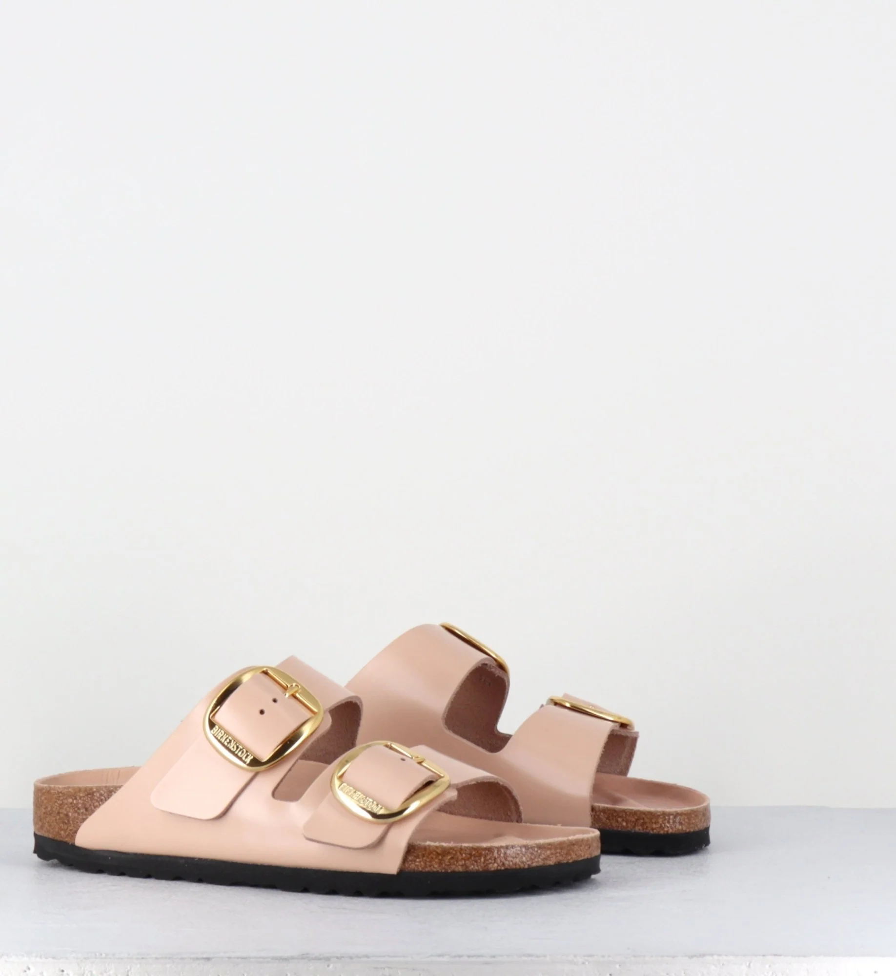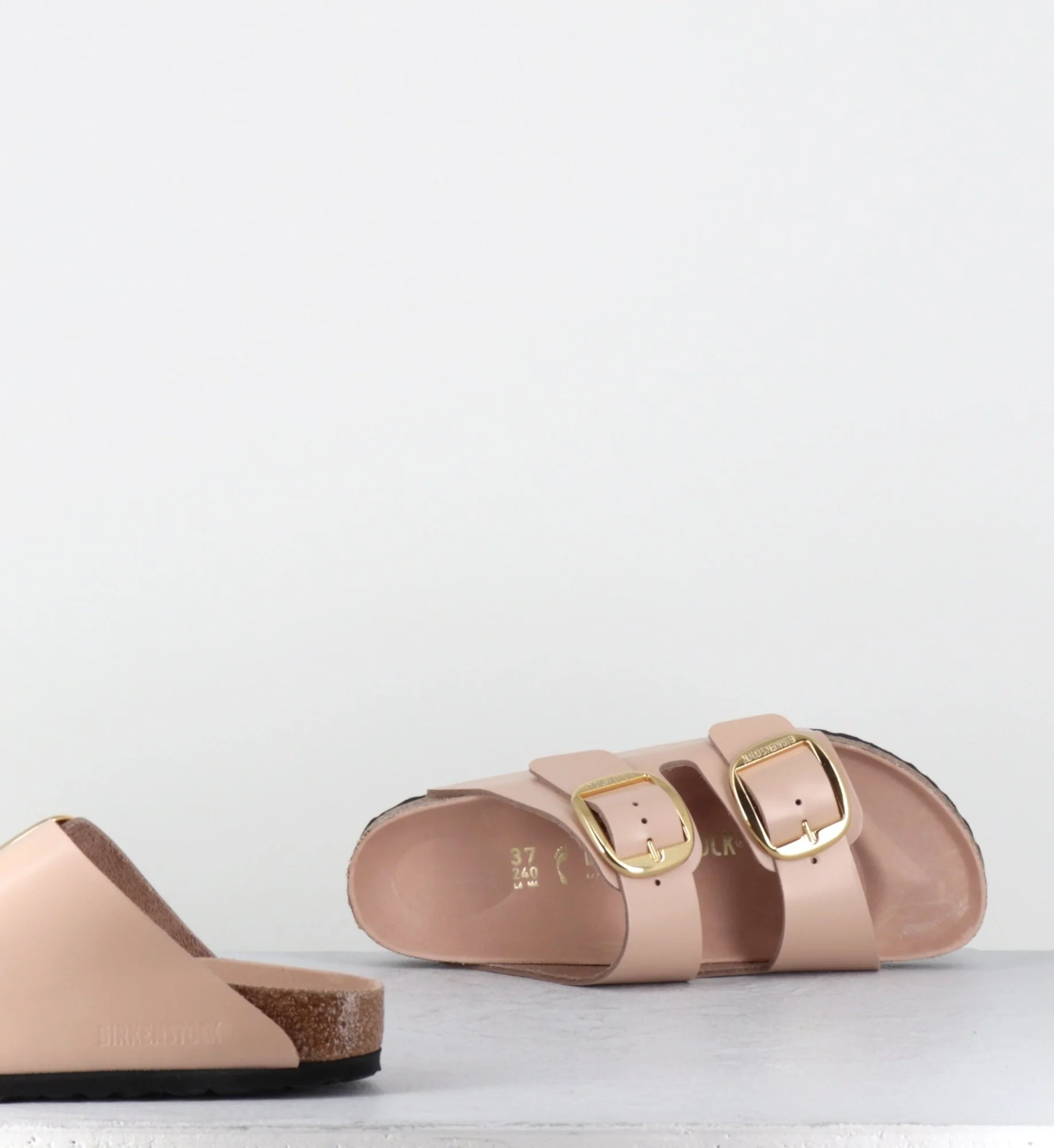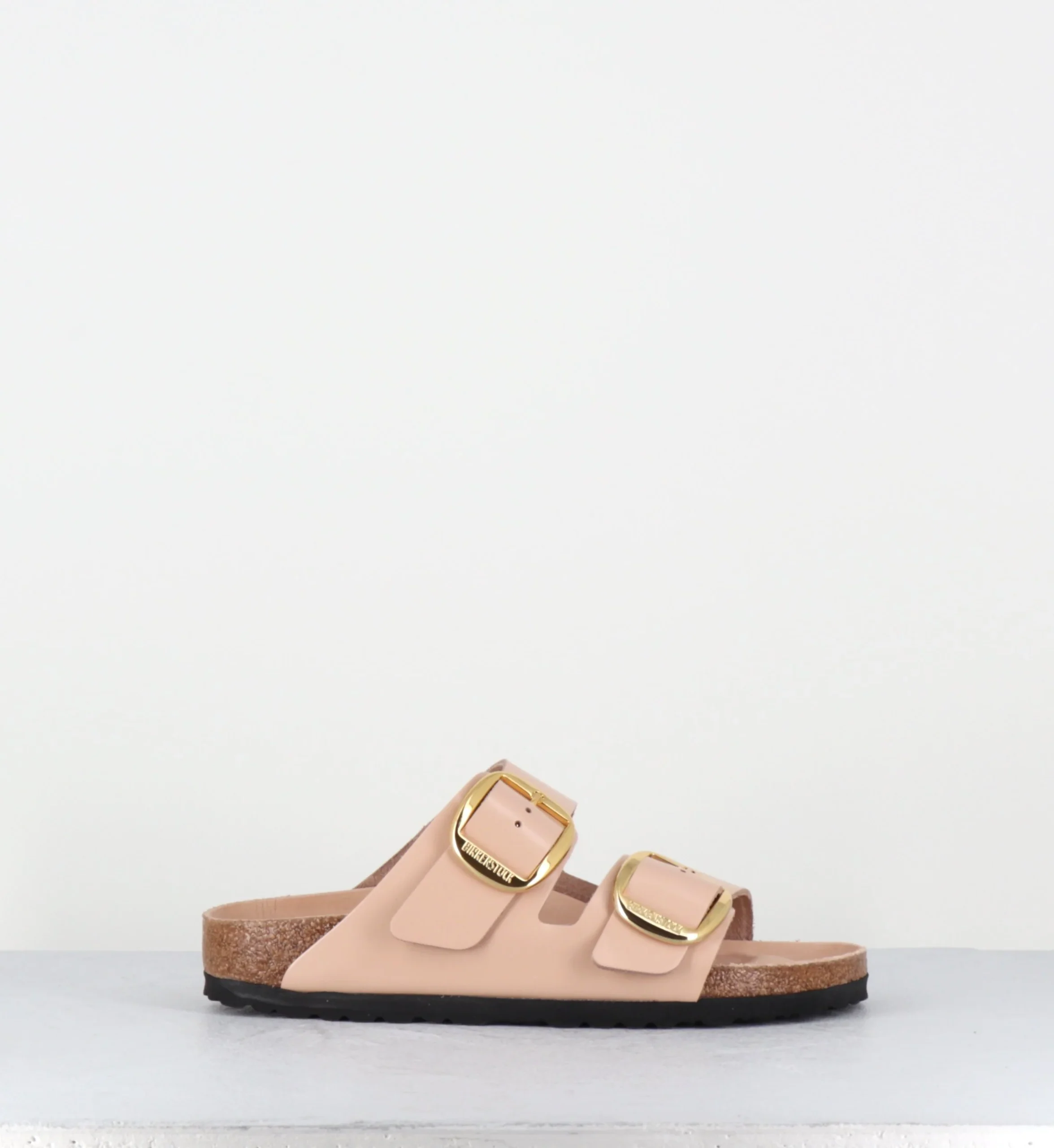 L’Arizona est la sandale iconique de Birkenstock depuis des décennies. Ce modèle se présente ici dans une version en cuir glacé beige avec deux brides à grande boucle dorée ardillon élégante.