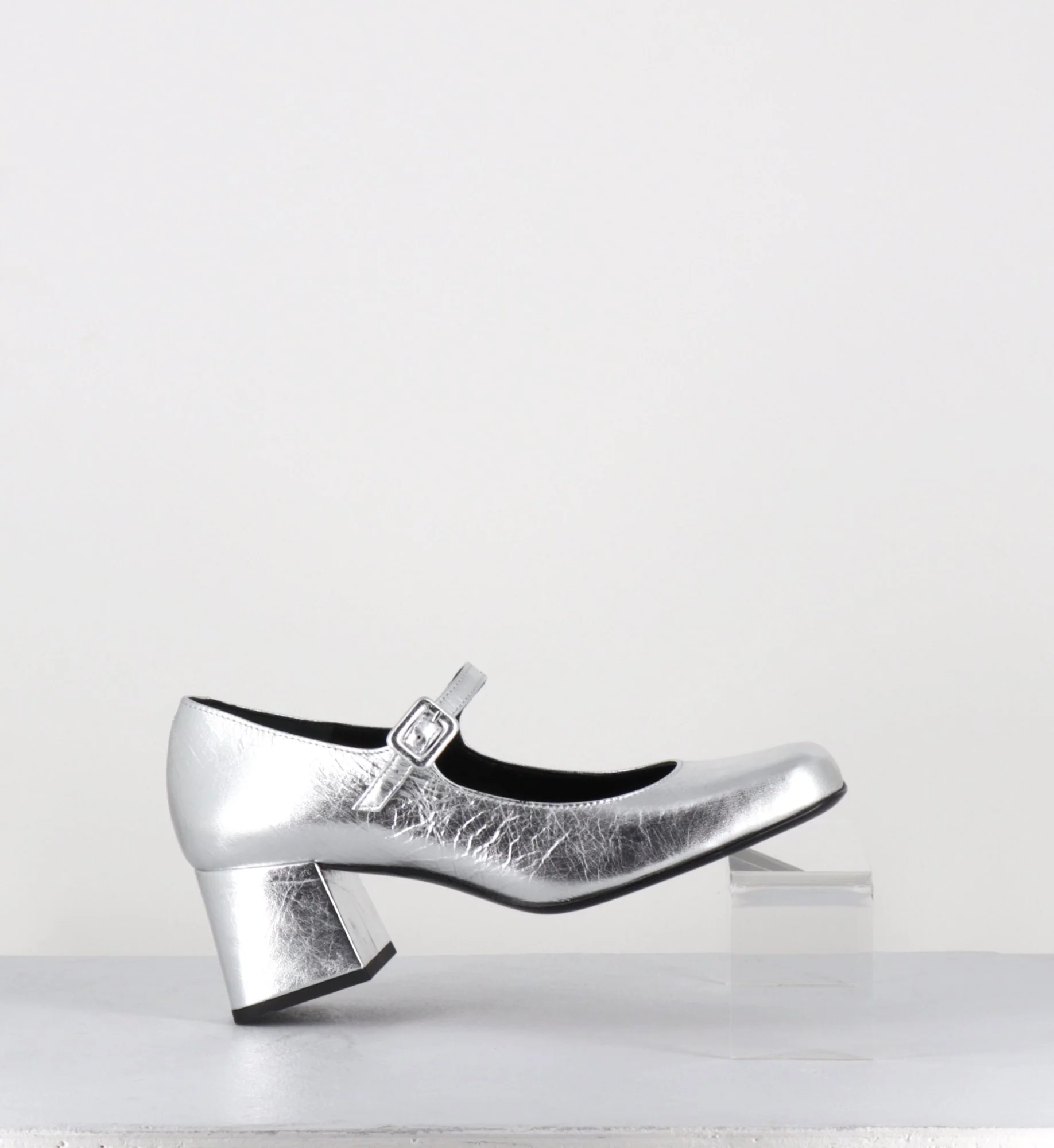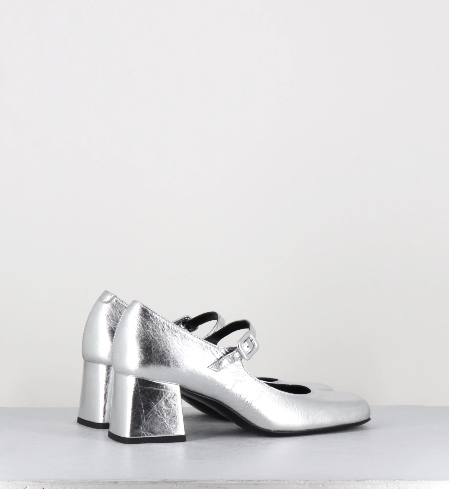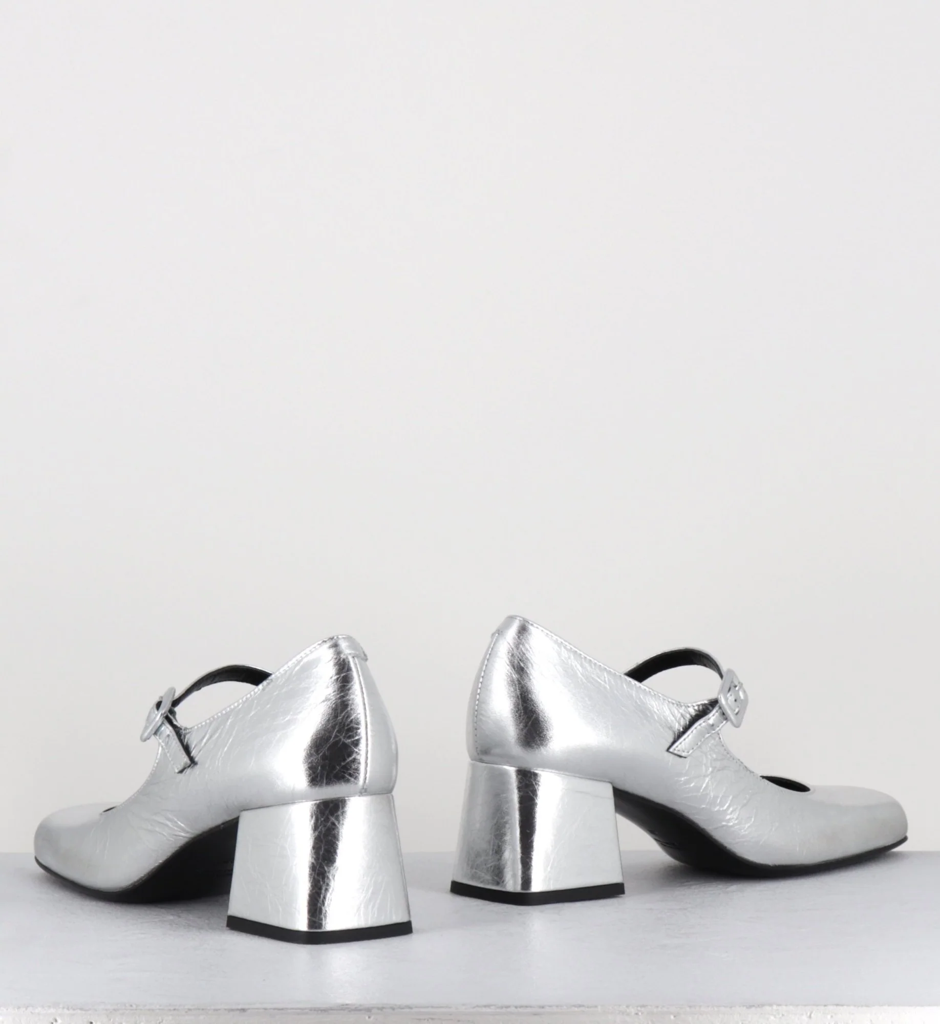 Chaussures babies à bride en cuir métallisé argent bout carré arrondi et petit talon bloc esprit 60s