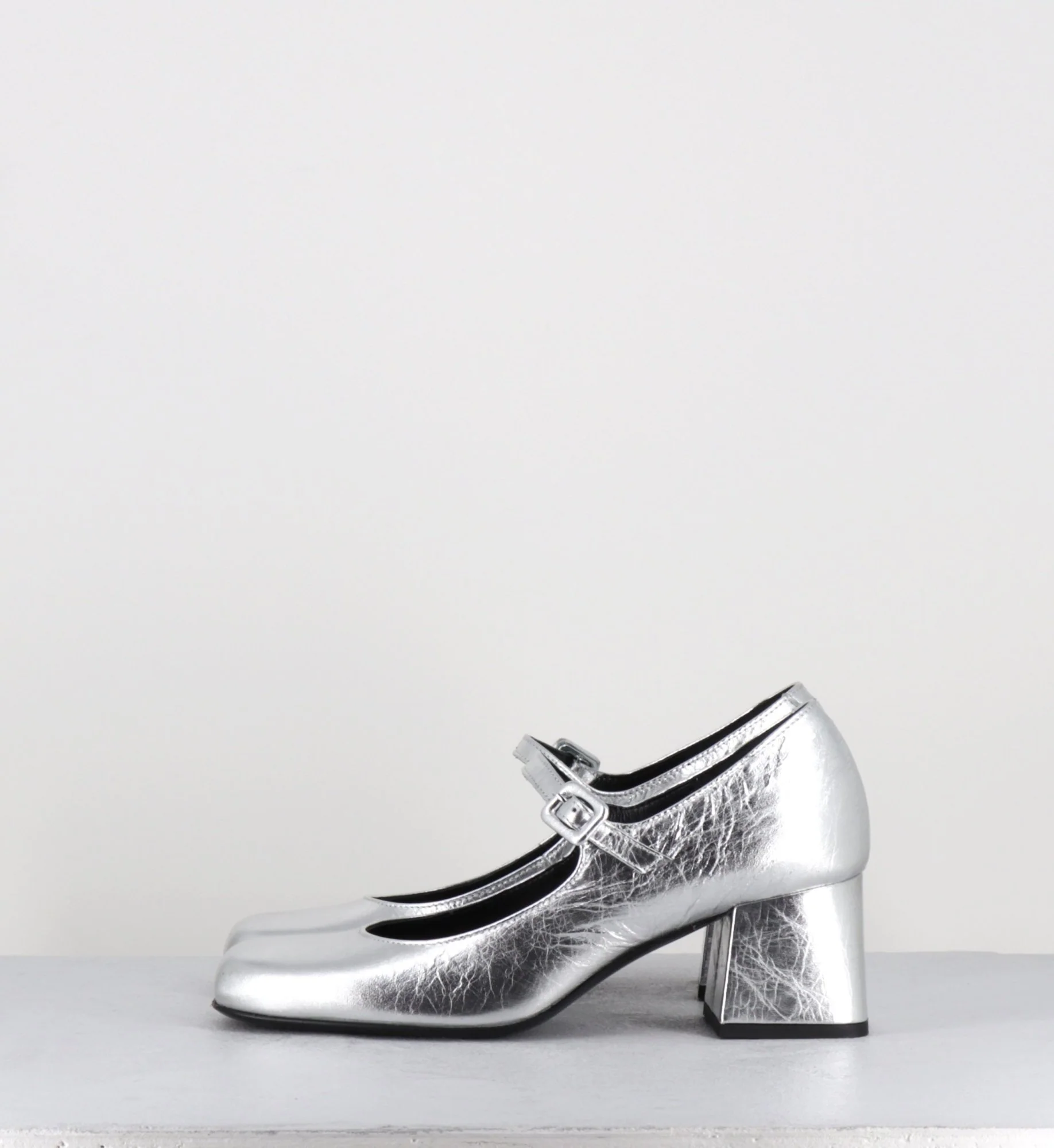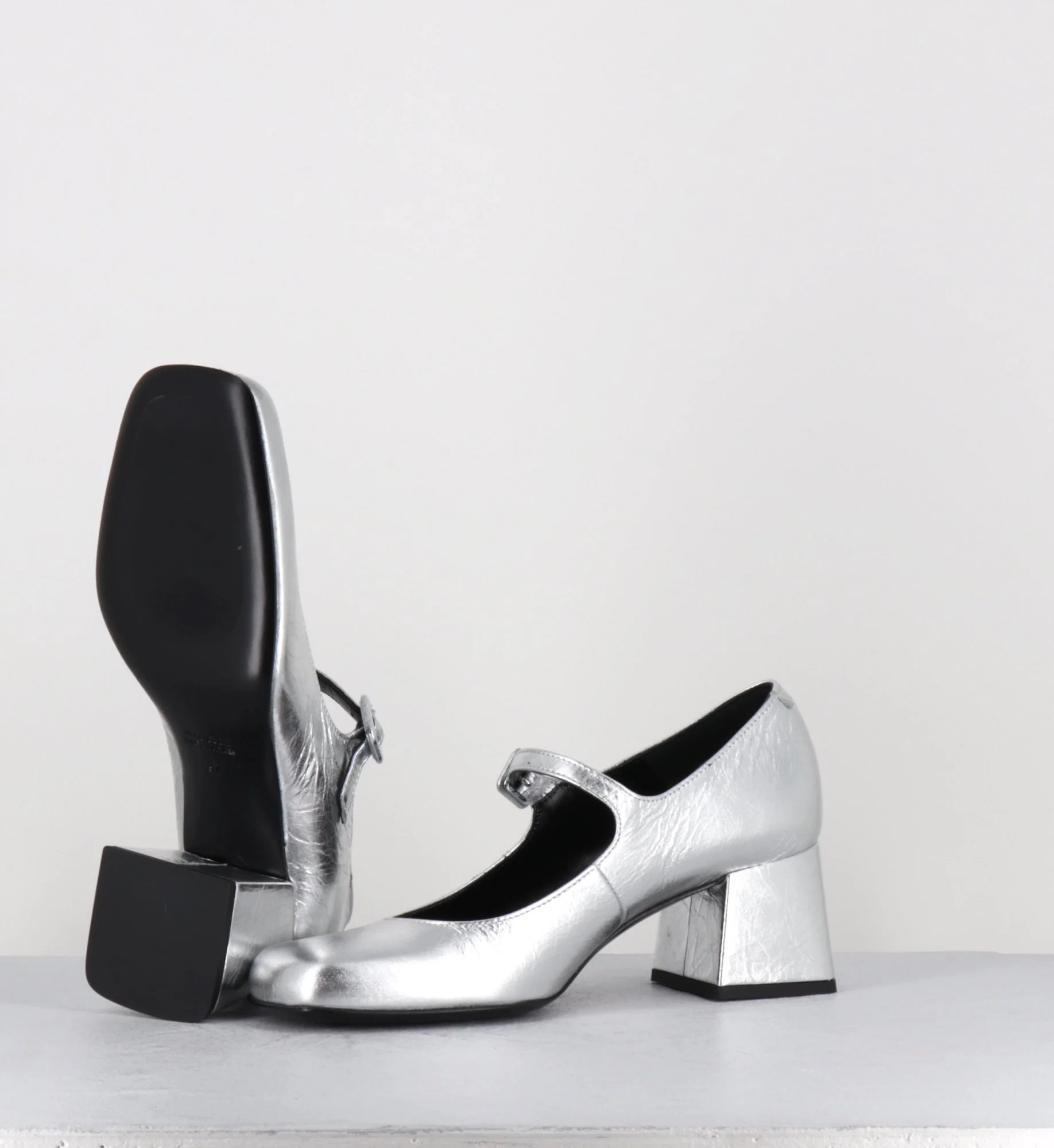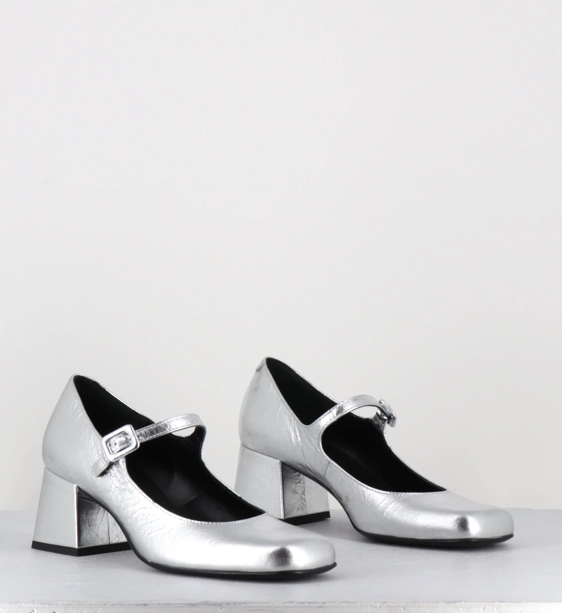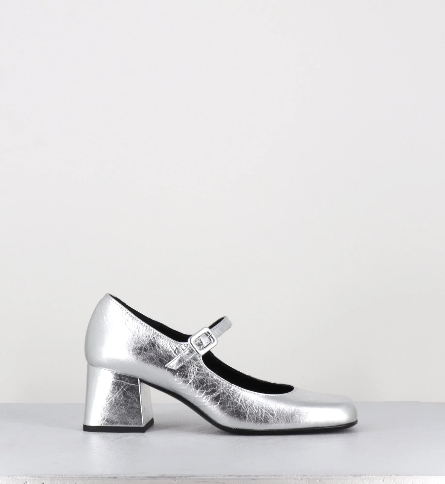 Chaussures babies à bride en cuir métallisé argent bout carré arrondi et petit talon bloc esprit 60s