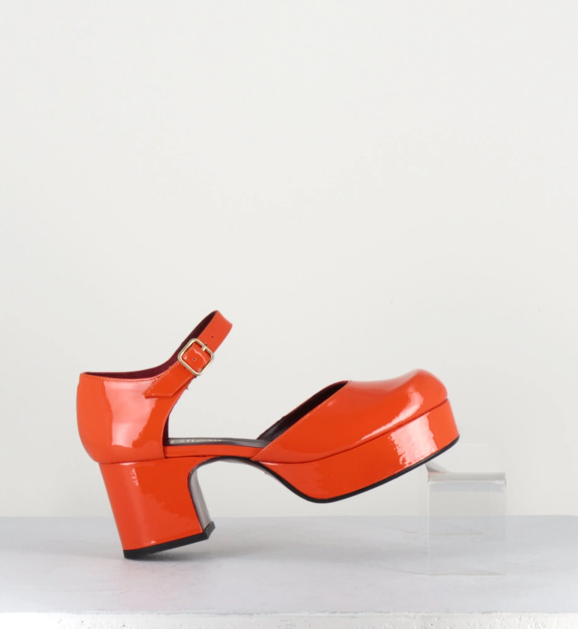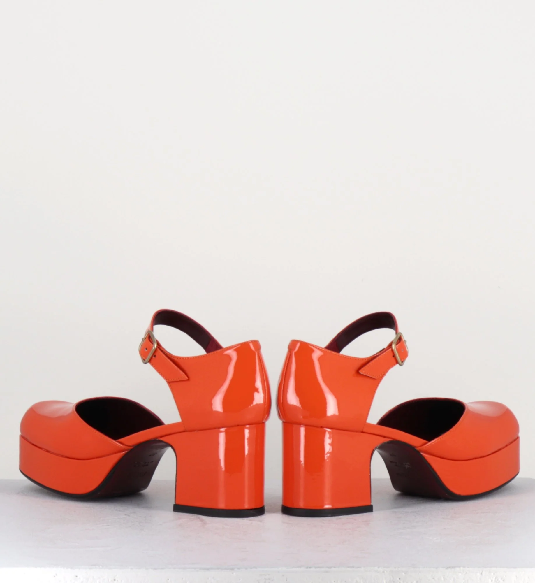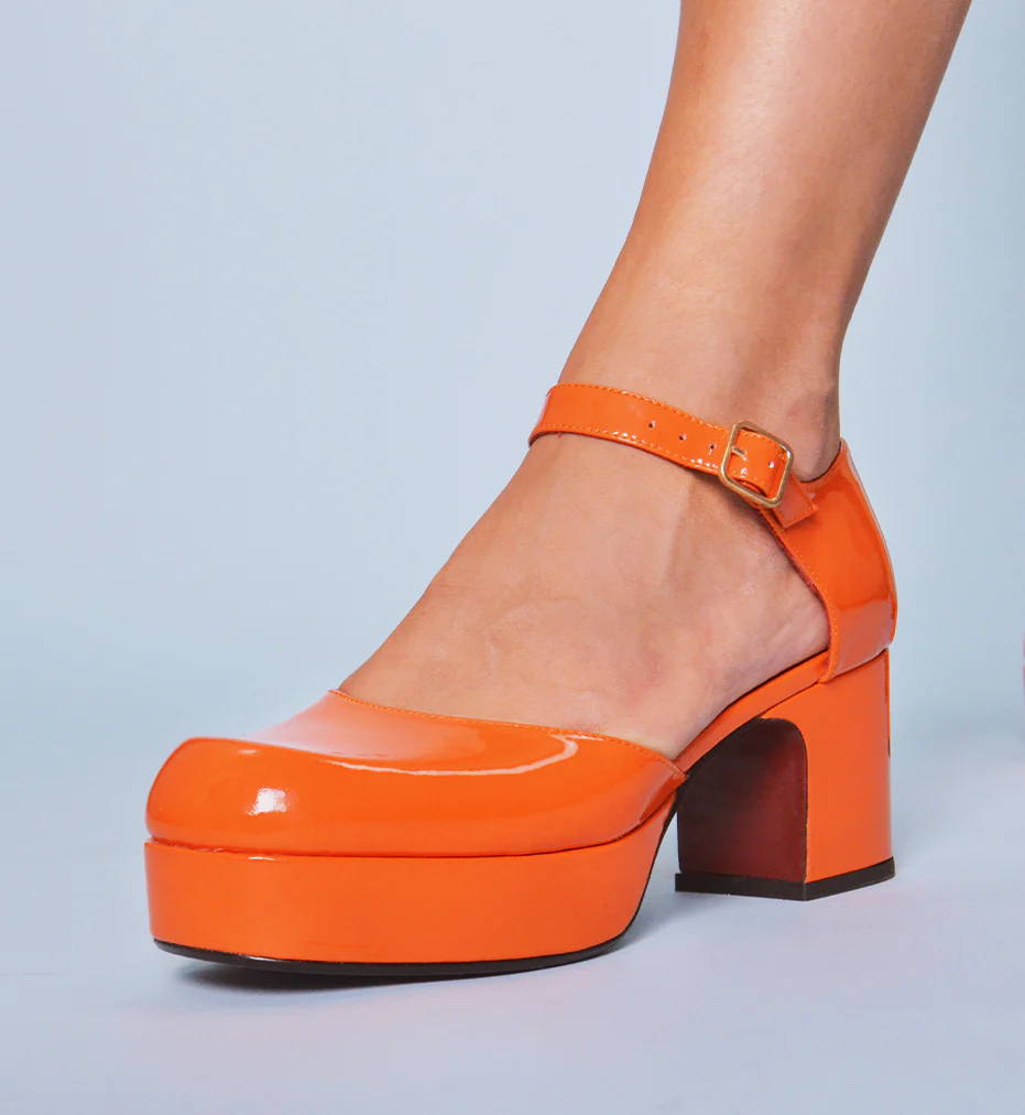 Babies à plateforme en cuir vernis orange, montées sur un petit talon esprit années 70 irrésistible ! Modèle issu de notre collaboration avec la créatrice Française Avril Gau – Fabrication Artisanale Espagnole Chausse grand