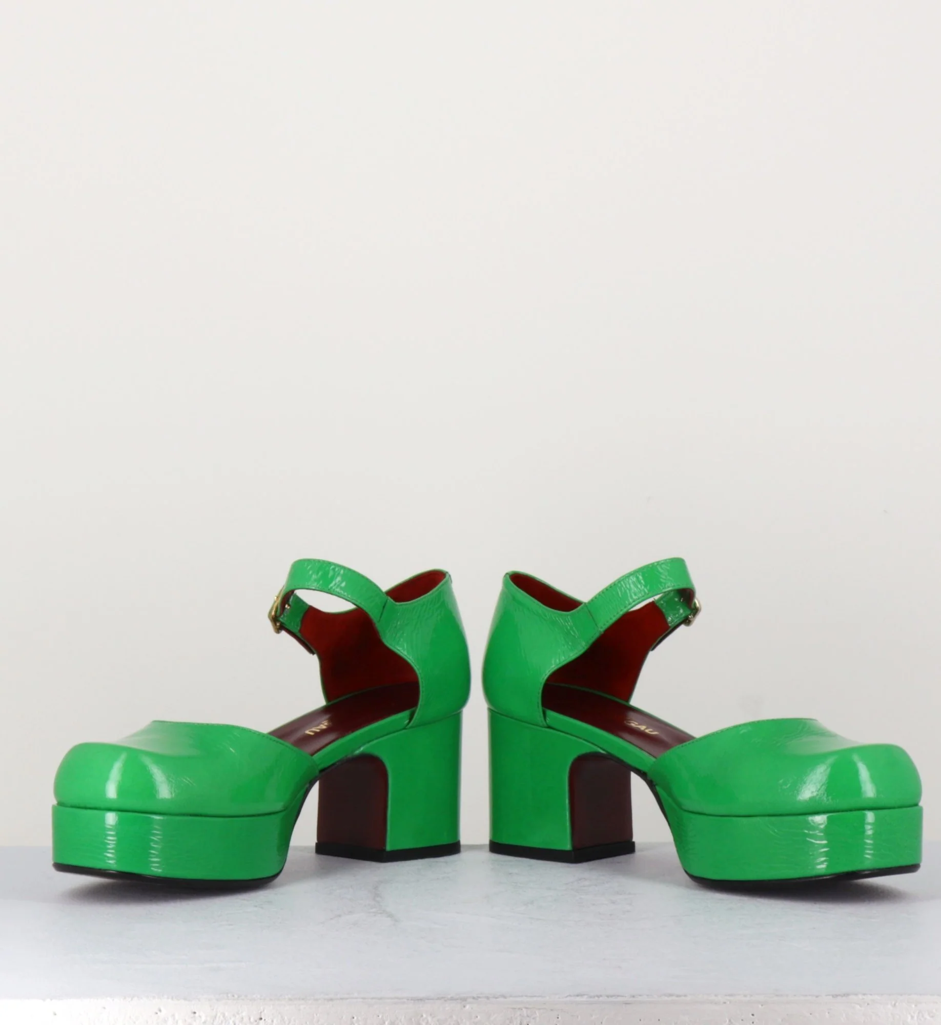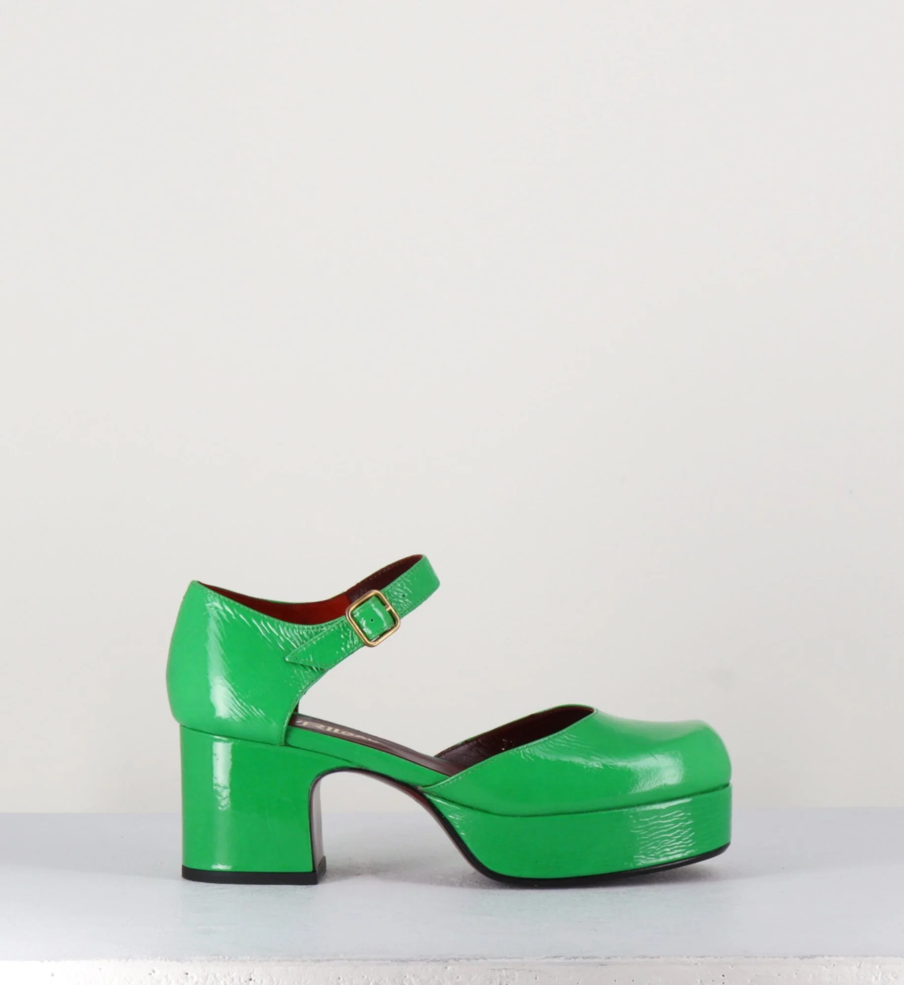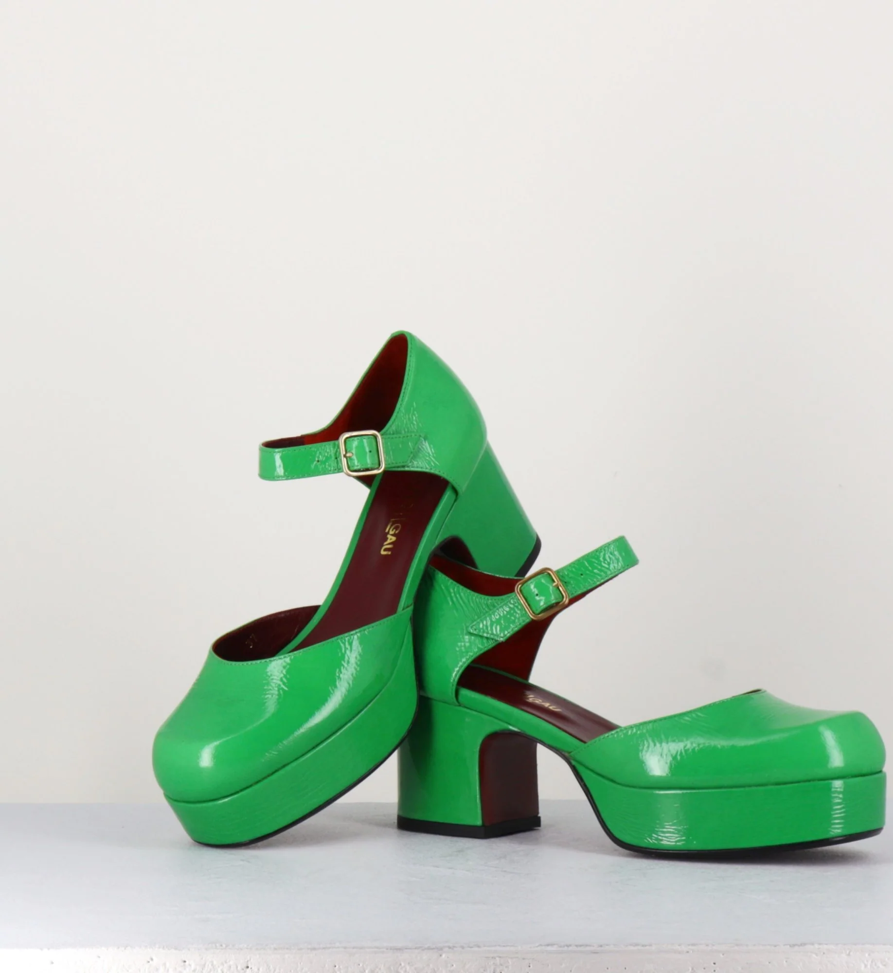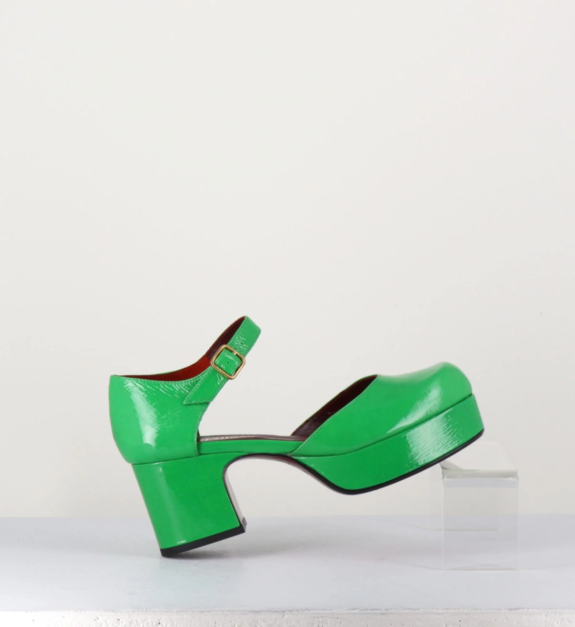 Babies à plateforme en cuir vernis vert, montées sur un petit talon esprit années 70 irrésistible !