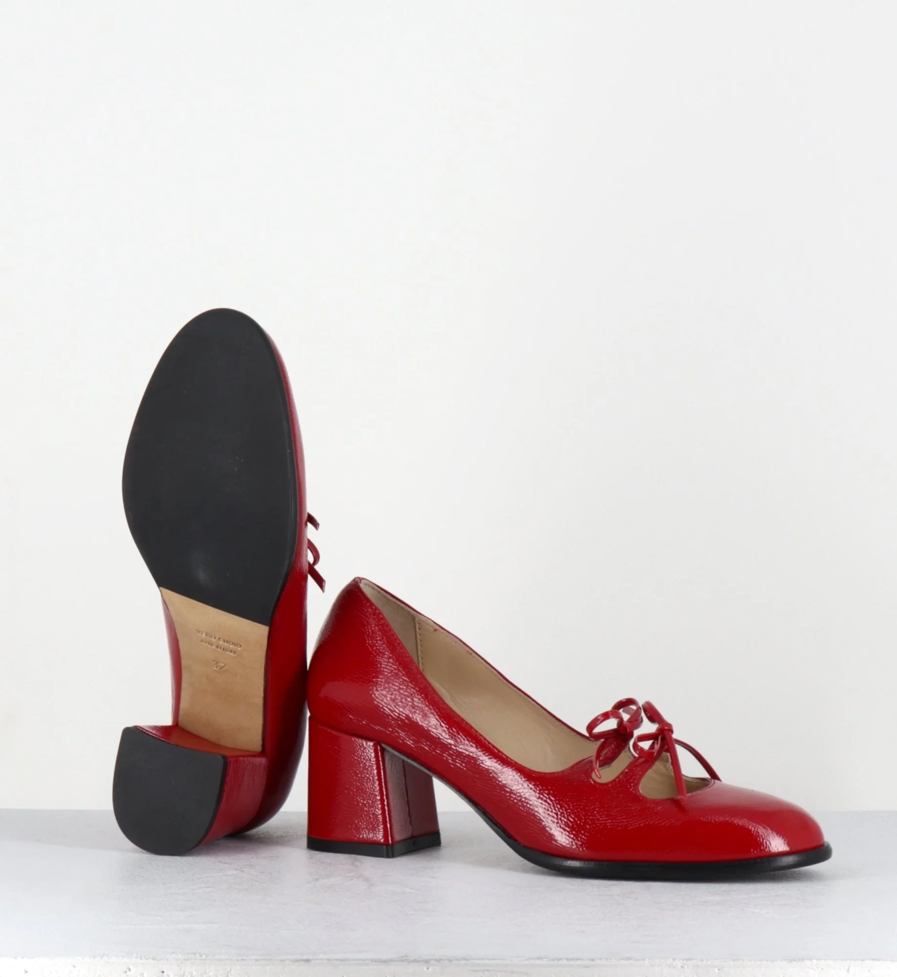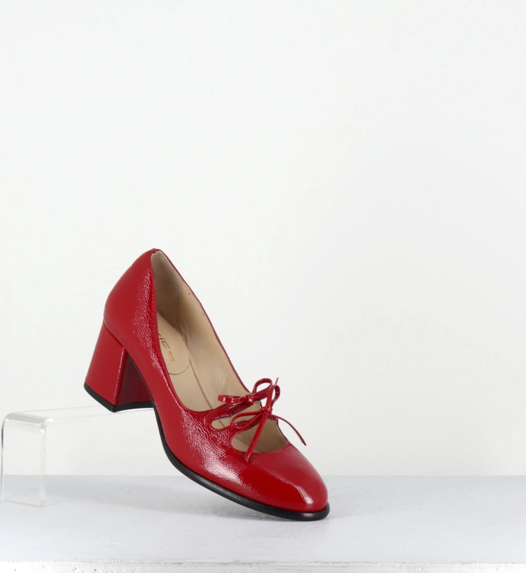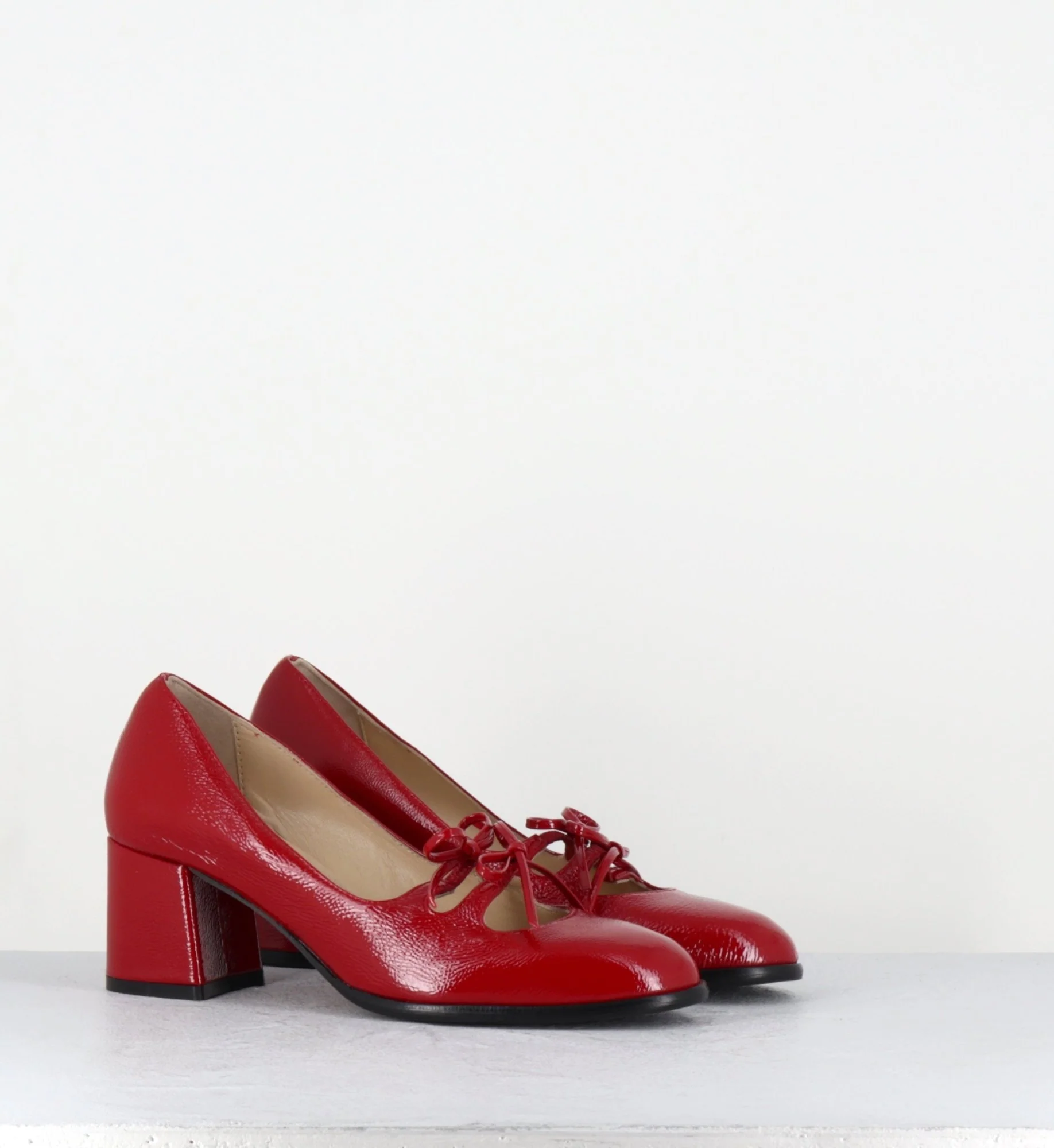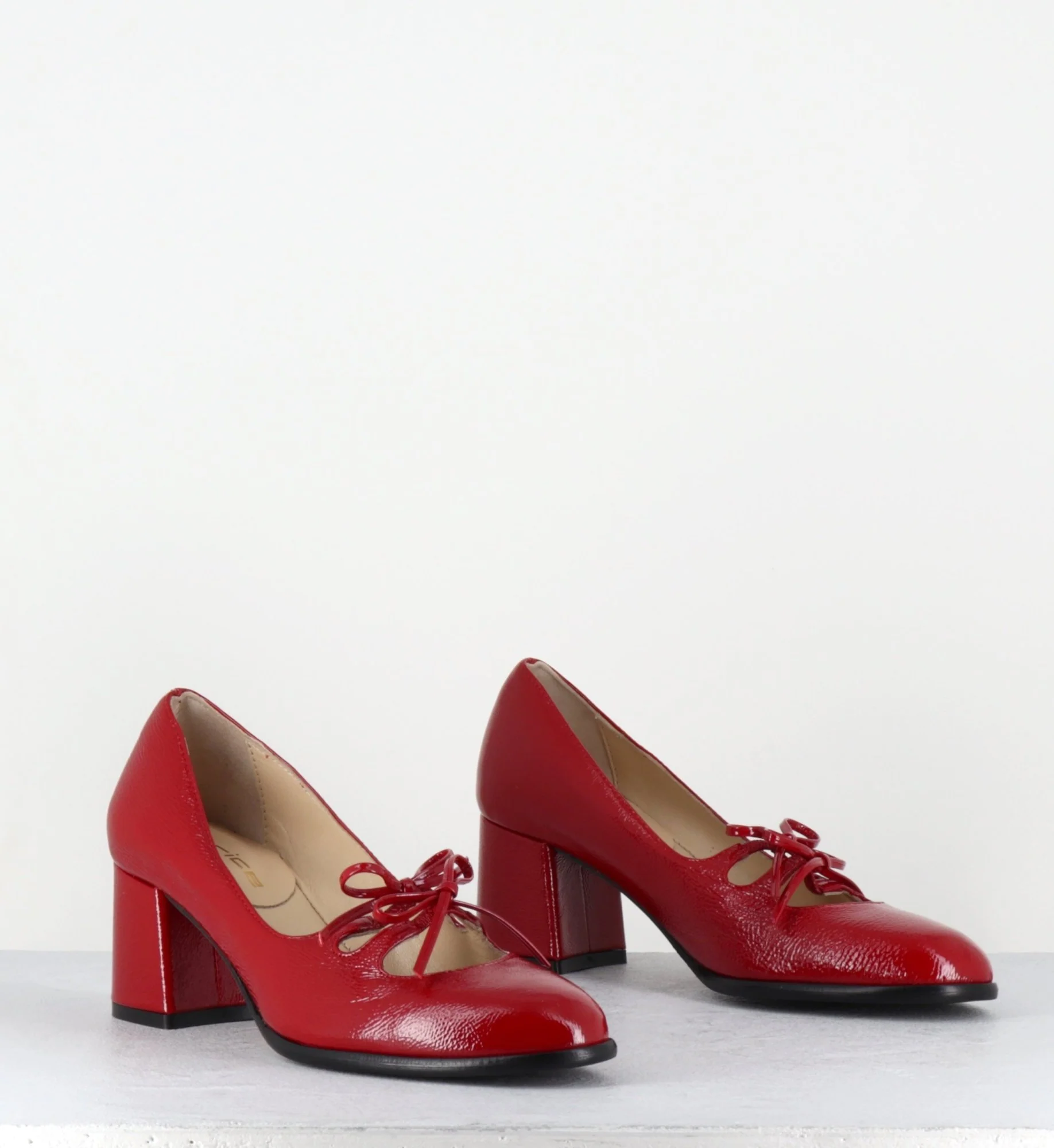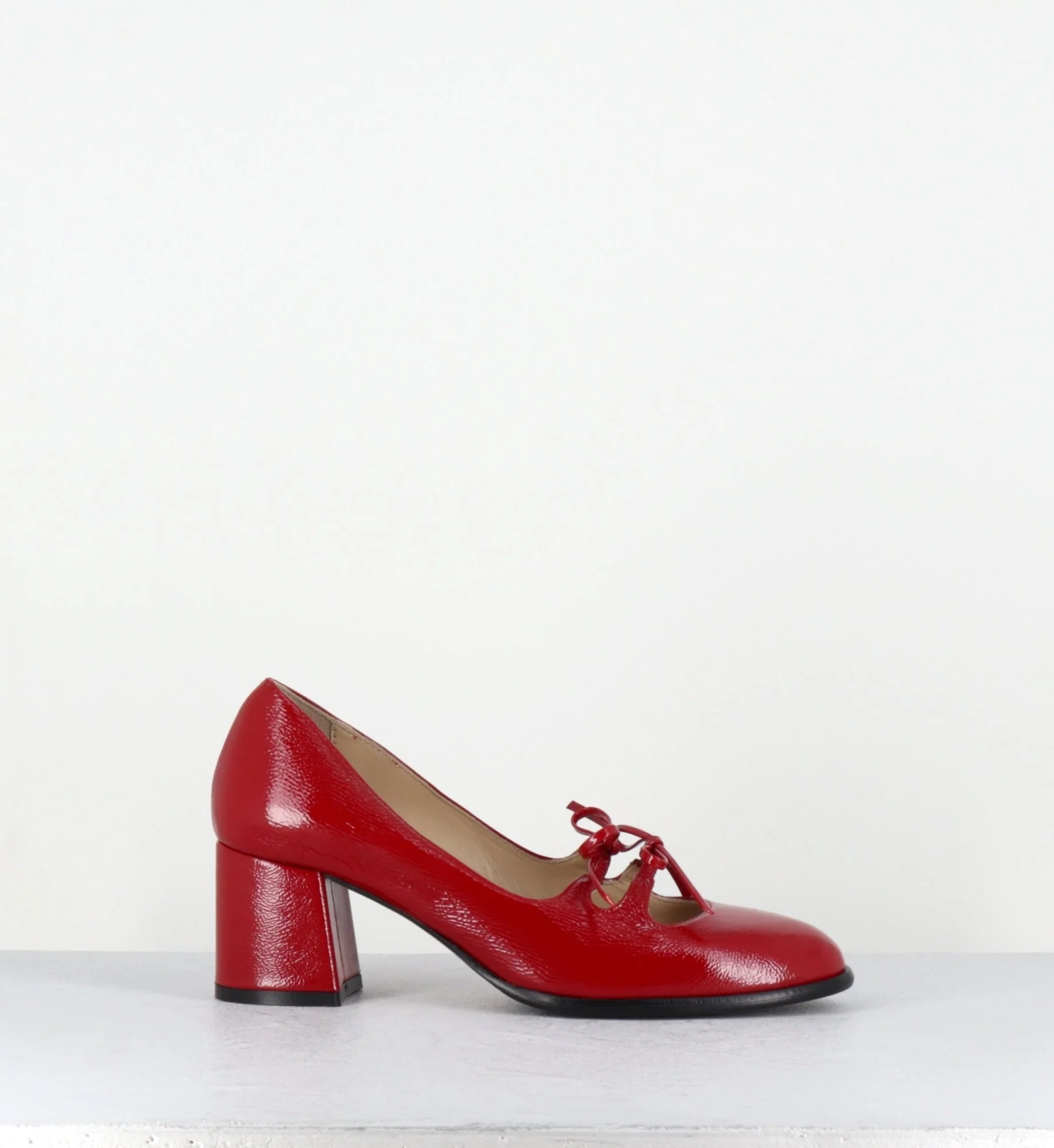 Babies à talon en cuir naplak rouge avec petits noeuds décoratifs cousus sur des élastiques de confort invisibles, bout en amande, montées sur un talon bloc