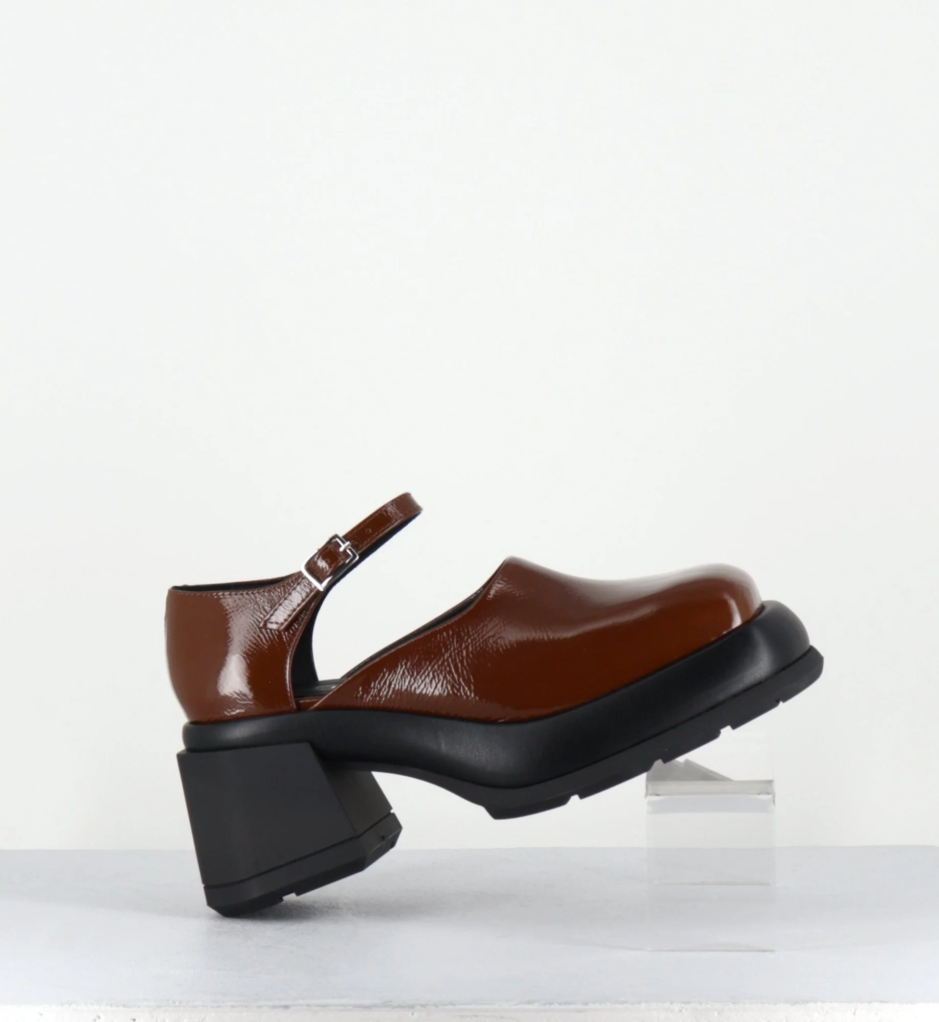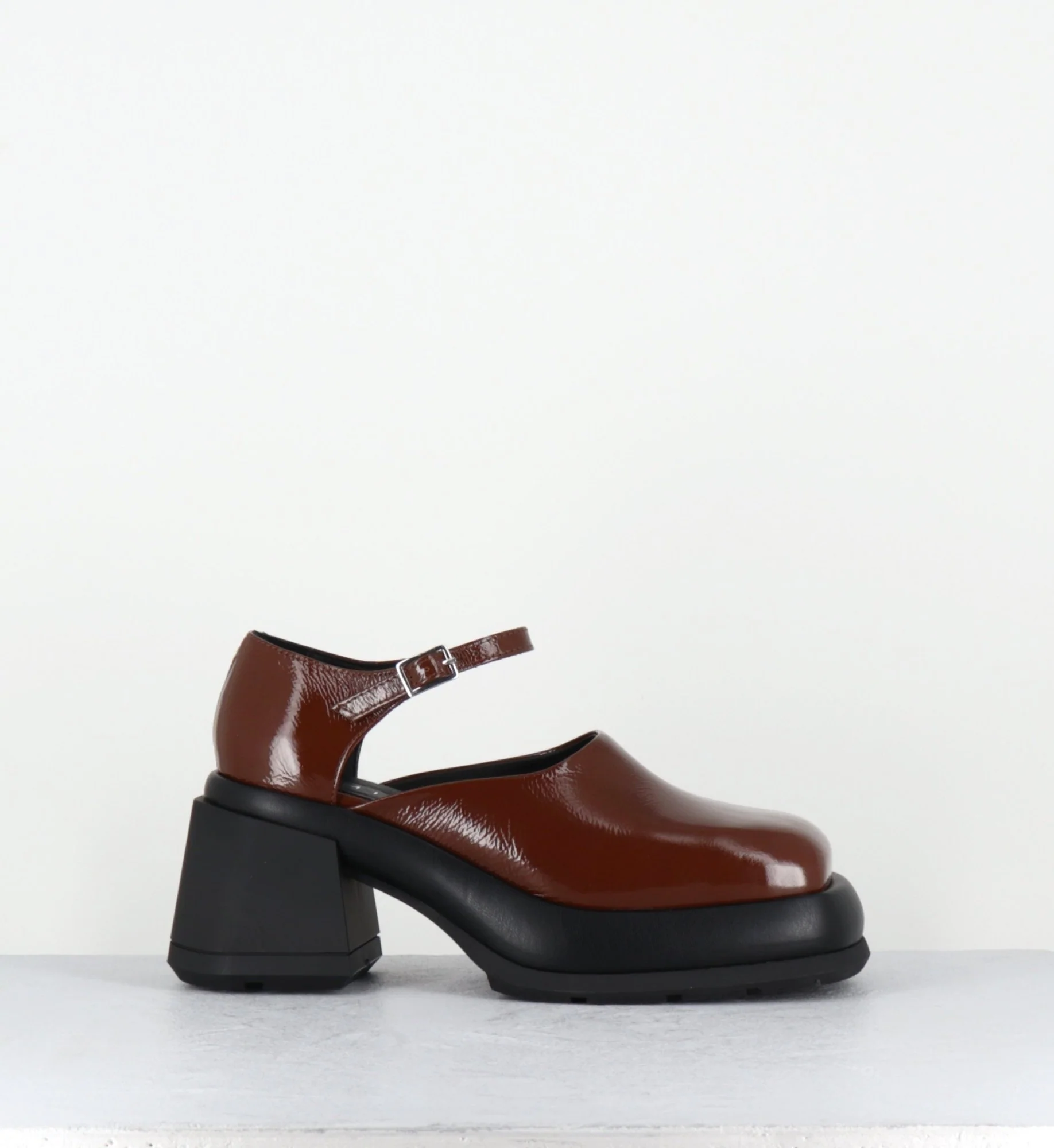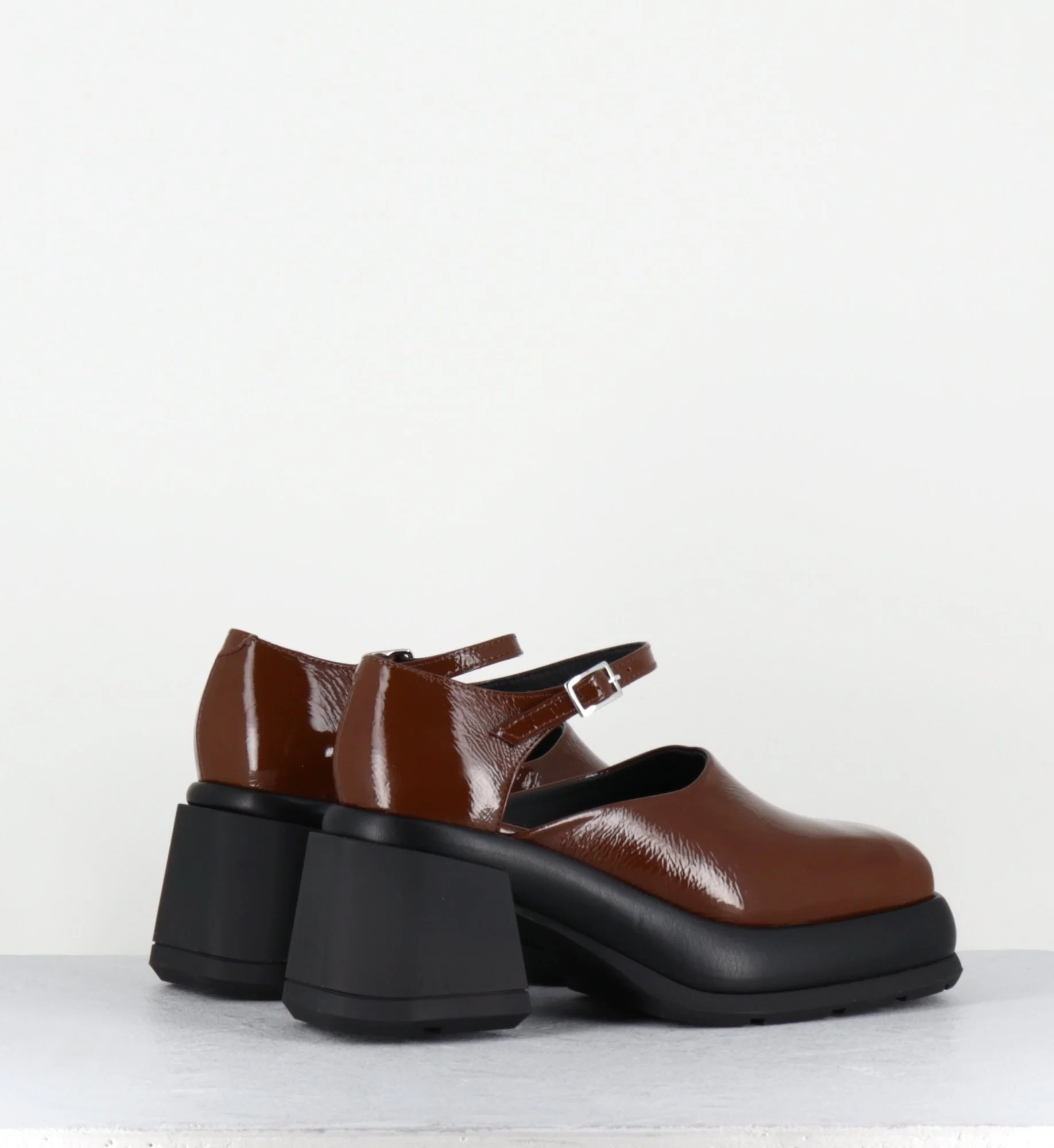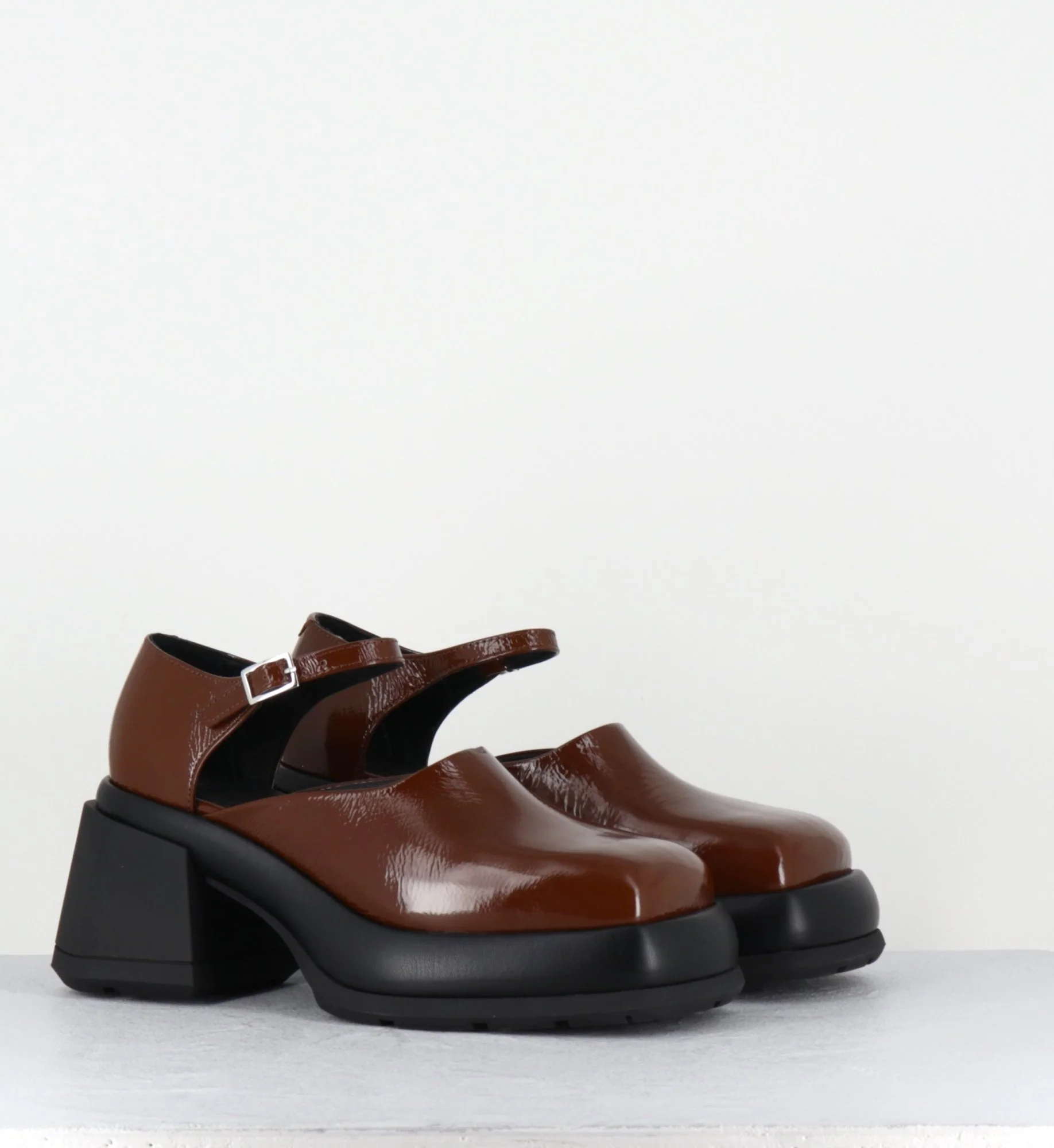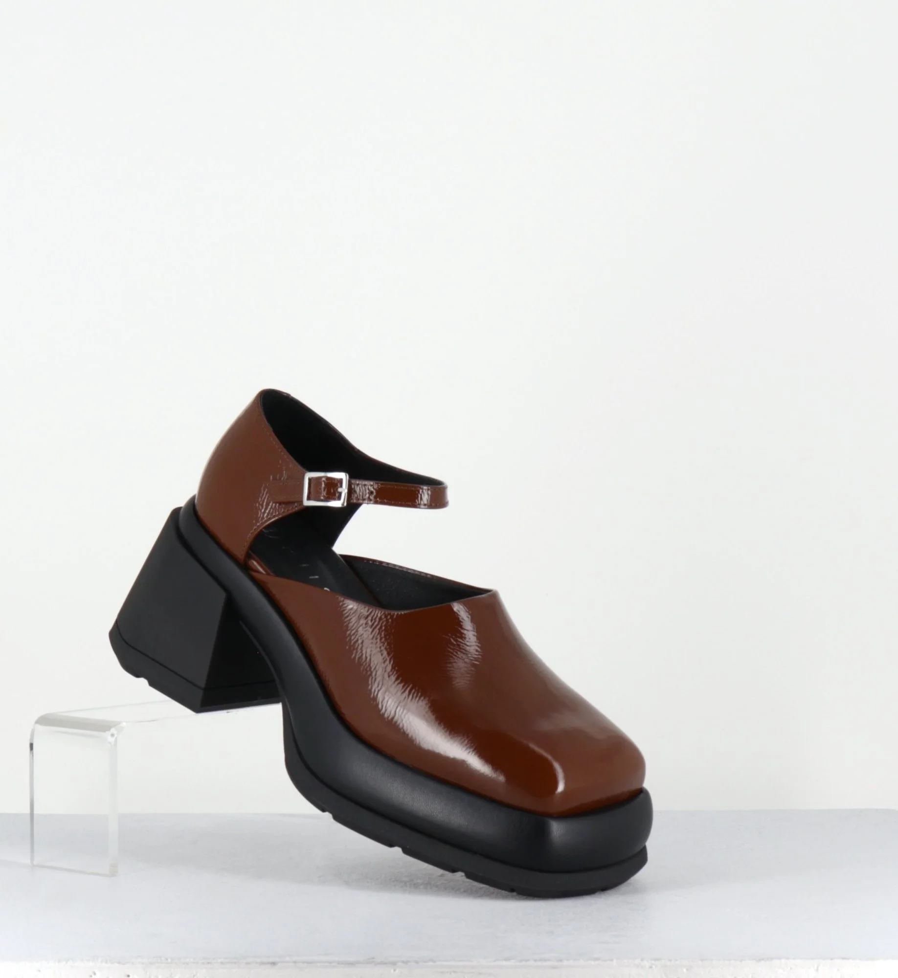 Chaussures Mary-Jane à plateforme en cuir naplak marron, bout carré large esprit années 90, montées sur un talon bloc en gomme légèrement évasé Fabriqué à la main au Portugal – Ateliers E8 by Miista Chausse légèrement grand