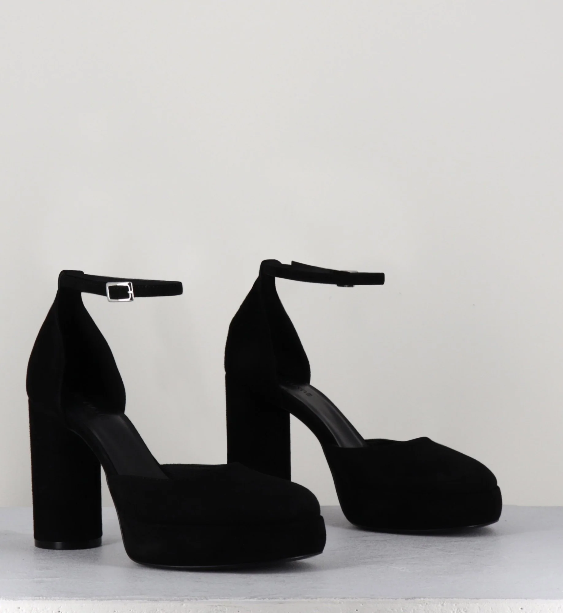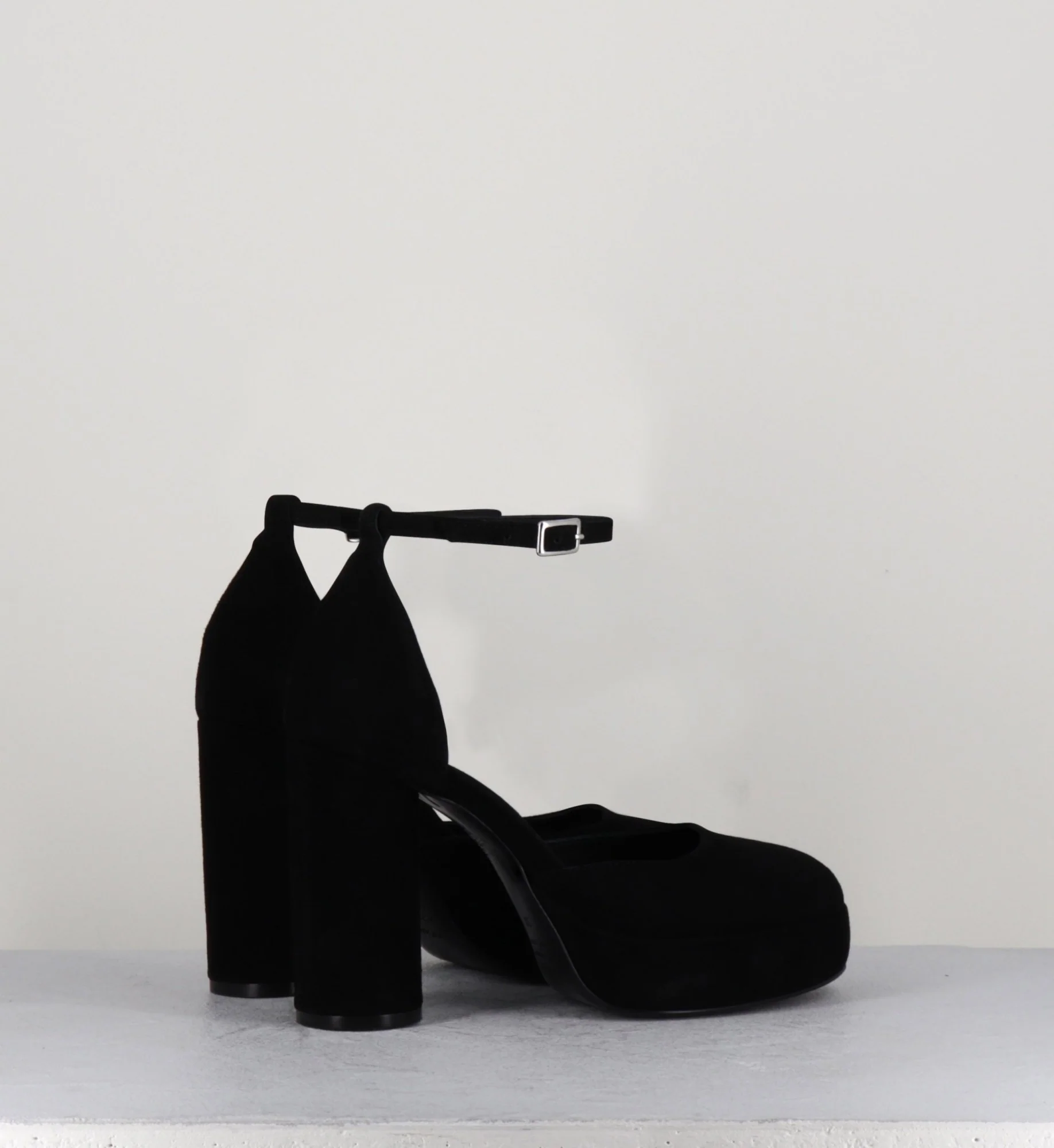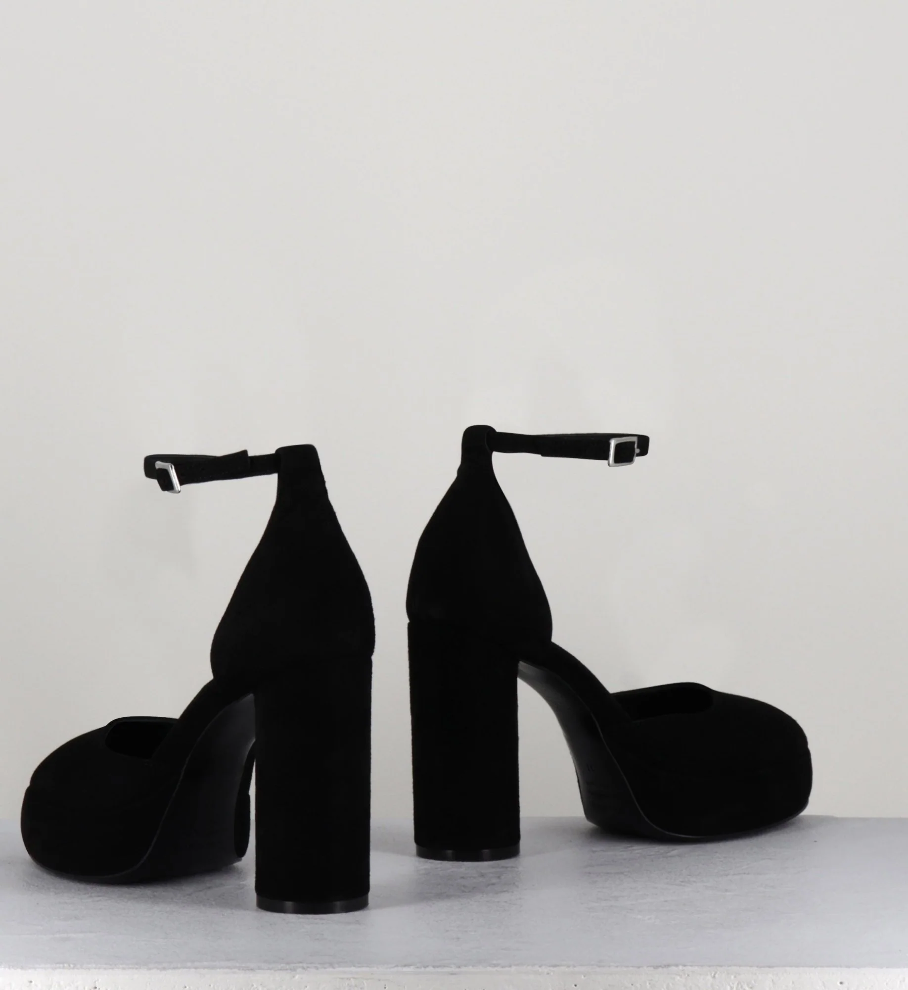 Babies à plateforme en daim noir, bride cheville réglable, bout arrondi, montées sur un haut talon cylindrique structuré