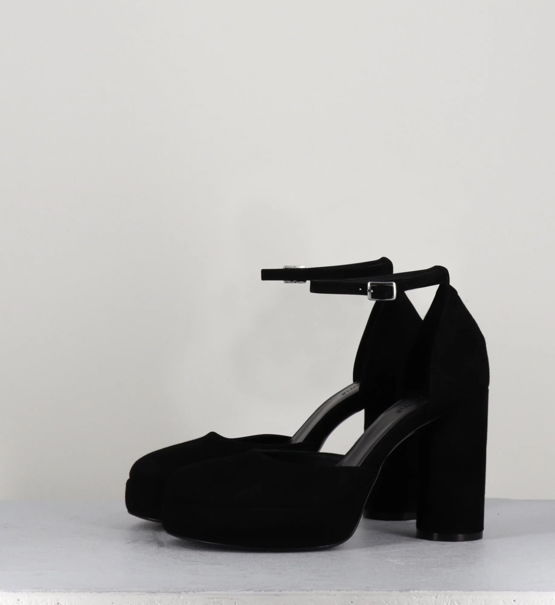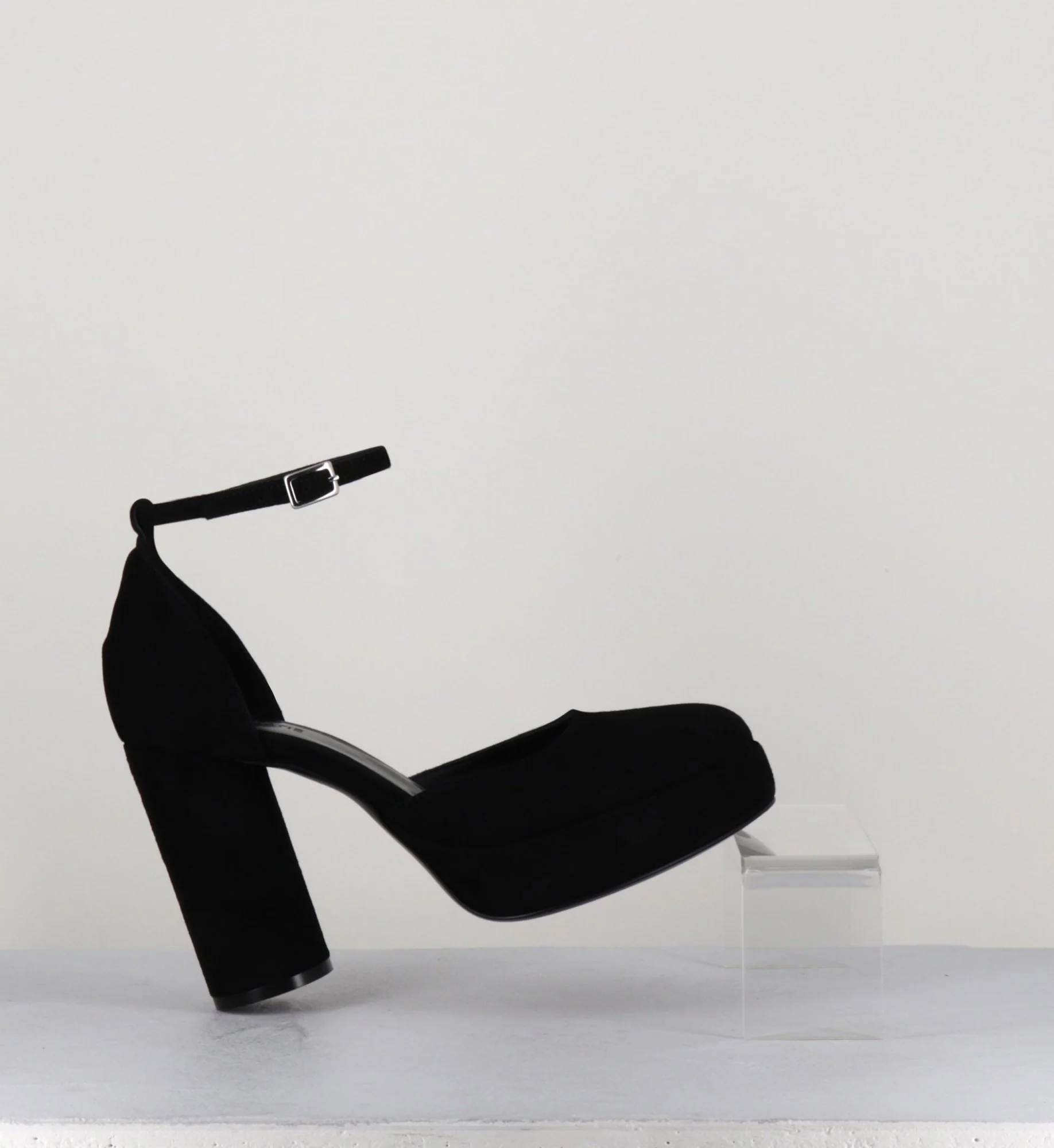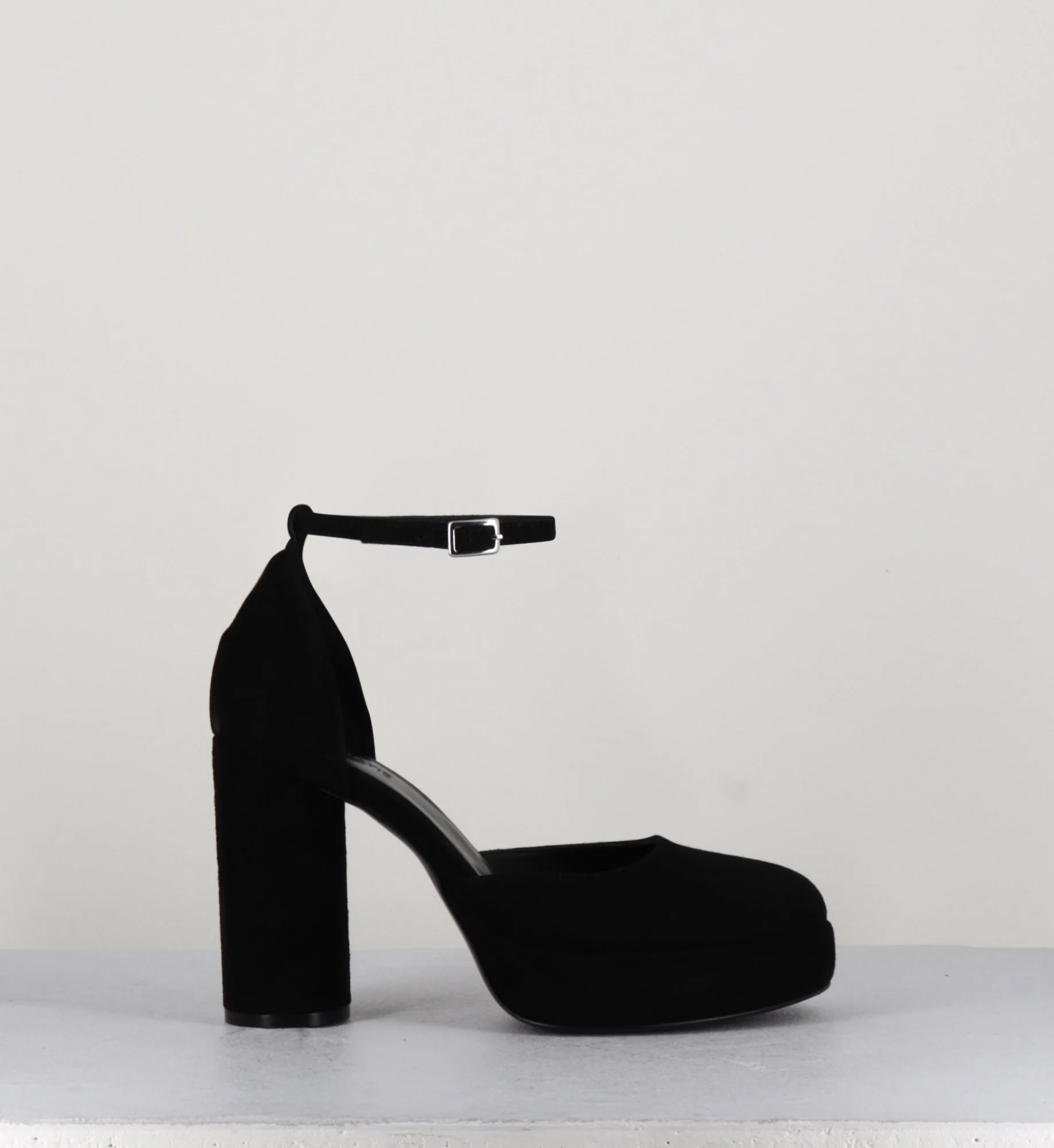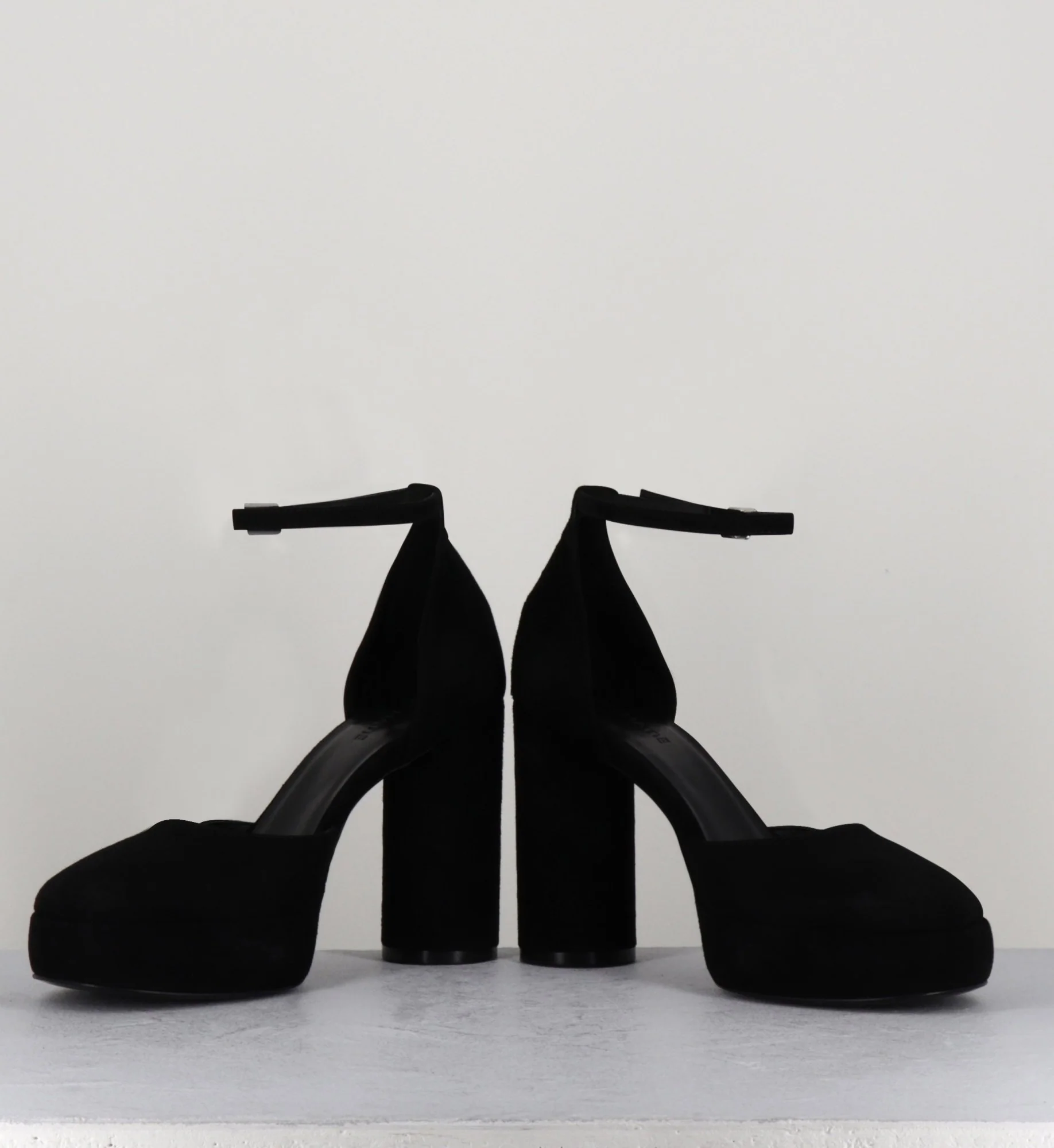 Babies à plateforme en daim noir, bride cheville réglable, bout arrondi, montées sur un haut talon cylindrique structuré