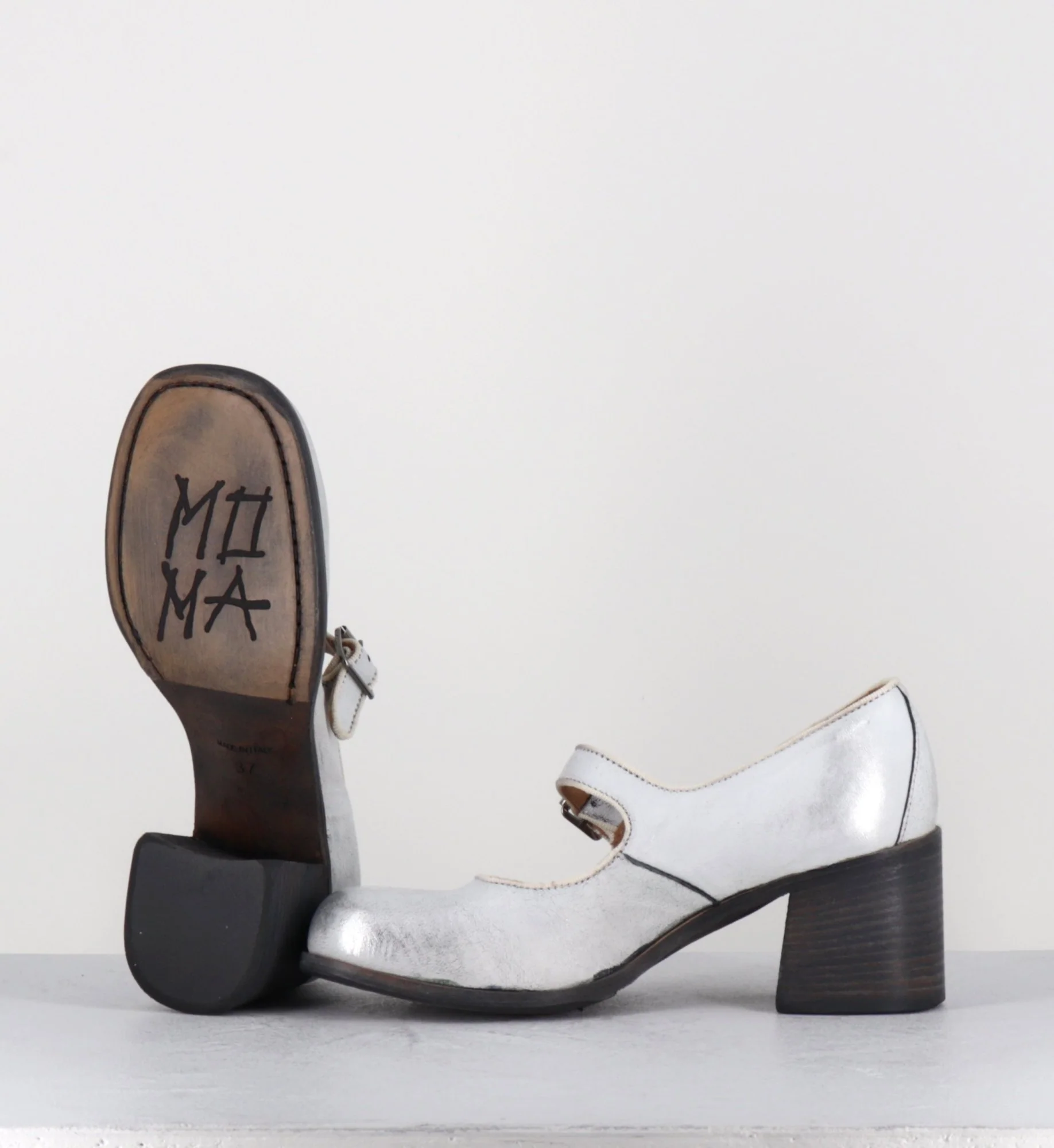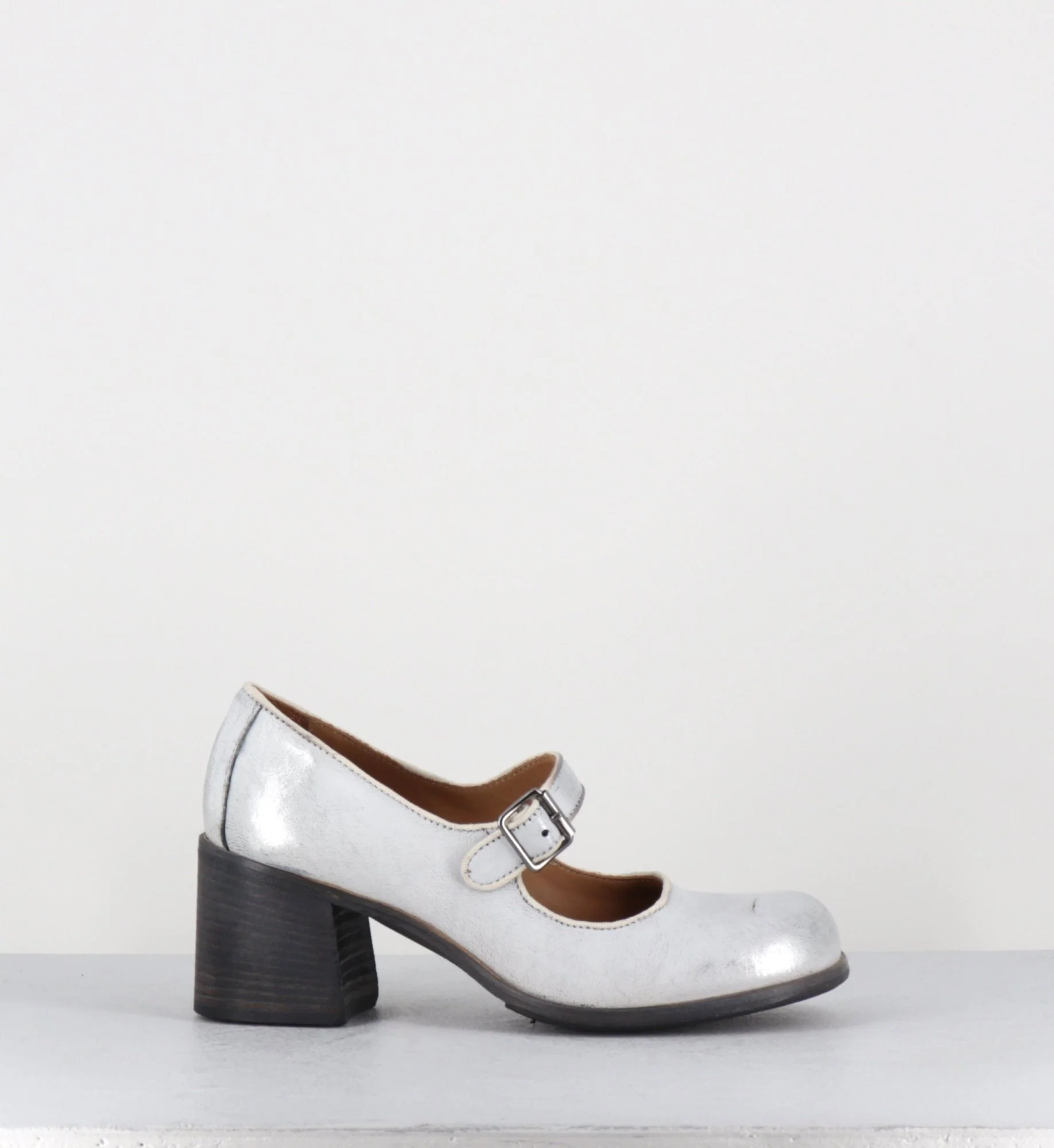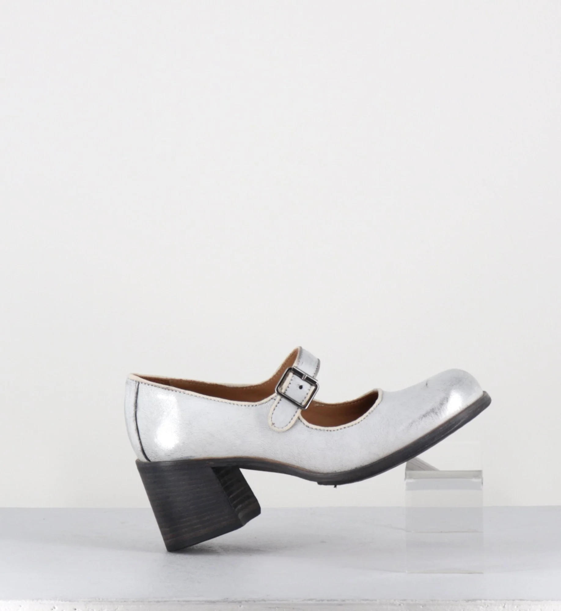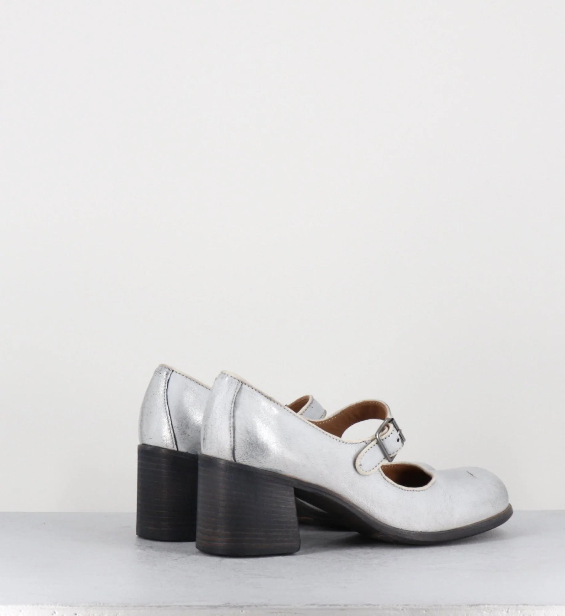 Chaussures babies en cuir souple métallisé argent, ligne pure esprit avant-garde, bout carré-arrondi, montées sur une semelle cousue et lavée à la main pour un effet usé et un talon bloc confortable Fabrication Artisanale Italienne – Ateliers Moma Chausse légèrement grand