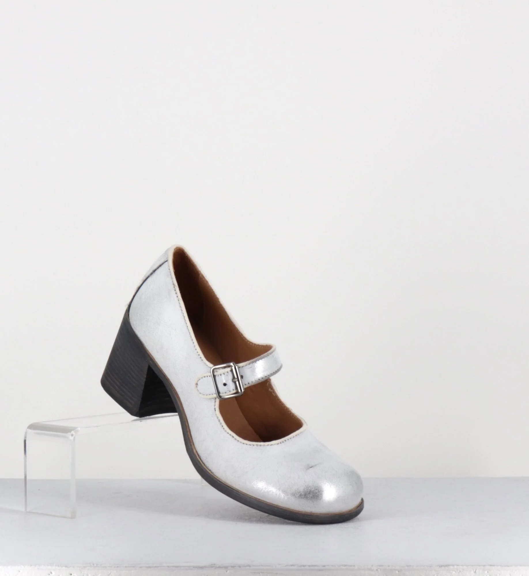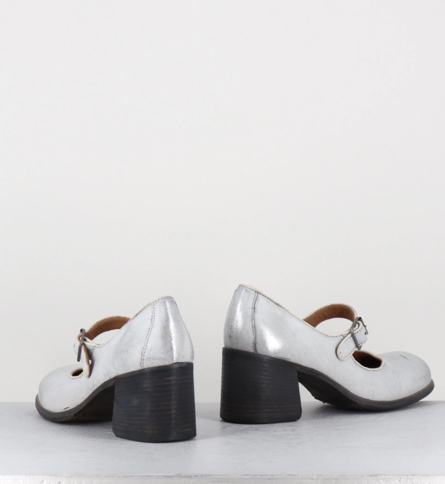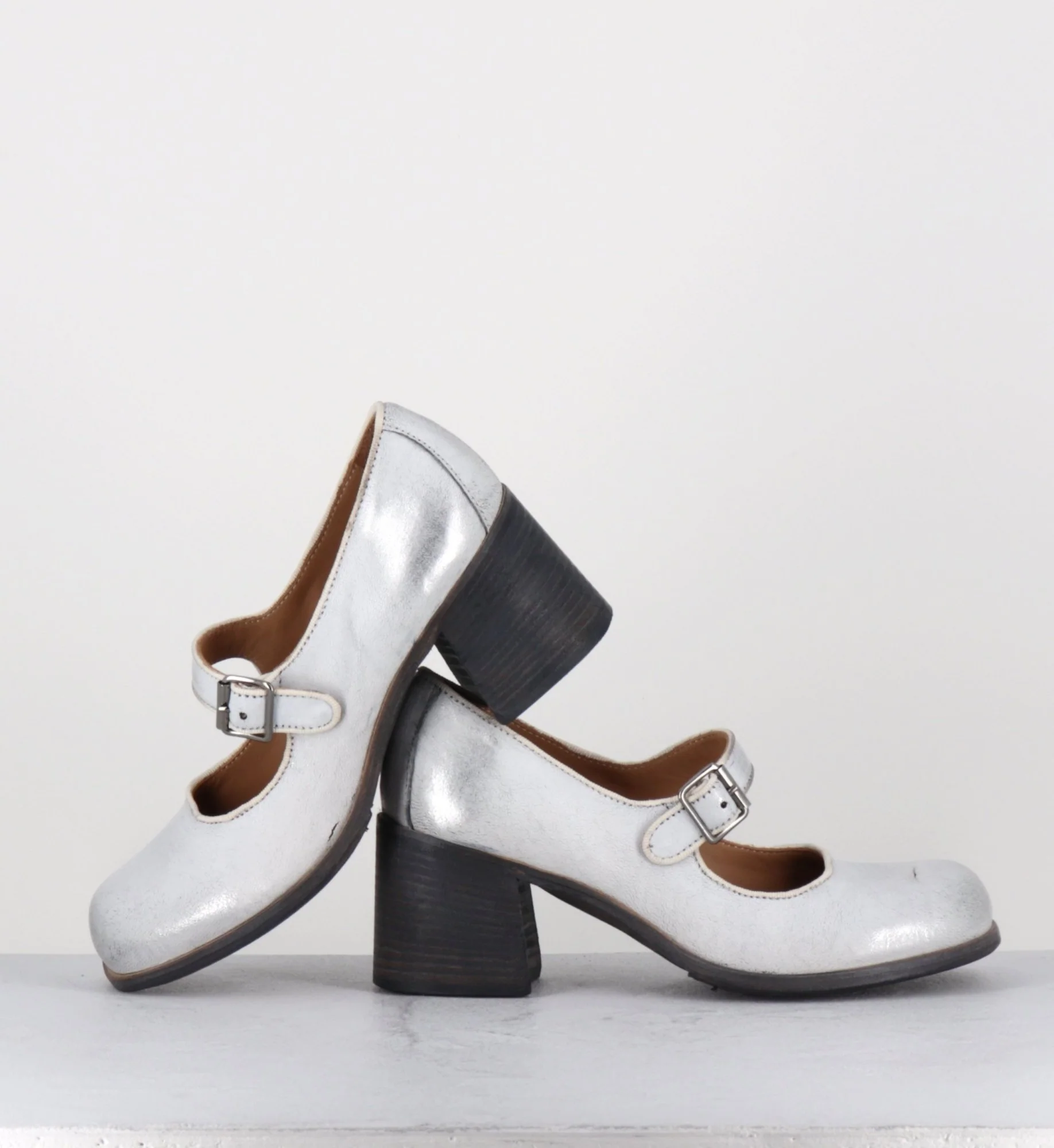 Chaussures babies en cuir souple métallisé argent, ligne pure esprit avant-garde, bout carré-arrondi, montées sur une semelle cousue et lavée à la main pour un effet usé et un talon bloc confortable
