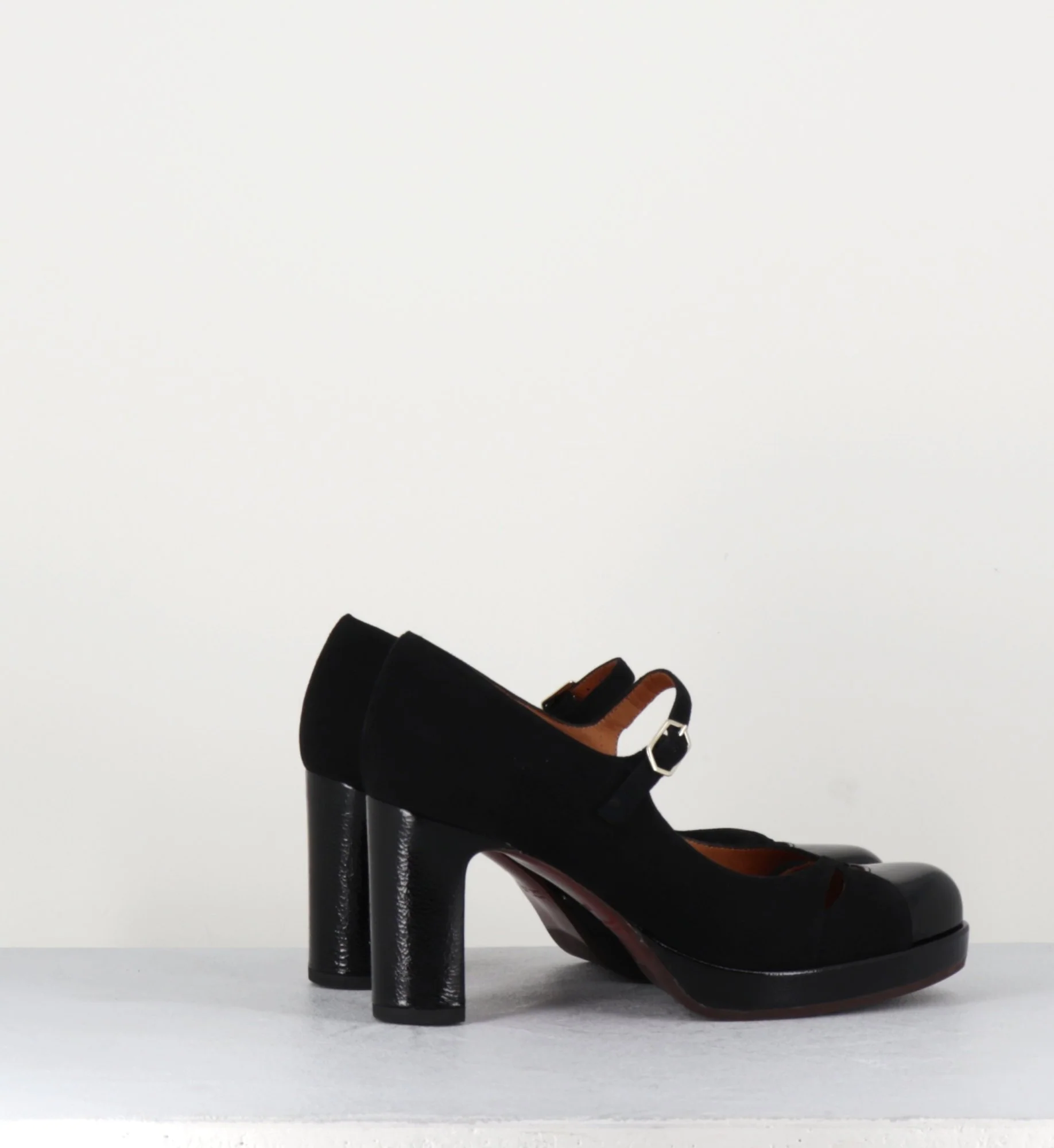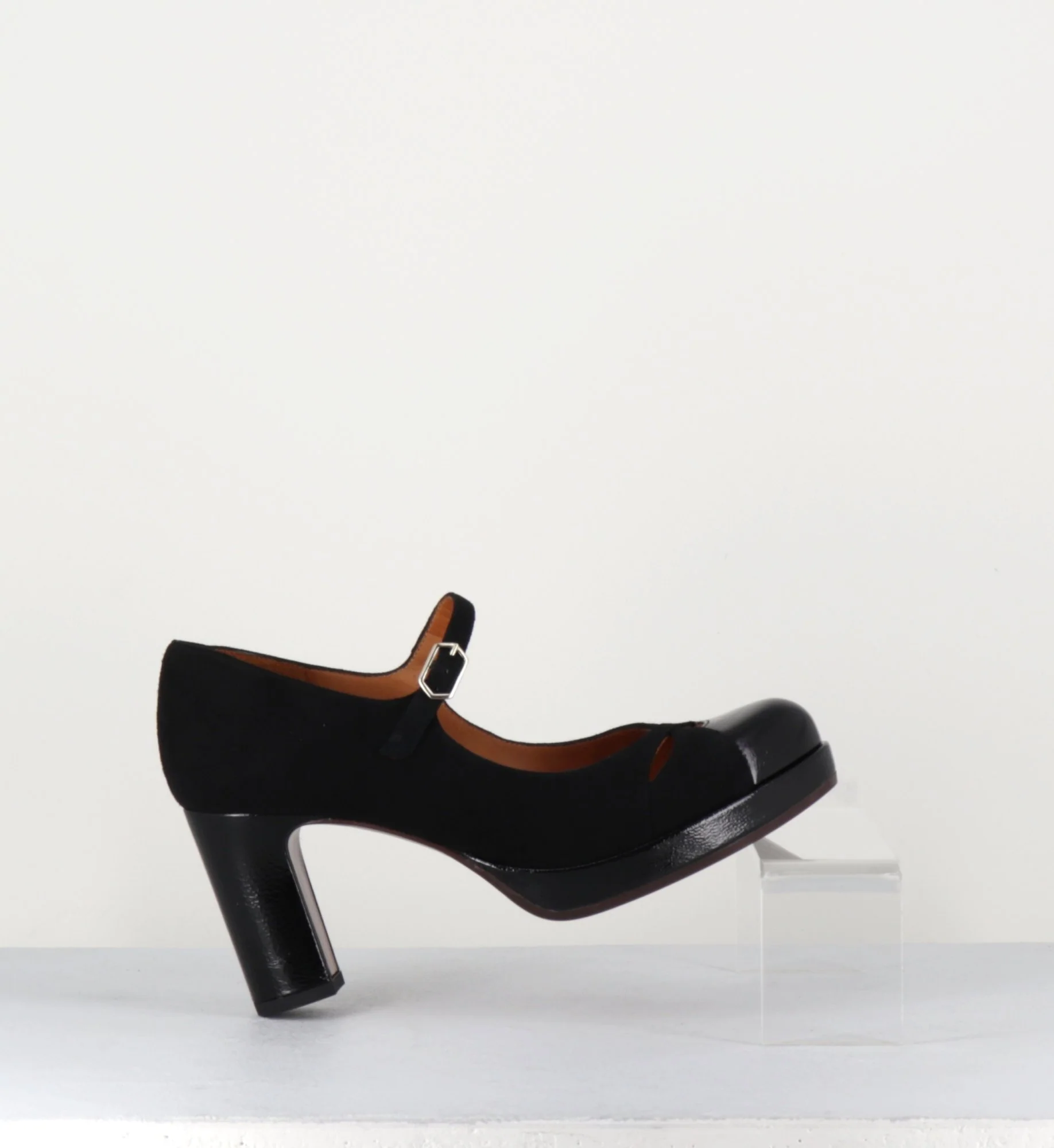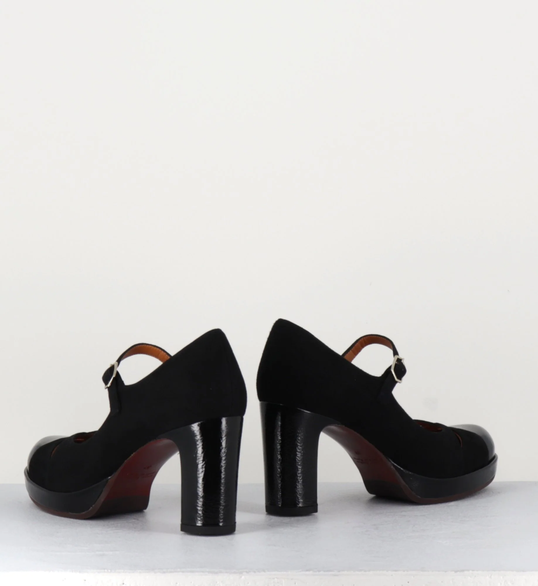 Escarpins babies bi-matière en daim&cuir vernis naplak souple noir, élégant décolleté, bride réglable, montées sur une plateforme et un talon recouvert confortable. Fabrication Artisanale Espagnole – Ateliers Chie Mihara Chausse légèrement grand