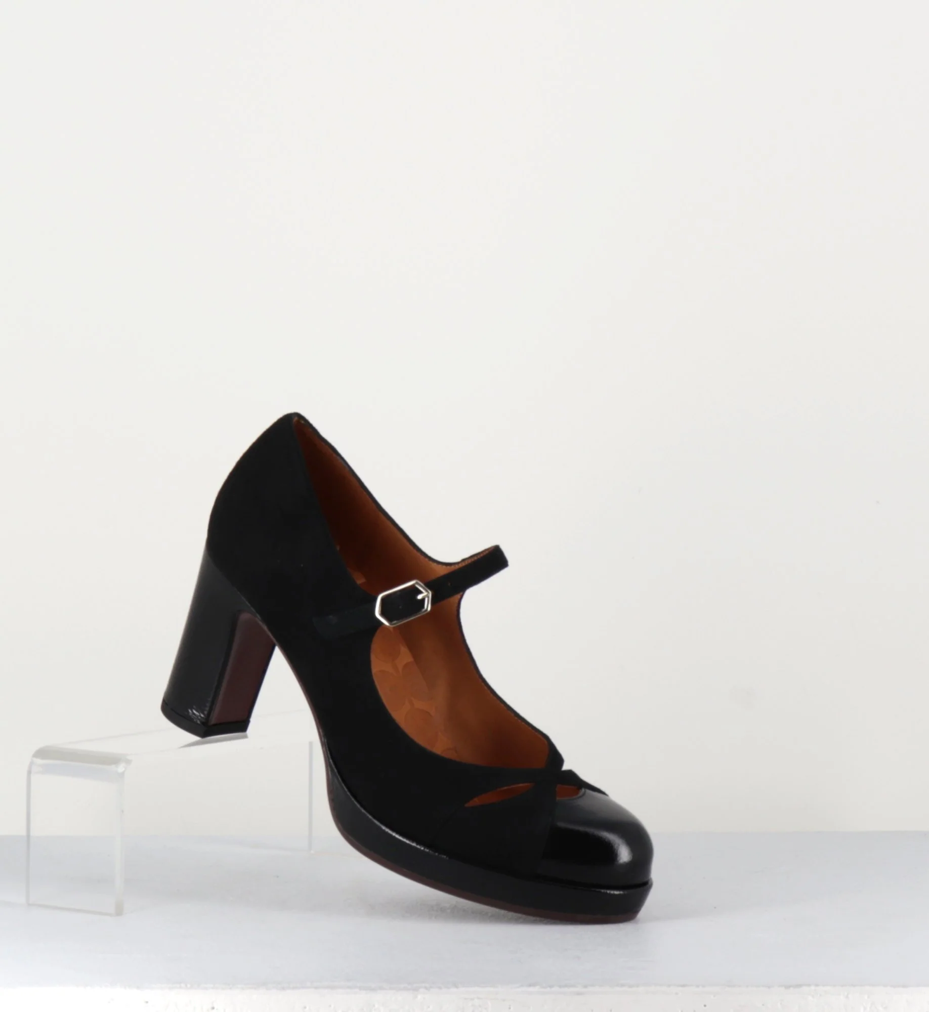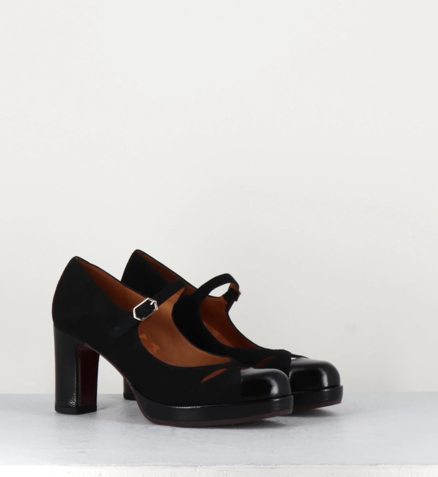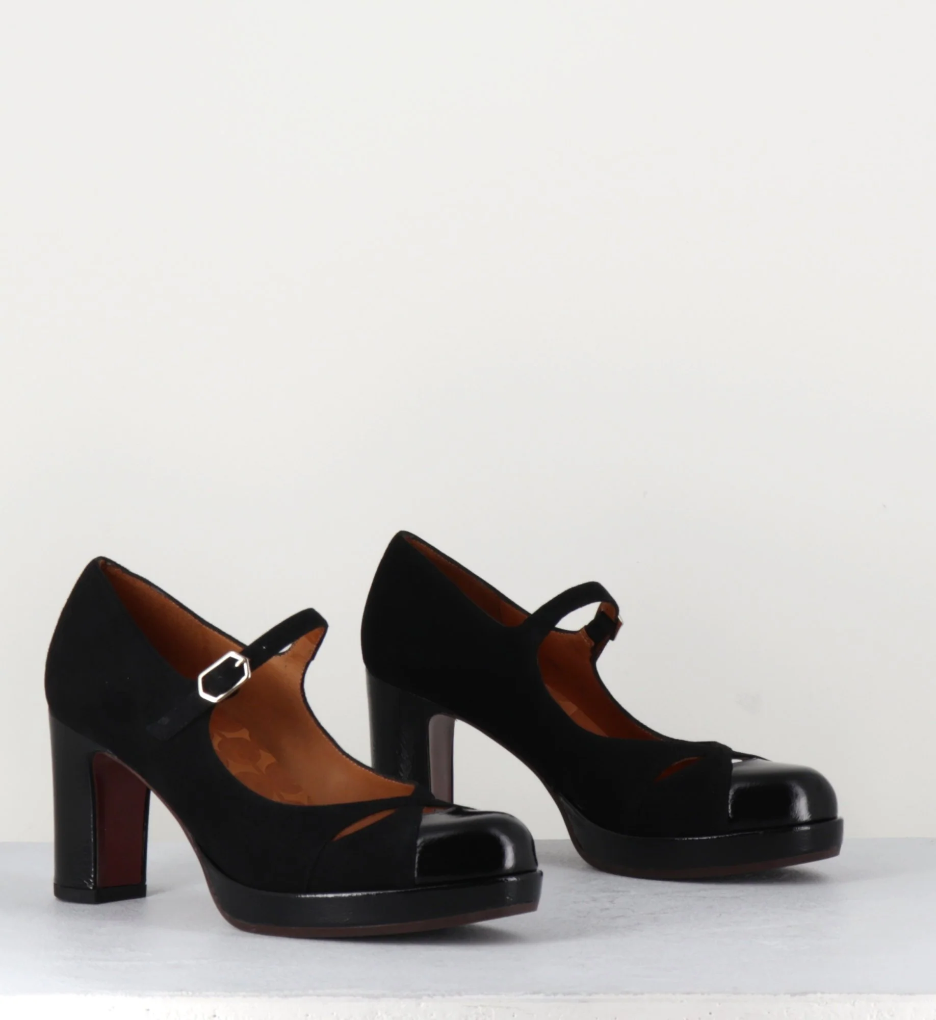 Escarpins babies bi-matière en daim&cuir vernis naplak souple noir, élégant décolleté, bride réglable, montées sur une plateforme et un talon recouvert confortable. Fabrication Artisanale Espagnole – Ateliers Chie Mihara Chausse légèrement grand