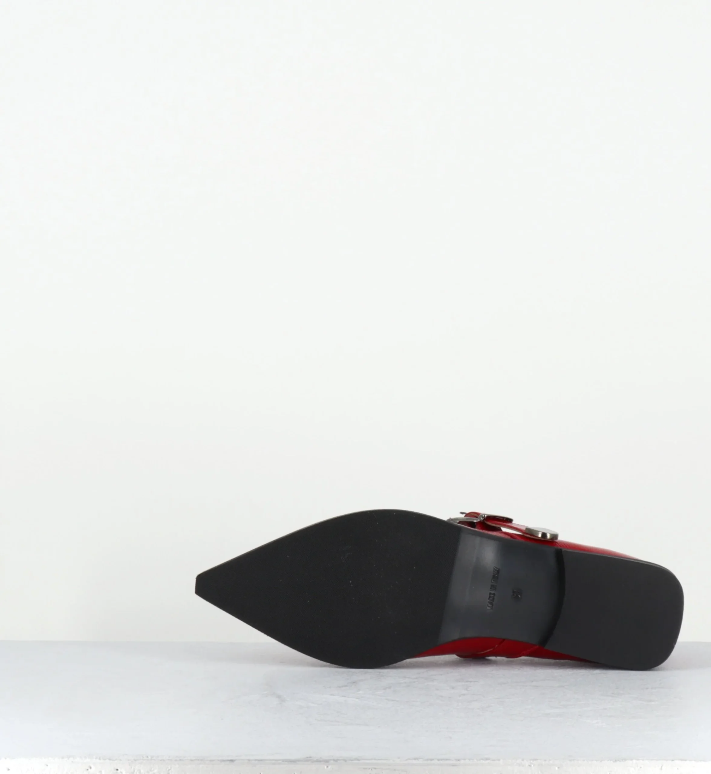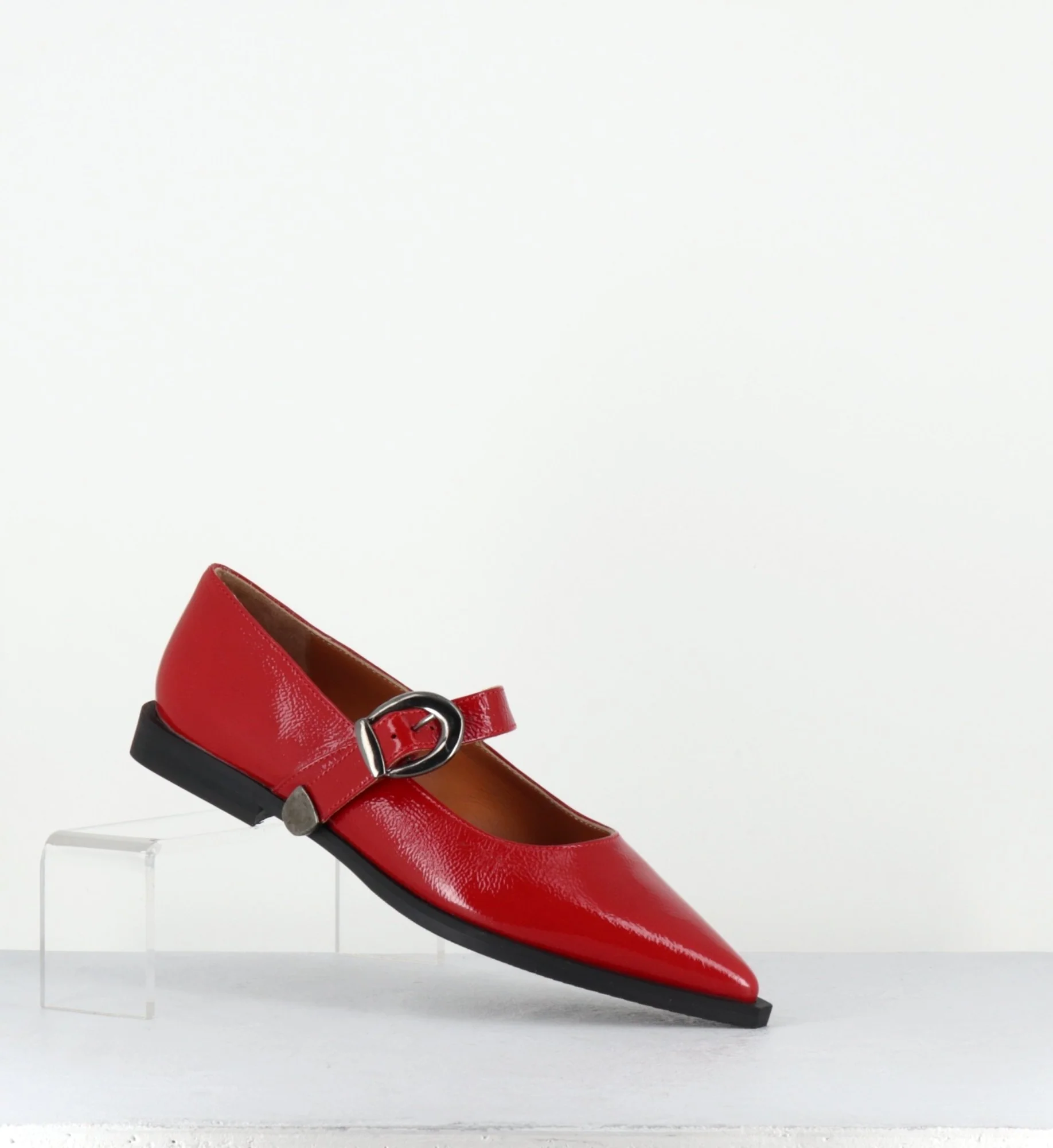 Babies bout pointu en cuir vernis souple rouge, boucle stylisée réglable, montées sure une semelle en cuir à débords Fabrication Artisanale Italienne – Ateliers Thea Mika