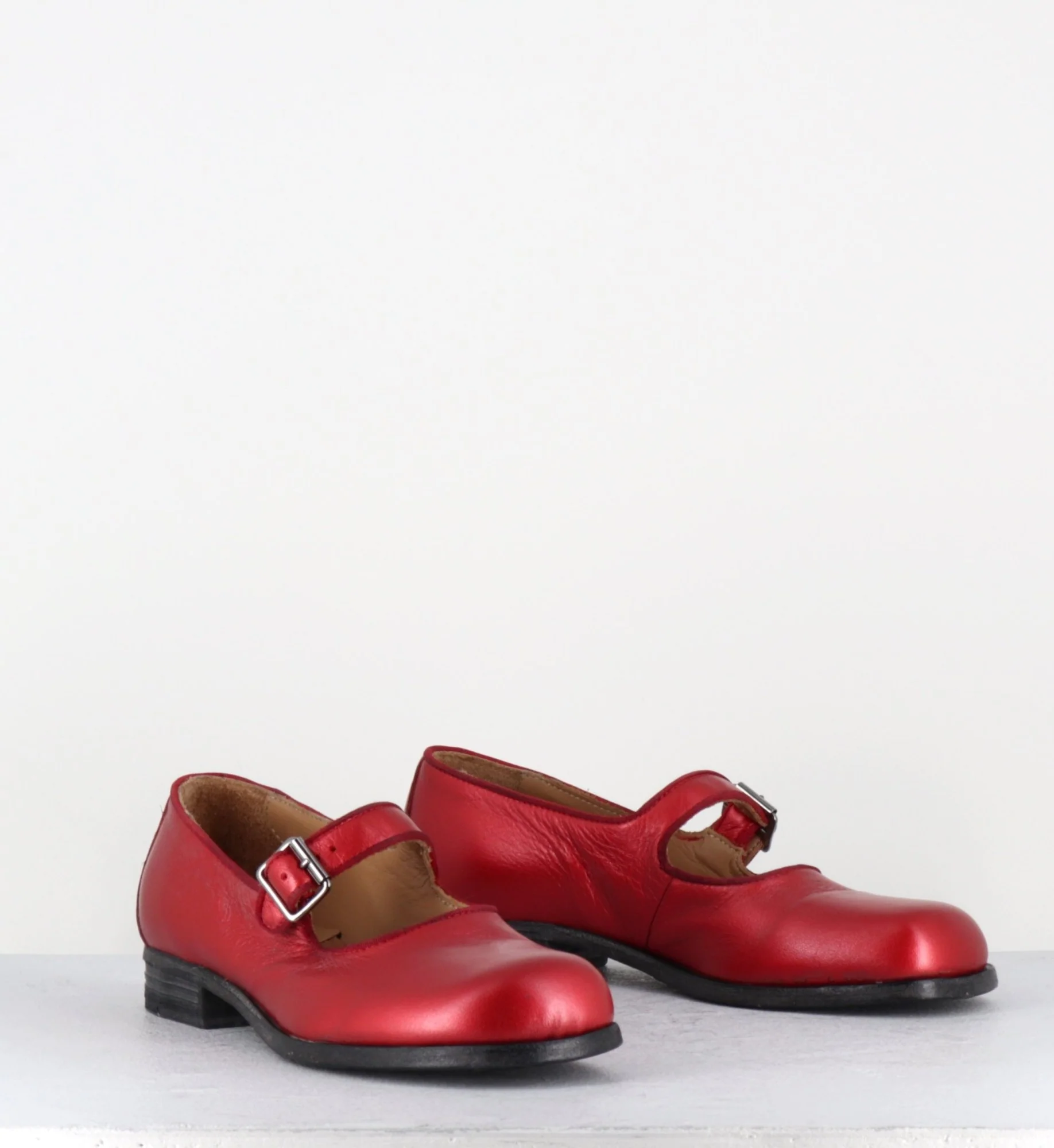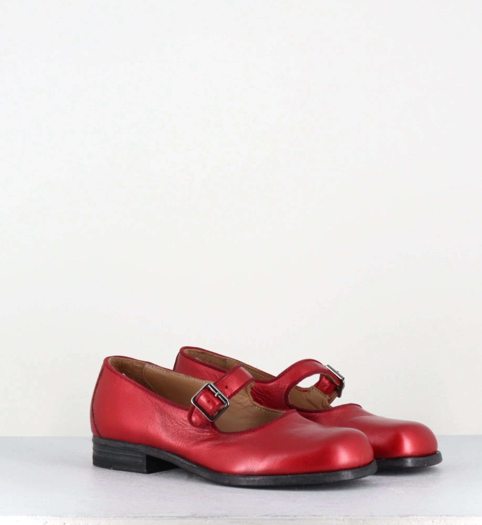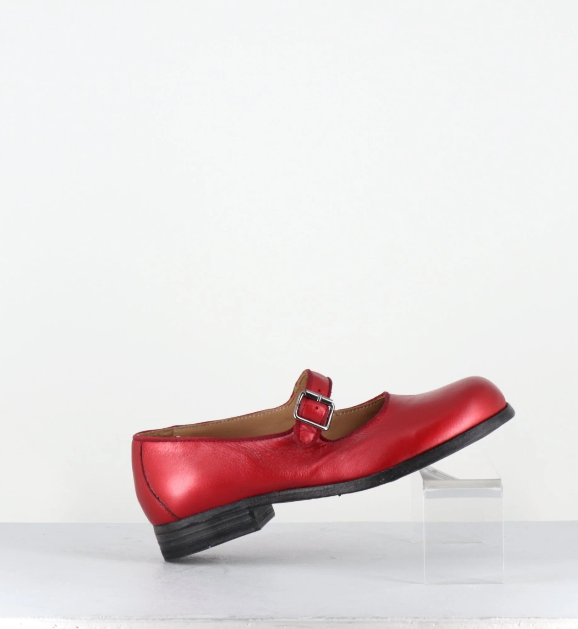 Chaussures babies en cuir souple métallisé rouge, bride réglable, ligne pure esprit avant-garde, bout arrondi, montées sur une semelle cousue et lavée à la main pour un effet usé Fabrication Artisanale Italienne – Ateliers Moma Chausse légèrement grand