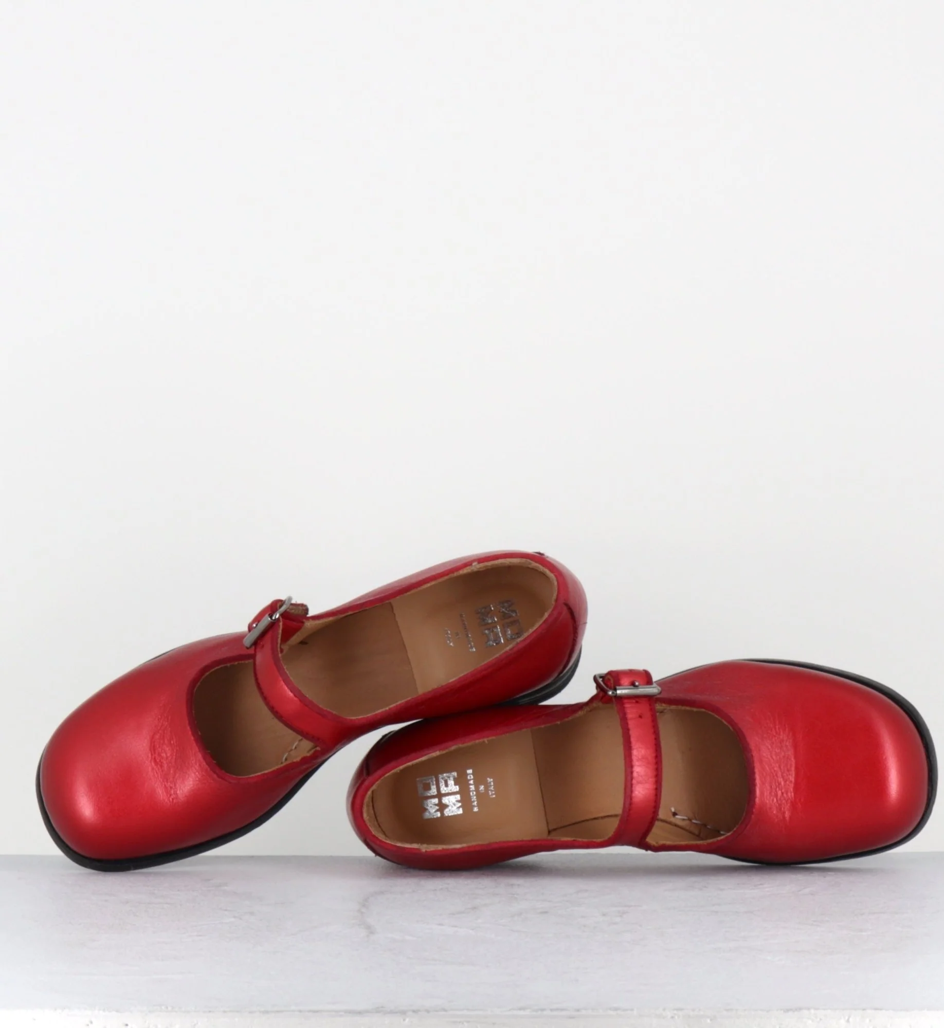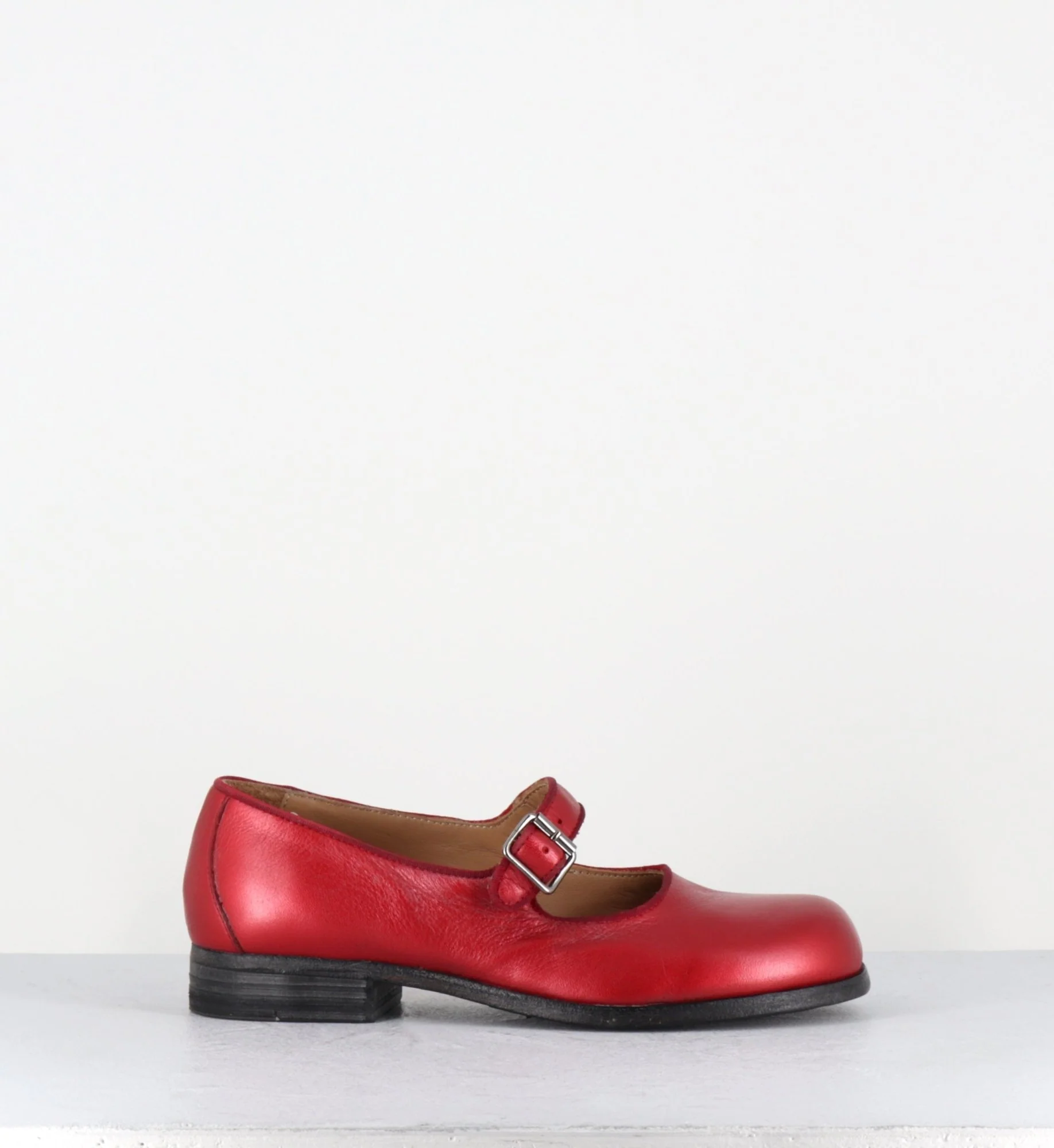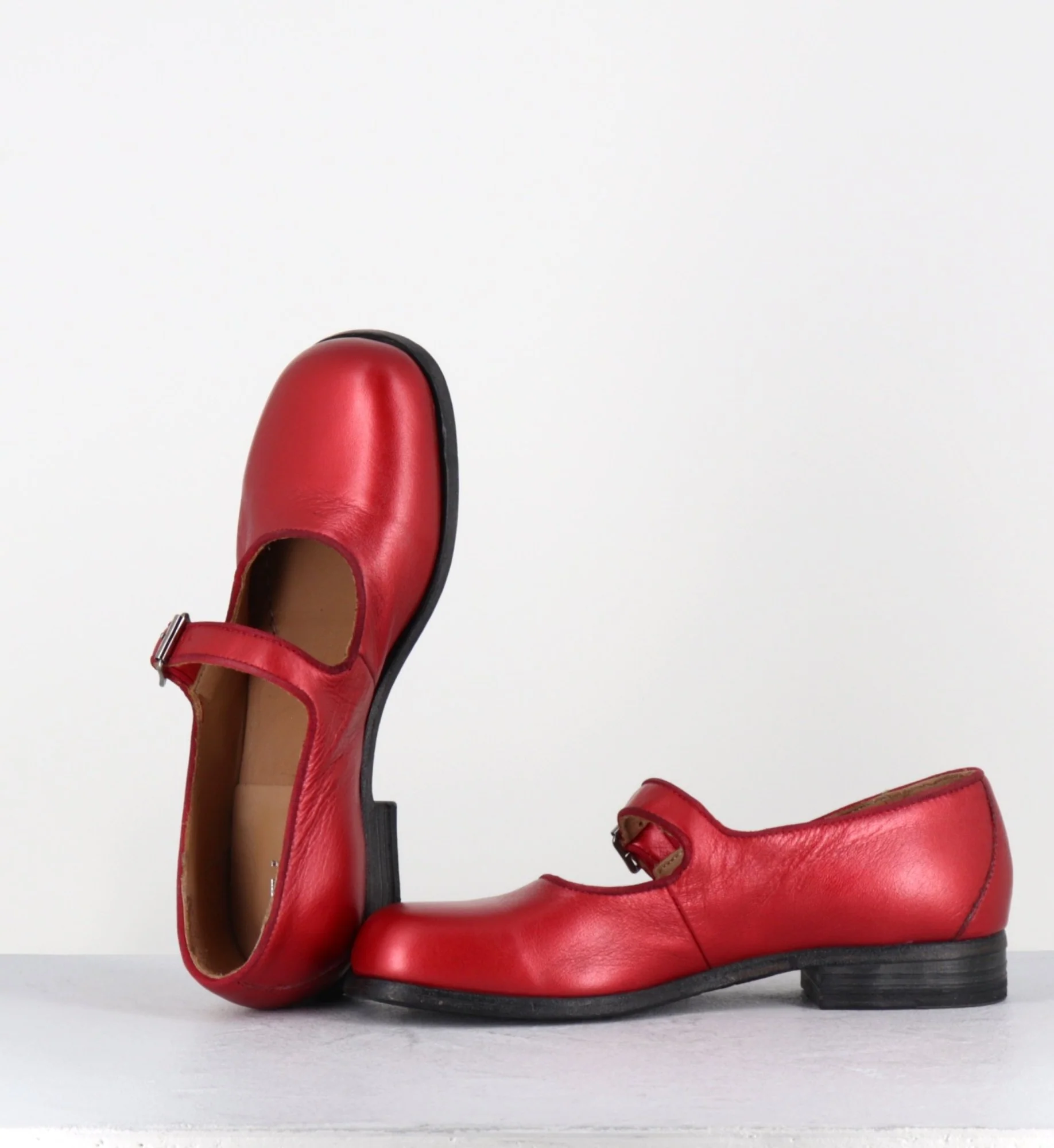 Chaussures babies en cuir souple métallisé rouge, bride réglable, ligne pure esprit avant-garde, bout arrondi, montées sur une semelle cousue et lavée à la main pour un effet usé Fabrication Artisanale Italienne – Ateliers Moma Chausse légèrement grand
