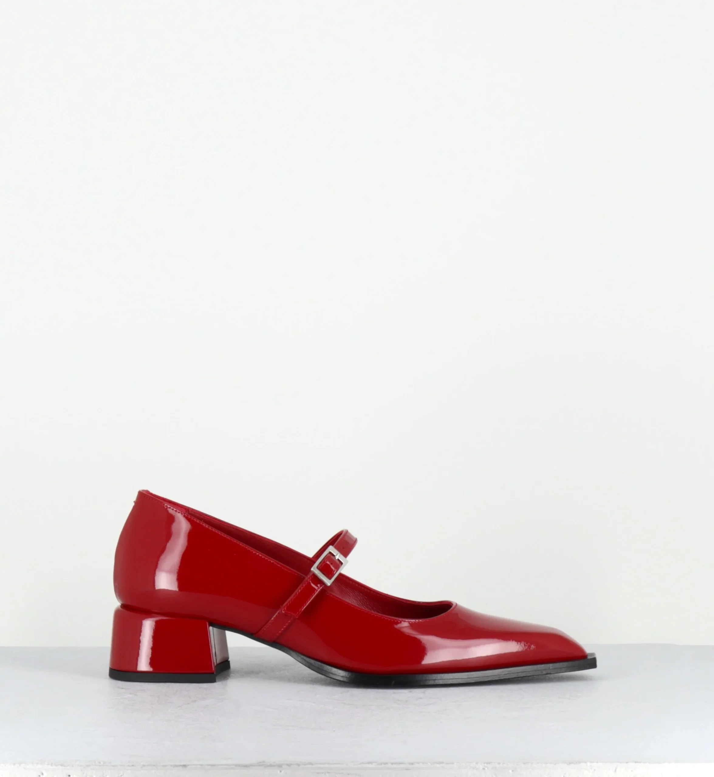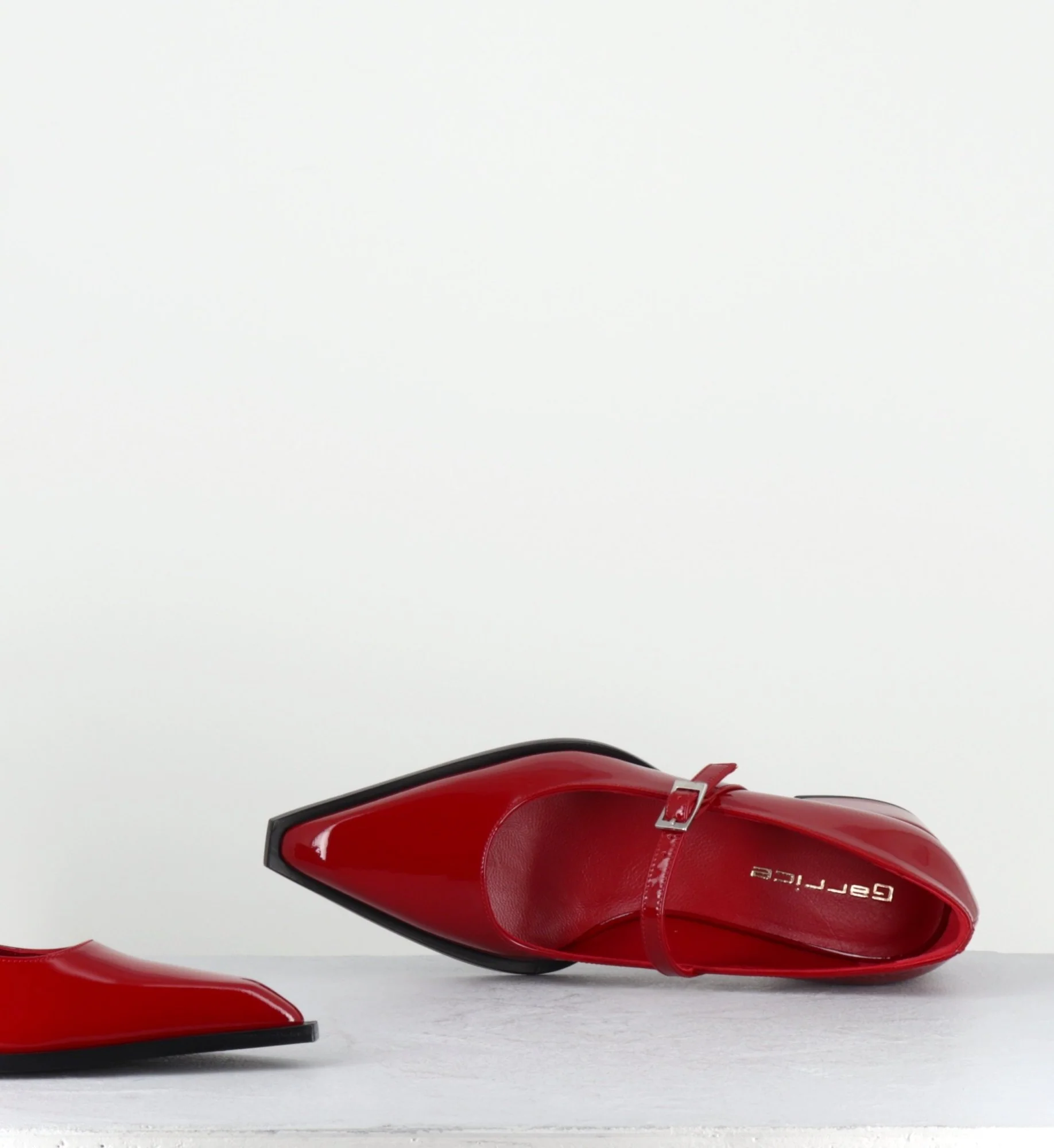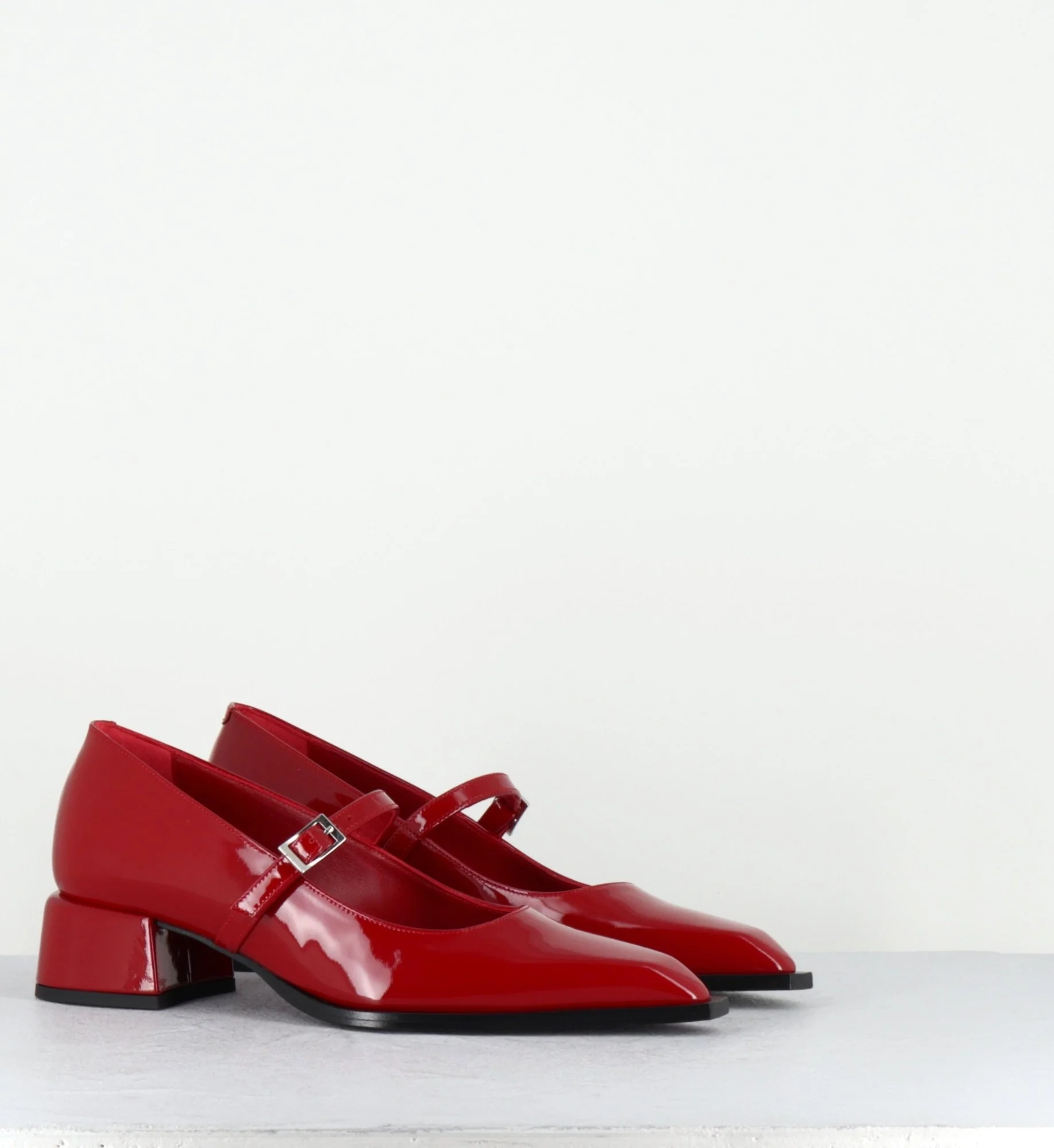 Chaussures babies à bride en cuir vernis rouge, bout pointu & petit talon bloc stylisé Fabrication Artisanale Italienne – Ateliers GarriceLab Chausse légèrement grand