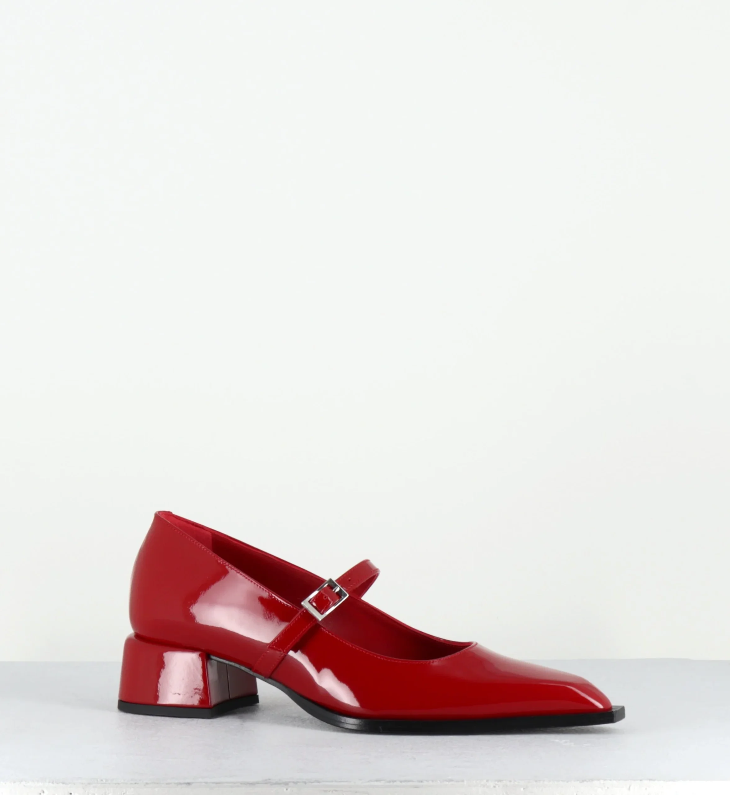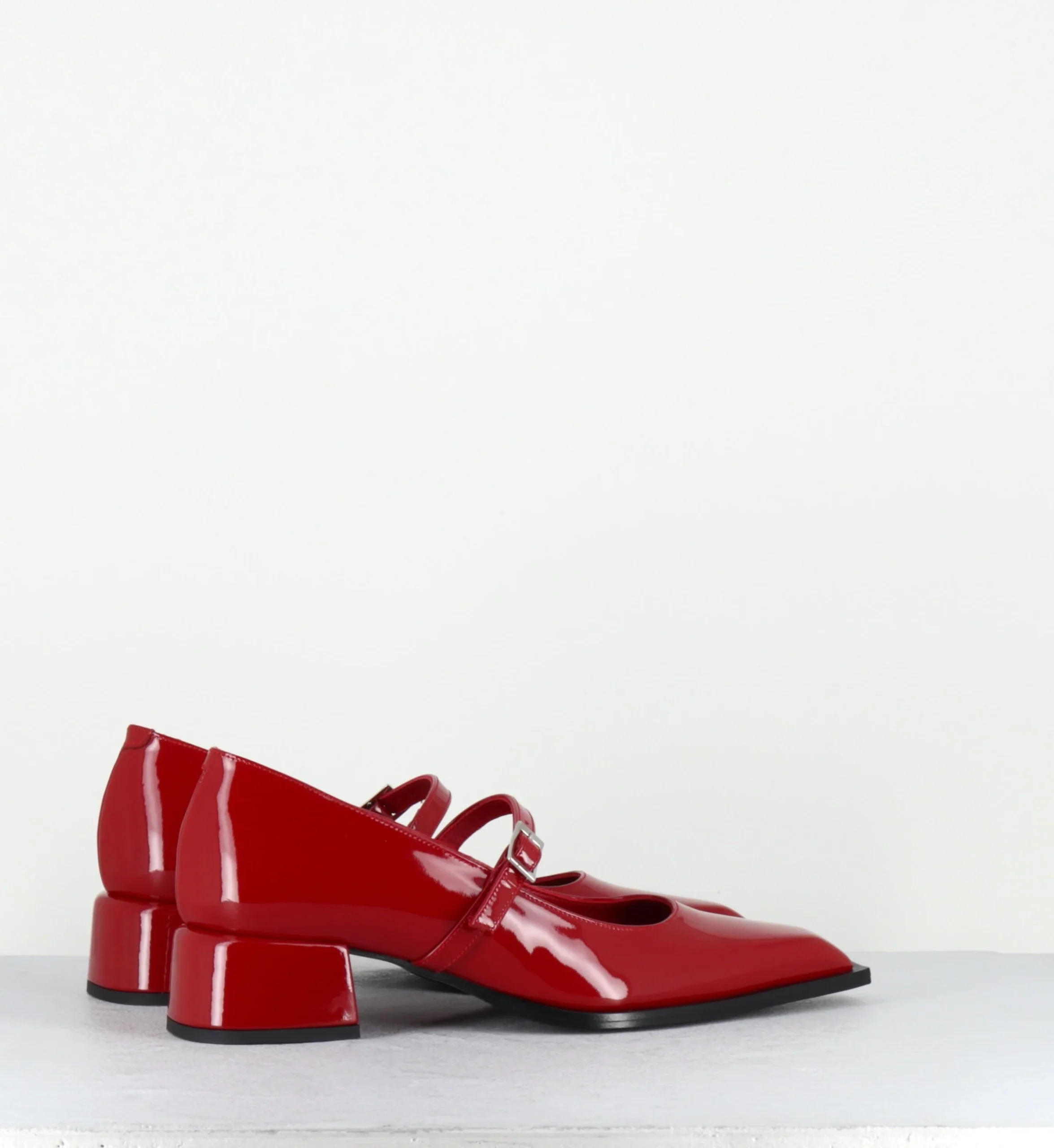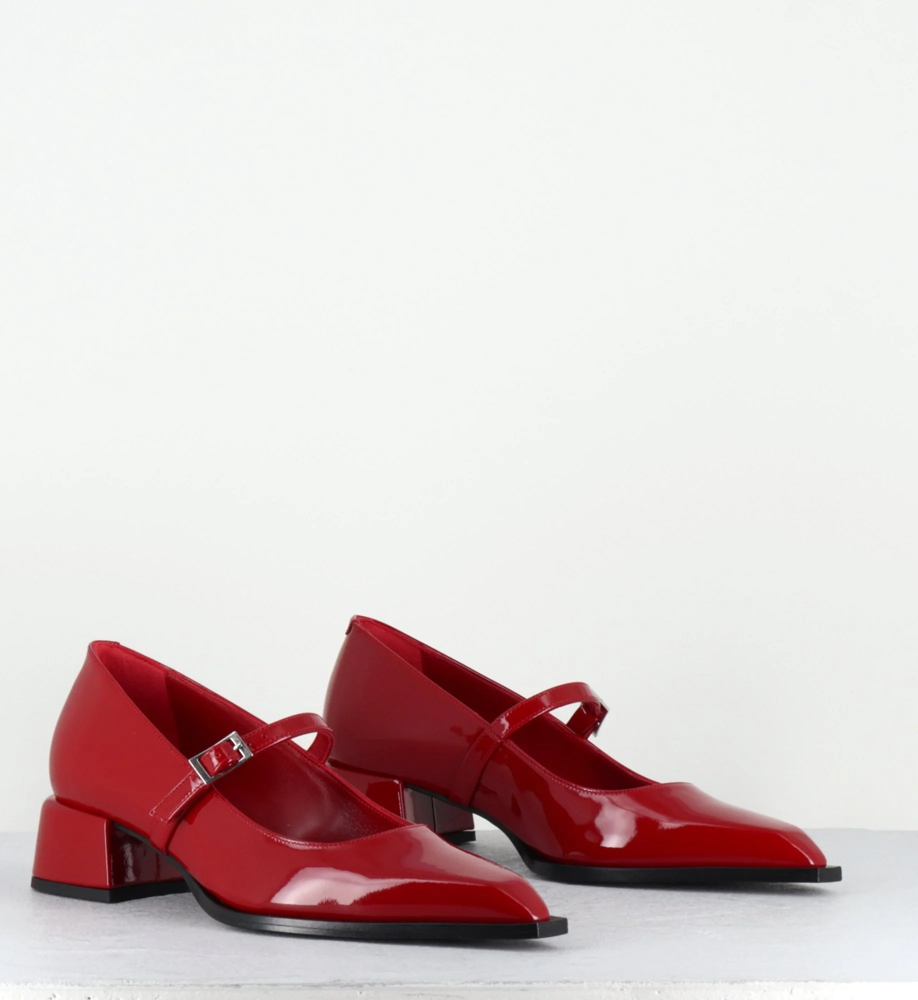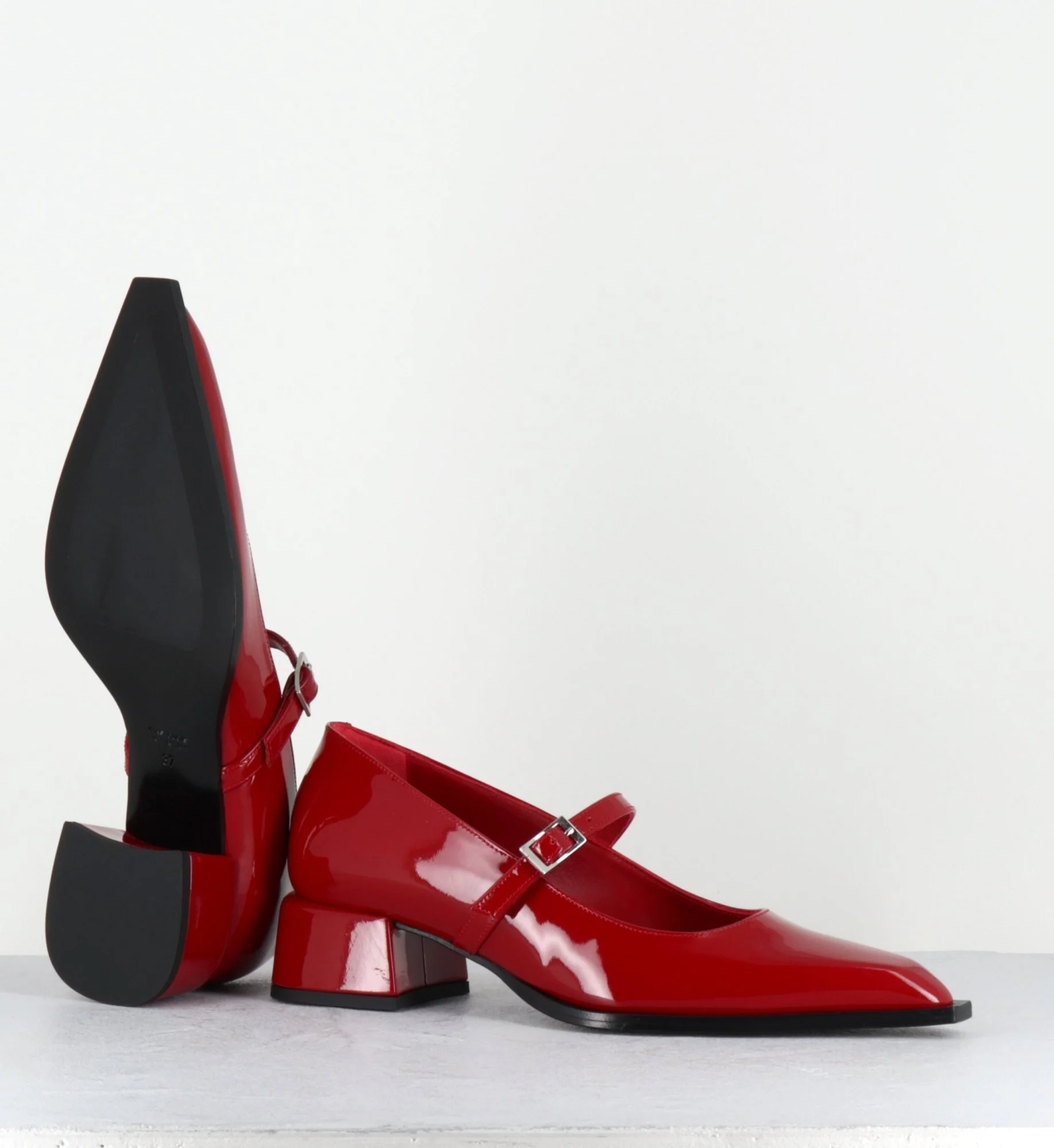 Chaussures babies à bride en cuir vernis rouge, bout pointu & petit talon bloc stylisé Fabrication Artisanale Italienne – Ateliers GarriceLab Chausse légèrement grand