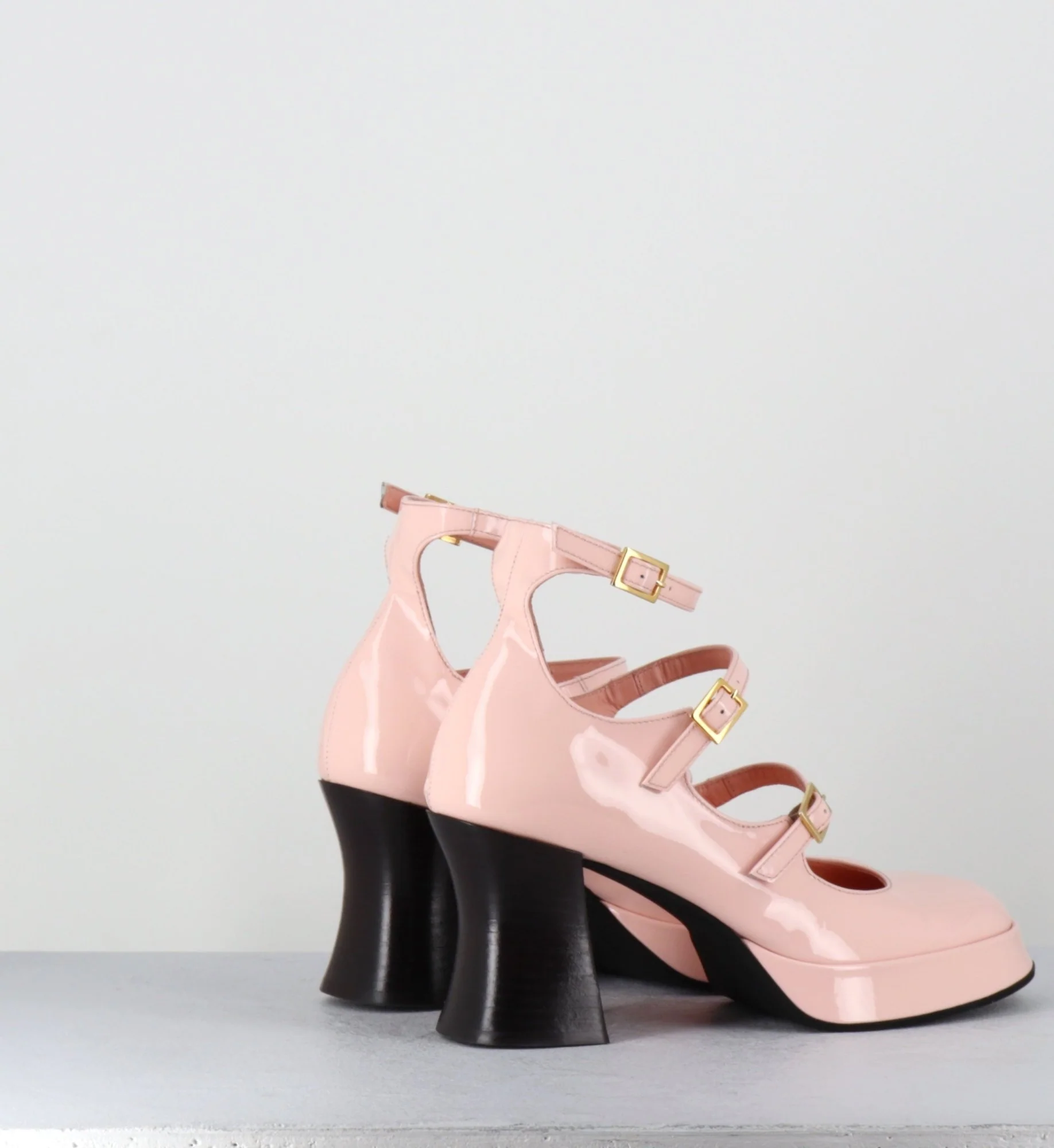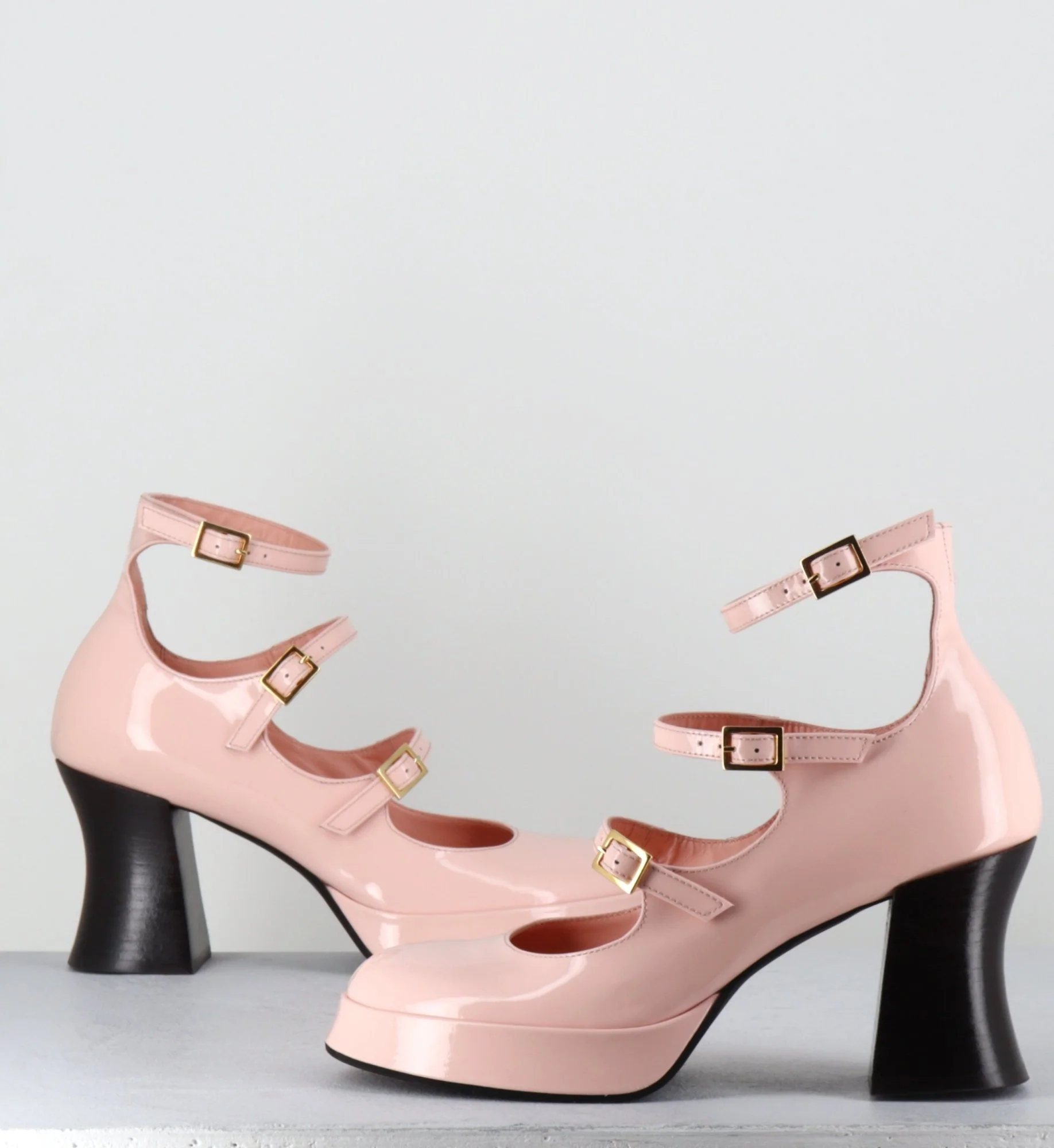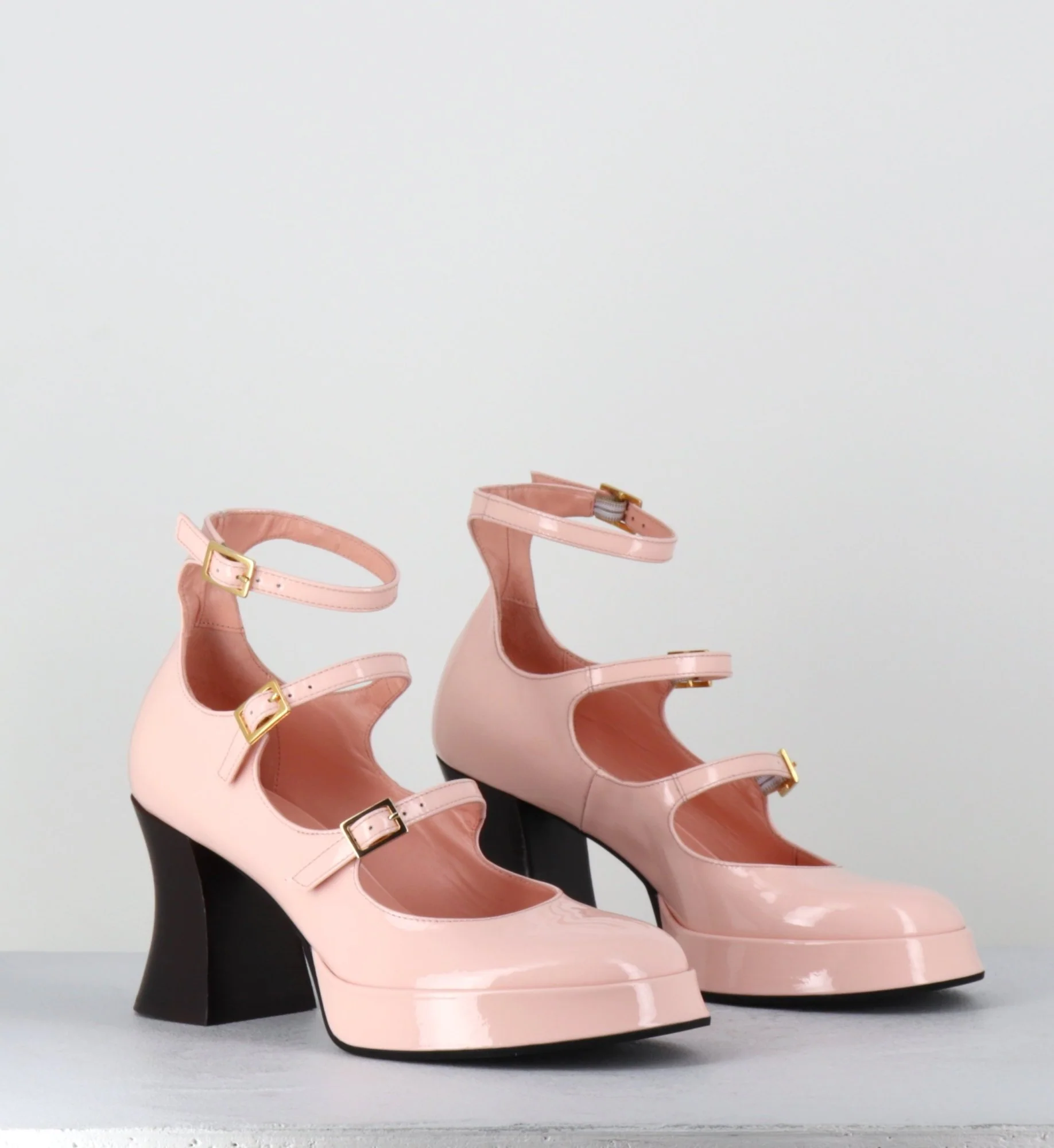 Chaussures babies multi-brides en cuir vernis rose poudré, 3 boucles dorées réglables, bout rond, montées sur une fine plateforme et un talon esprit bobine rétro Fabrication Artisanale Italienne – Ateliers GarriceLab