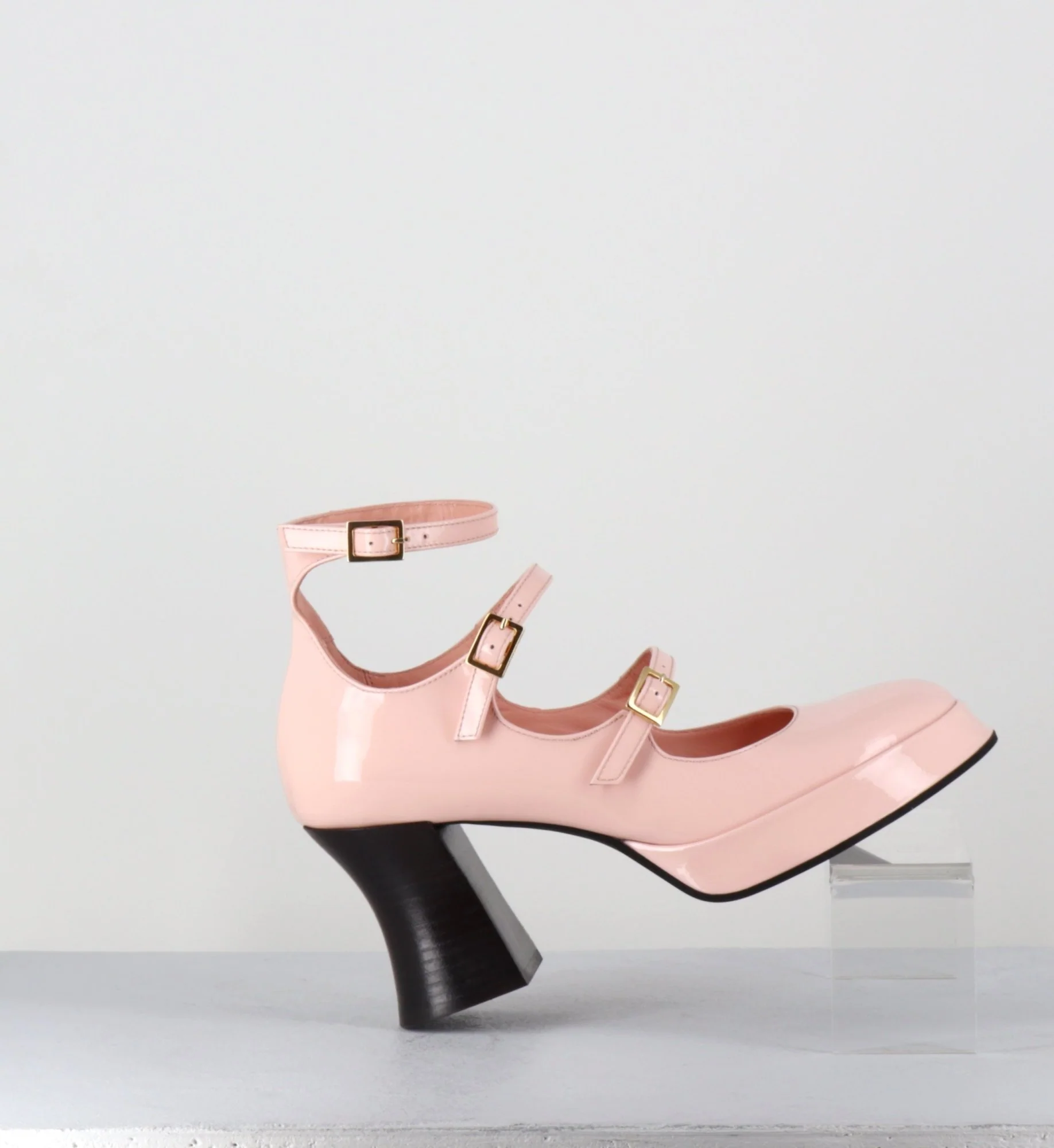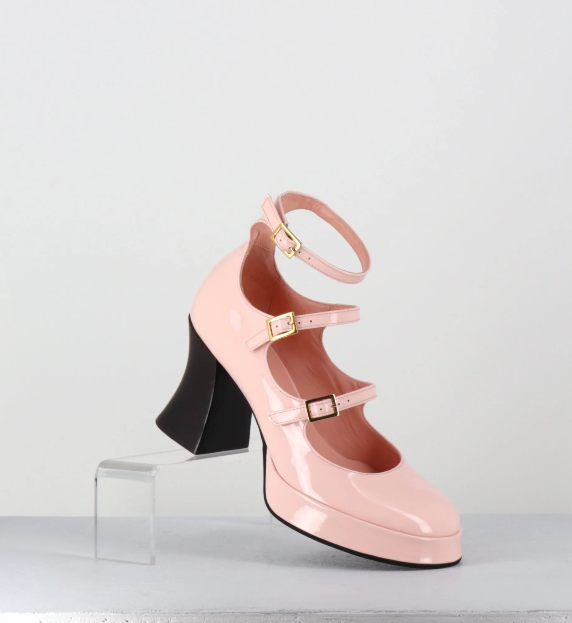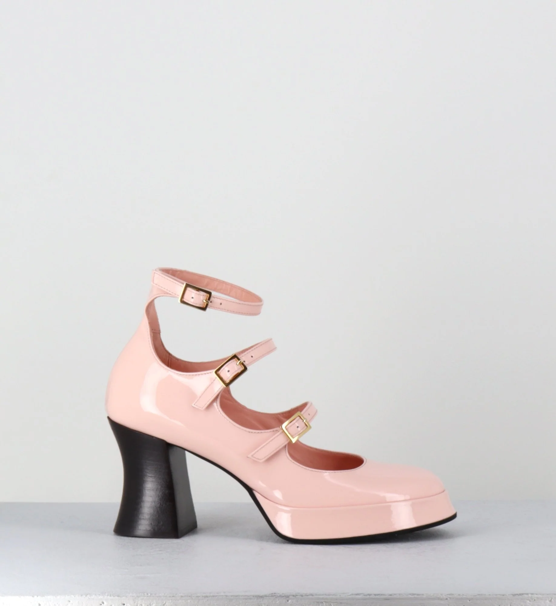Chaussures babies multi-brides en cuir vernis rose poudré, 3 boucles dorées réglables, bout rond, montées sur une fine plateforme et un talon esprit bobine rétro Fabrication Artisanale Italienne – Ateliers GarriceLab