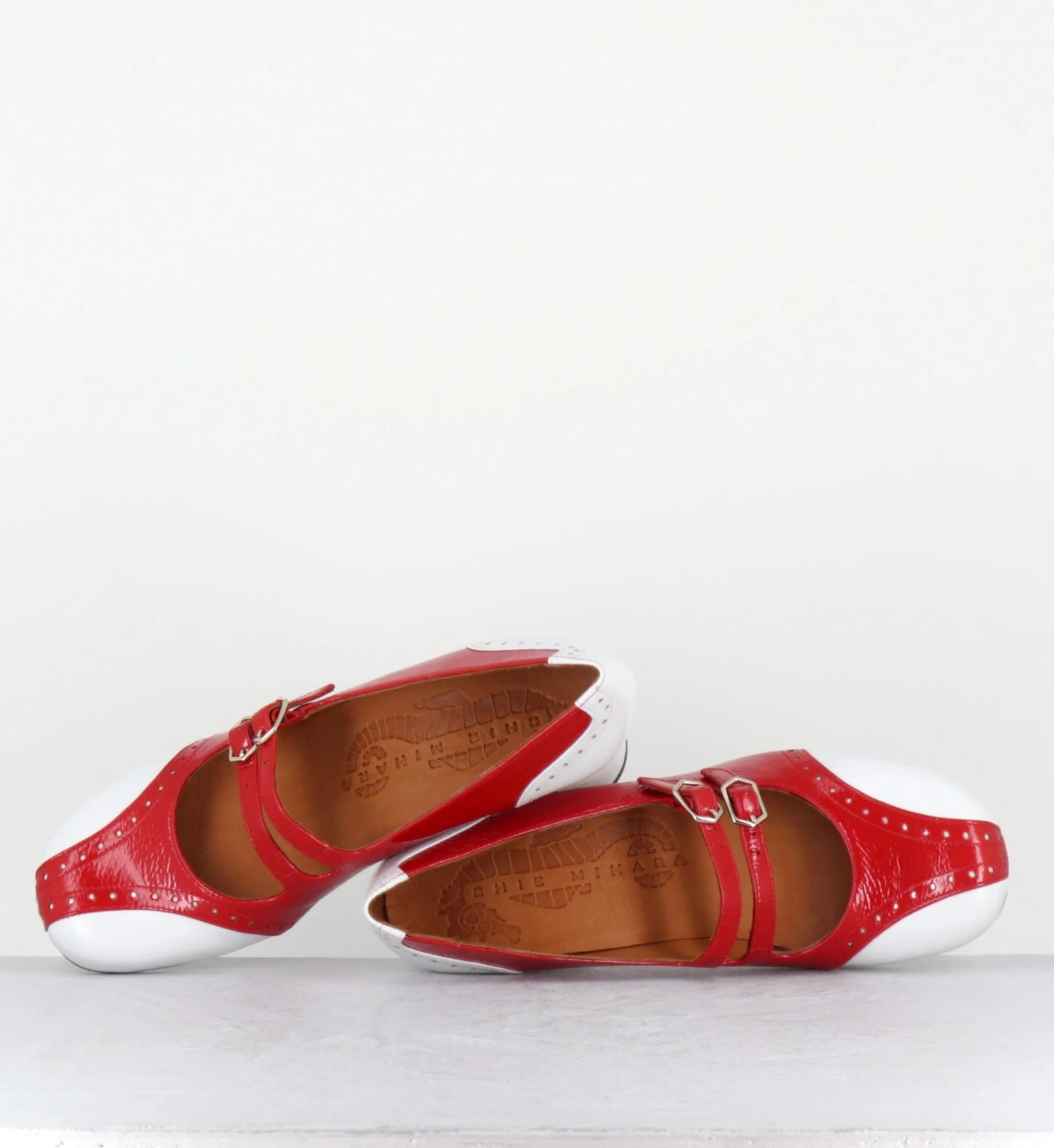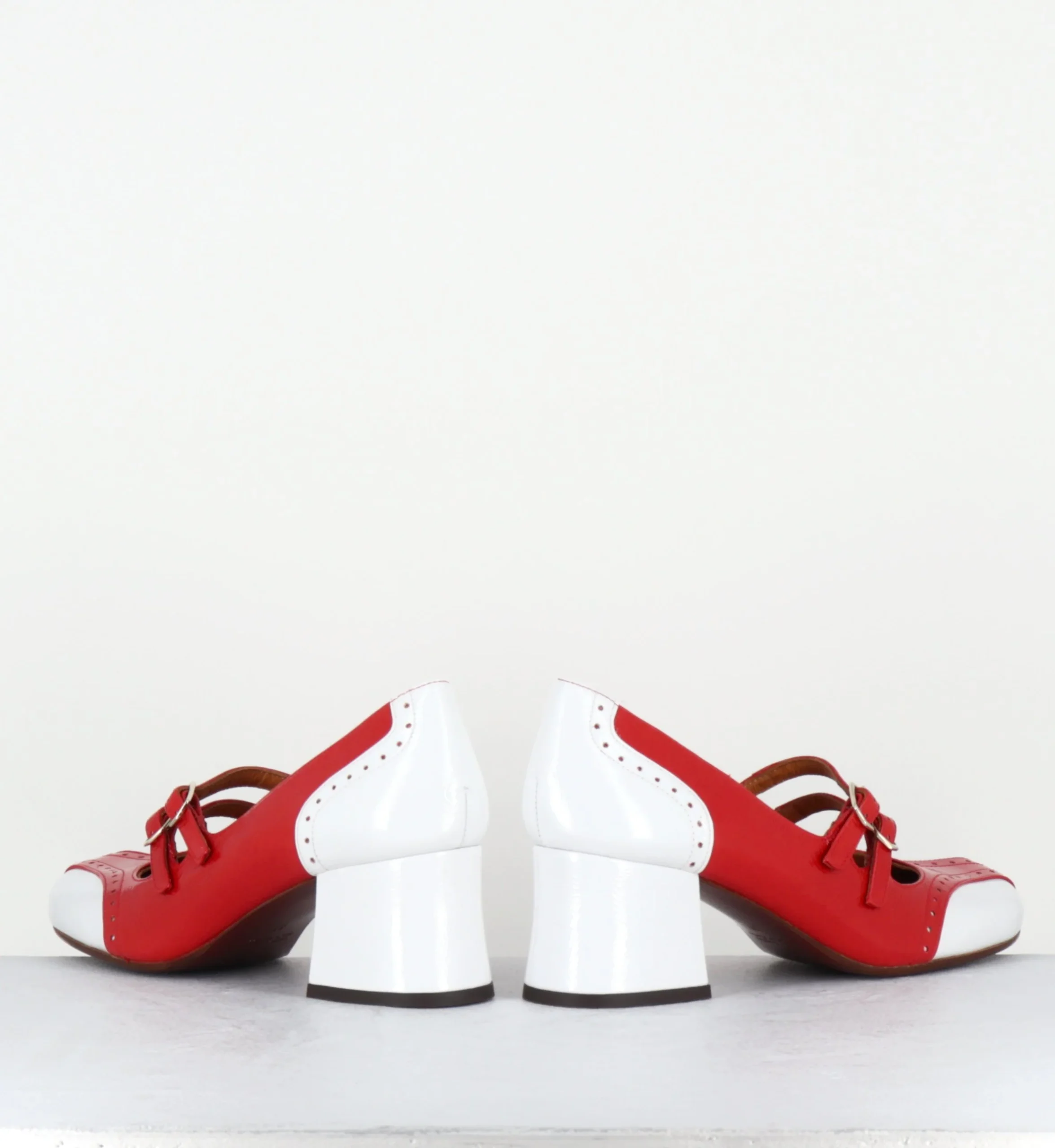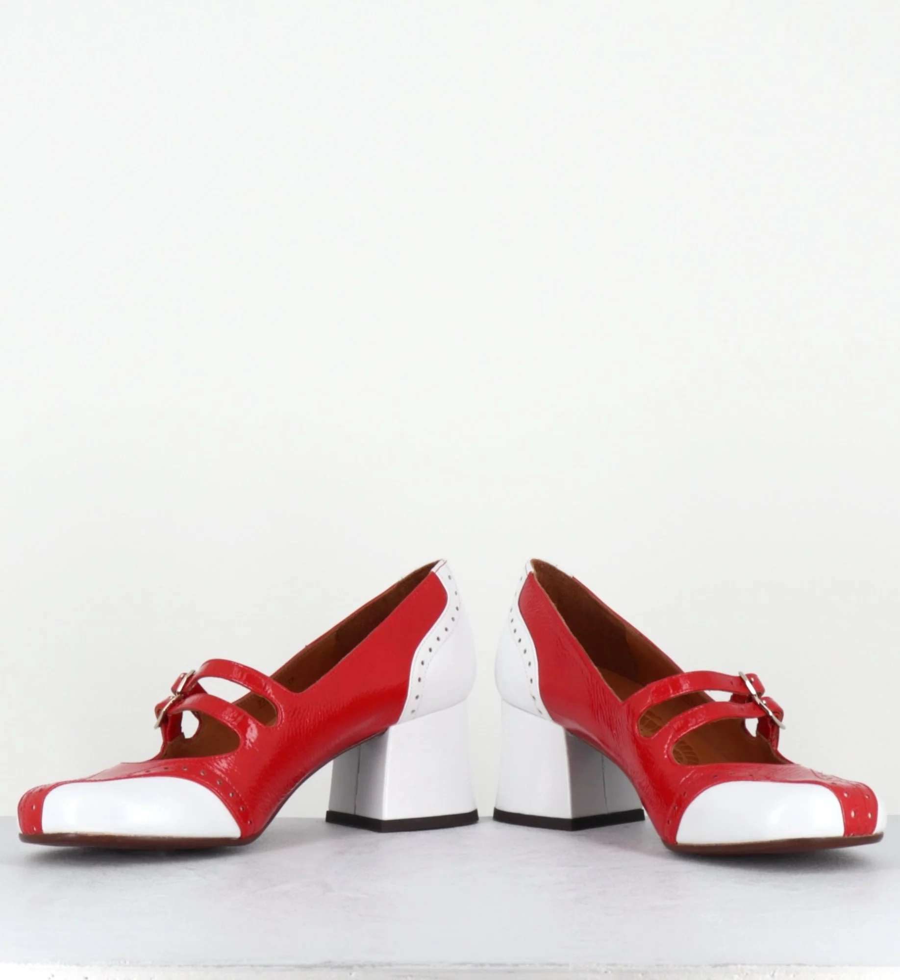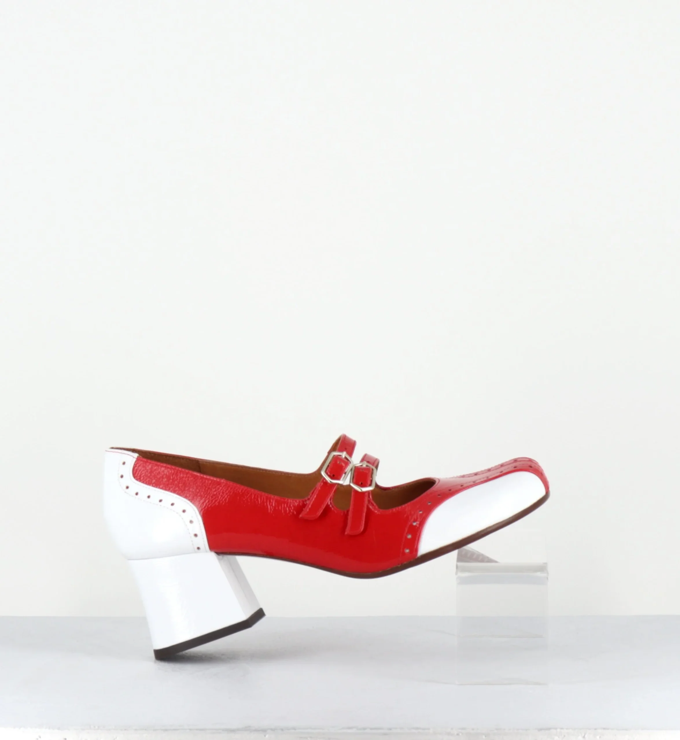 Chaussures – babies double brides réglables en cuir vernis souple effet brillant rouge & blanc, bout arrondie, détails de petits trous esprit vintage, montées sur un petit talon trotteur légèrement évasé Look 60s – 90s <3 Fabrication Artisanale Espagnole – Ateliers Chie Mihara Chausse légèrement grand
