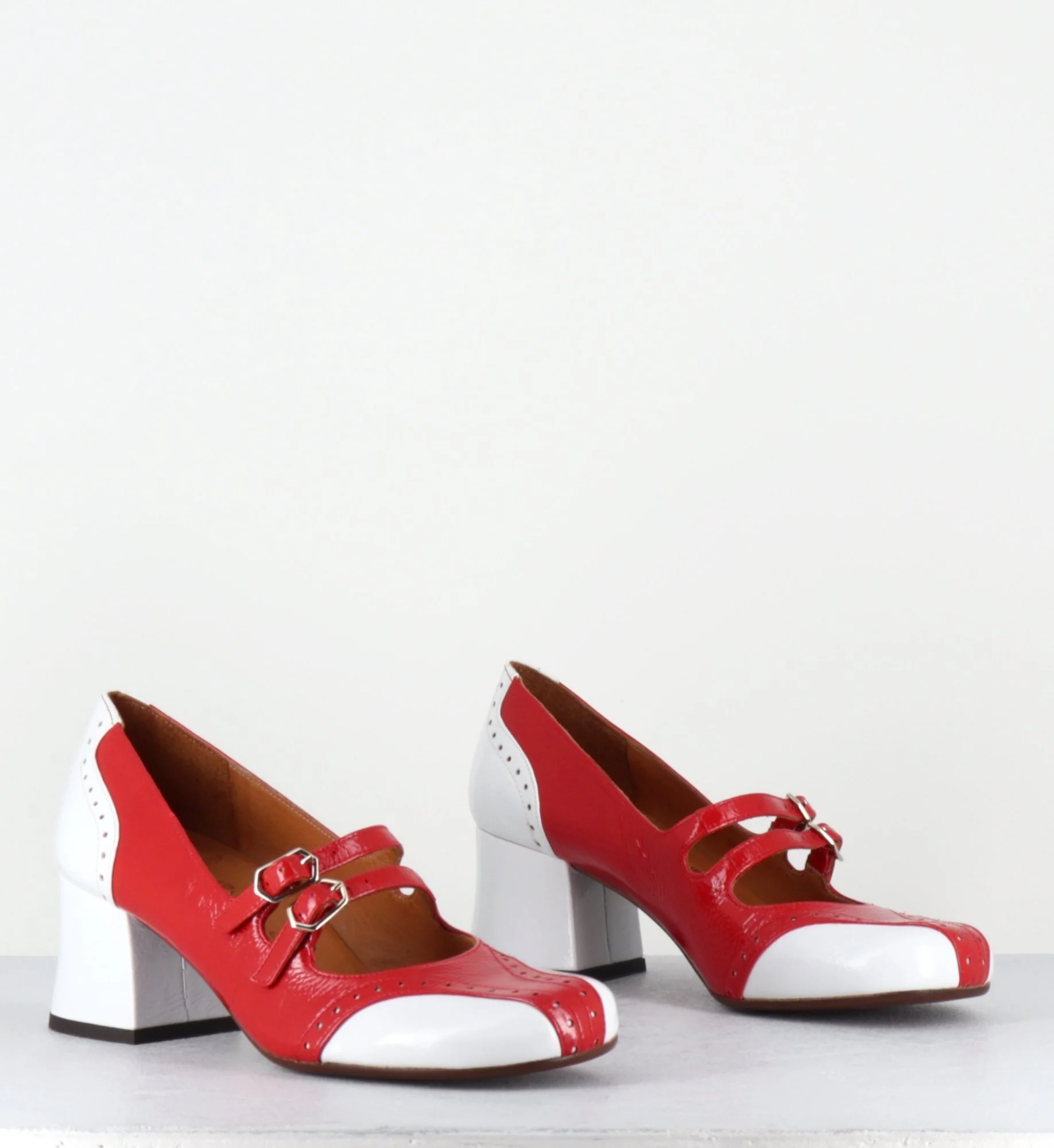 Chaussures – babies double brides réglables en cuir vernis souple effet brillant rouge & blanc, bout arrondie, détails de petits trous esprit vintage, montées sur un petit talon trotteur légèrement évasé