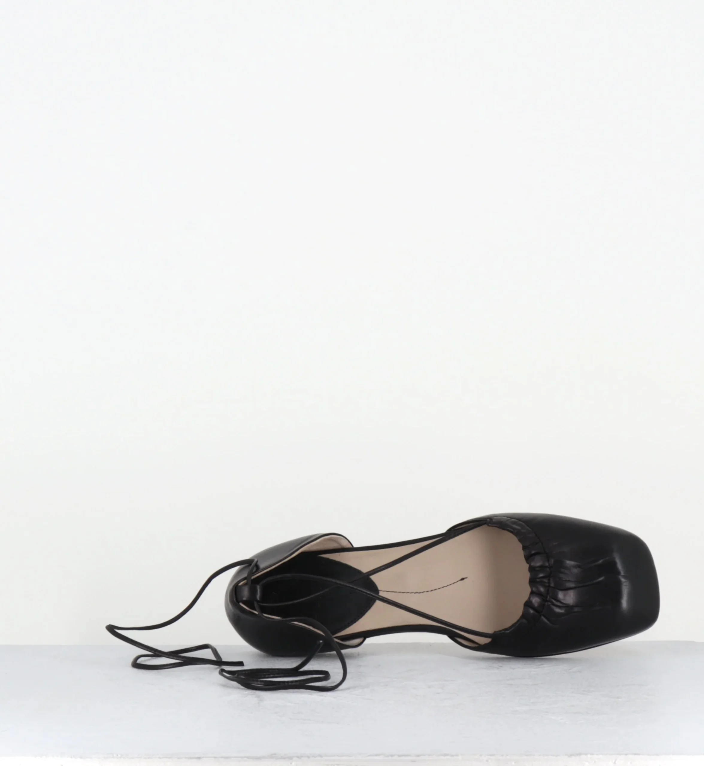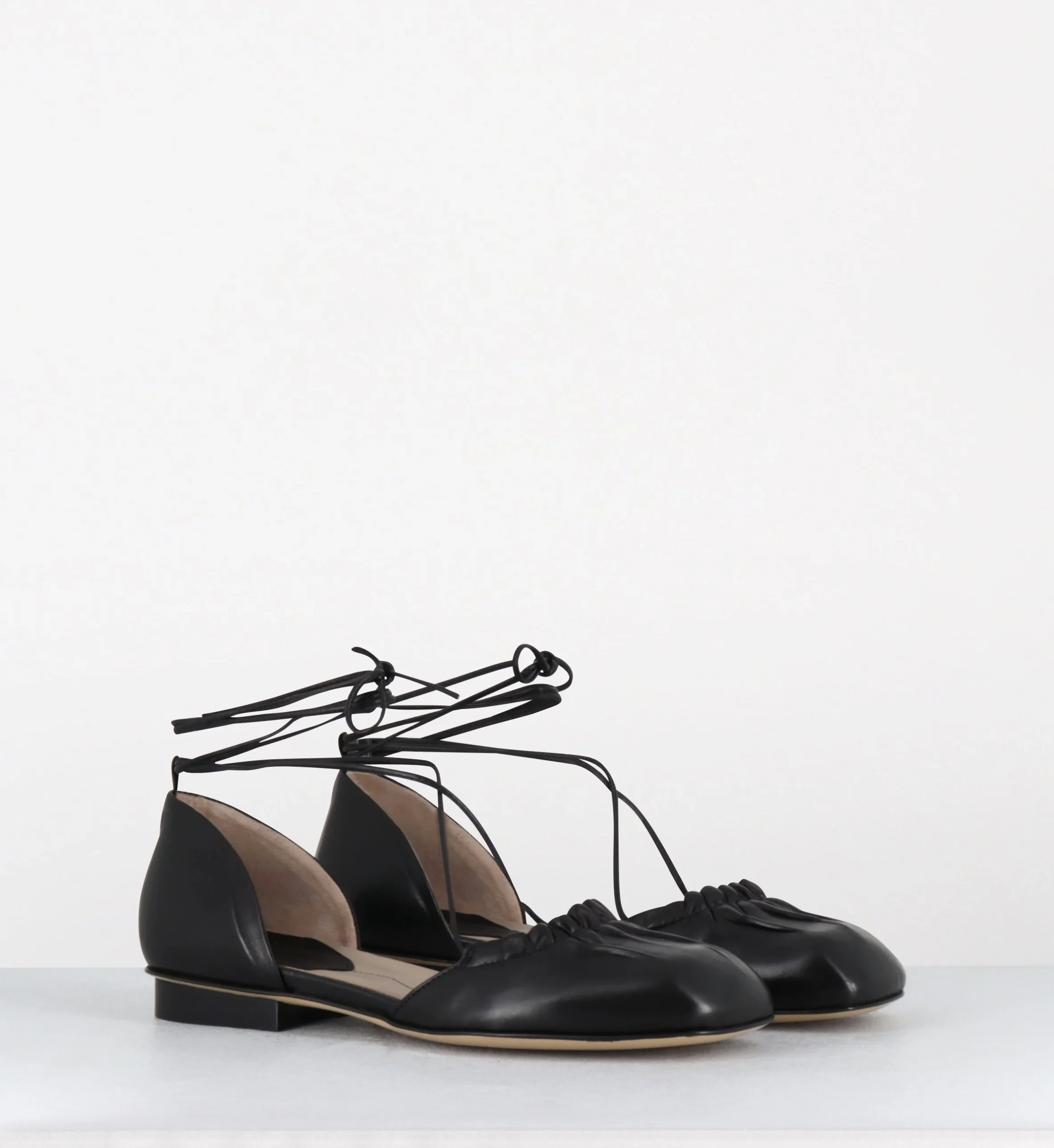 Chaussures ballerines en cuir noir, ligne minimaliste à bout carré arrondi avec fronces à l’avant, longs lacets en cuir croisés sur le cou-de-pied puis autour de la cheville; montées sur un petit talon en cuir