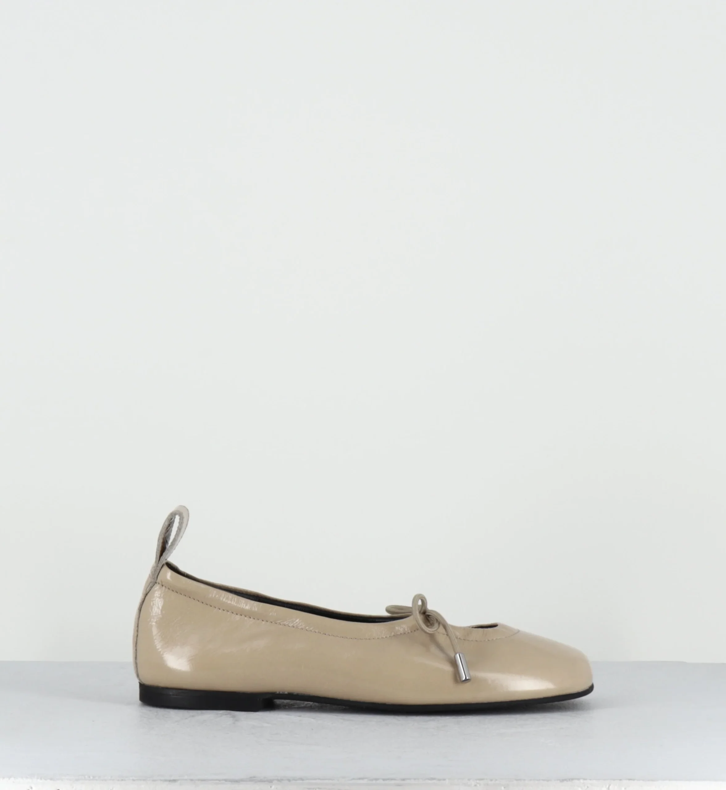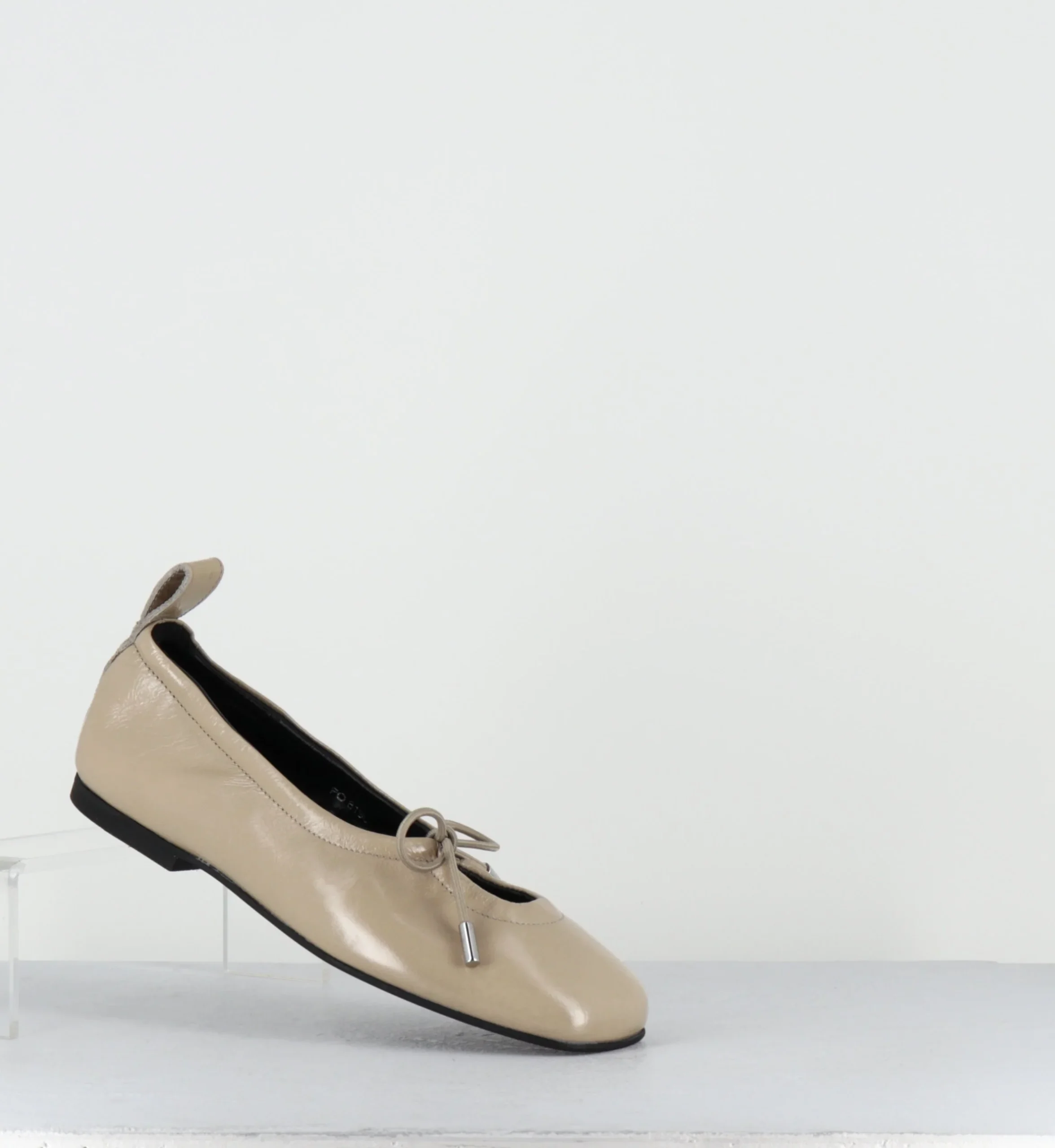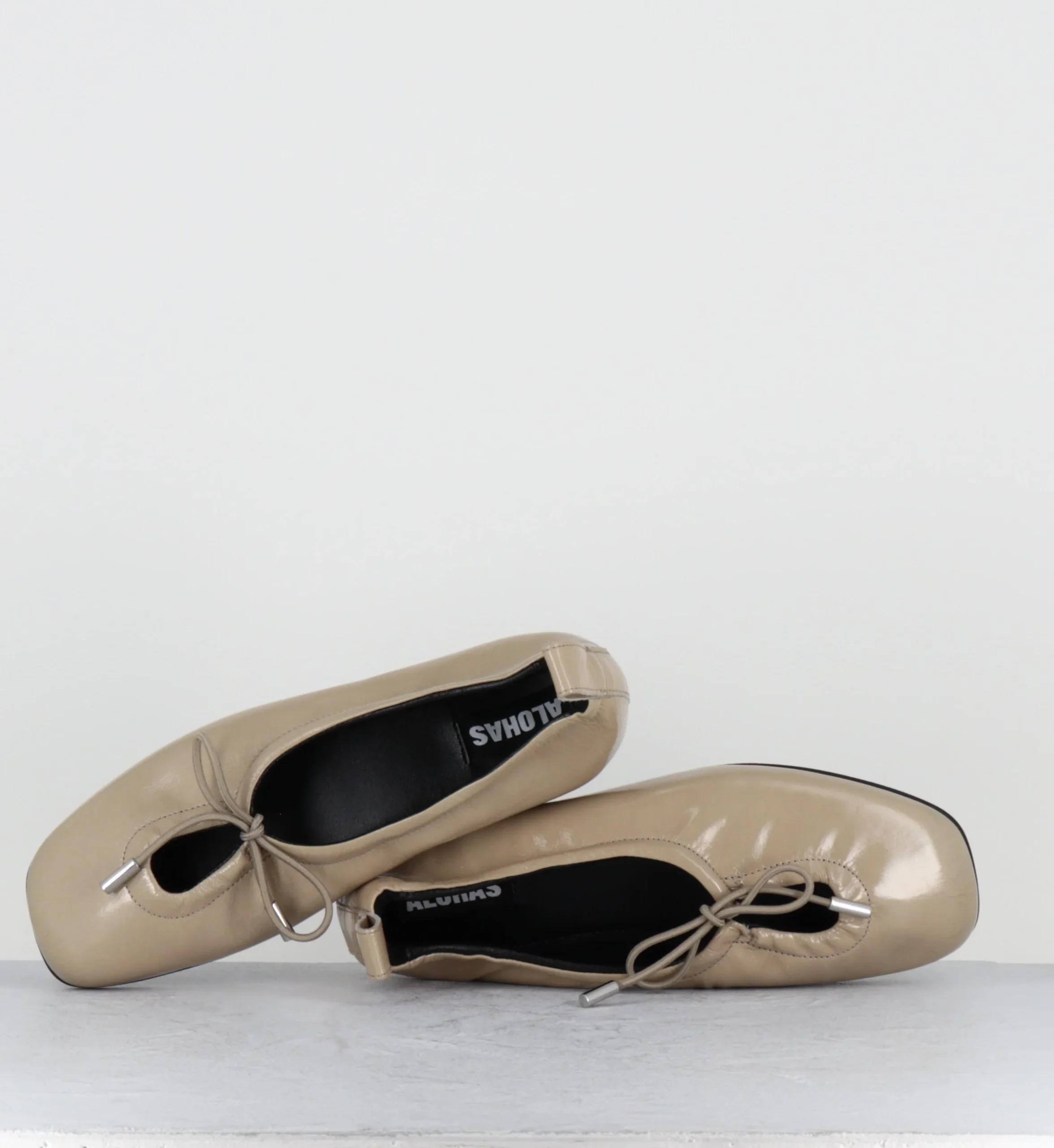Ballerines plates en cuir beige effet légèrement vernis, petit noeud élastique avec finitions dorées réglable à l’avant, bout carré arrondi Fabriqué à la main au Portugal – Ateliers Alohas Chausse normalement