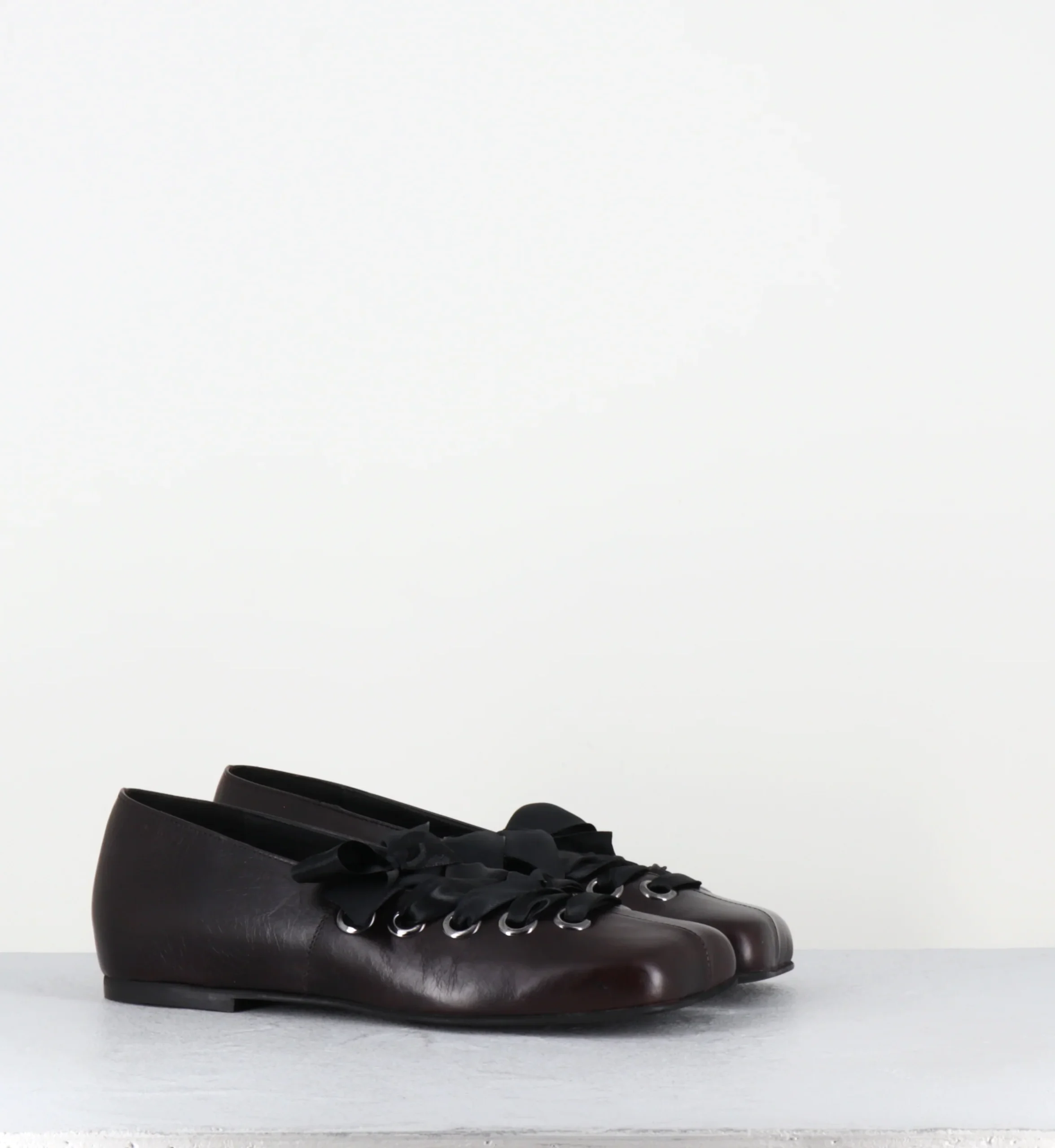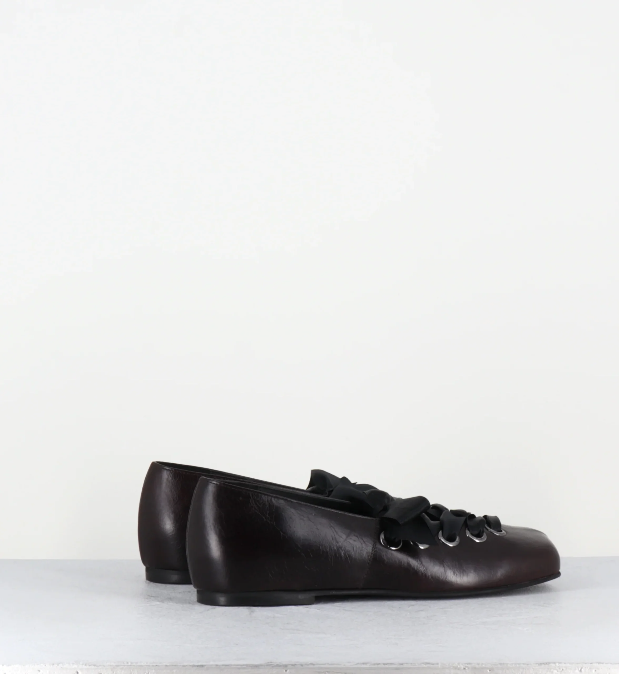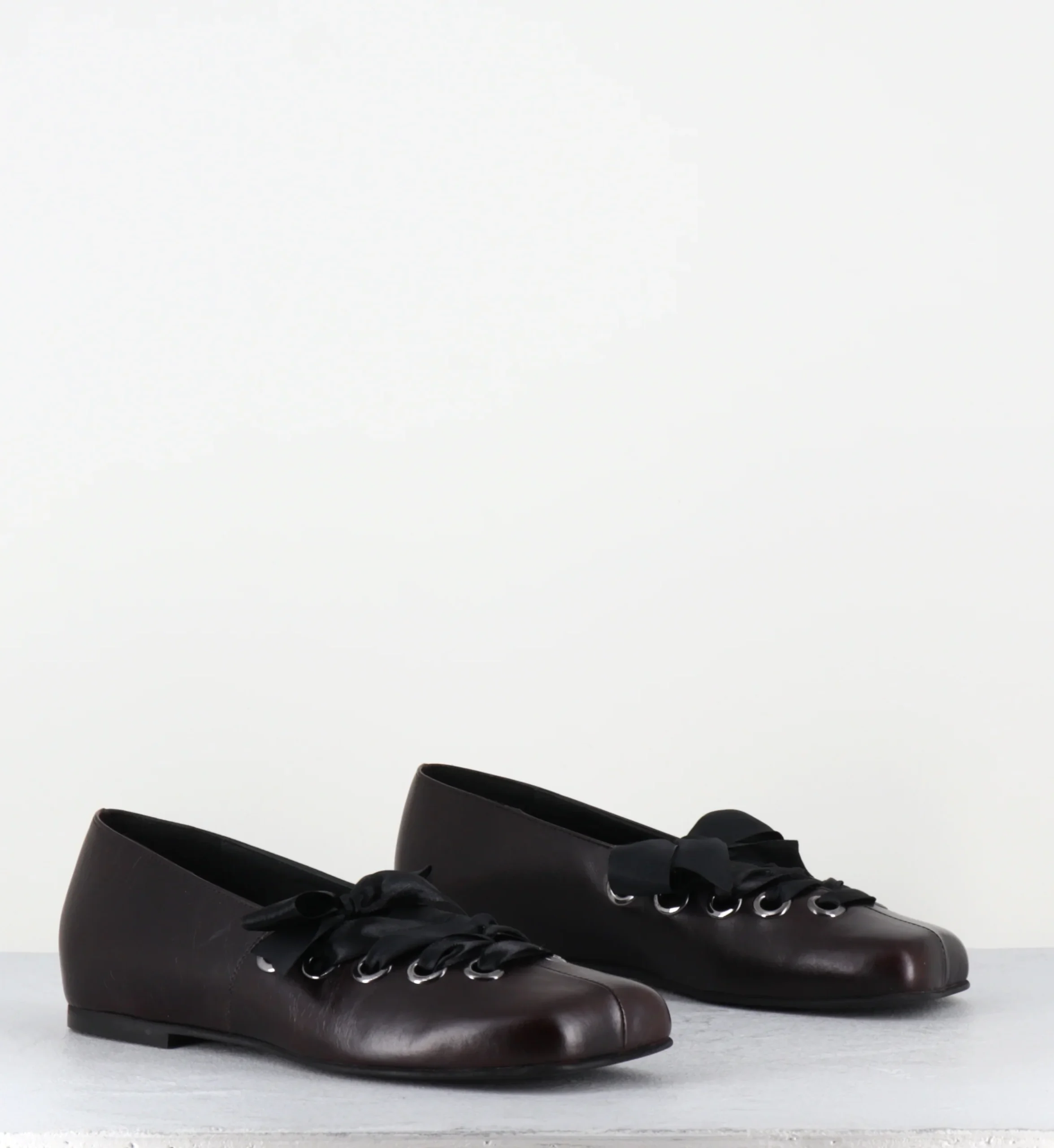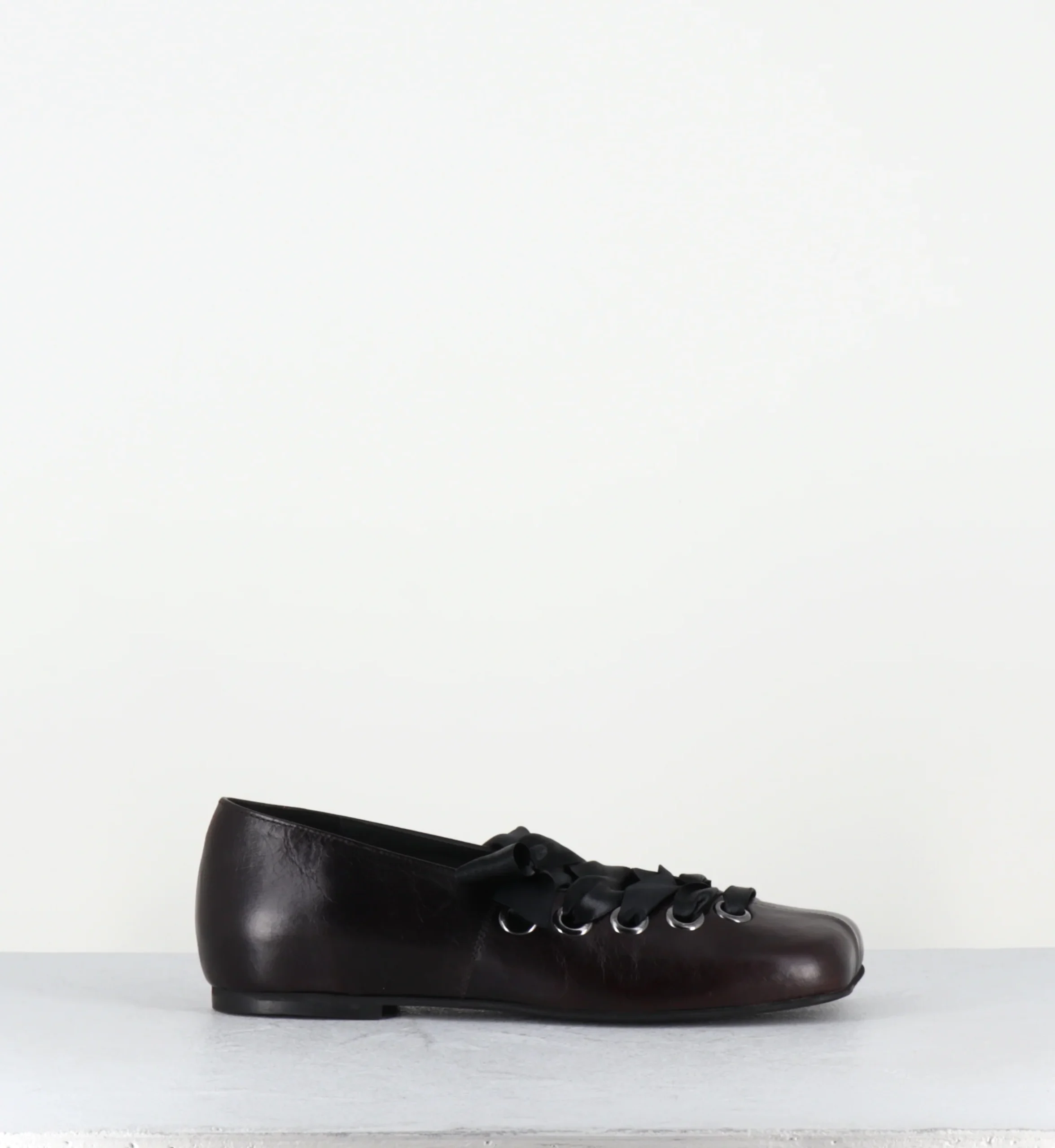 Ballerines en cuir marron à bout anatomique, rivets et ruban réglable sur le cou-de-pied Fabrication Artisanale Italienne – Ateliers Poeve