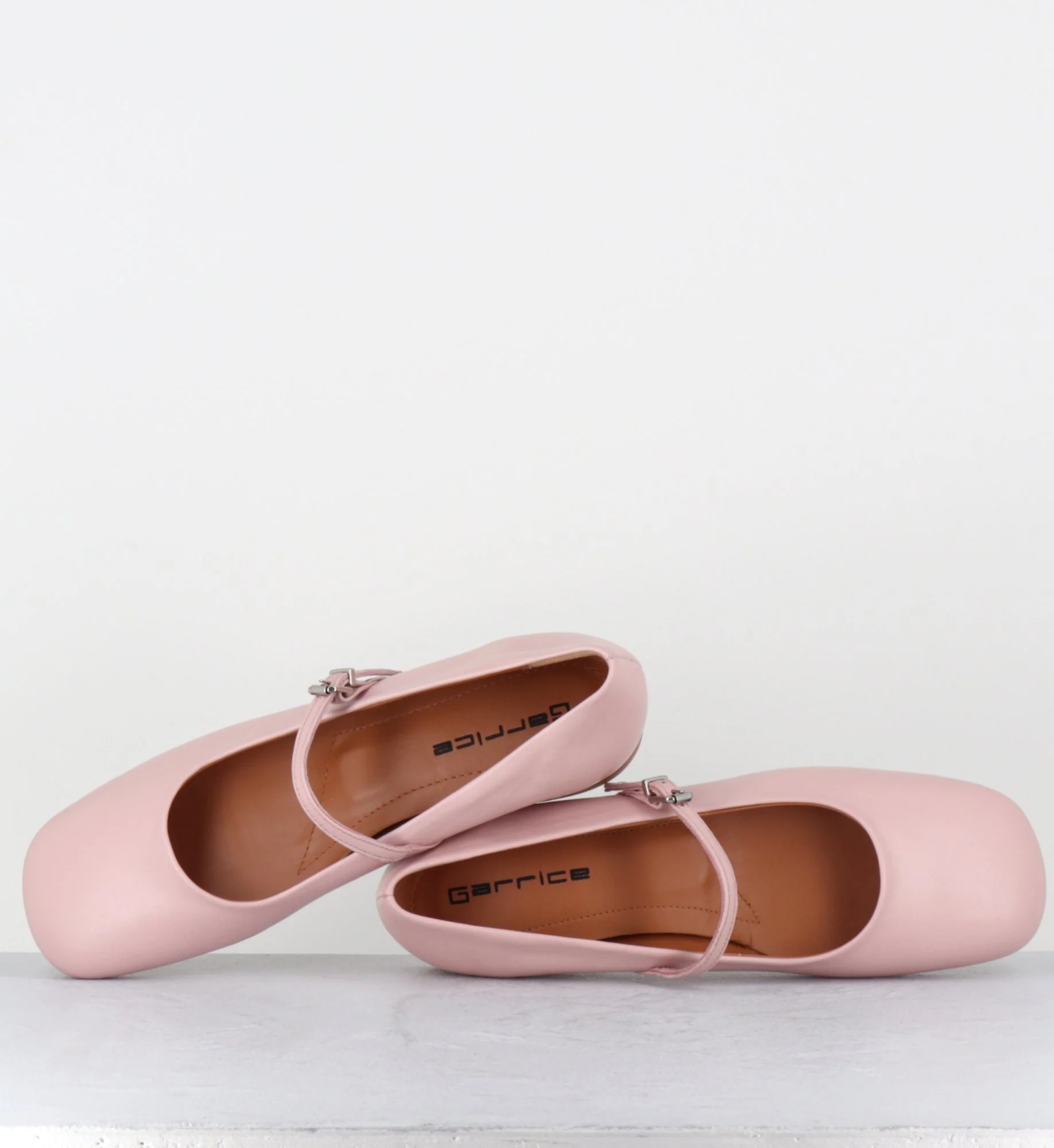 Ballerines ‘babies shoes’ à bride réglable en cuir rose pourdré, bout carré arrondi, montées sur une semelle intérieure légèrement compensée Fabrication Artisanale Italienne – Ateliers GarriceLab Chausse légèrement grand