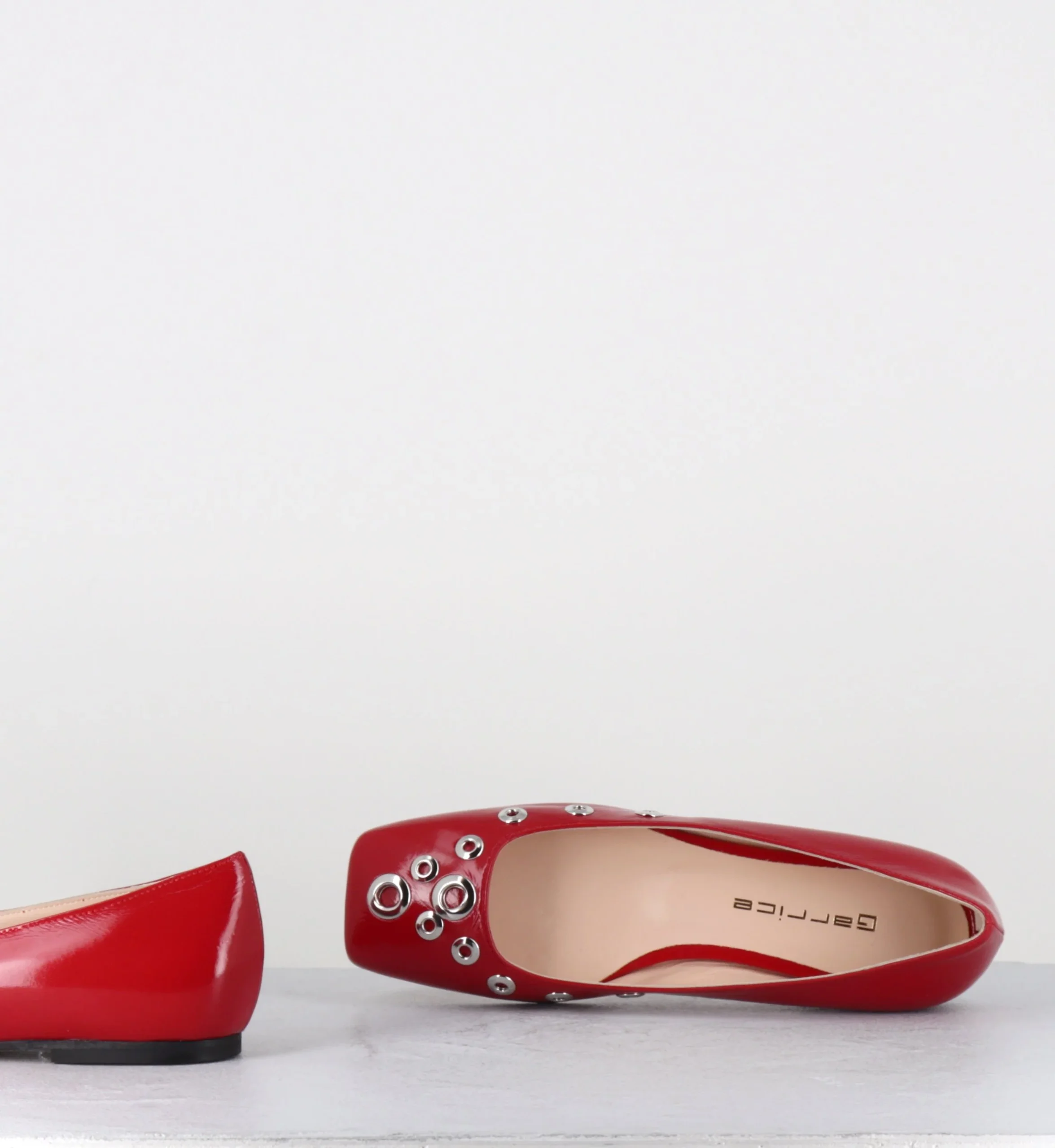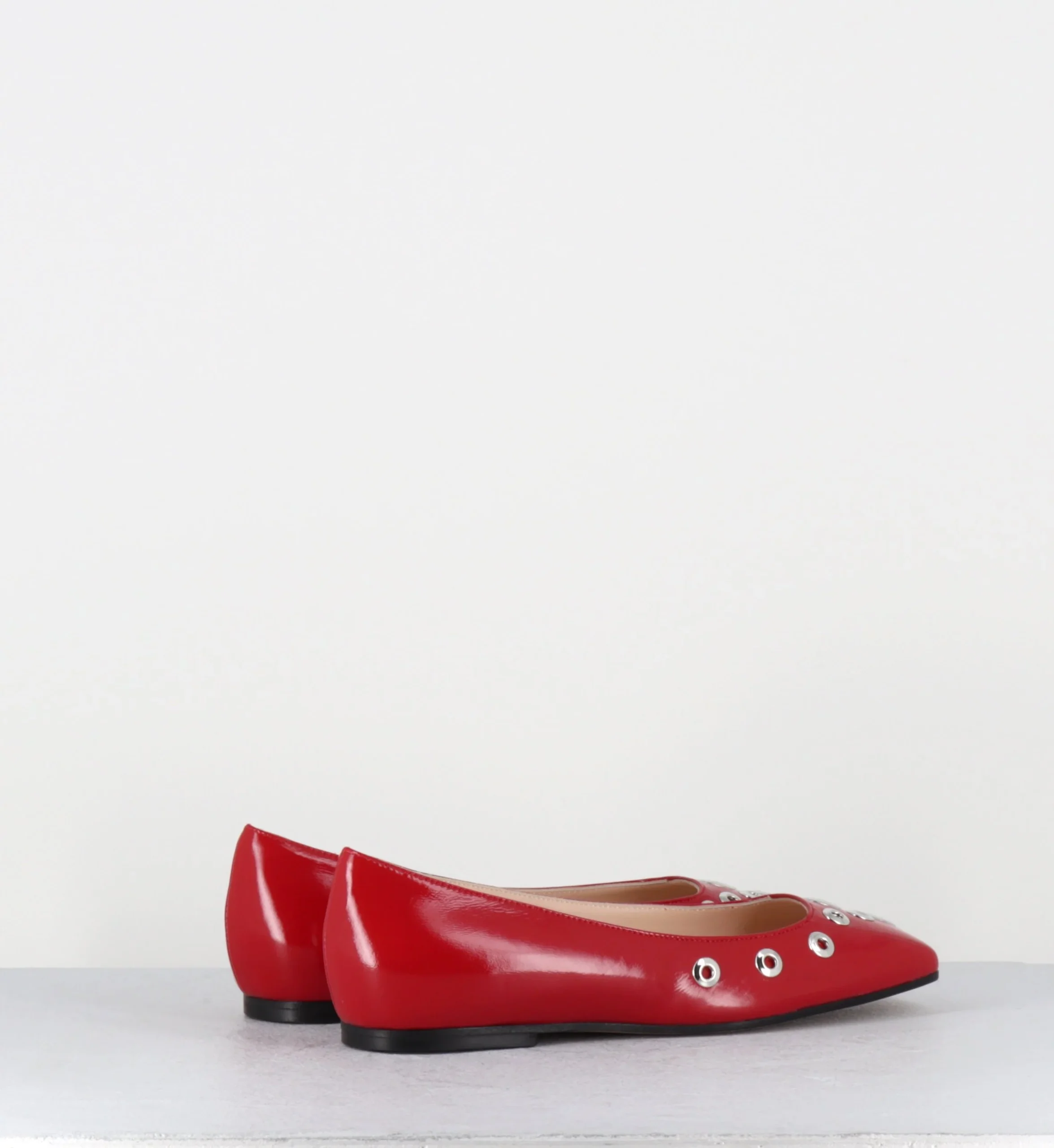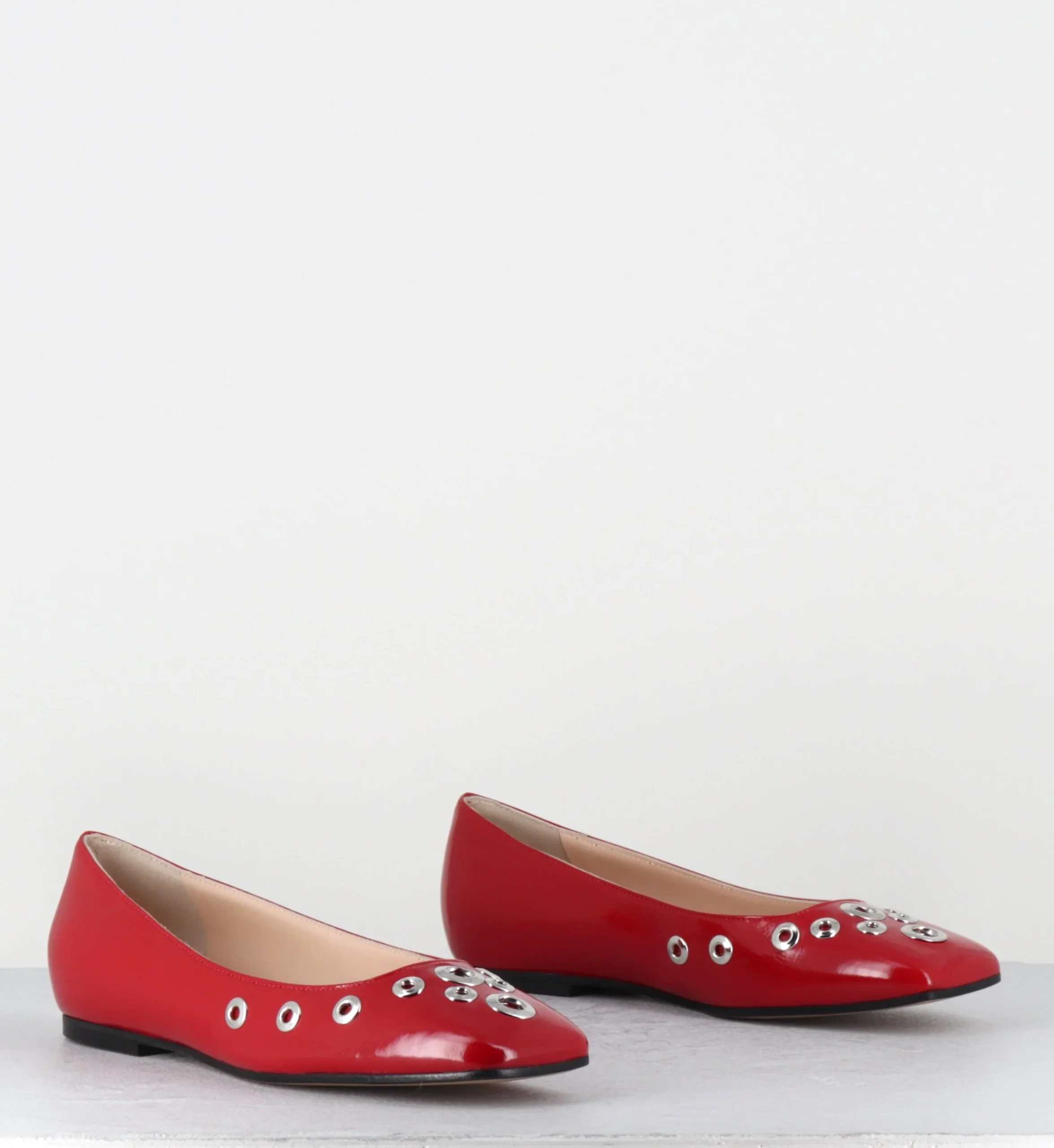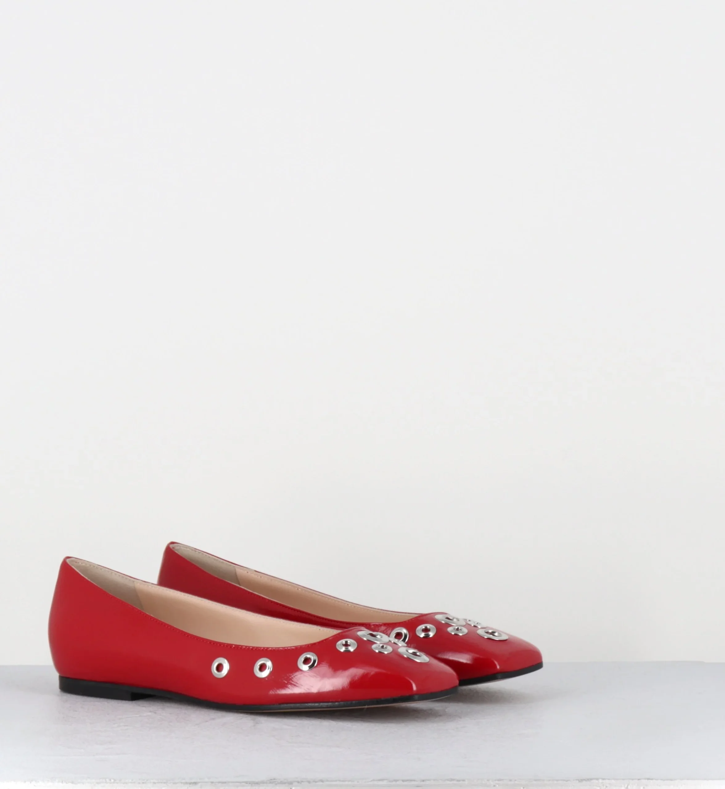 Ballerines en cuir rouge brillant avec rivets argent, bout carré, semelle avec renfort pour plus de confort Fabrication Artisanale Italienne – Ateliers GarriceLab