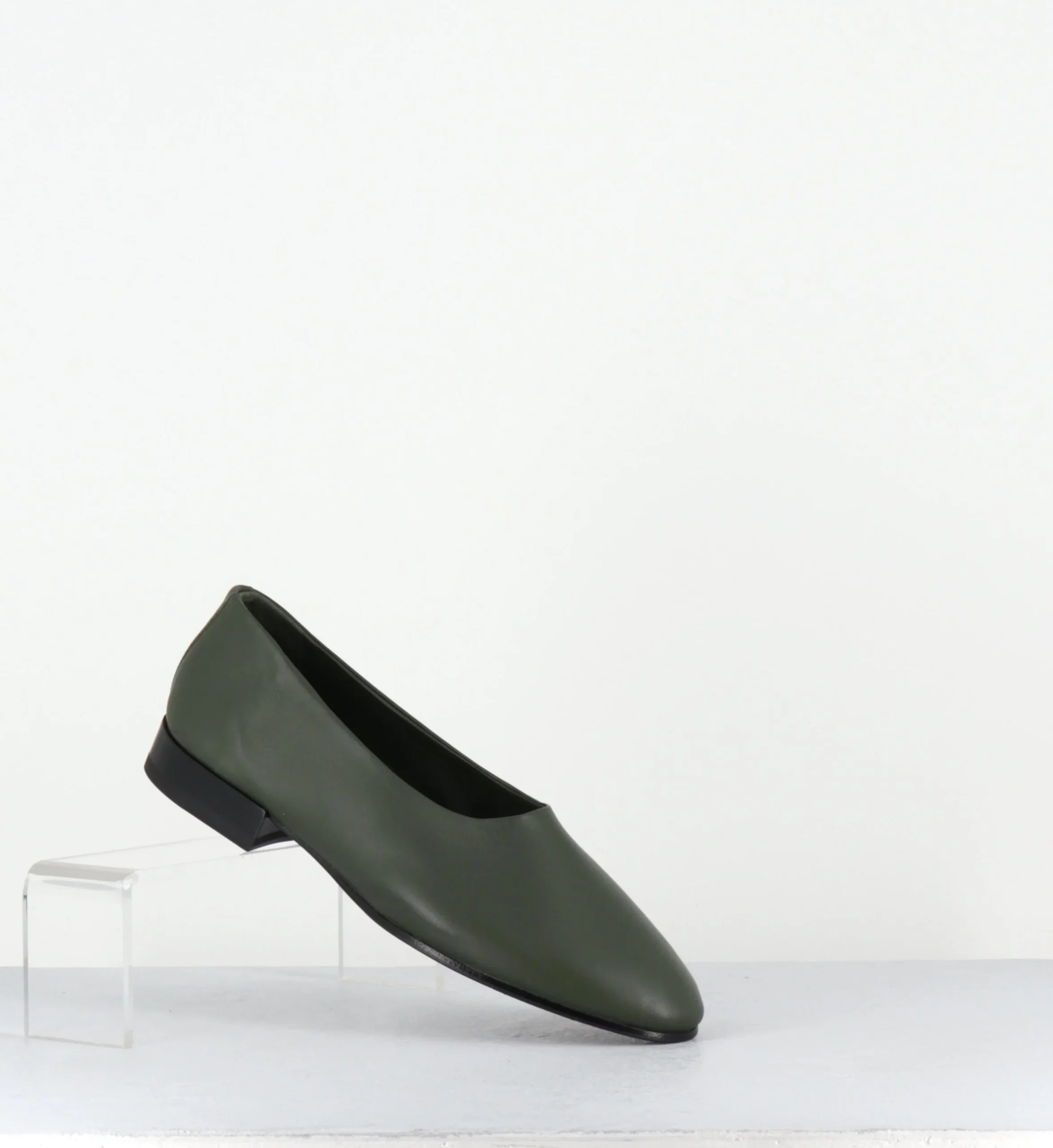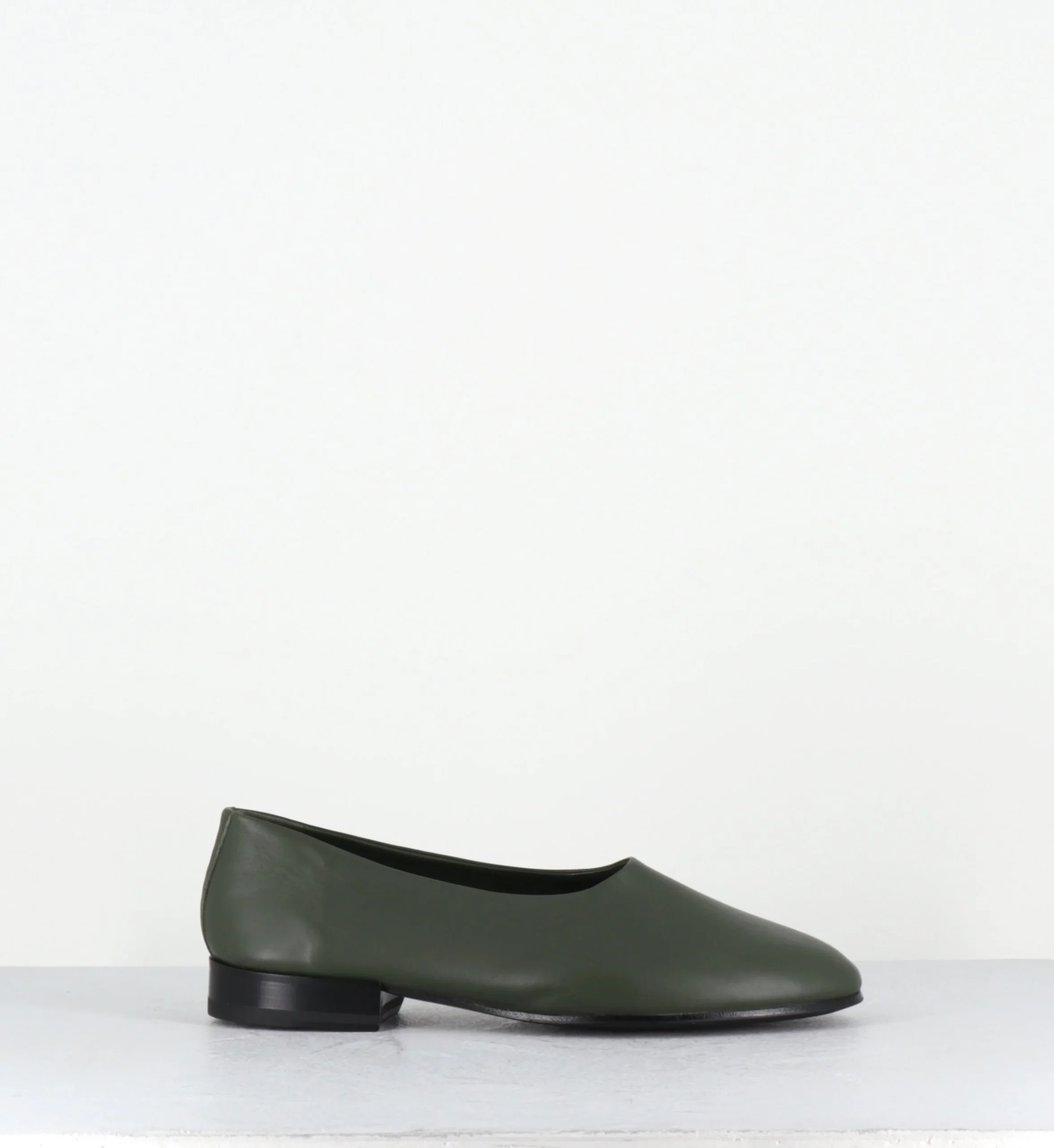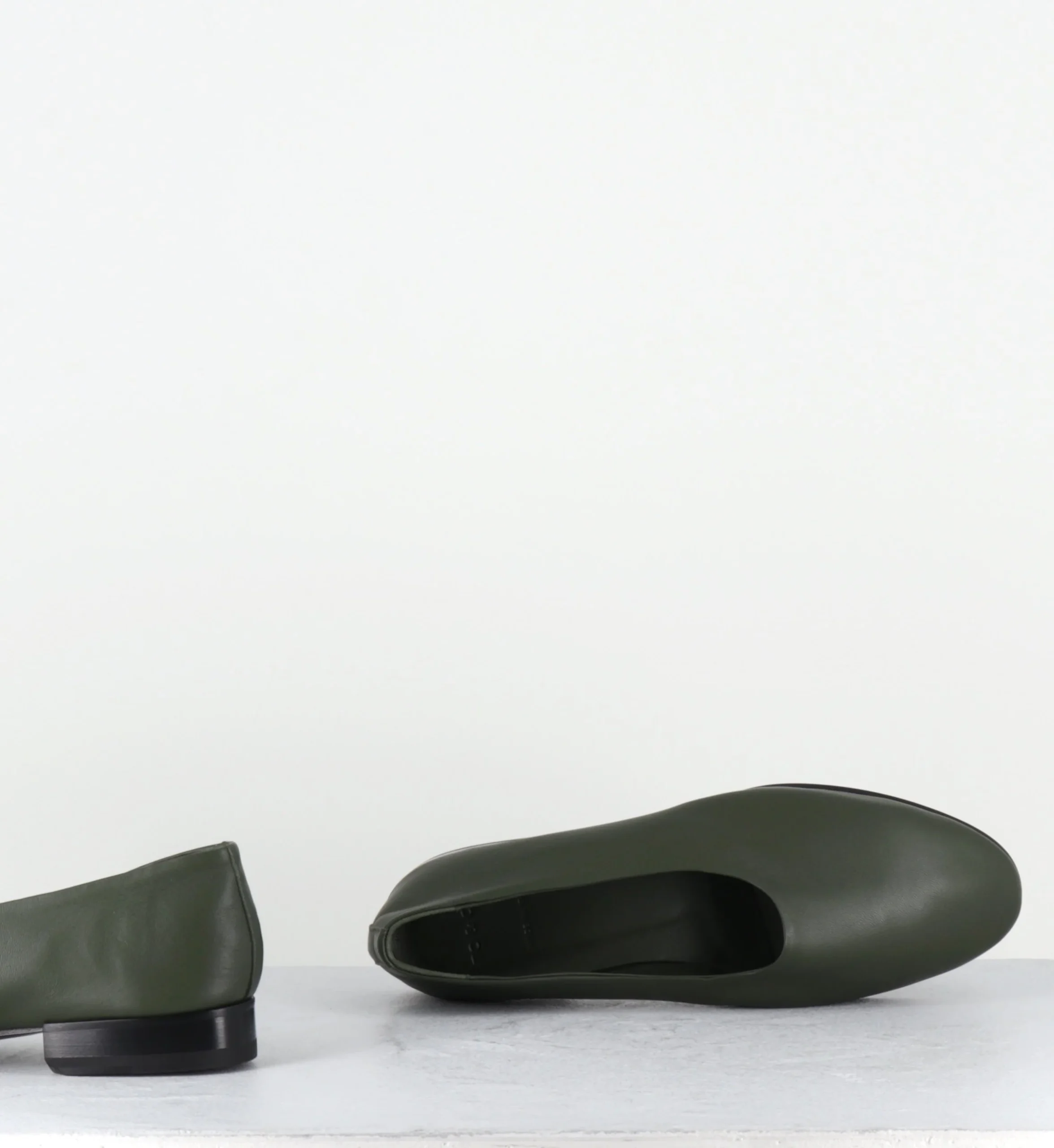 Ballerines en cuir vert kaki extrêmement souple à petit talon, ligne minimaliste japonaise semi-couvrante, montées sur une semelle en cuir cousue