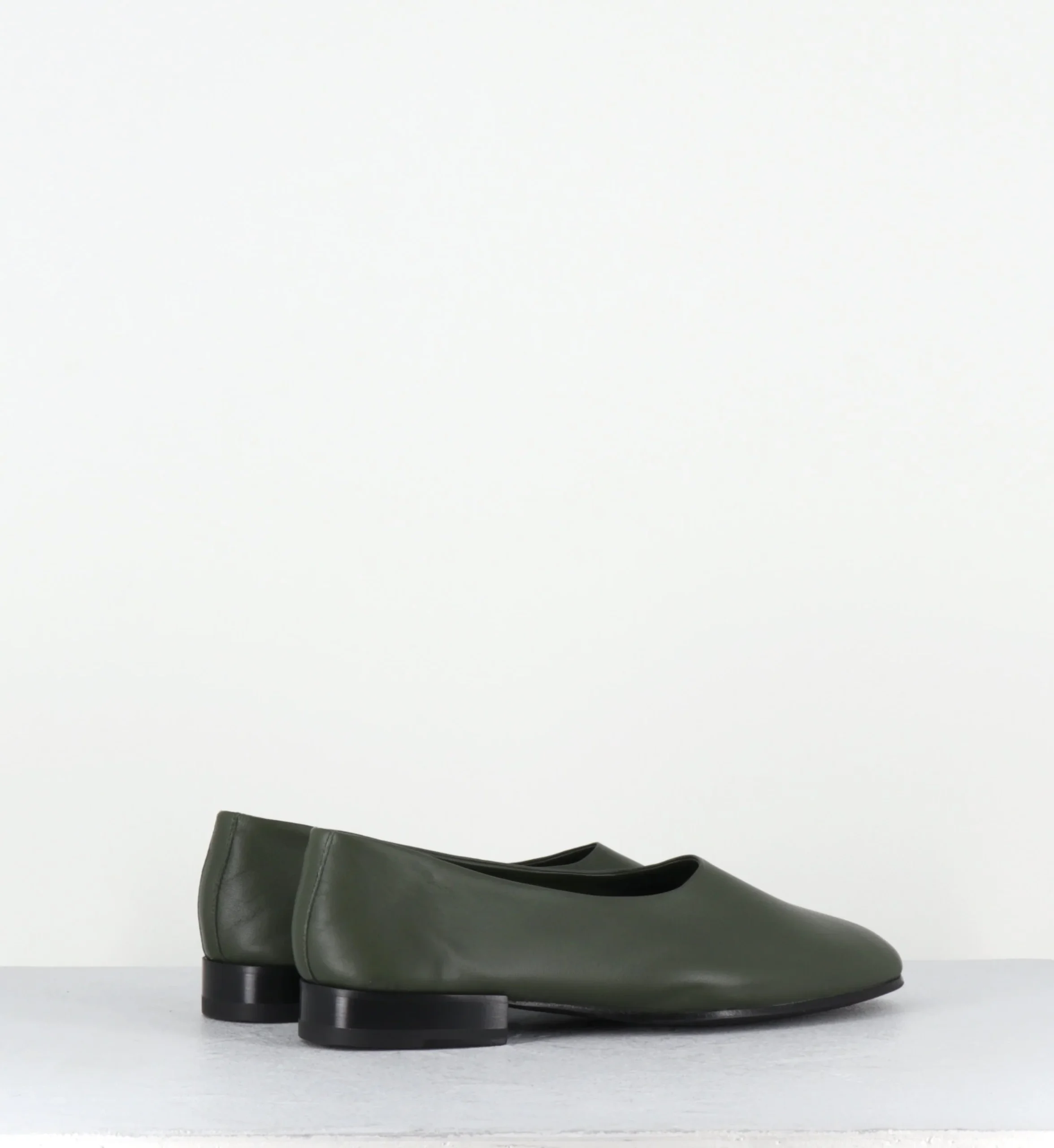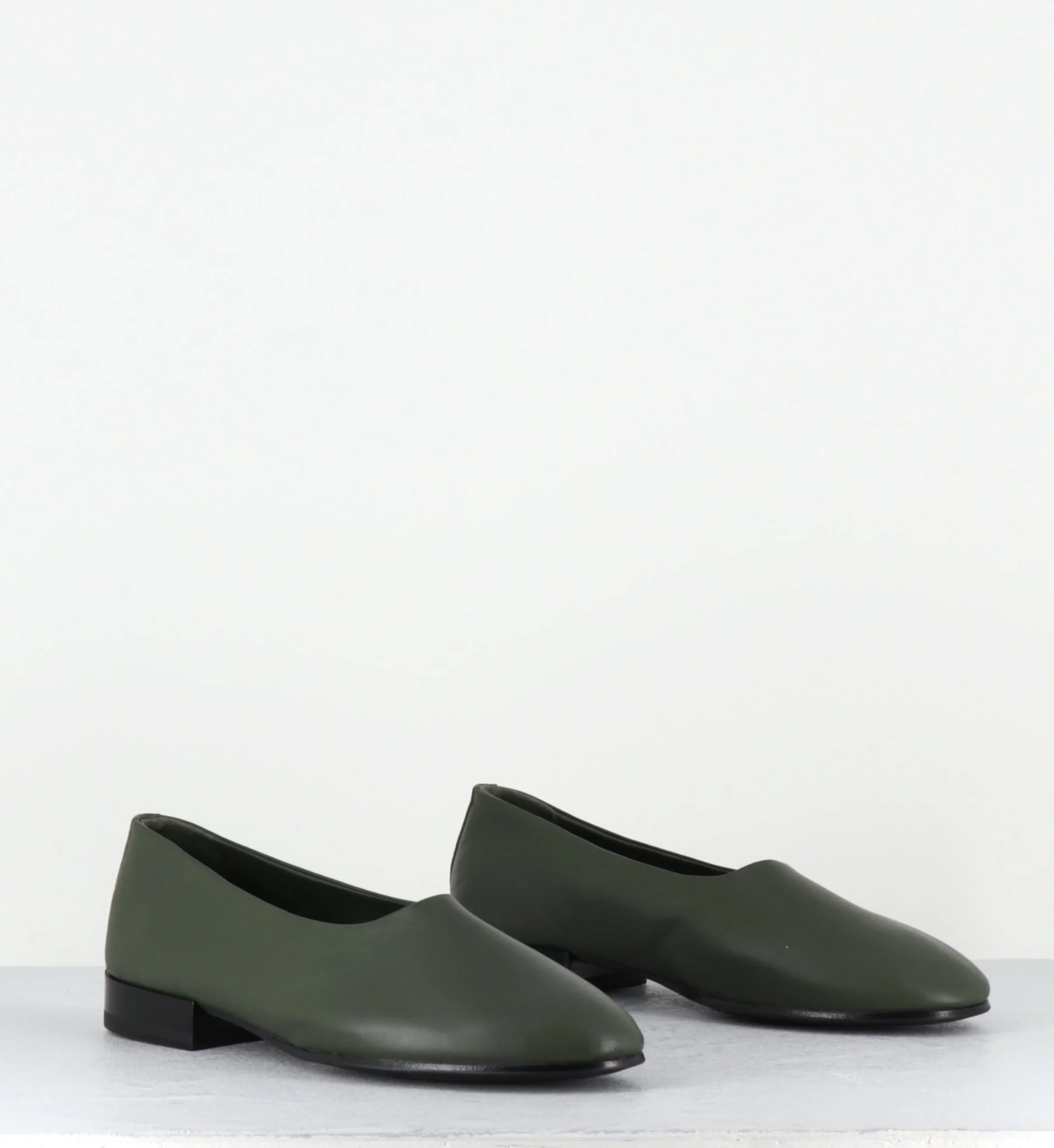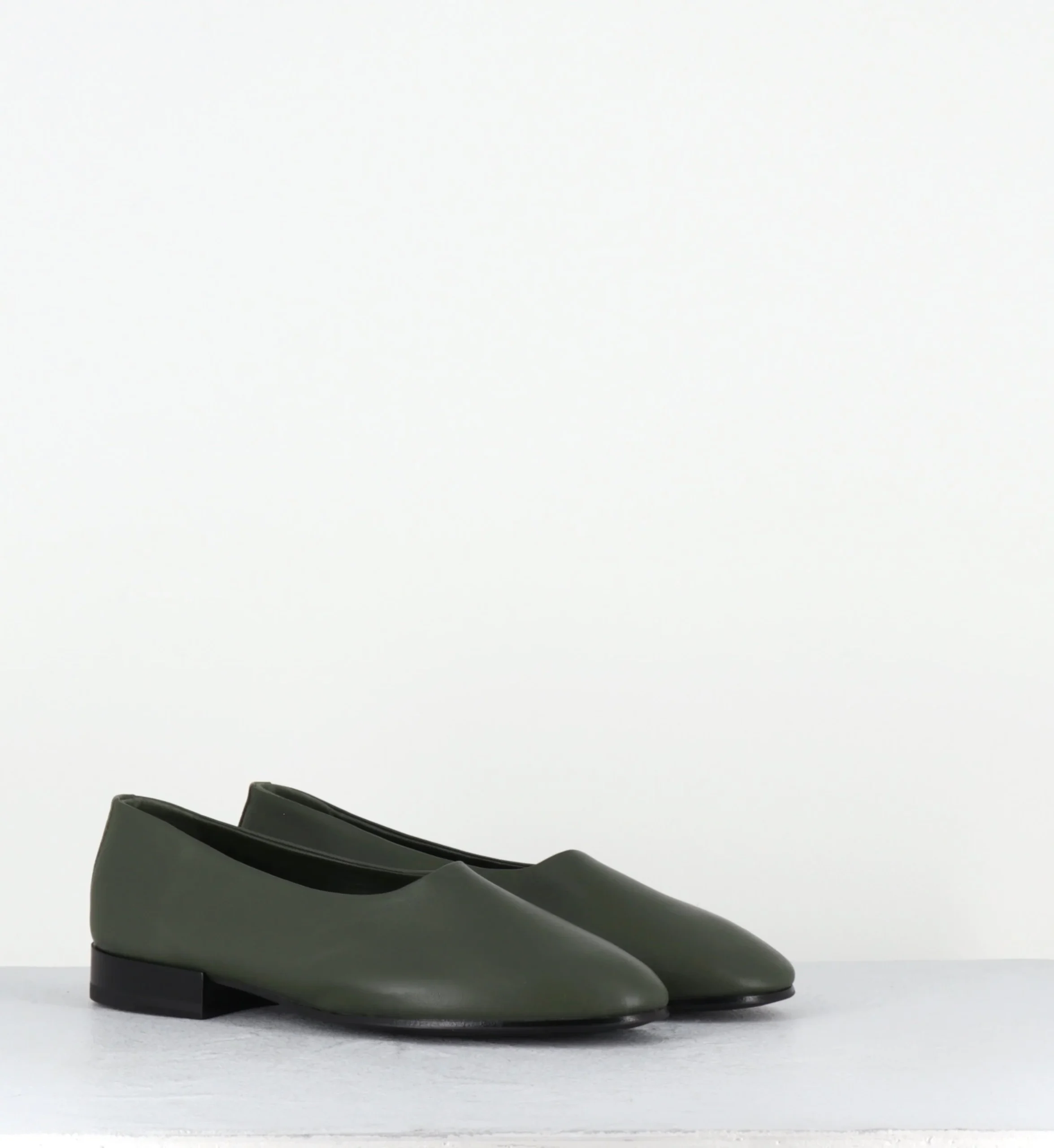 Ballerines en cuir vert kaki extrêmement souple à petit talon, ligne minimaliste japonaise semi-couvrante, montées sur une semelle en cuir cousue