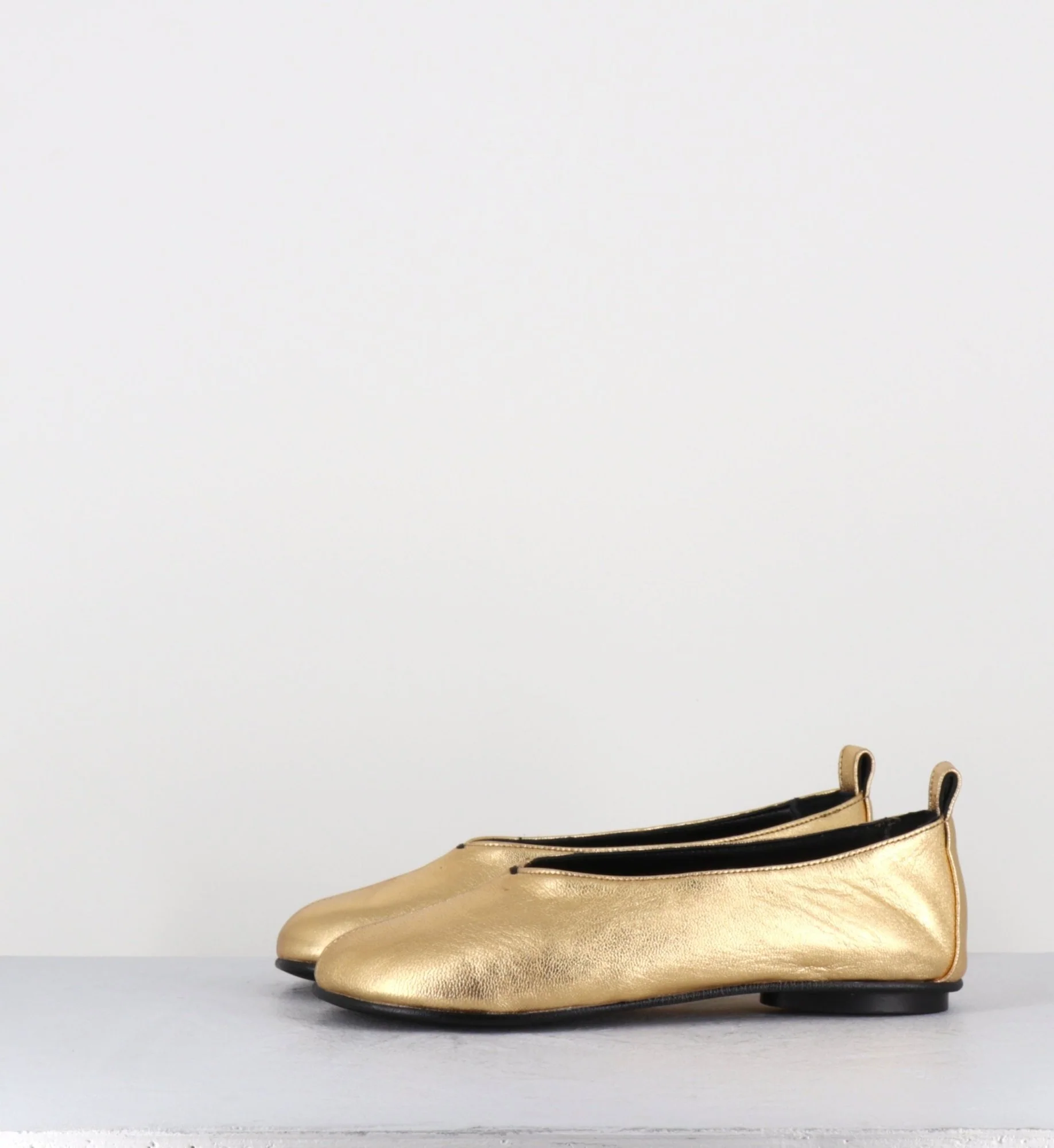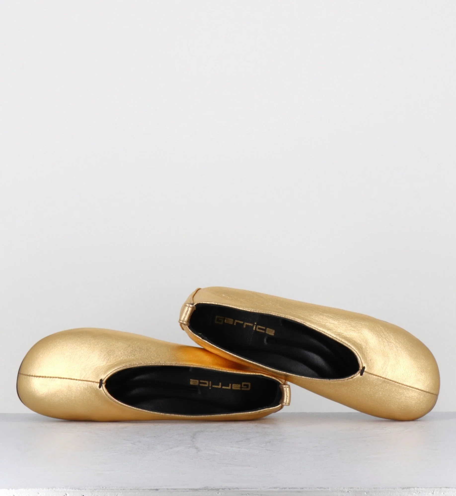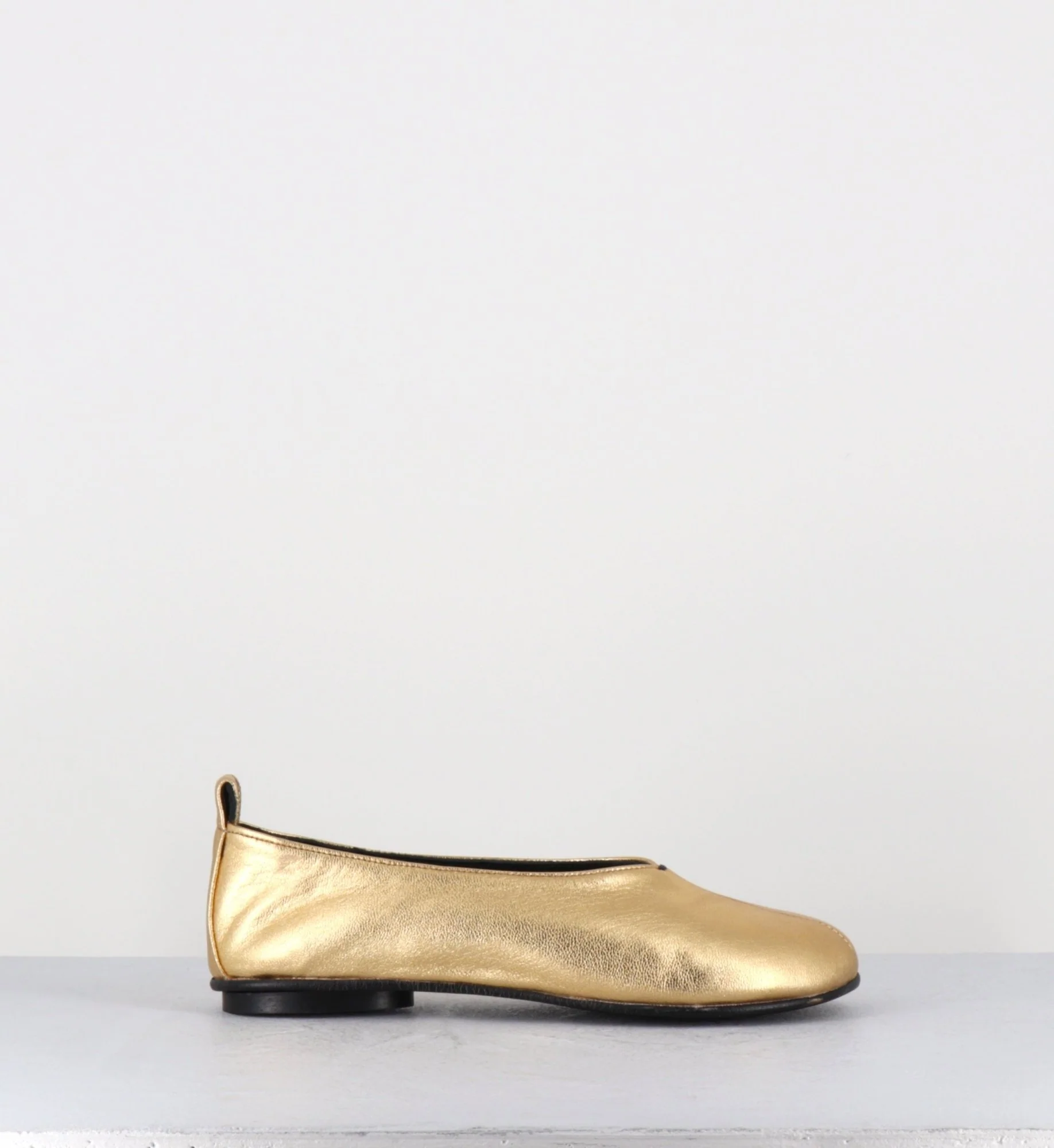 Ballerines semi-couvrante, ligne minimaliste japonisante à bout arrondi, réalisées dans un cuir métallisé doré extrêmement souple, semelle intérieure molletonnée à mémoire de forme, semelle extérieure cousue construction sacchetto flexible avec talonnette ronde en gomme. D’un grand confort. Fabriqué à la main au Portugal – Ateliers GarriceLab Chausse légèrement grand