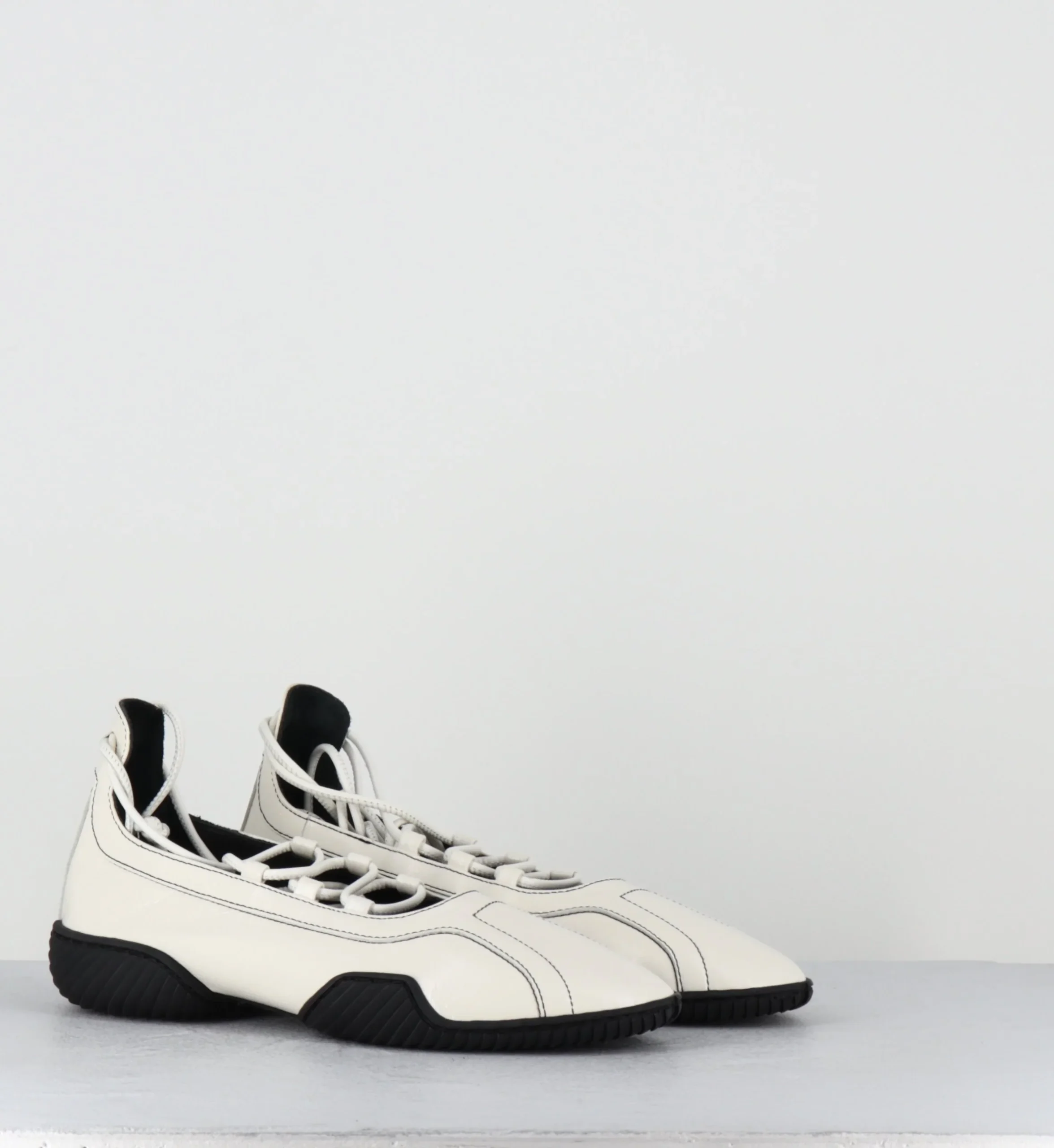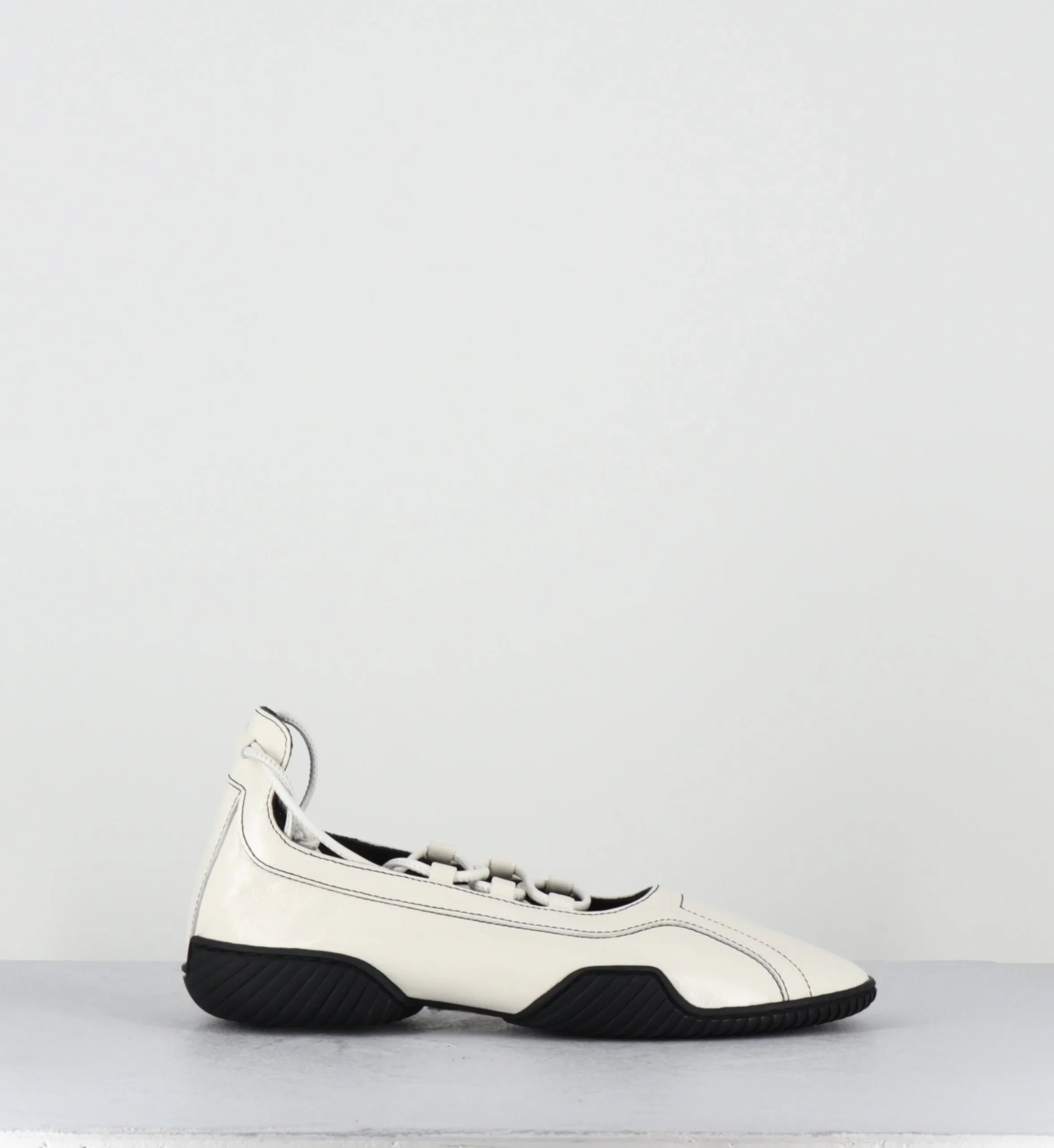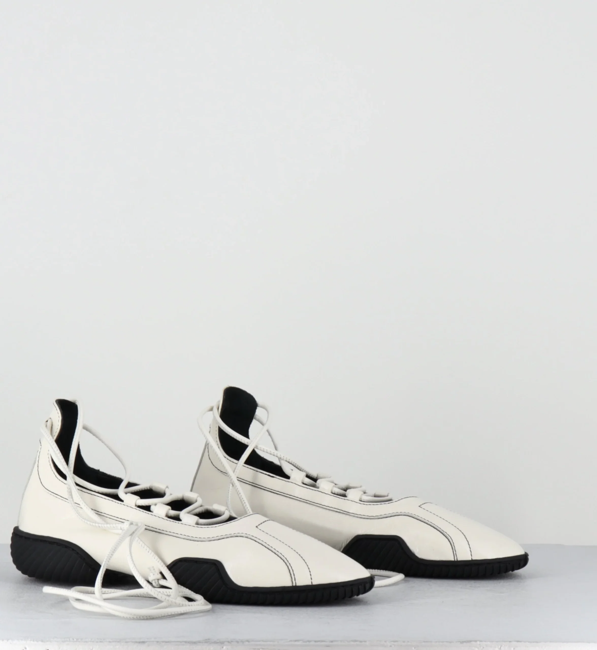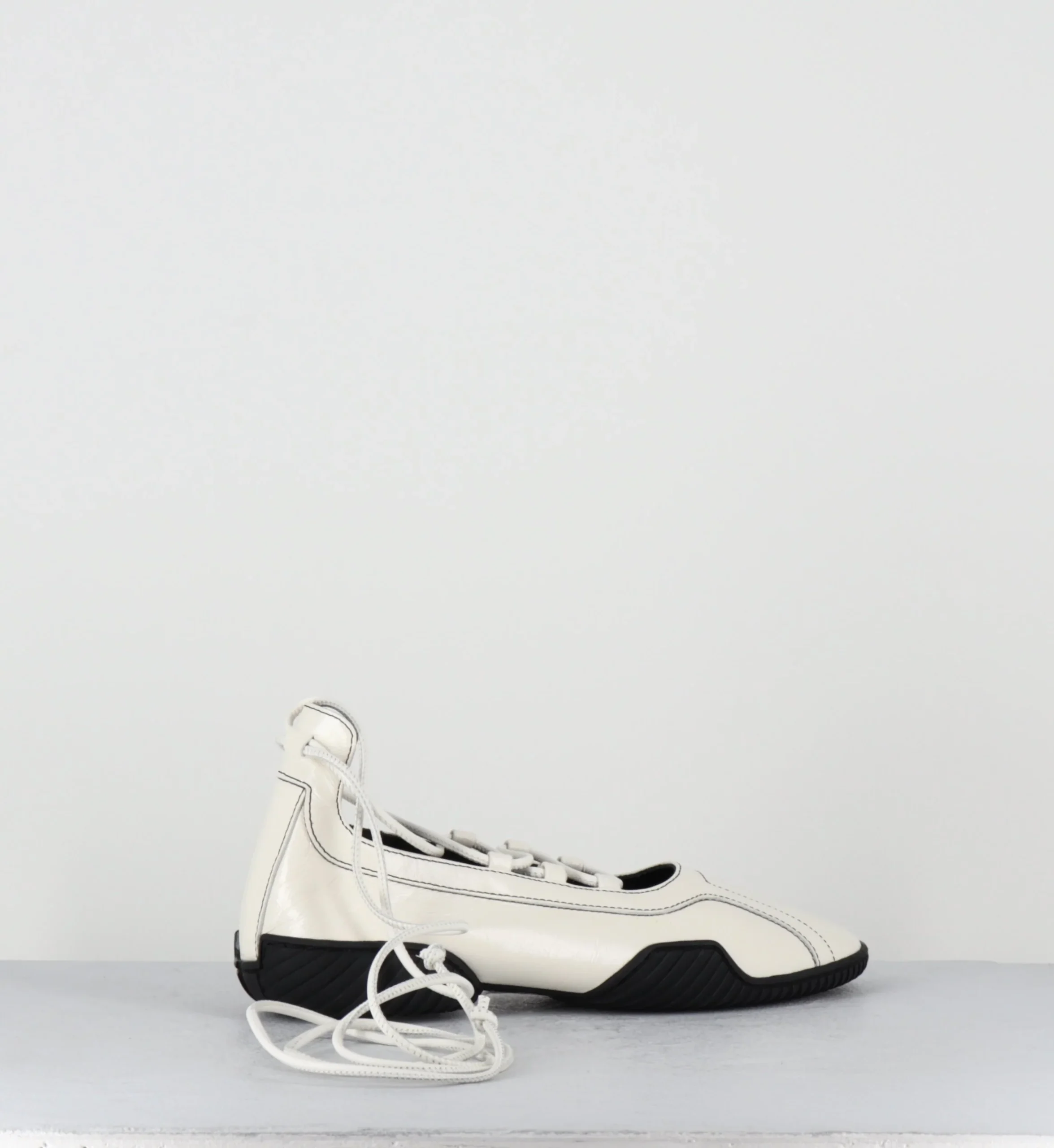 Ballerines en cuir blanc souple avec longs lacets à enrouler autour de la jambe, bout arrondi, montées sur une semelle en gomme souple et légère à débords rappelant les chaussures de boxe et le début des années 2000