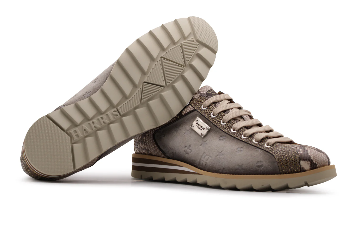 Un mélange audacieux de matériaux précieux pour cette sneaker exclusive a signé Harris. La tige est en cuir de roche à pitone, flanquée de daim moulé par la main, avec un motif monogramme. Embelli d’effet de race Imprimé de détails en cuir qui ajoutent un contraste d’un grand impact. La conception complète les accessoires en nickel et la semelle en caoutchouc de style coureur pour le confort moderne.