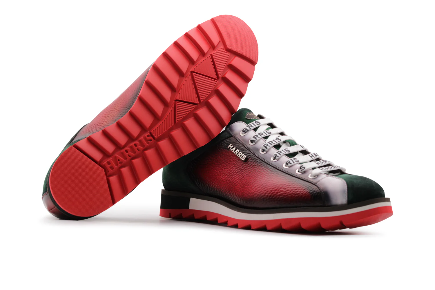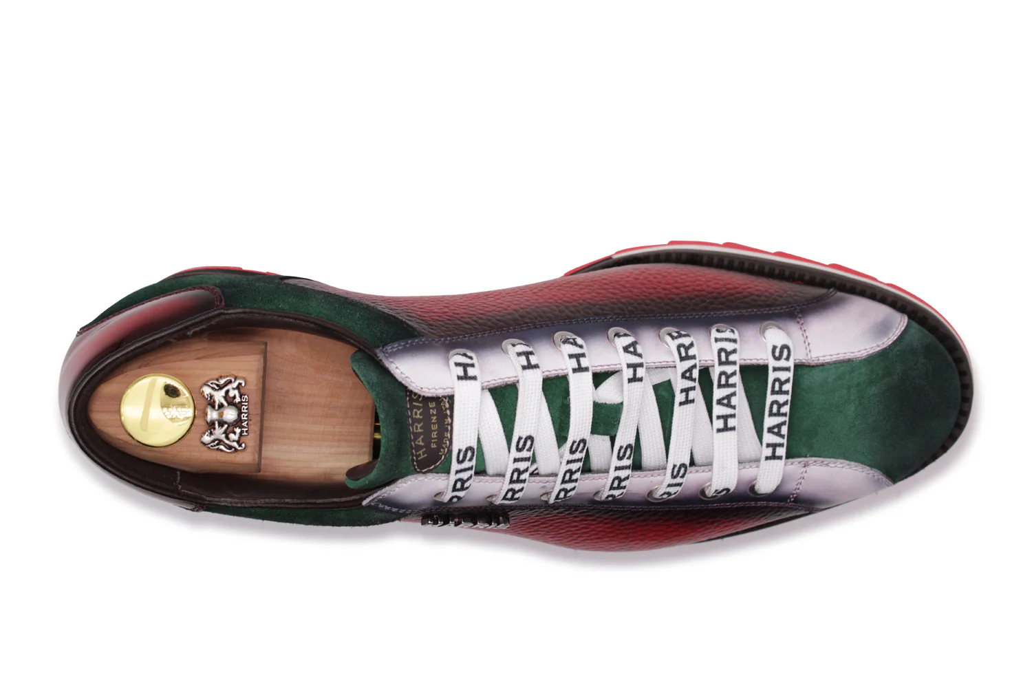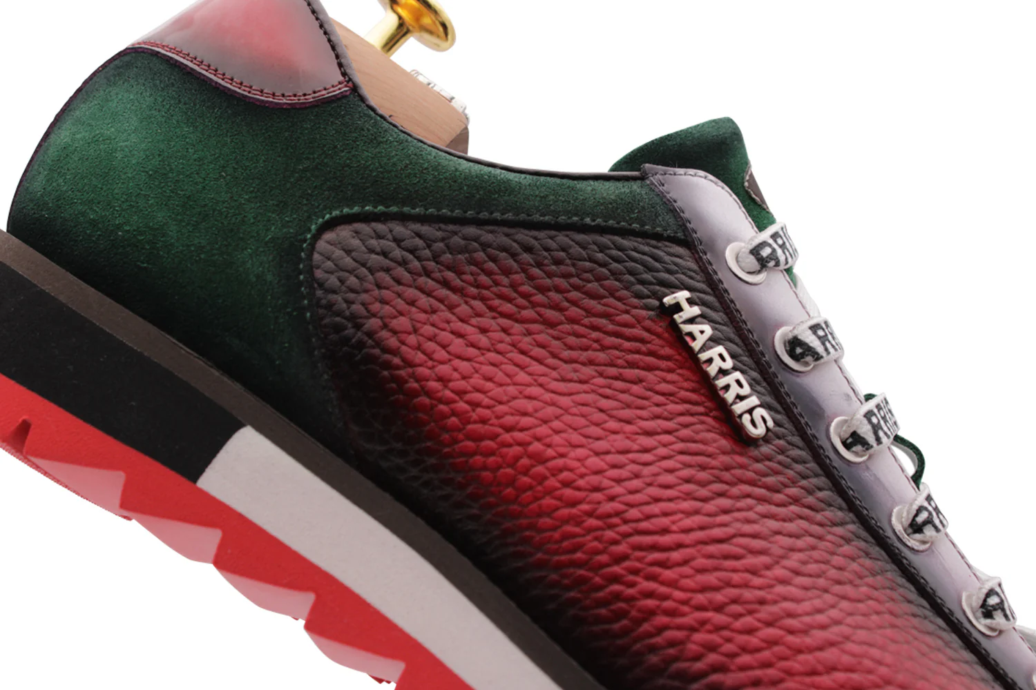 Caractère sportif et détails raffinés pour cette sneaker Harris en cuir de veau avec une impression d’effet alce, peinte à la main pour un look unique. La peau en daim et les détails en cuir brossé enrichissent le design d’élégance. Le modèle complète les accessoires dans la finition Nichel, la semelle en caoutchouc de coureur et le traitement de Blake Rapid Craft.