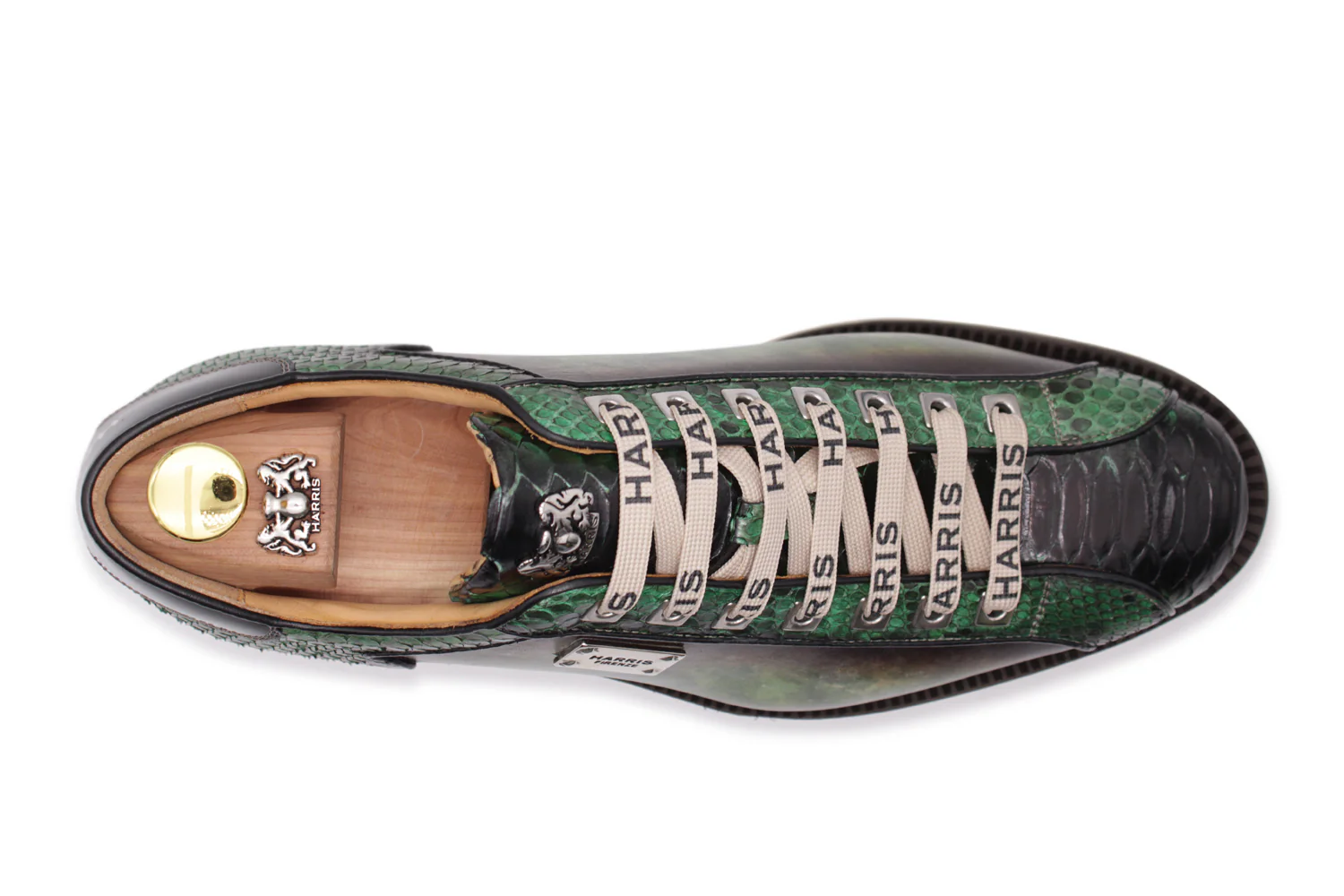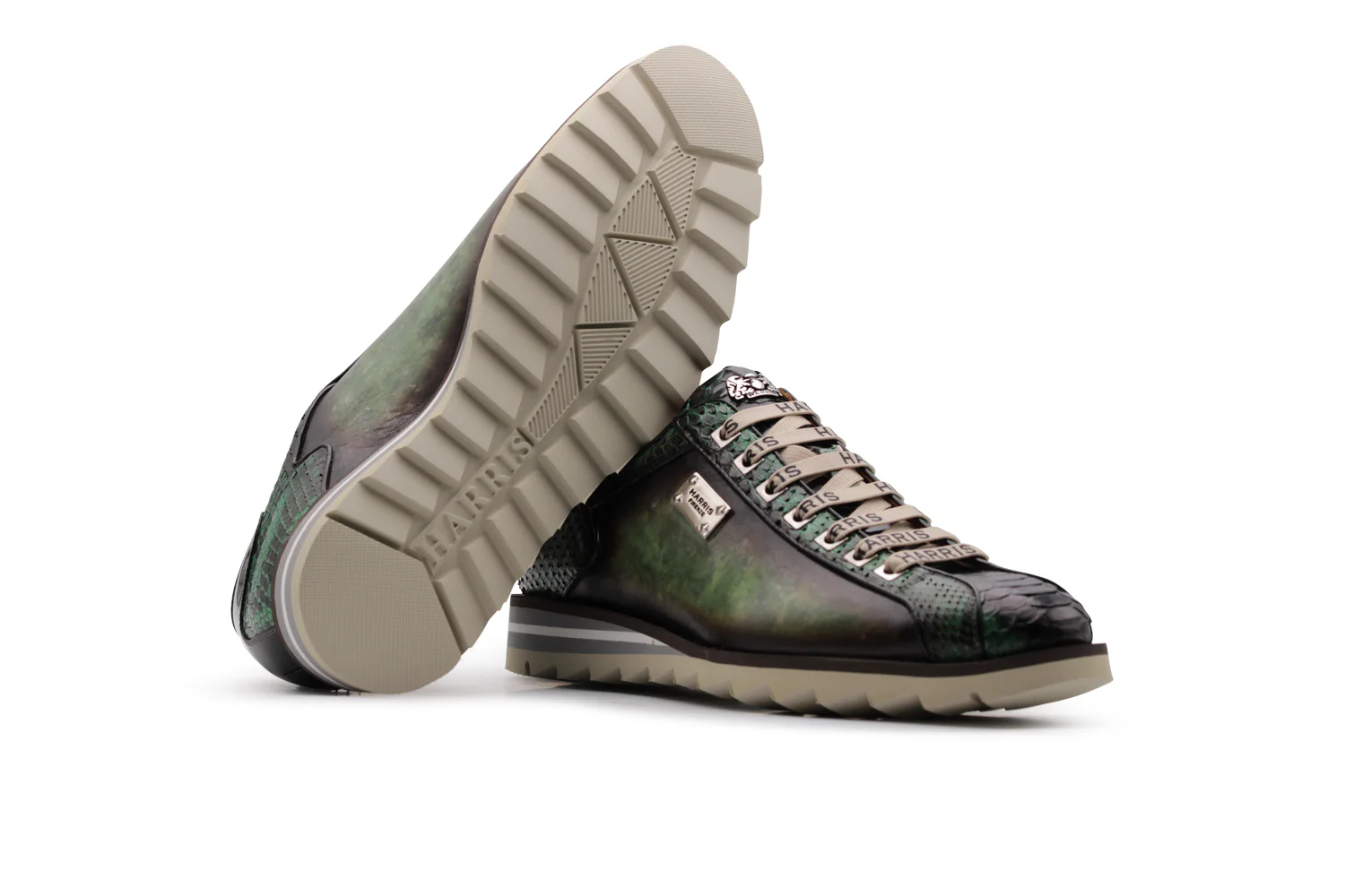 L’élégance artisanale et les personnages décisifs fusionnent dans cette sneaker Harris avec un style exclusif. Fabriqué en précieux cuir de veau de flux complet avec la tige supérieure à bouffée et à la main, il est embelli de détails de python qui ajoutent une touche raffinée.