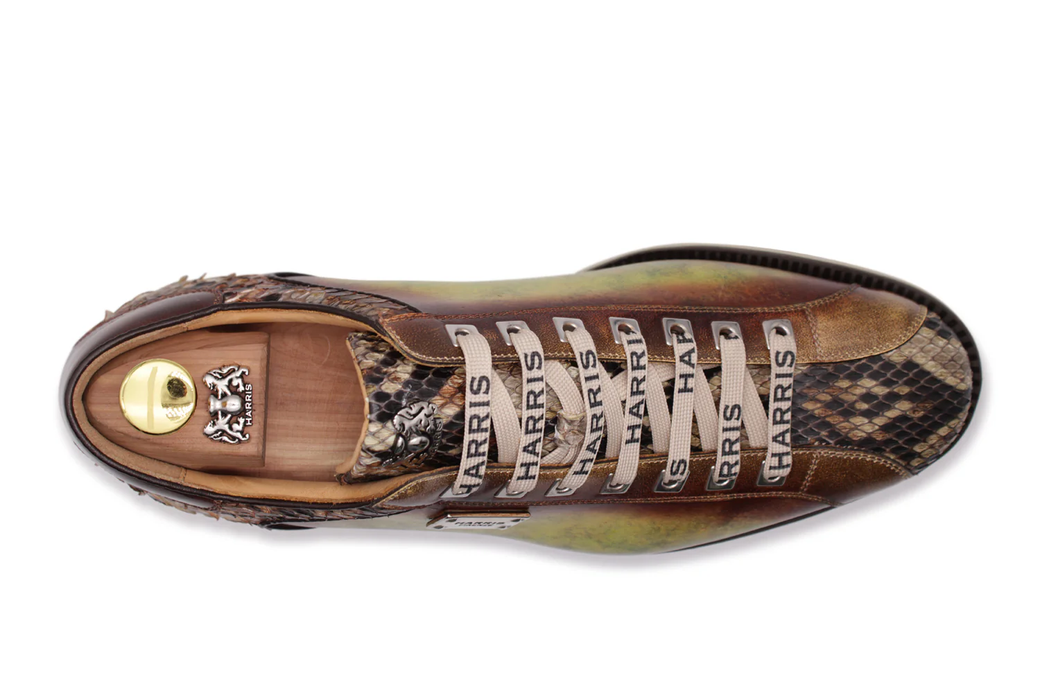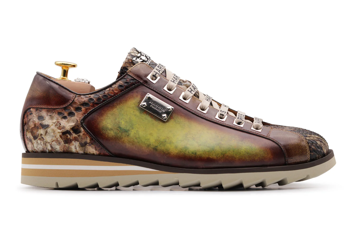 Cette sneaker combine le veau de flux complet et le réel cuir python pour un effet ombré unique. Les détails en cuir brossé améliorent la conception tandis que les accessoires de la finition nickel ajoutent une touche moderne. La semelle en caoutchouc de coureur et le traitement rapide de Blake complètent le modèle en offrant un confort et une résistance.