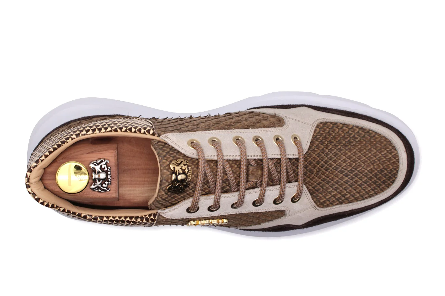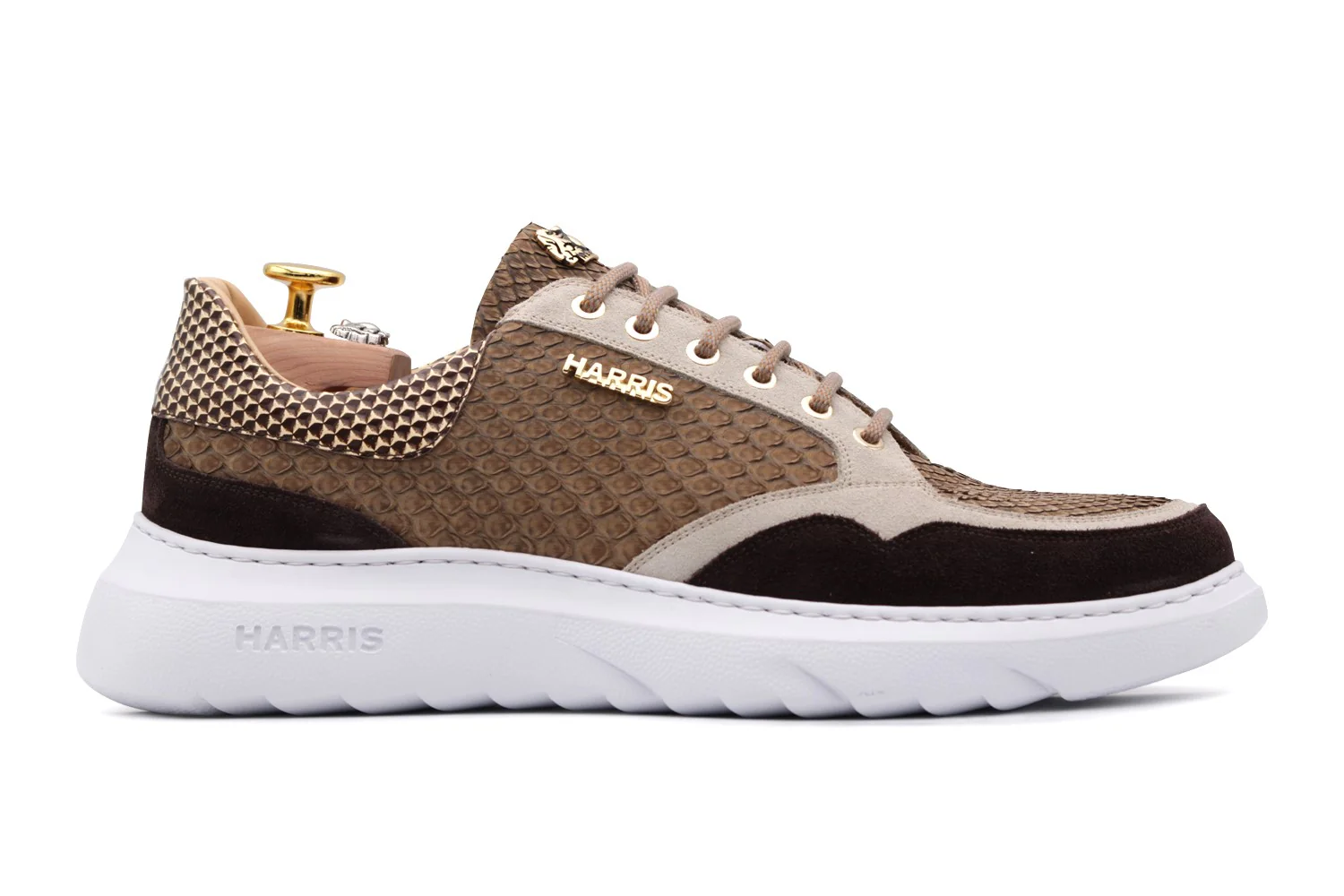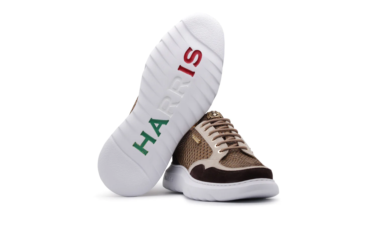 Des baskets avec un charme exclusif, en peau python beige fine qui améliore son élégance et son raffinement. Les détails en cuir en daim ajoutent de la profondeur à la conception, tandis que le logo Harris en or donne une touche de prestige. La semelle en caoutchouc d’évolution, caractérisée par une couleur vive, assure le confort et l’originalité, ce qui rend ces baskets parfaites pour ceux qui veulent se démarquer avec style