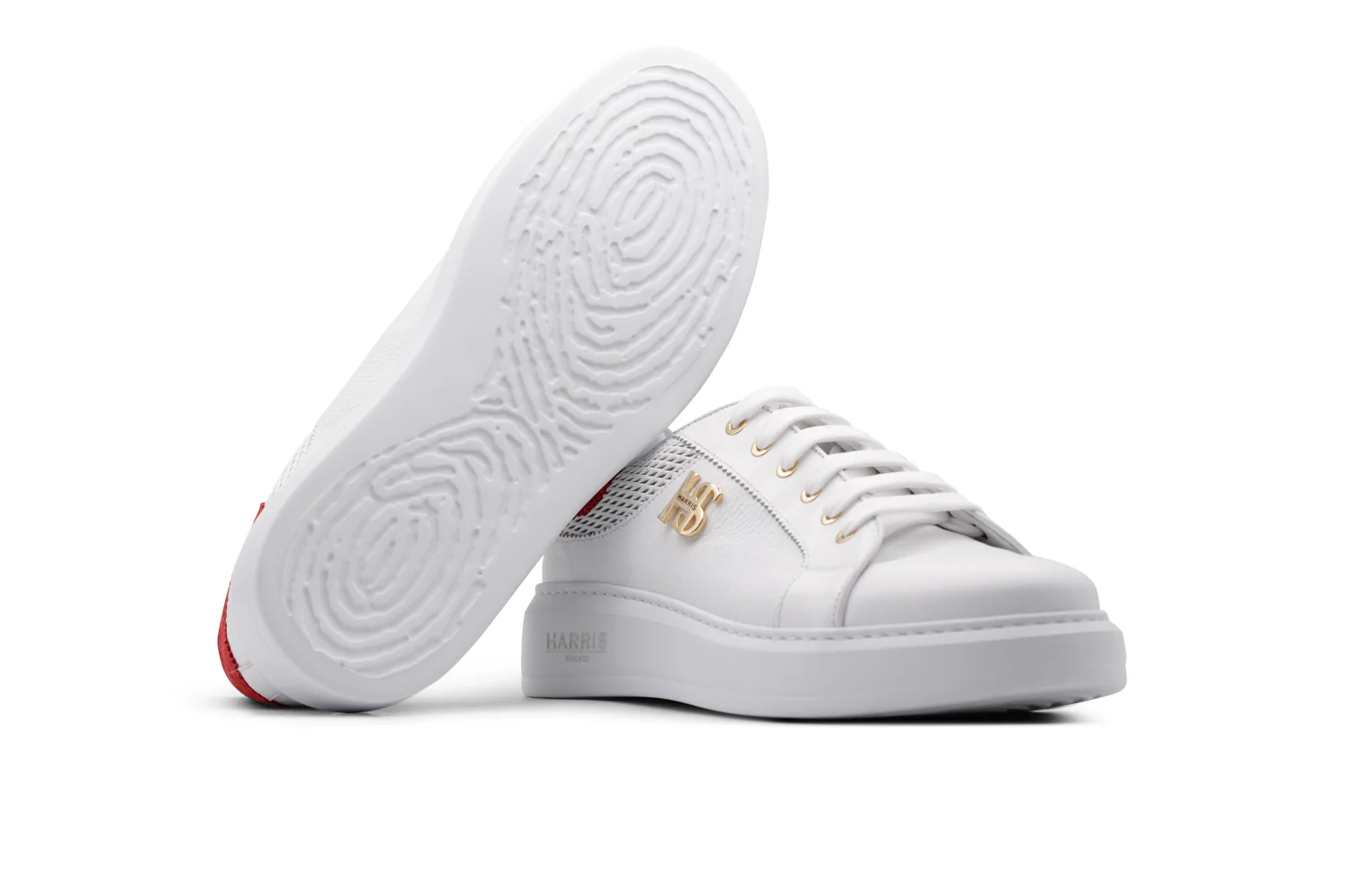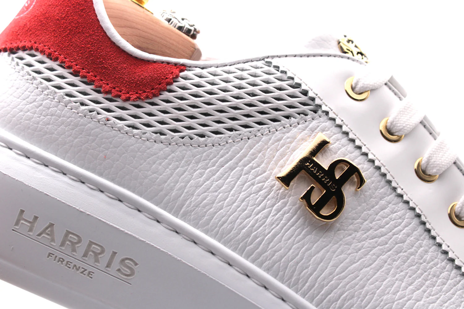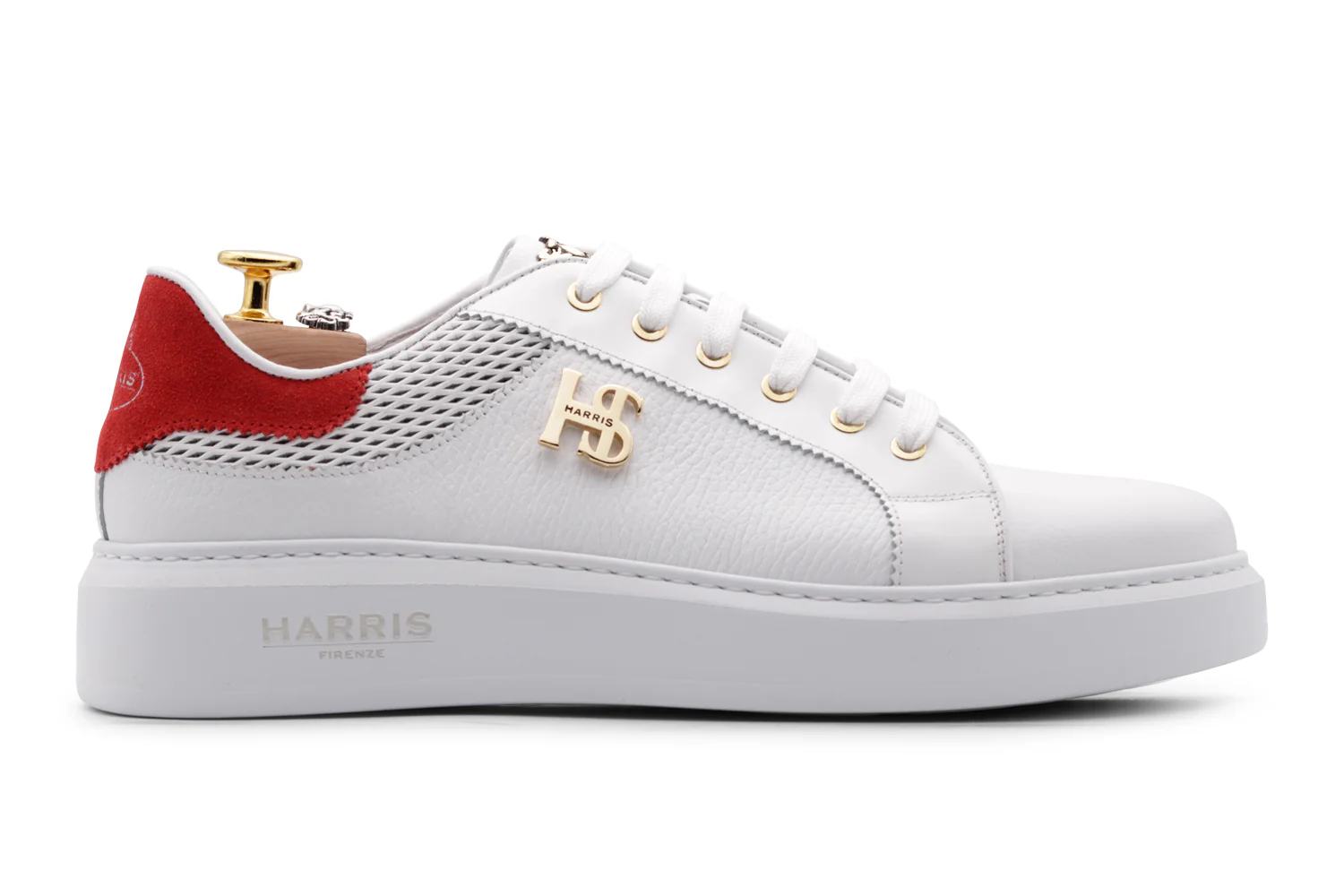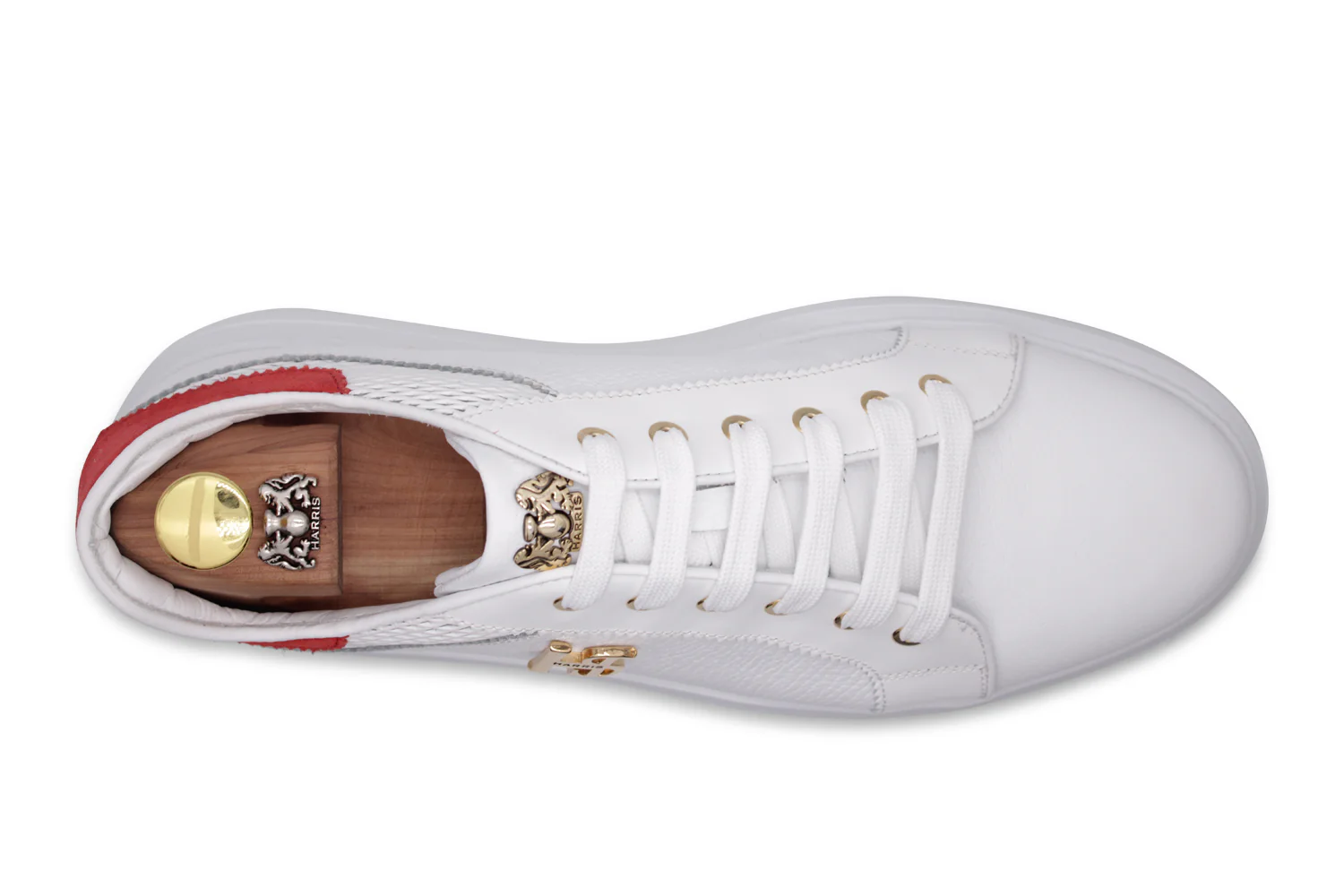 Sneaker en cuir de veau de presse à alce blanc doux, avec des brins imprimés et des détails en daim rouge complétés par les accessoires Harris en finition en or et la semelle de cassette blanche qui donne un design raffiné