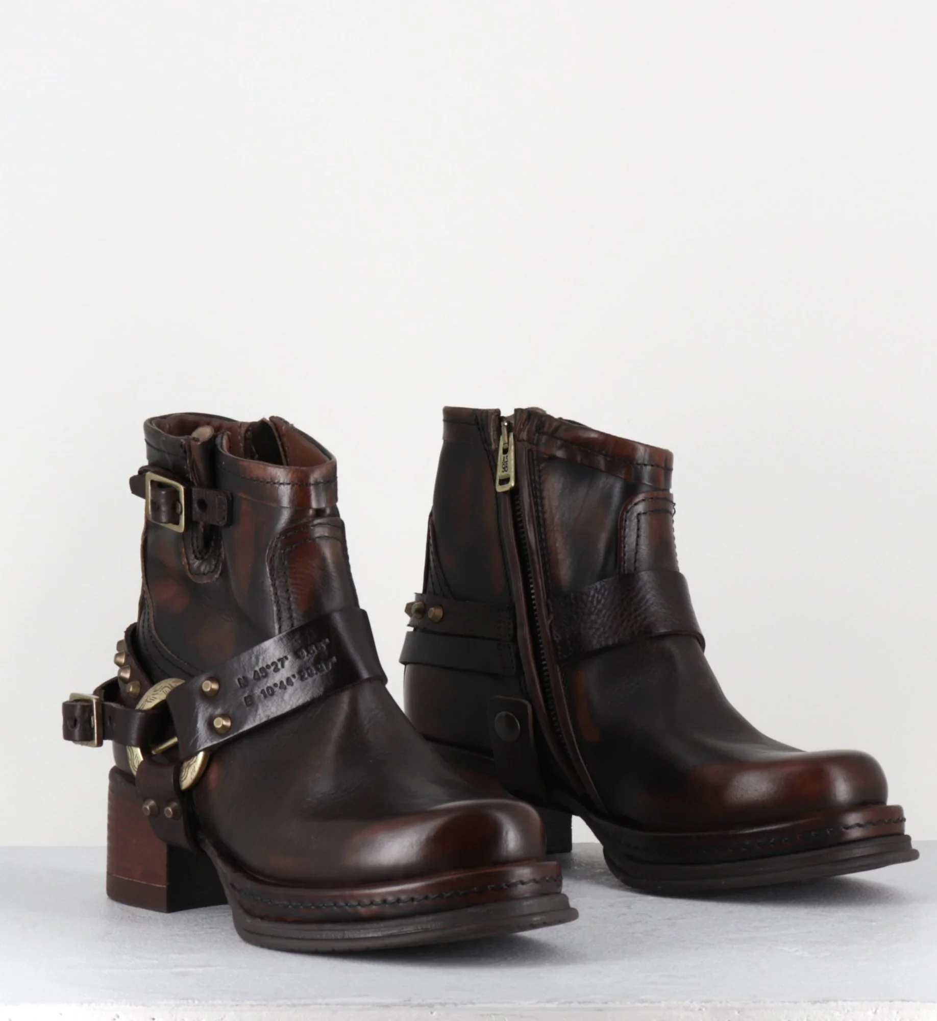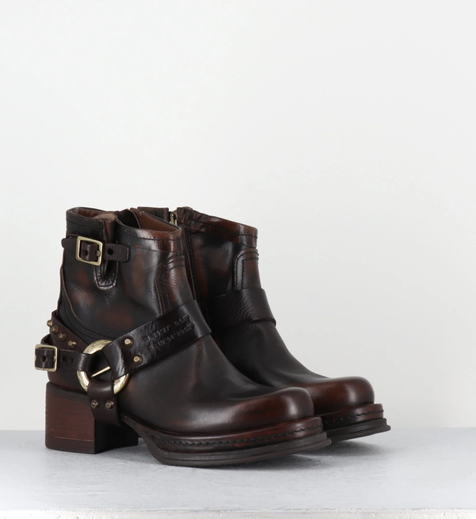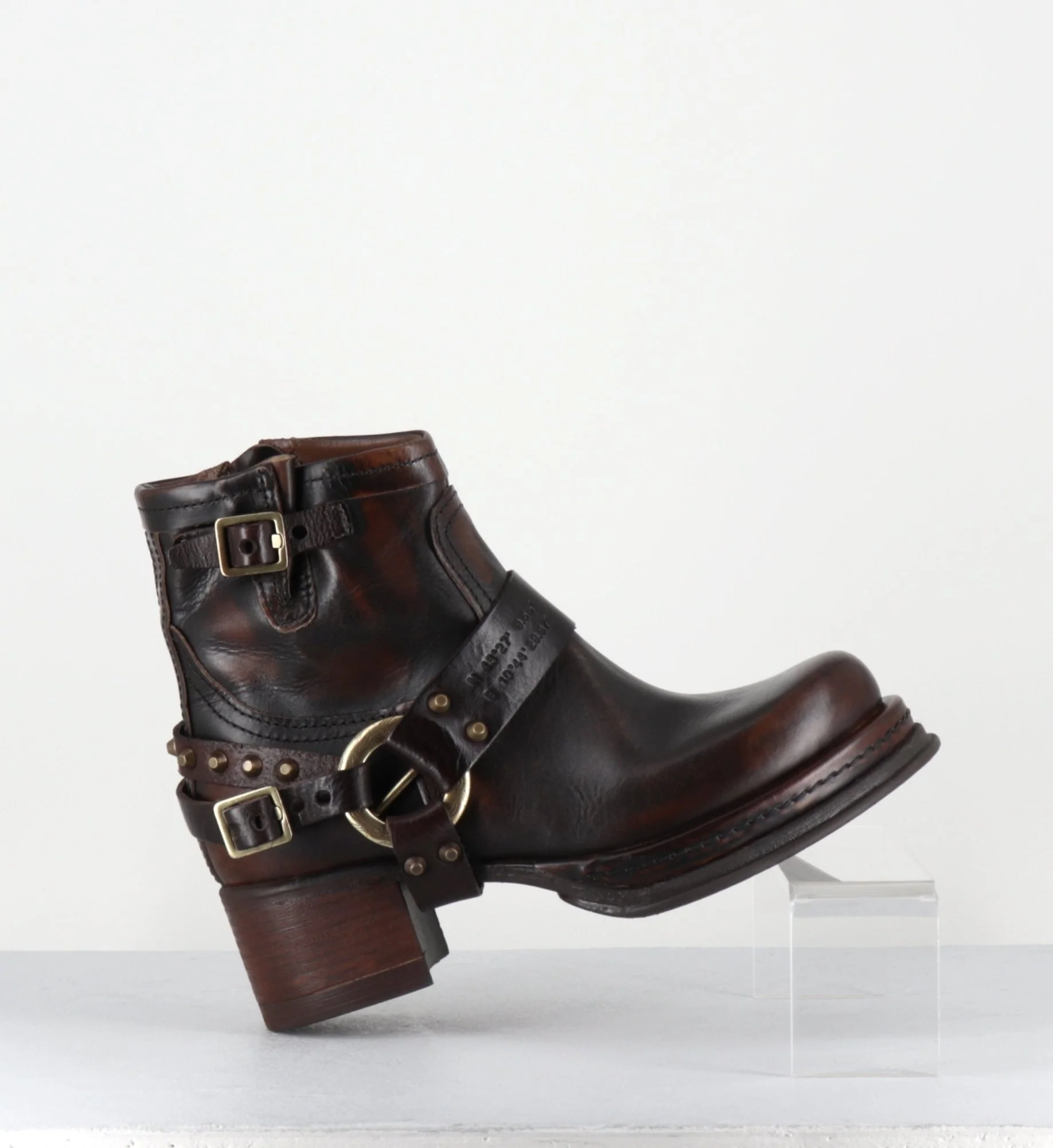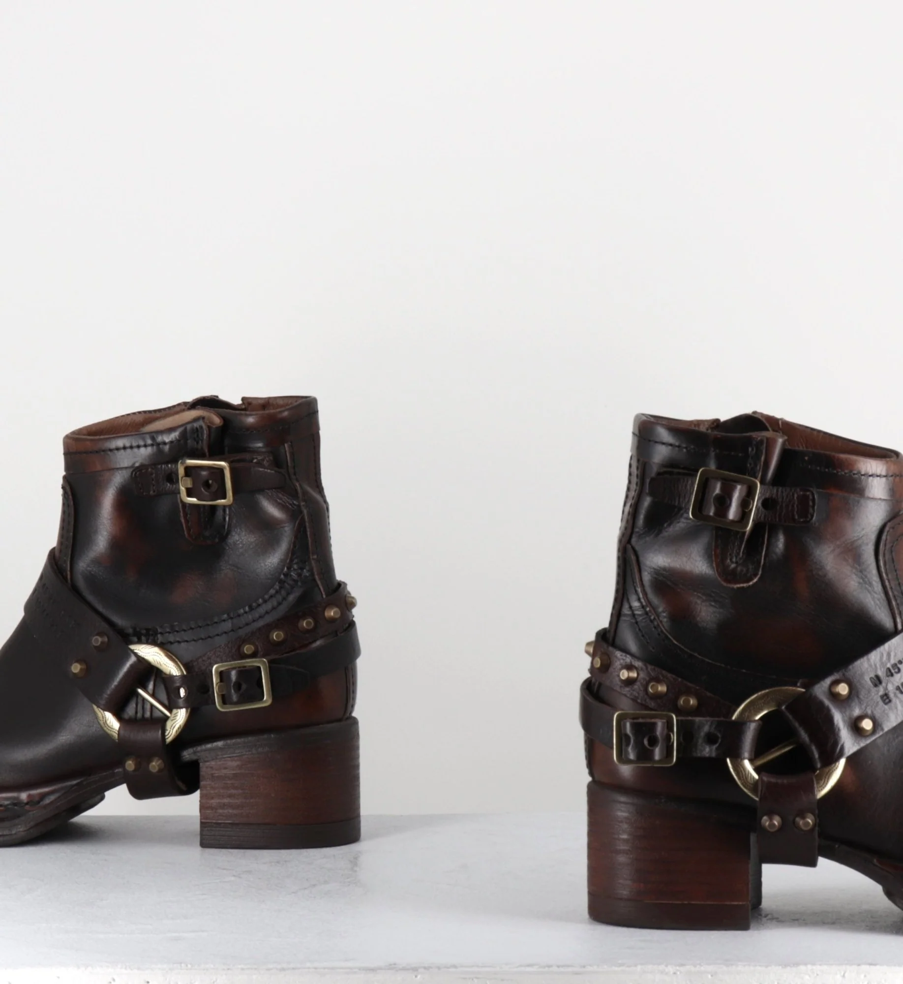 Boots bikers tige courte en cuir marron lustré avec patine vieillie à la main pour un effet vintage, ceinturon à clous dorés, bout arrondi, petit bride à boucle réglable sur la jambe, montées sur une semelle épaisse en gomme et un talon bloc confortable Fabrication Artisanale Italienne – Ateliers A.S 98 Chausse légèrement grand