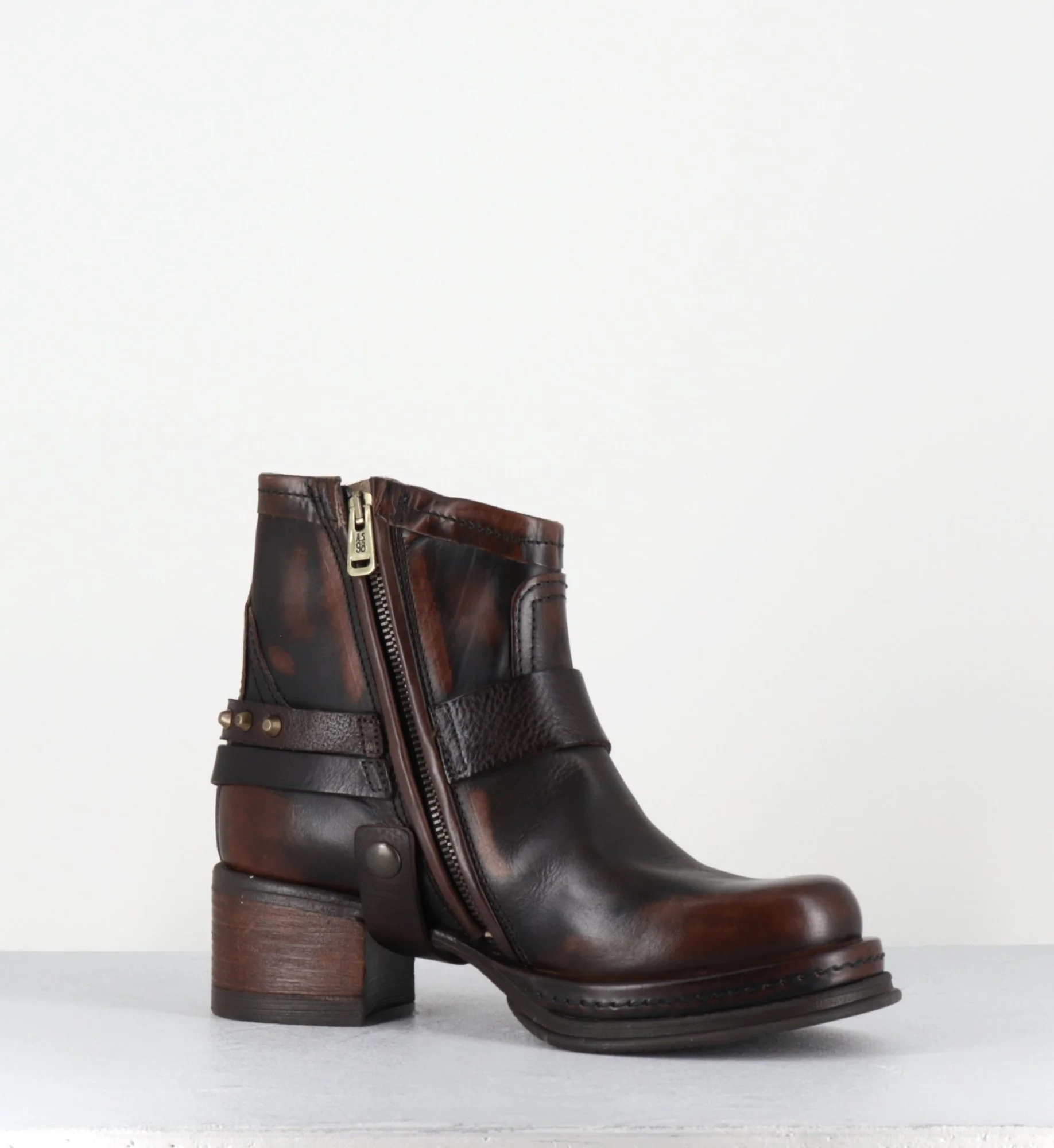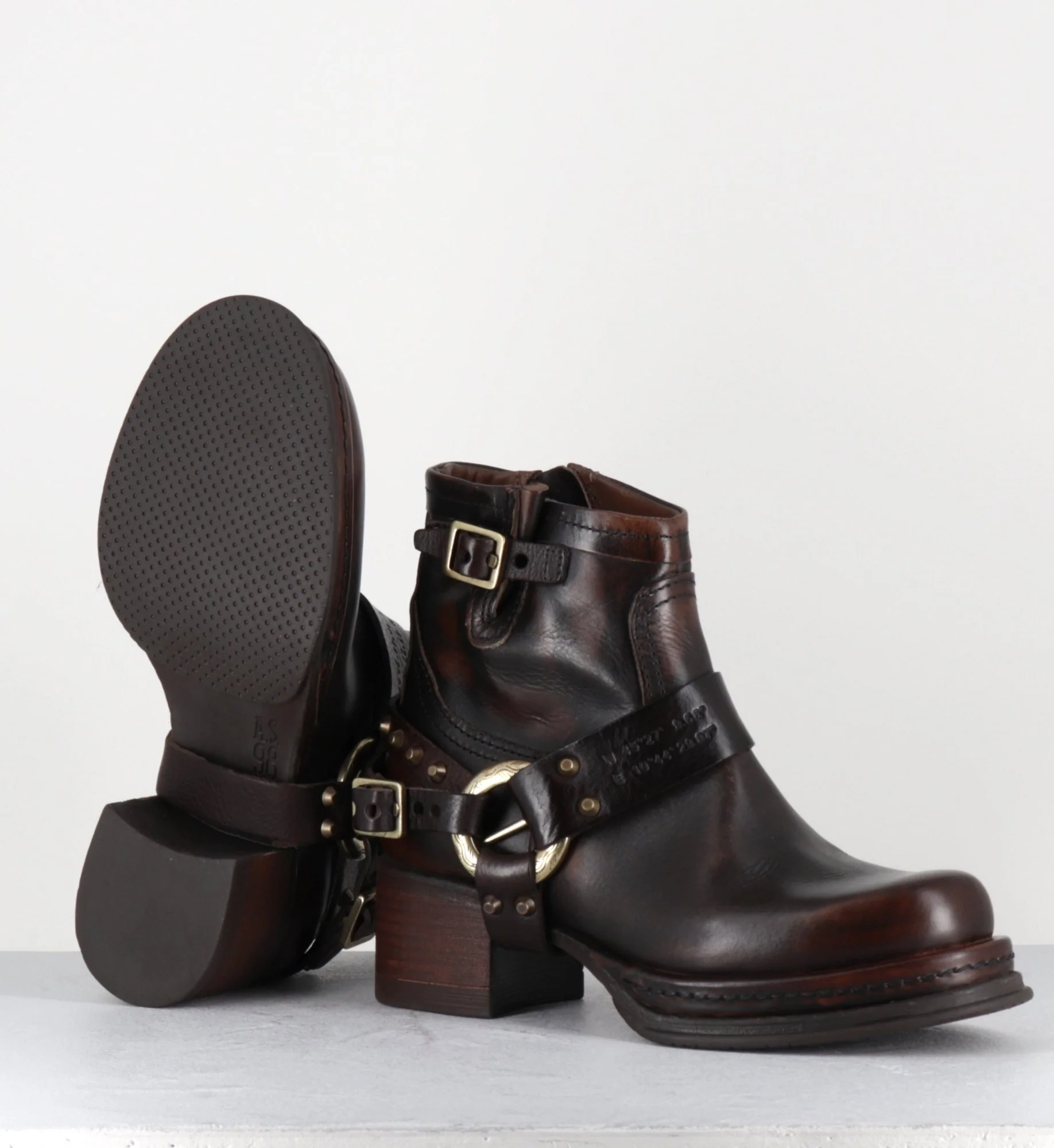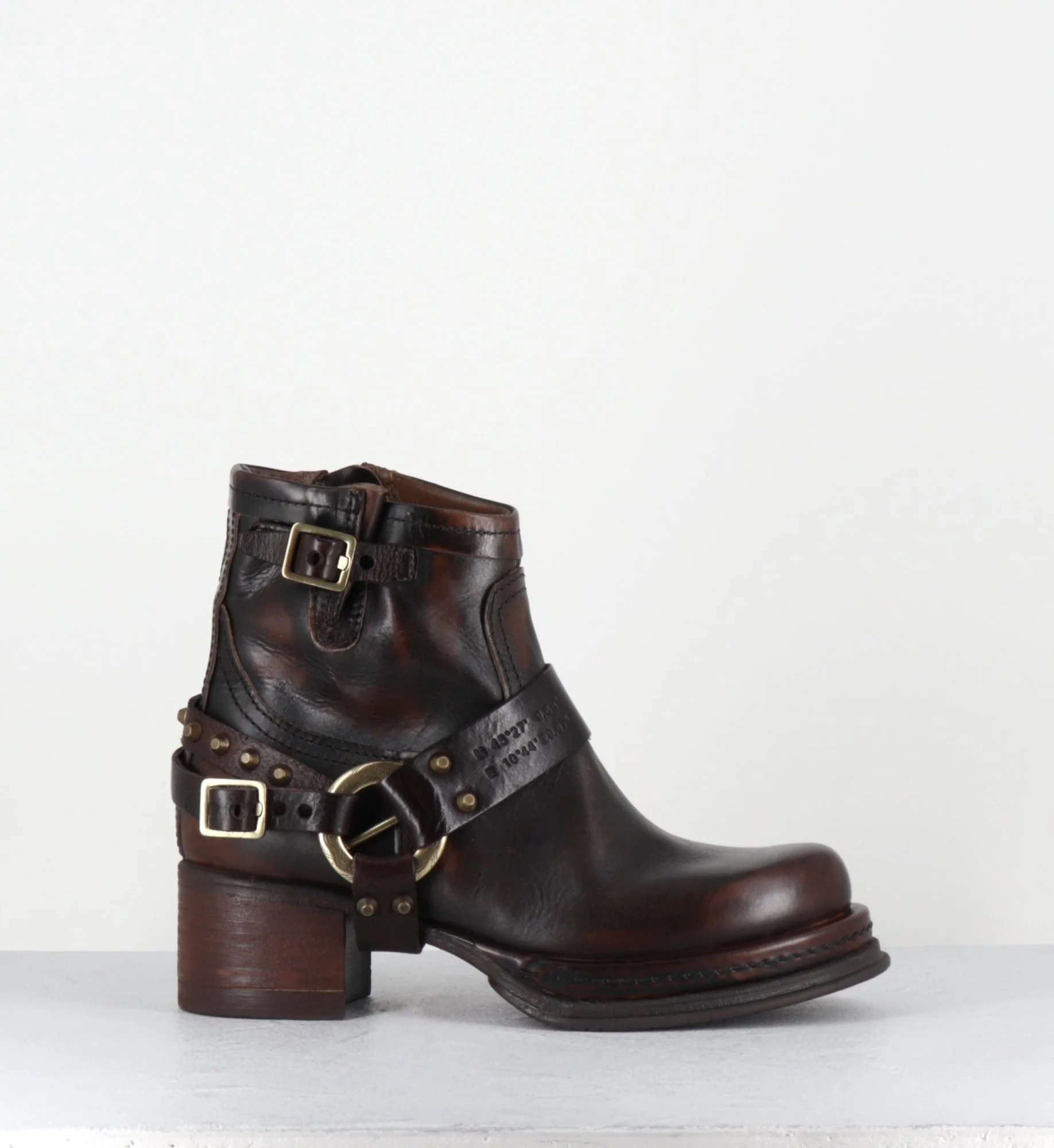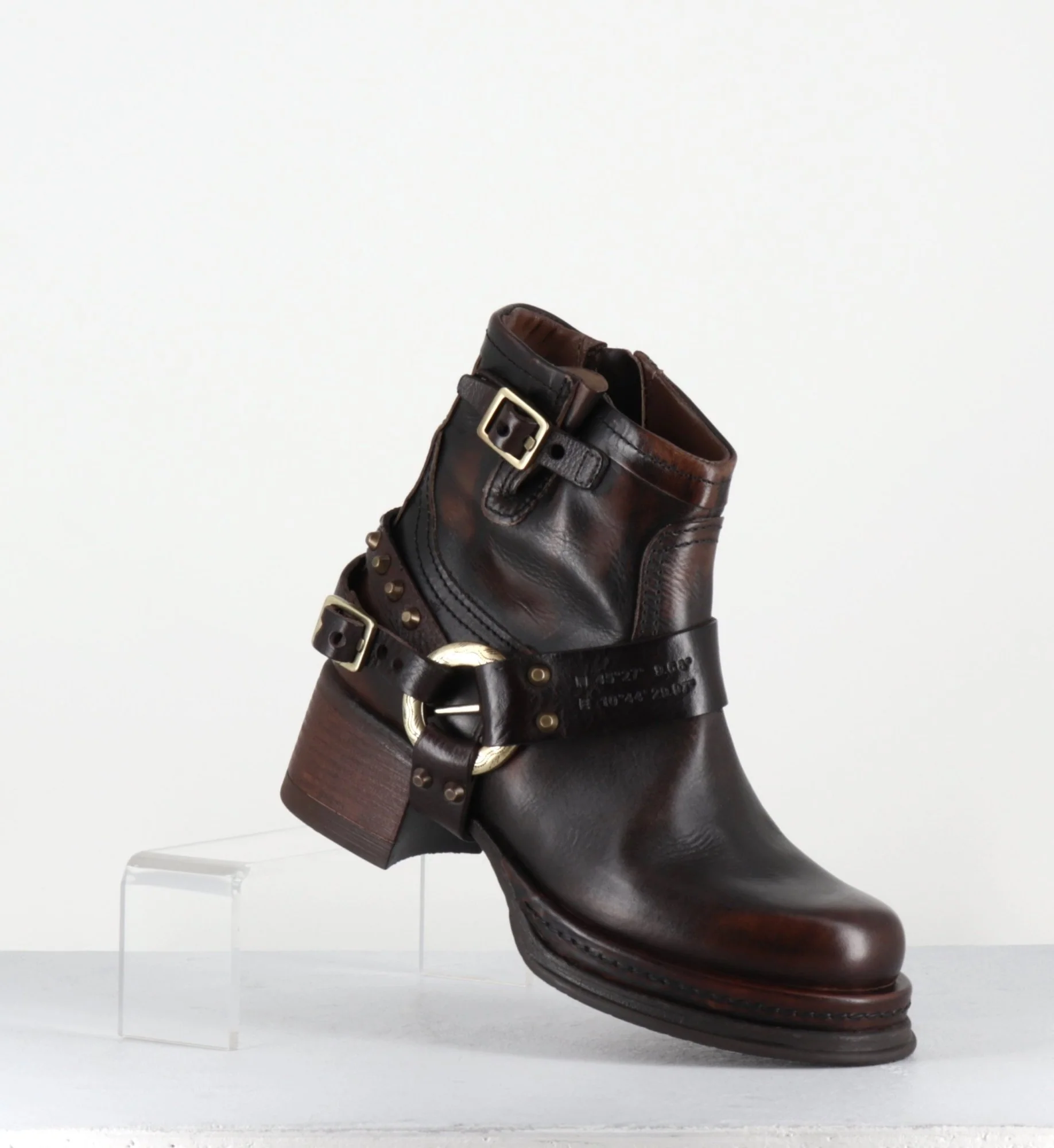Boots bikers tige courte en cuir marron lustré avec patine vieillie à la main pour un effet vintage, ceinturon à clous dorés, bout arrondi, petit bride à boucle réglable sur la jambe, montées sur une semelle épaisse en gomme et un talon bloc confortable Fabrication Artisanale Italienne – Ateliers A.S 98 Chausse légèrement grand