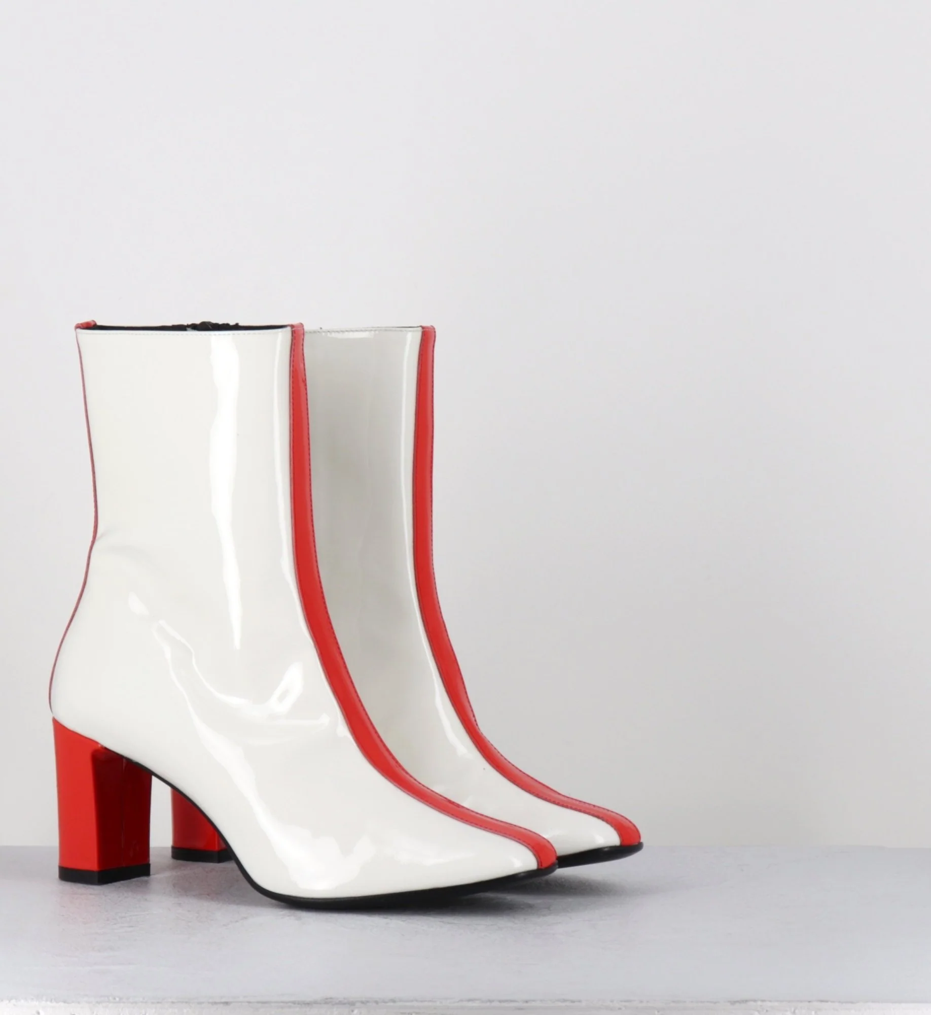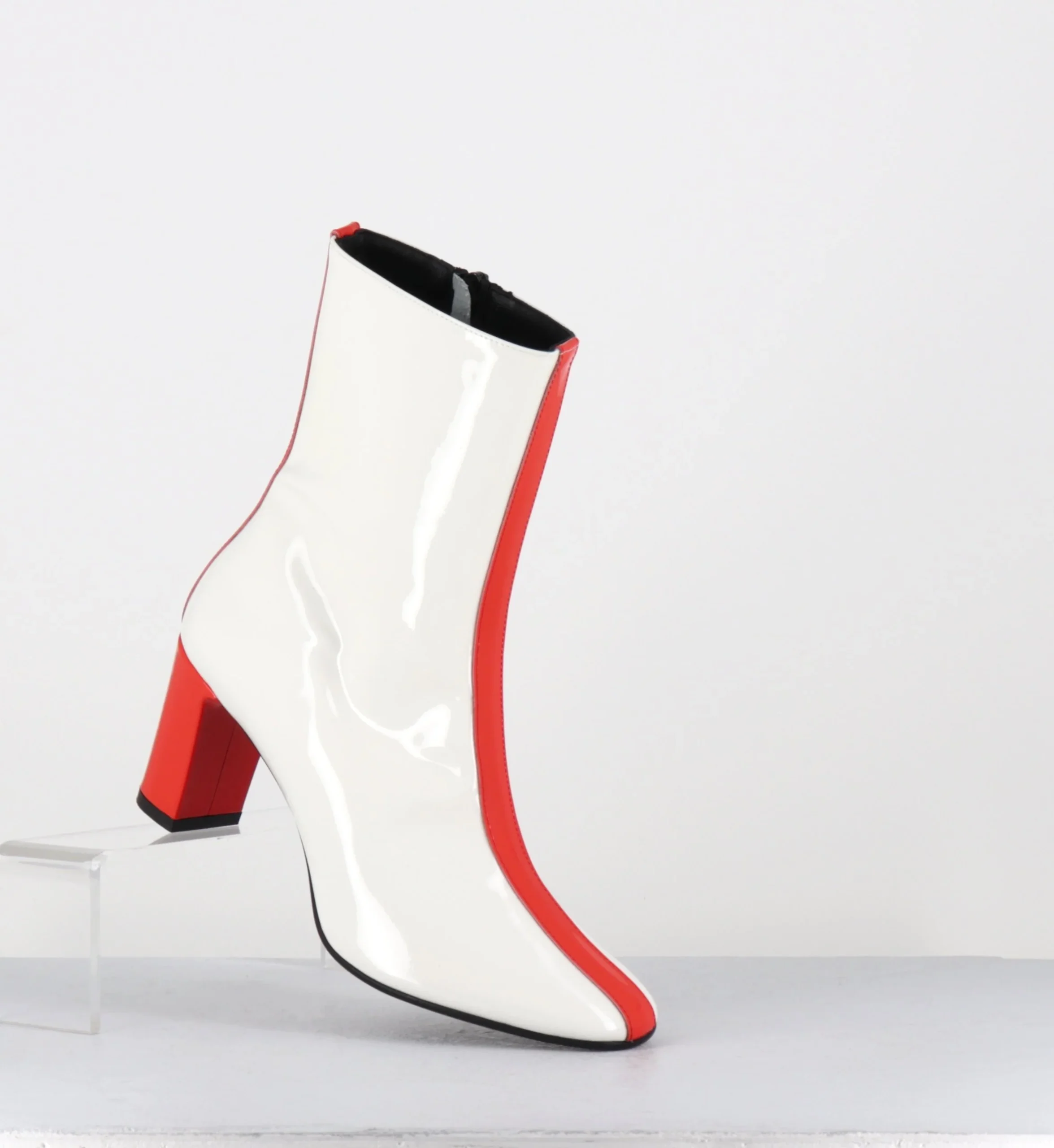 Boots à talon en cuir vernis crème et orange vif avec bande centrale esprit années 60 Fabrication Artisanale Italienne – Ateliers GarriceLab Chausse légèrement grand