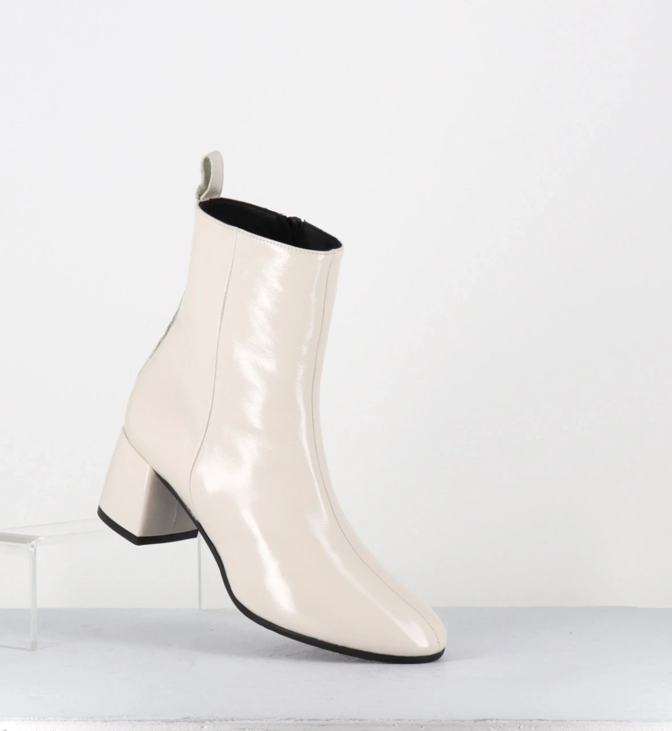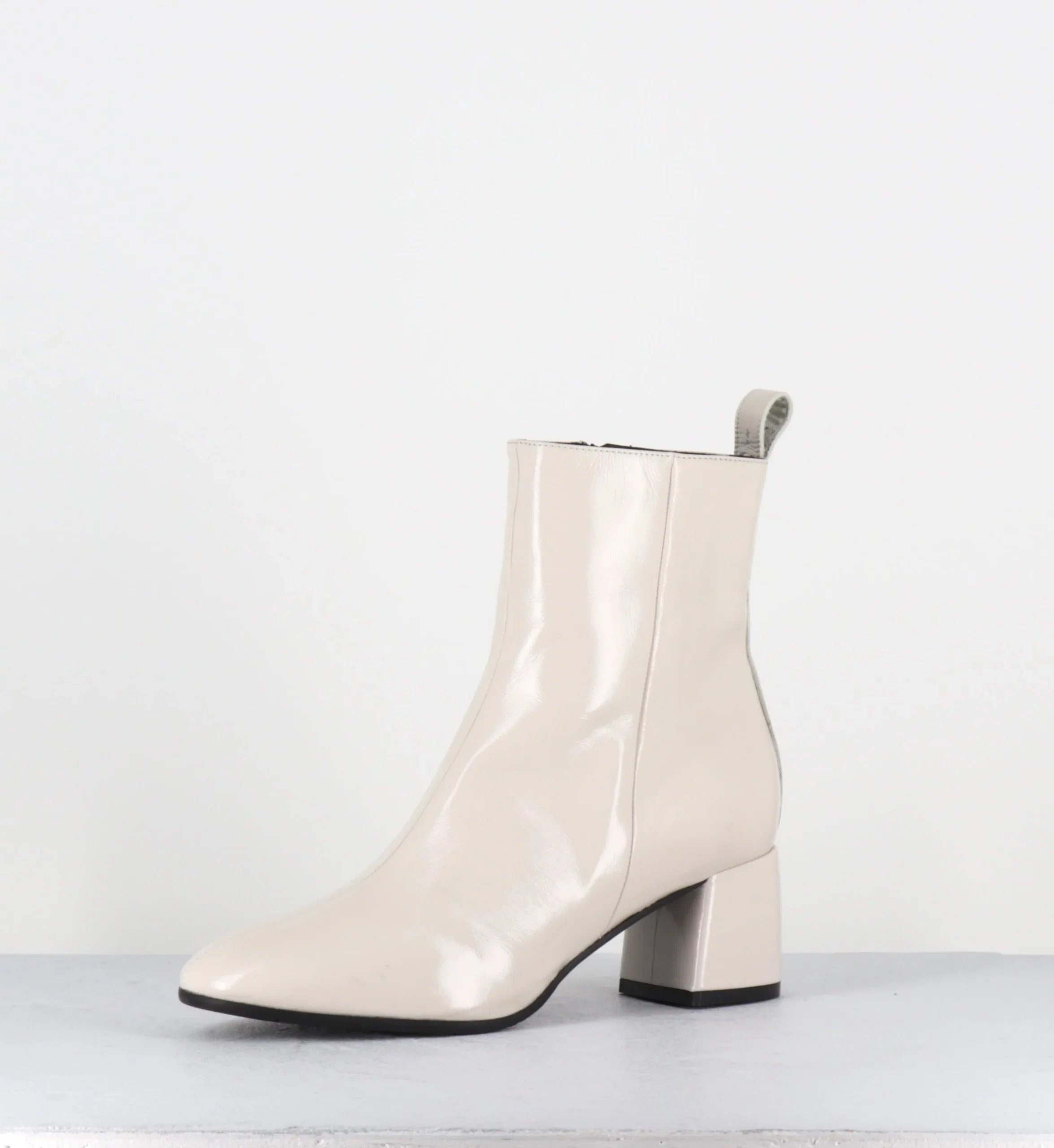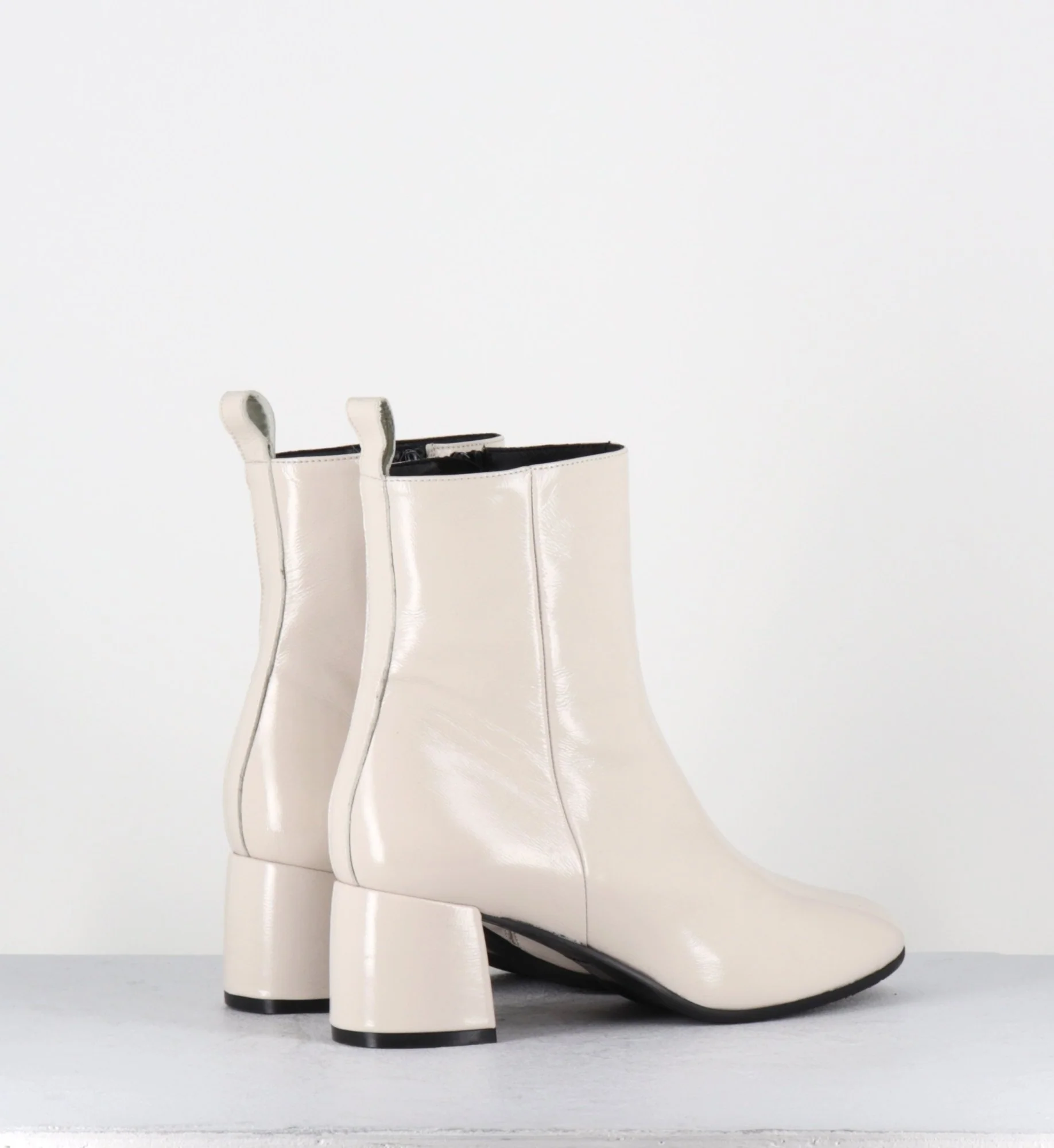 Boots esprit 60s en cuir couleur crème légèrement brillant, ligne effilée, bout en amande, montées sur un talon confortable au look rétro