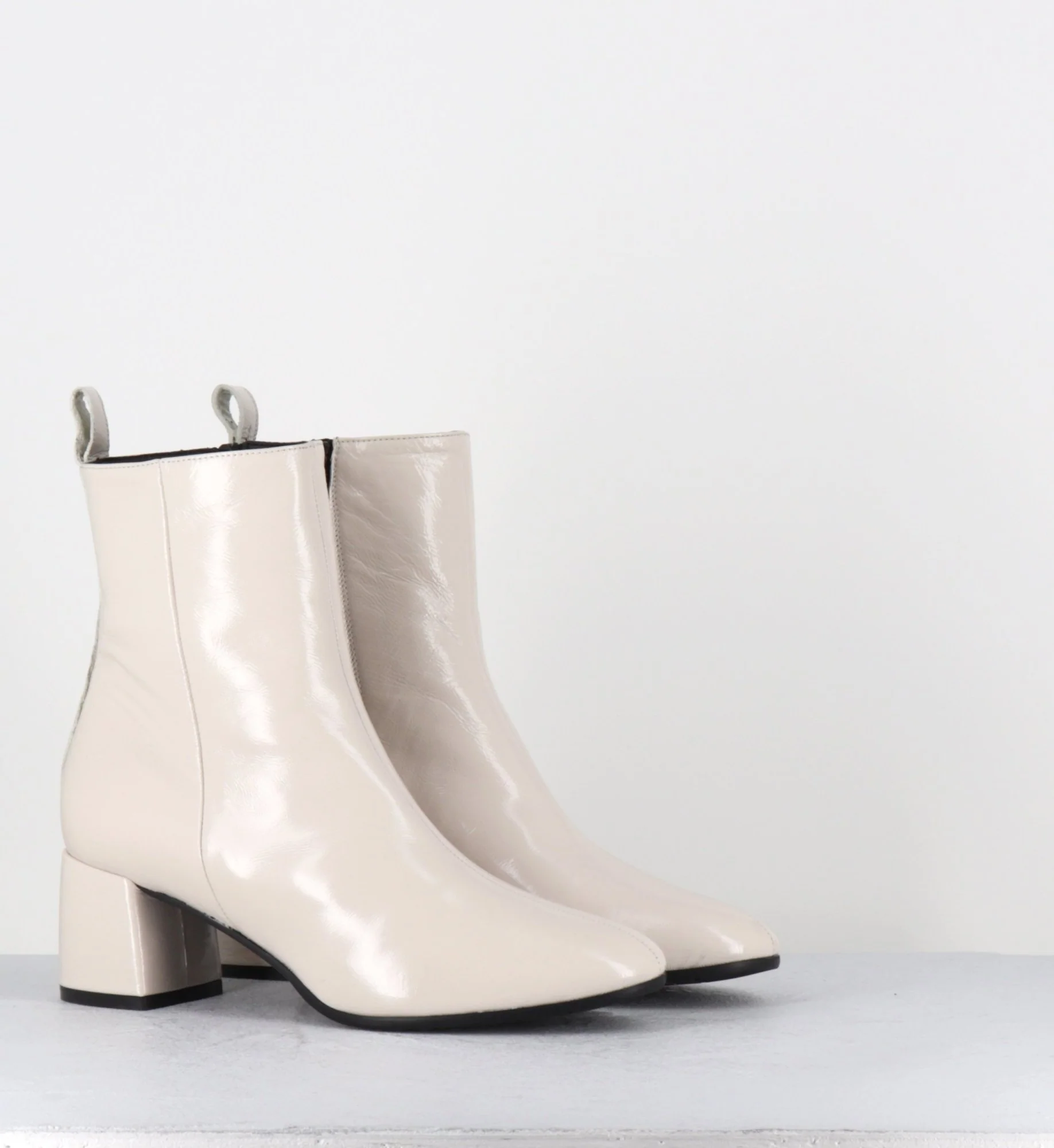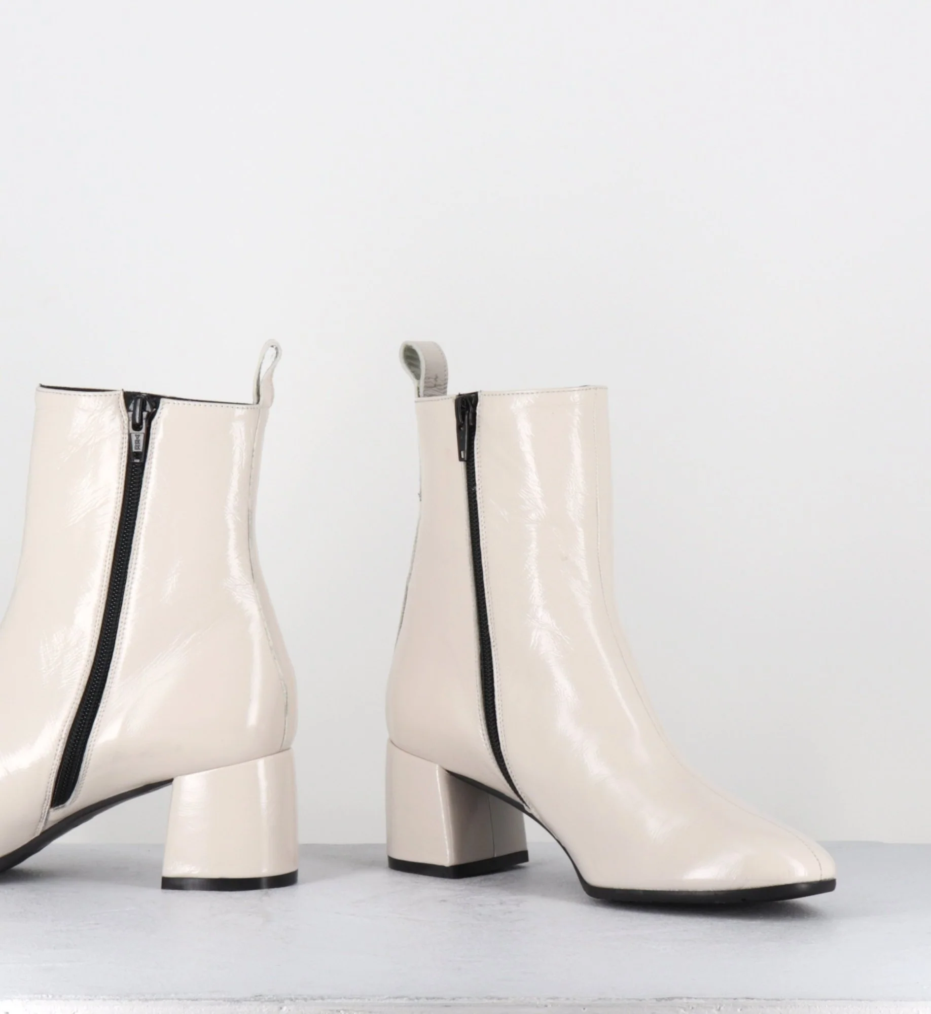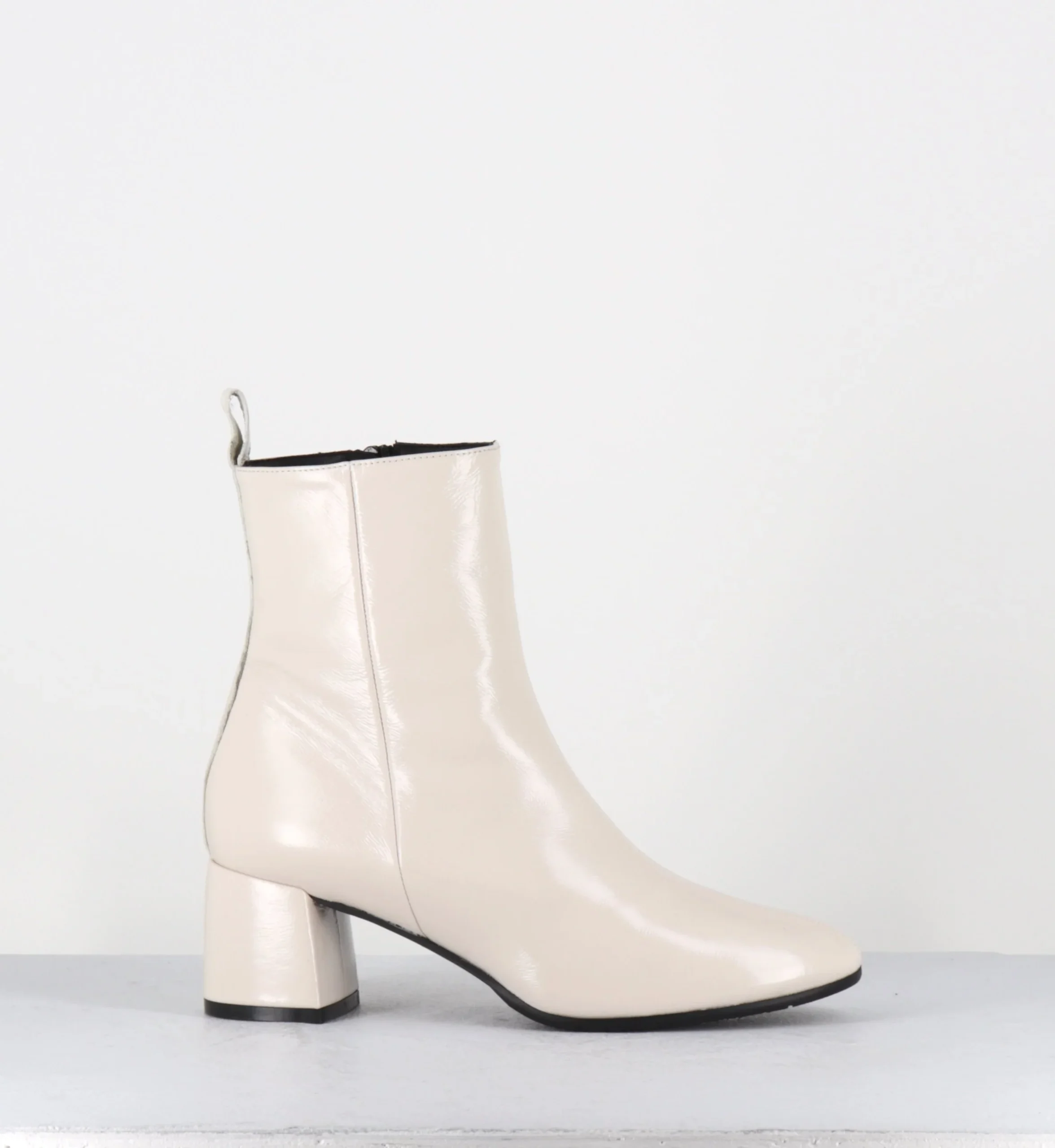 Boots esprit 60s en cuir couleur crème légèrement brillant, ligne effilée, bout en amande, montées sur un talon confortable au look rétro