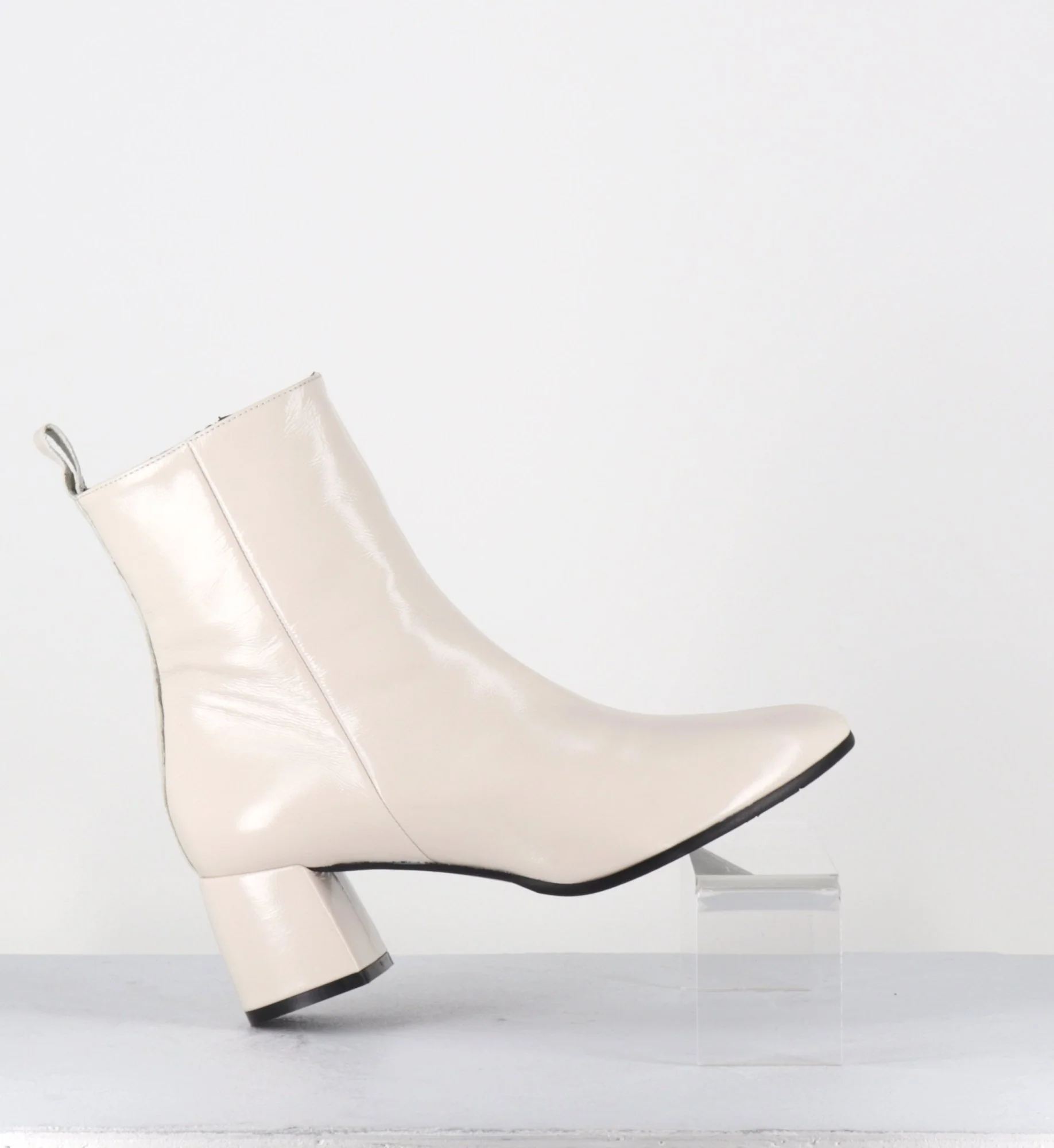 Boots esprit 60s en cuir couleur crème légèrement brillant, ligne effilée, bout en amande, montées sur un talon confortable au look rétro Fabrication Artisanale Italienne – Ateliers GarriceLab Chausse normalement