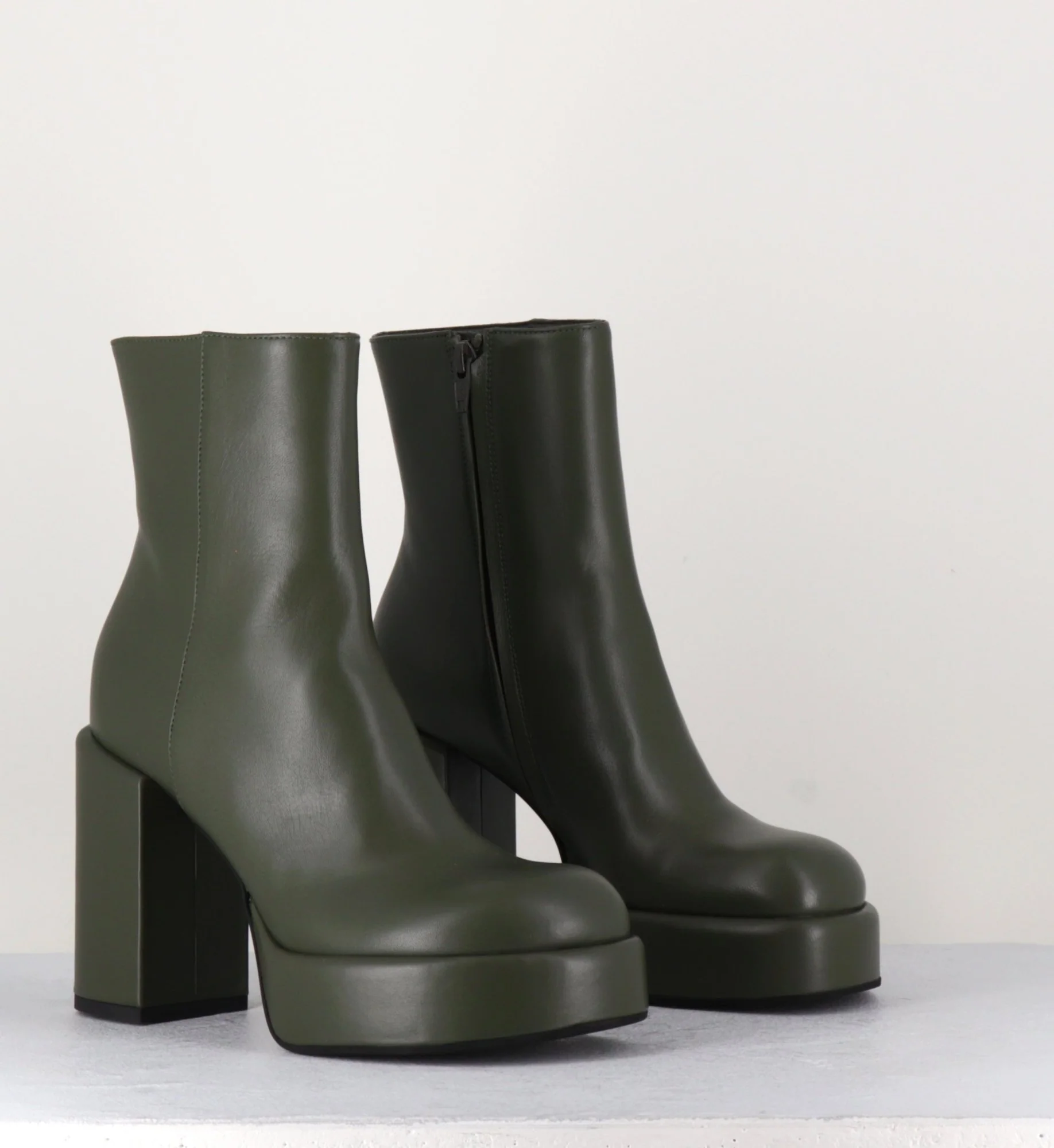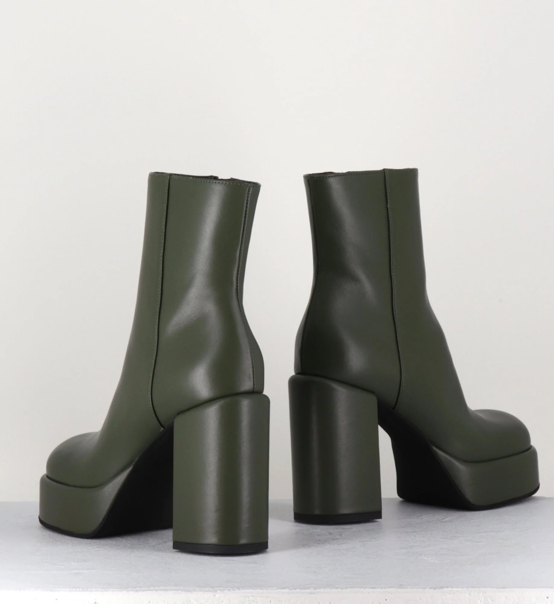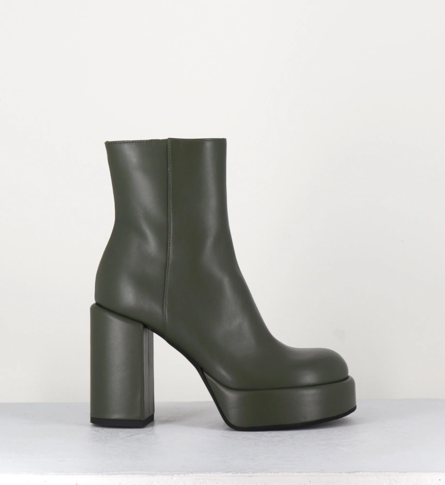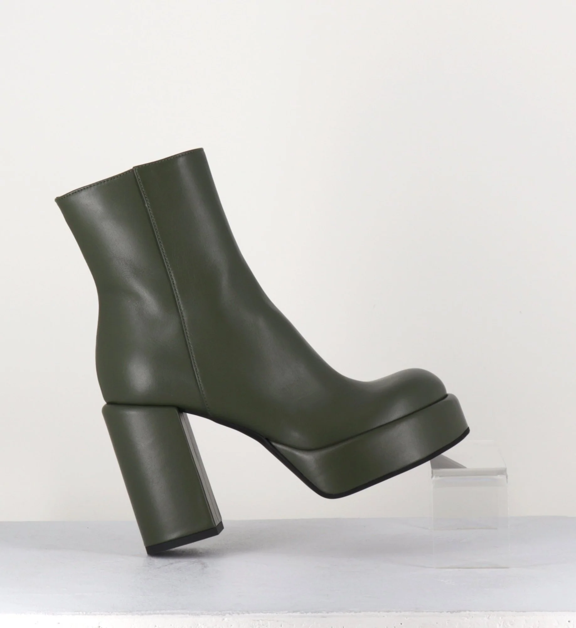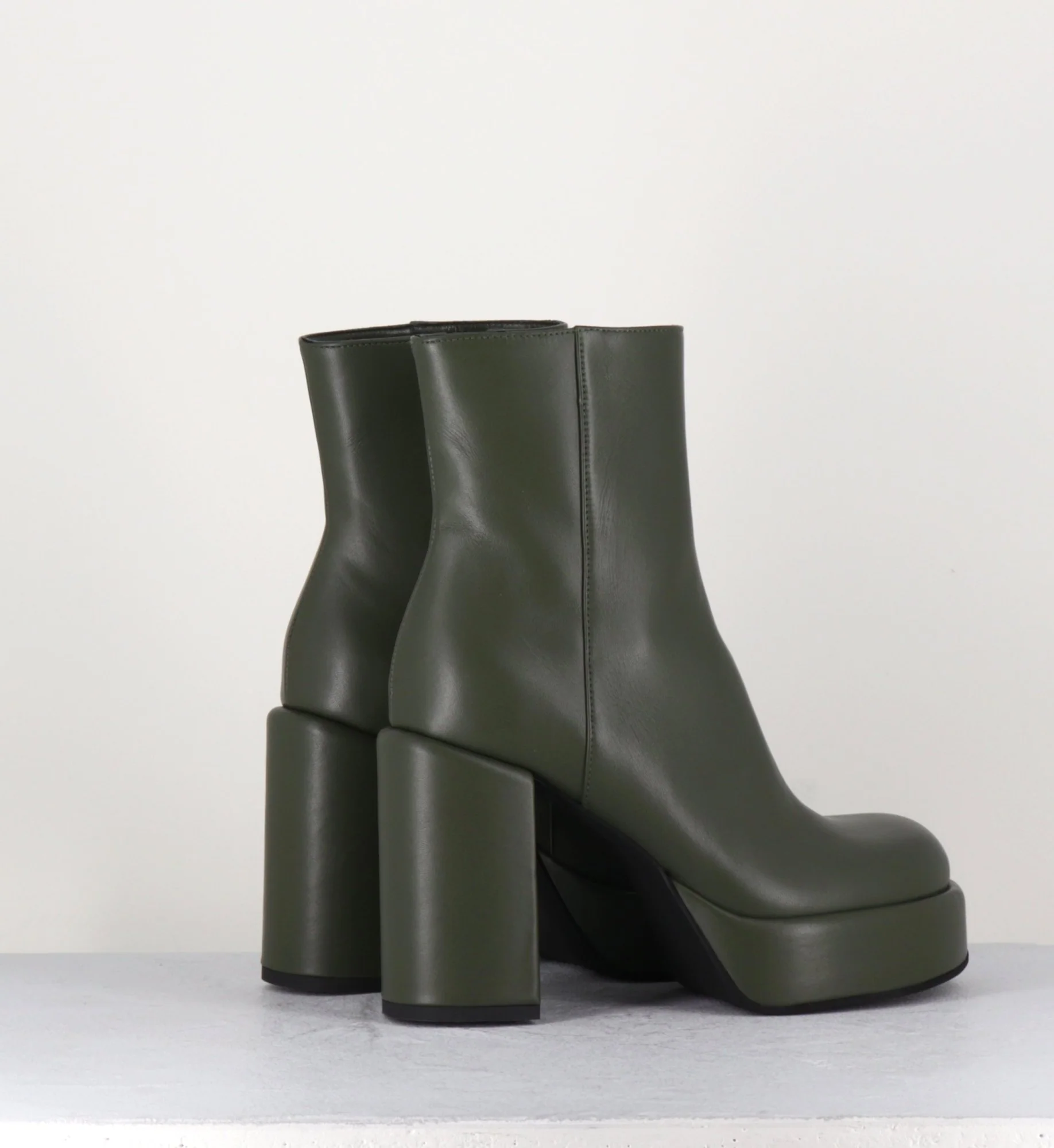 Boots 70s en cuir khaki, bout rond anatomique, zip intérieur, montées sur une plateforme et un talon stylisés et recouverts.
