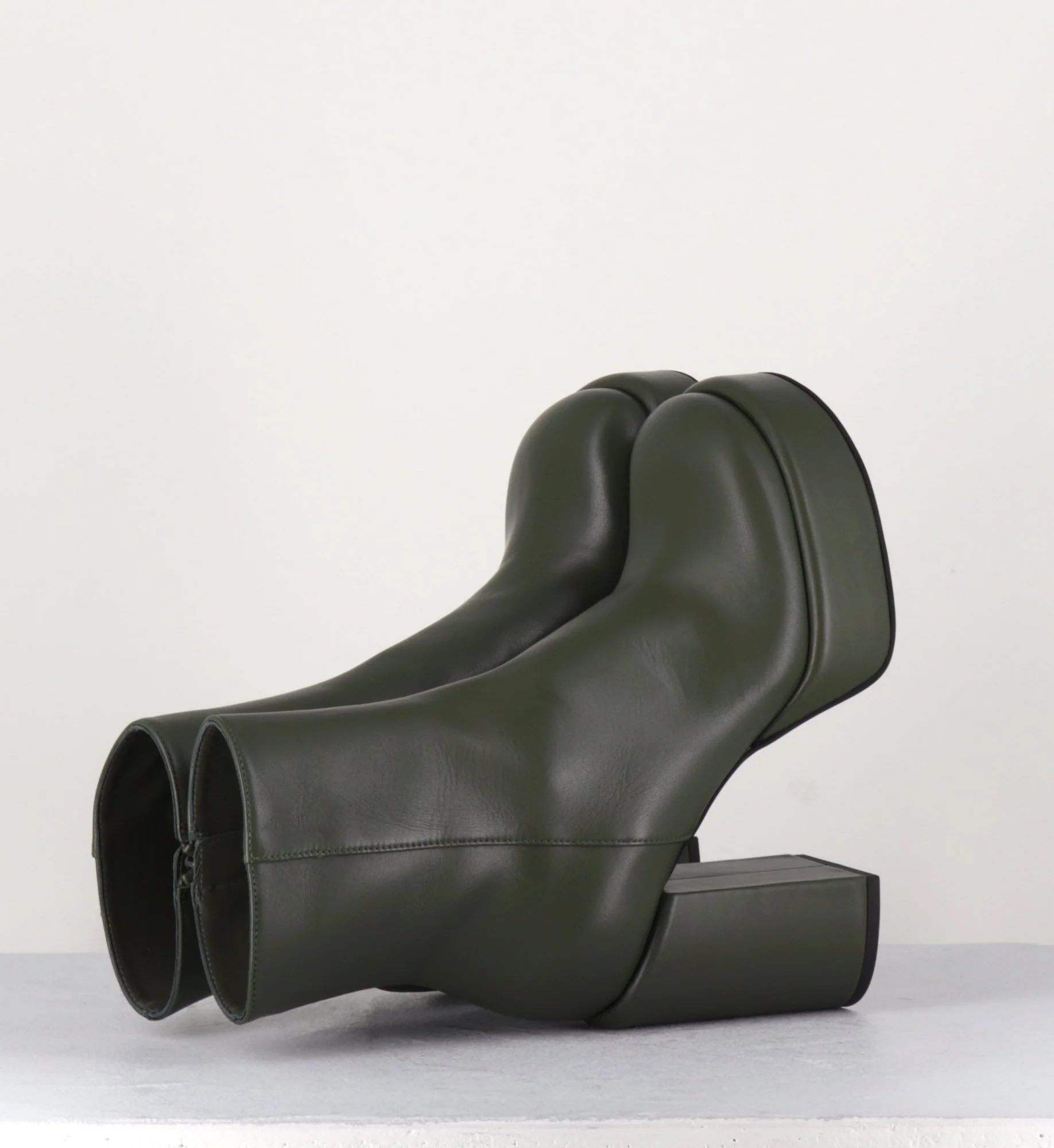 Boots 70s en cuir khaki, bout rond anatomique, zip intérieur, montées sur une plateforme et un talon stylisés et recouverts. Fabrication artisanale italienne – ateliers Garrice Lab Chausse légèrement grand