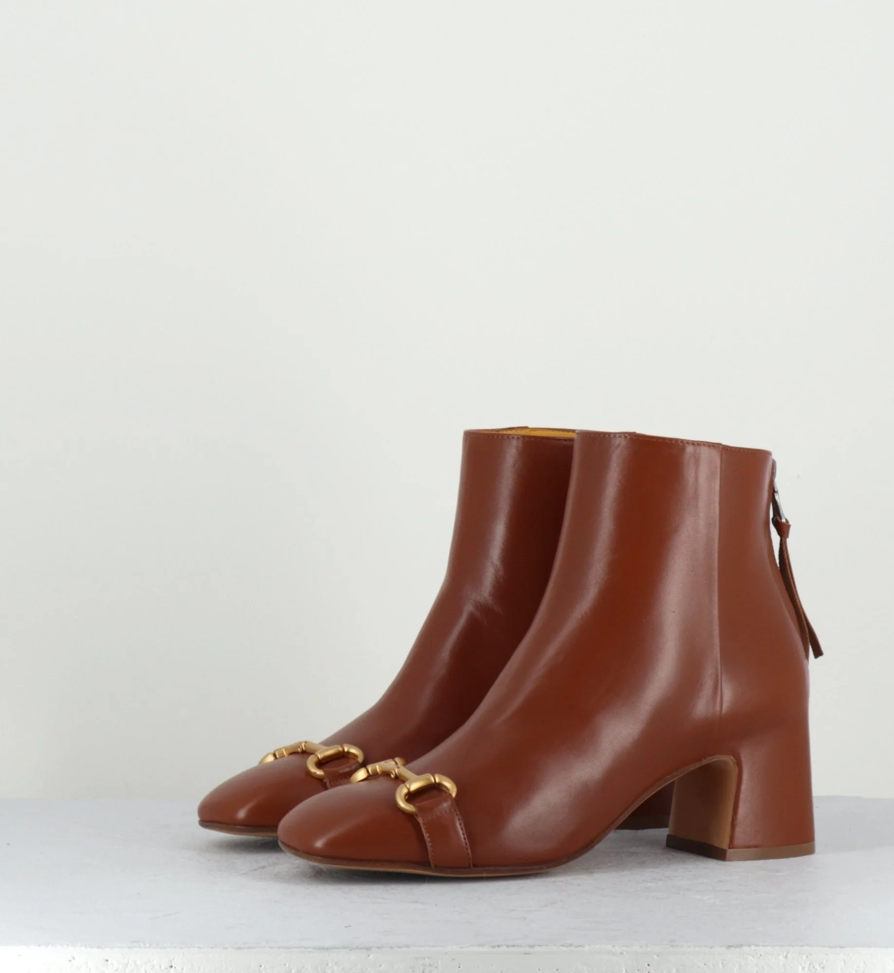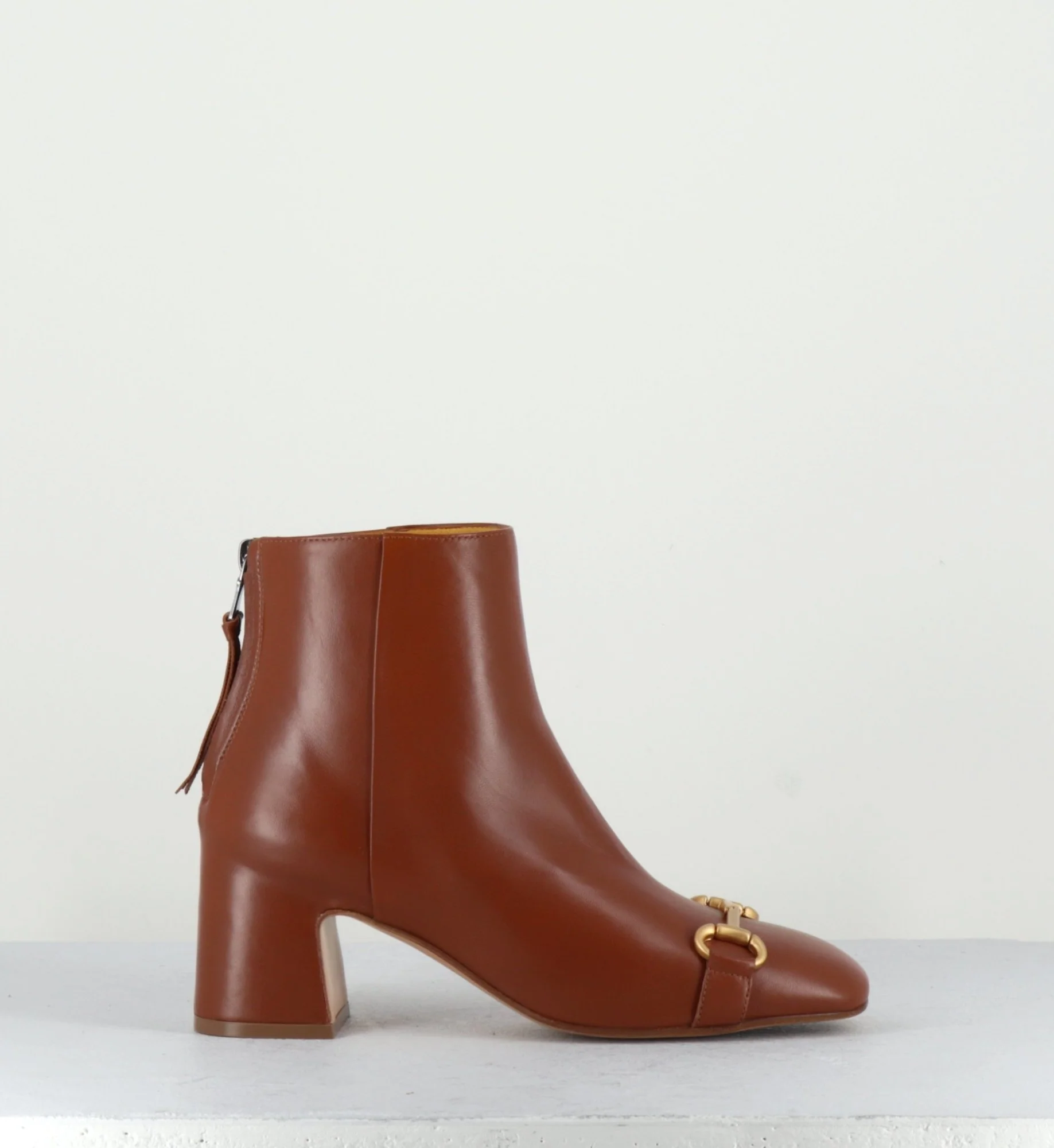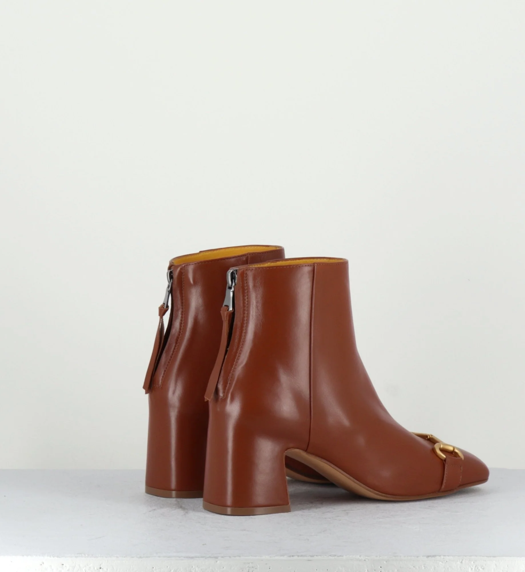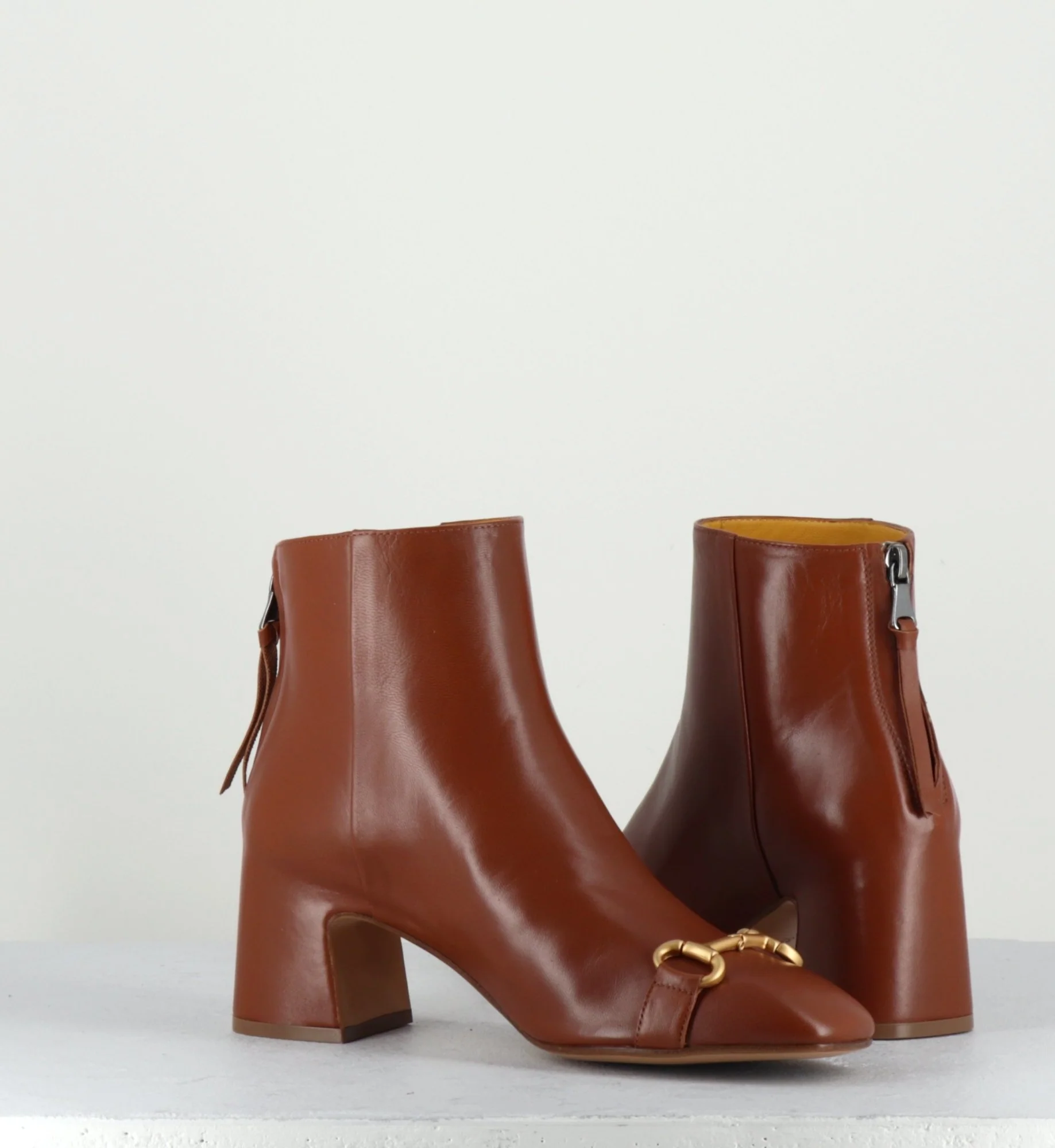 Boots en cuir camel extrêmement souple avec mors doré mat 70s et bout carré doux, zip arrière, montées sur un petit talon carré. Chic & confortable !