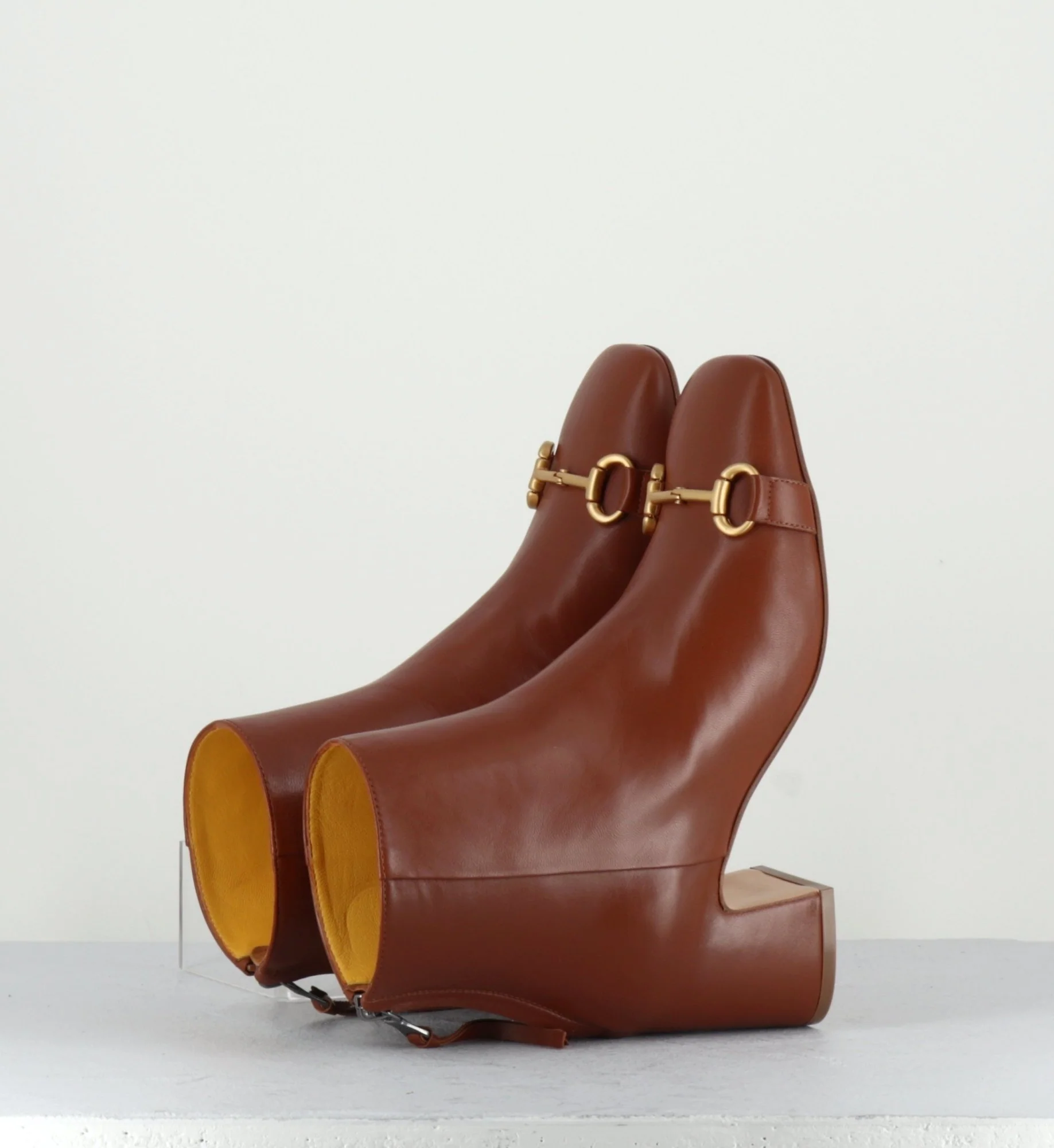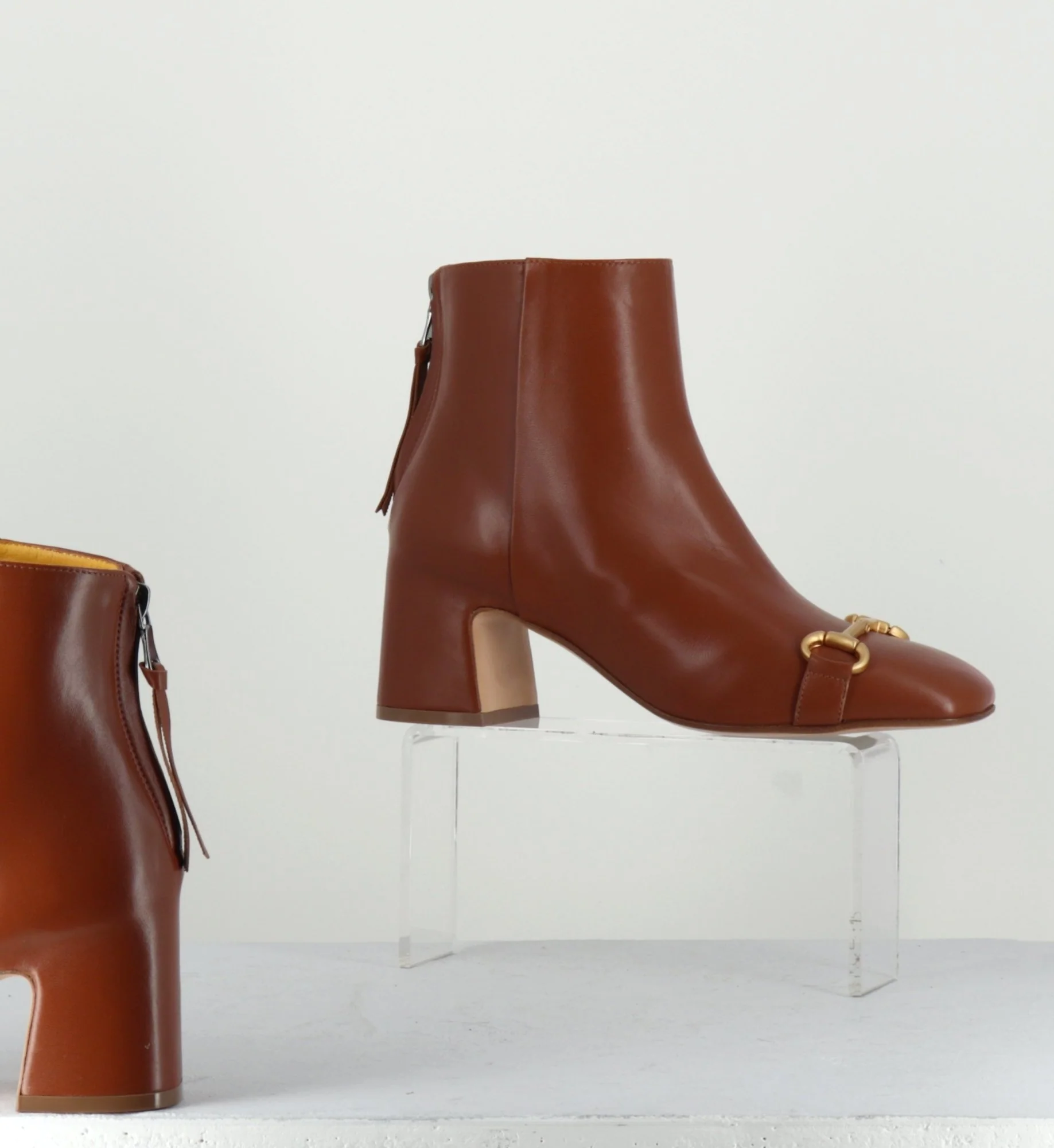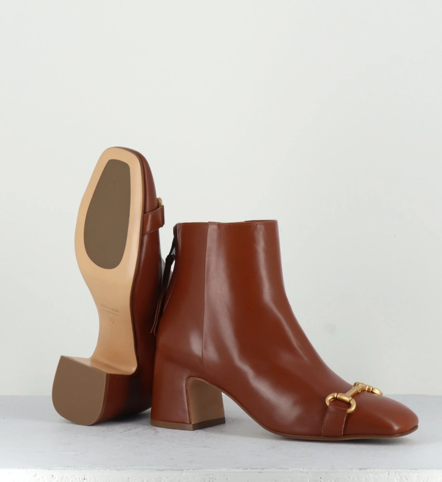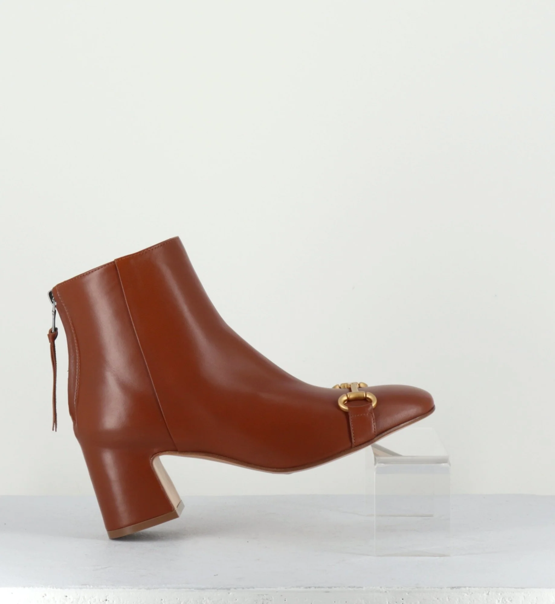 Boots en cuir camel extrêmement souple avec mors doré mat 70s et bout carré doux, zip arrière, montées sur un petit talon carré. Chic & confortable !